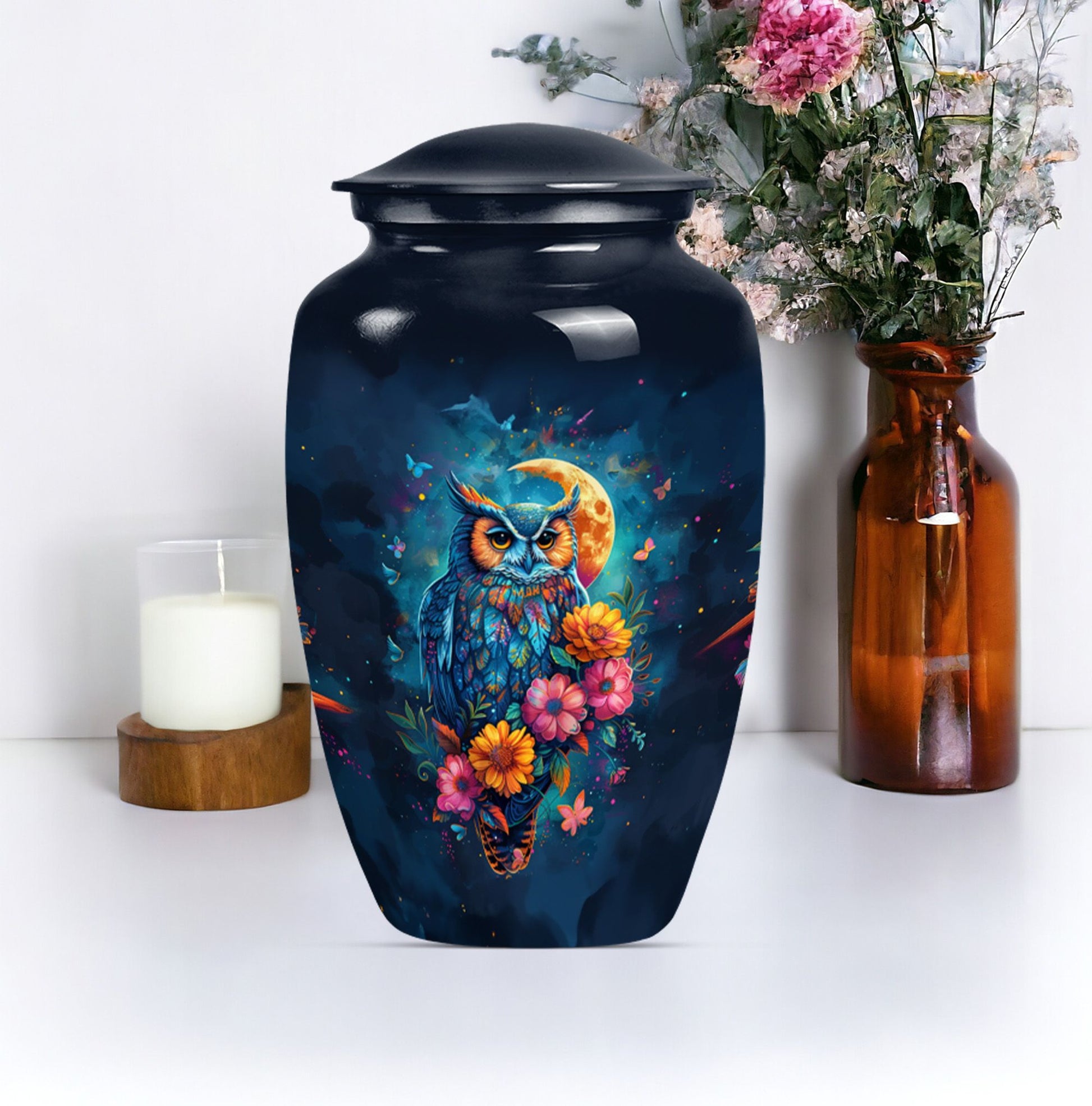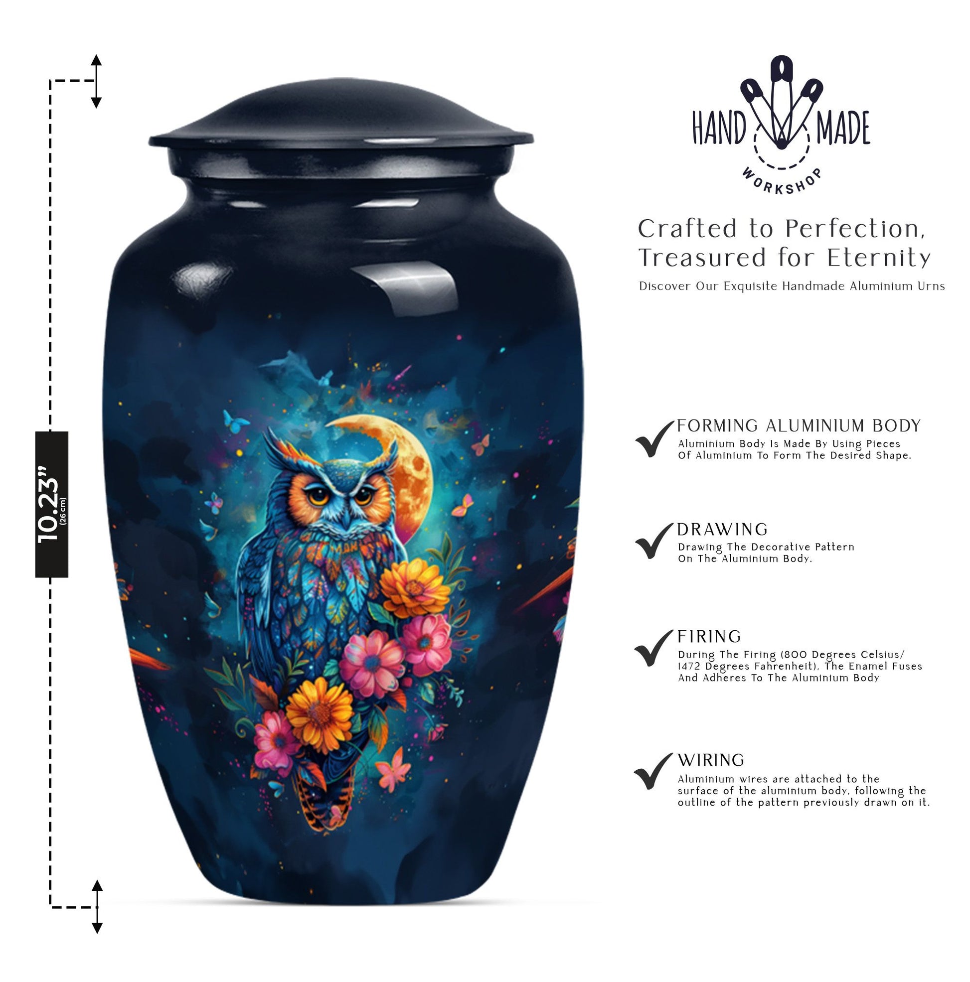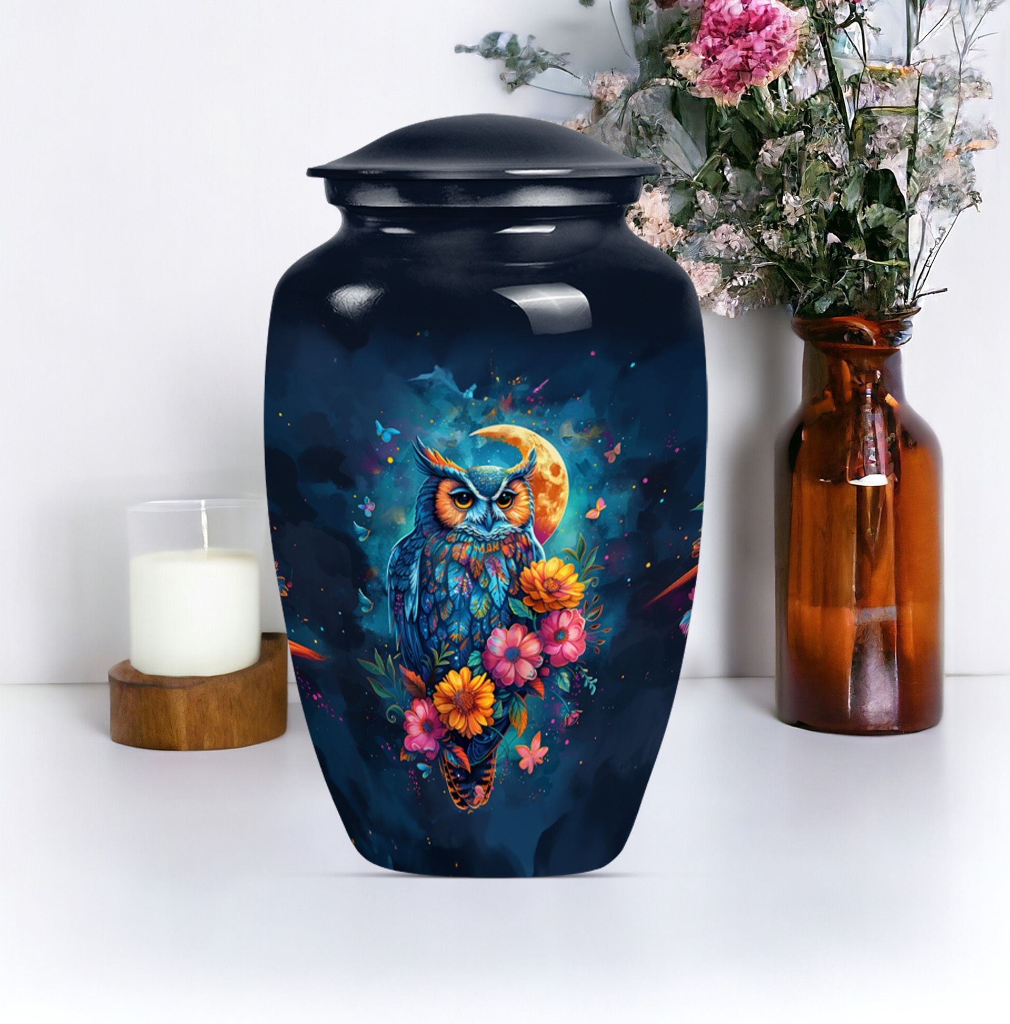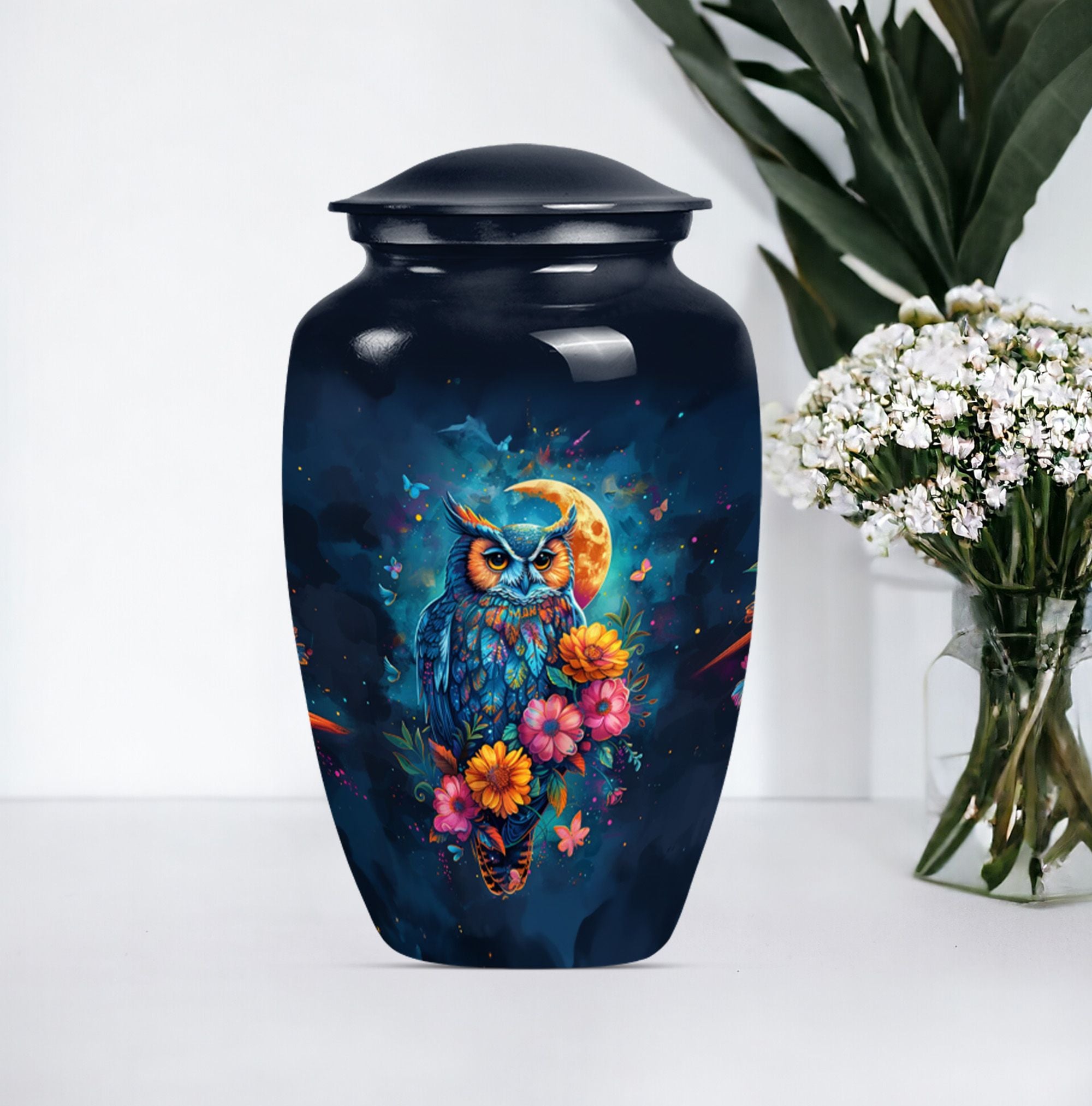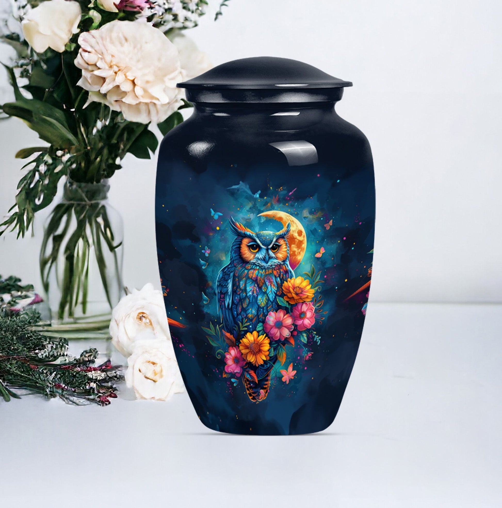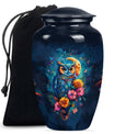This Classic Owl 10-inch Urn provides a perfect and respectful way to commemorate the life of your loved ones. A unique piece from our Memorial Ceremony Supplies collection, this cremation urn stature at a dignified 10 inches high with a weight conveniently at approximately 3.3 pounds. The urn is skillfully crafted from sturdy yet exquisite aluminium which further enhances its longevity. Featuring an expressive howling wolf theme, this particular masterwork encapsulates the essence of a free spirit. This large urn has flexibility with its capacity of 200 cubic inches, providing ample space for the remains. For added sentimental value, you could make it unique by engraving names on it. It also includes a velvet pouch to contain and cherish the ashes securely. Ideal as a memorial urn for dad, mom, or any dearly departed, this would also perfectly fit the search for 'Human Ashes Urn with Cross Design' or 'burial urns metal'. Whether you're searching for owl urns or miniature urns for men, this product offers multi-faceted purpose.