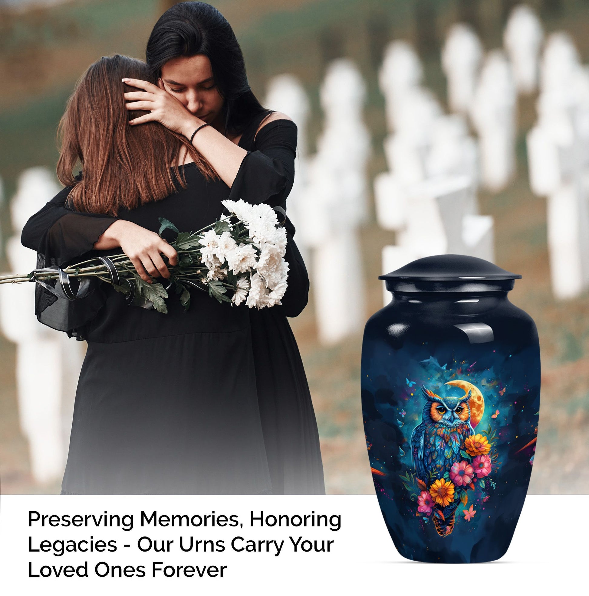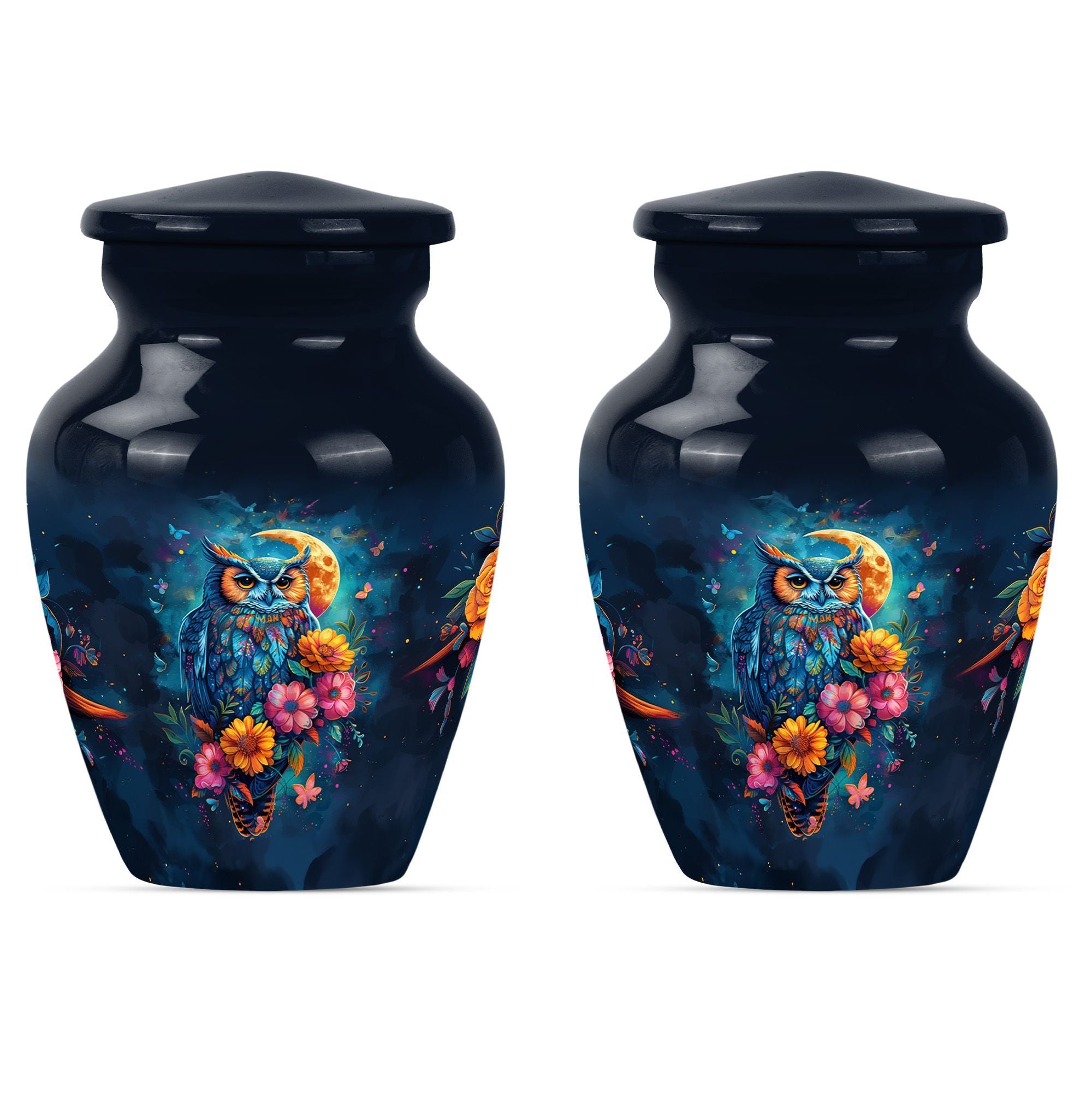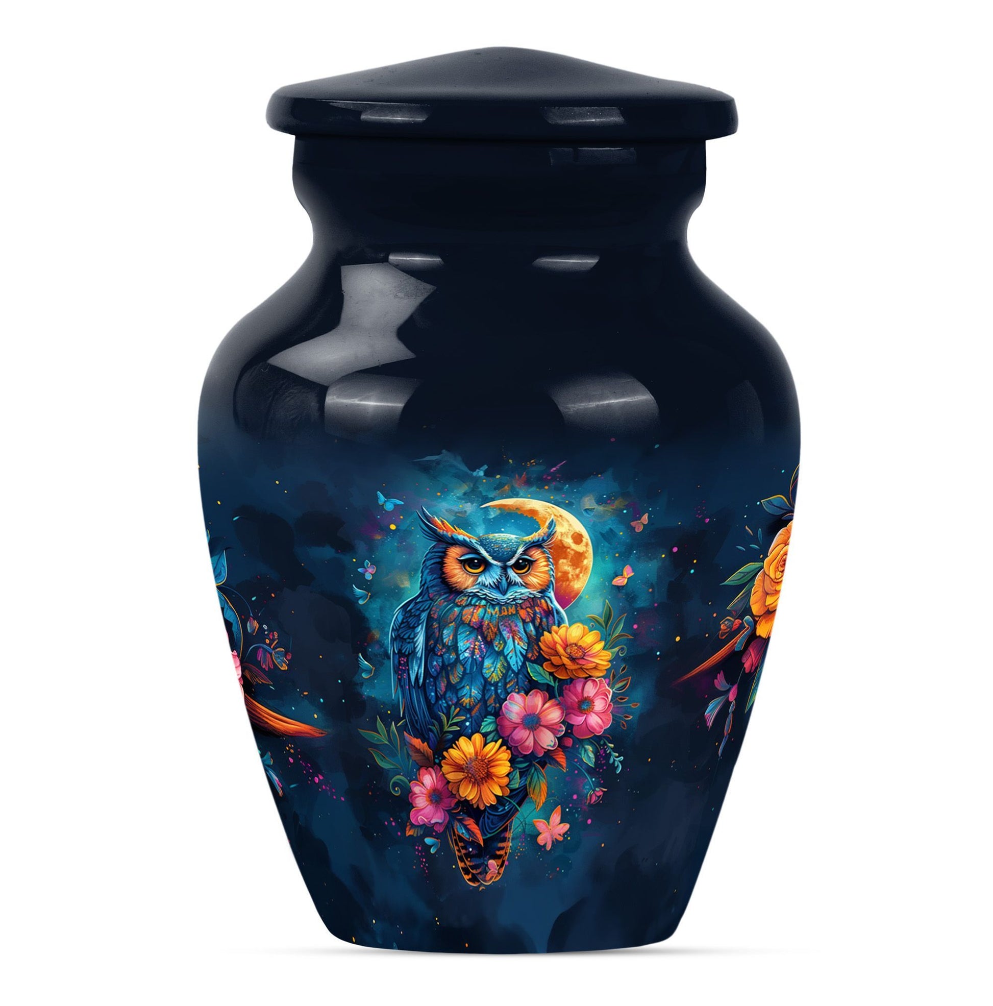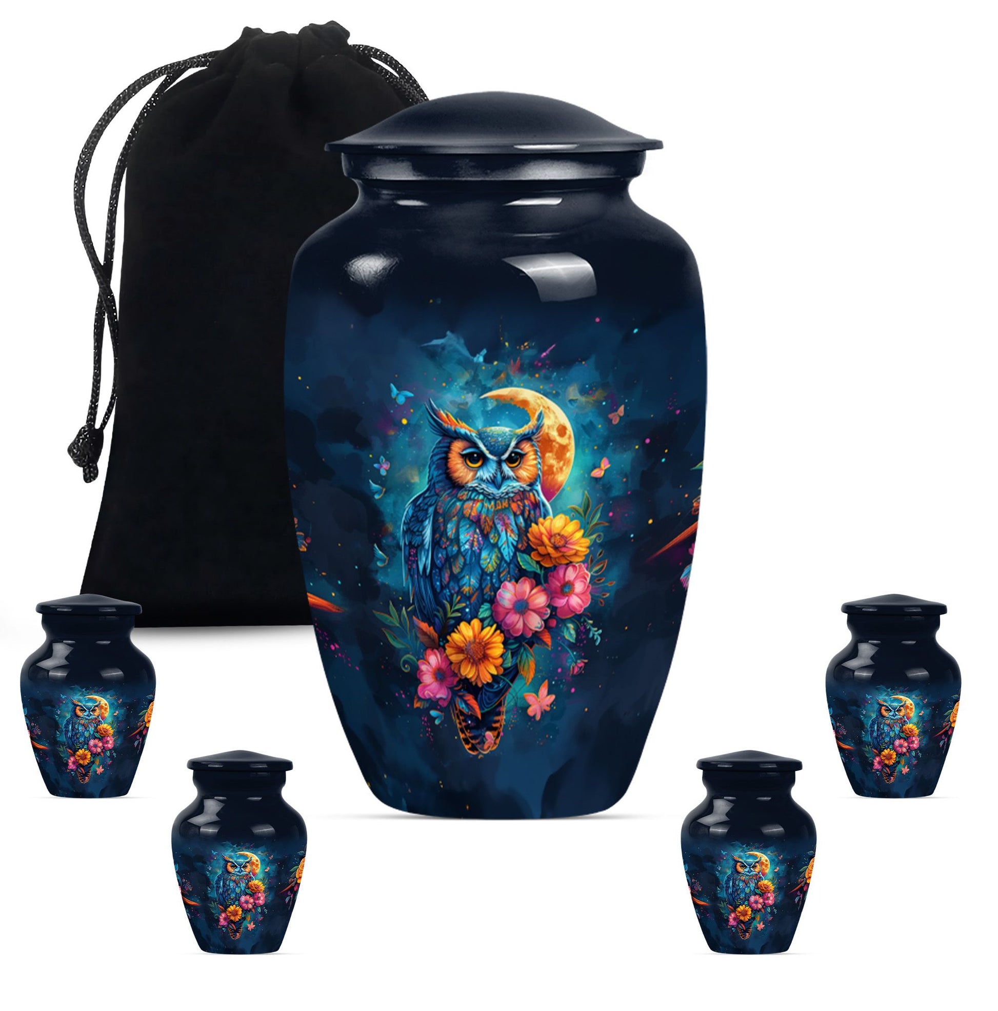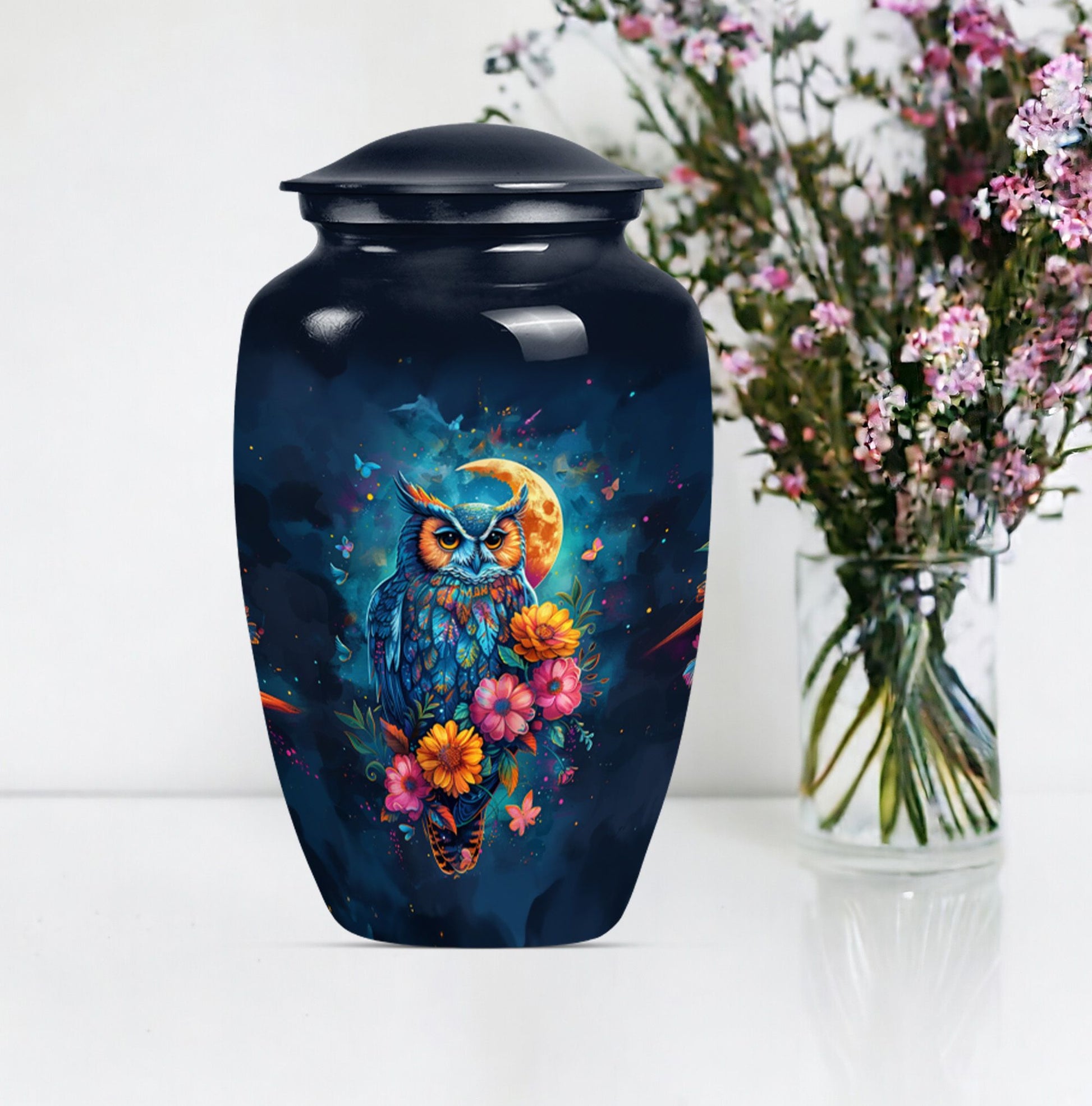 This Classic Owl 10-inch Urn provides a perfect and respectful way to commemorate the life of your loved ones. A unique piece from our Memorial Ceremony Supplies collection, this cremation urn stature at a dignified 10 inches high with a weight conveniently at approximately 3.3 pounds. The urn is skillfully crafted from sturdy yet exquisite aluminium which further enhances its longevity. Featuring an expressive howling wolf theme, this particular masterwork encapsulates the essence of a free spirit. This large urn has flexibility with its capacity of 200 cubic inches, providing ample space for the remains. For added sentimental value, you could make it unique by engraving names on it. It also includes a velvet pouch to contain and cherish the ashes securely. Ideal as a memorial urn for dad, mom, or any dearly departed, this would also perfectly fit the search for 'Human Ashes Urn with Cross Design' or 'burial urns metal'. Whether you're searching for owl urns or miniature urns for men, this product offers multi-faceted purpose.