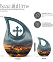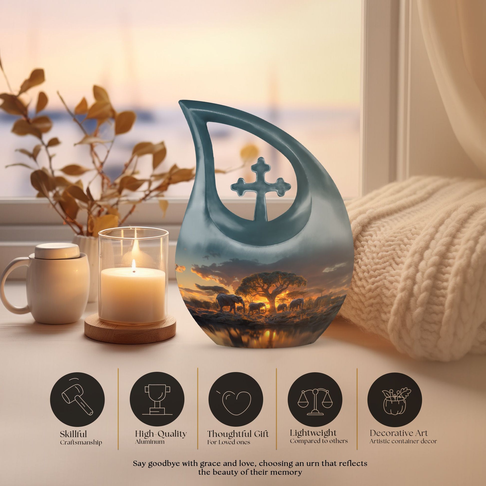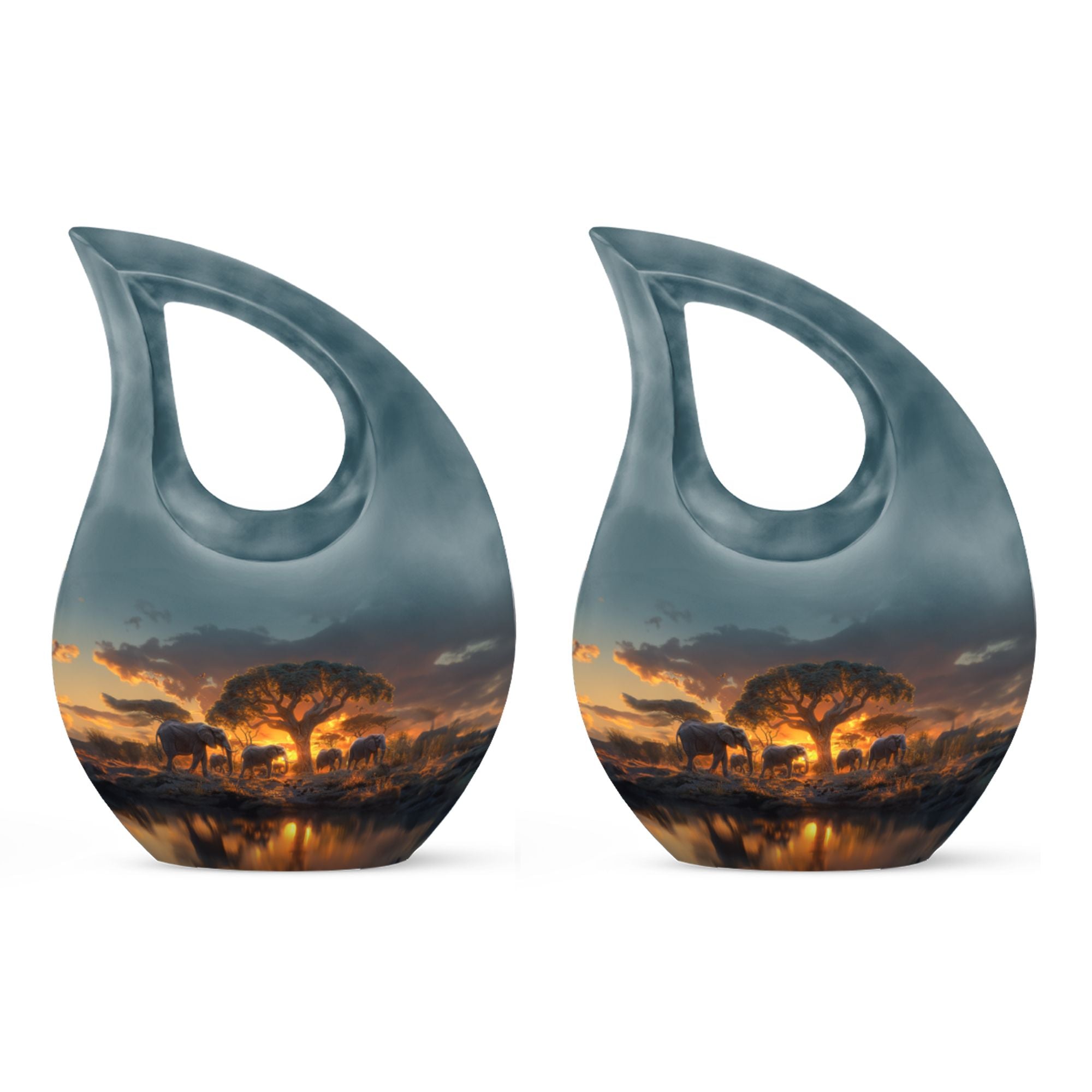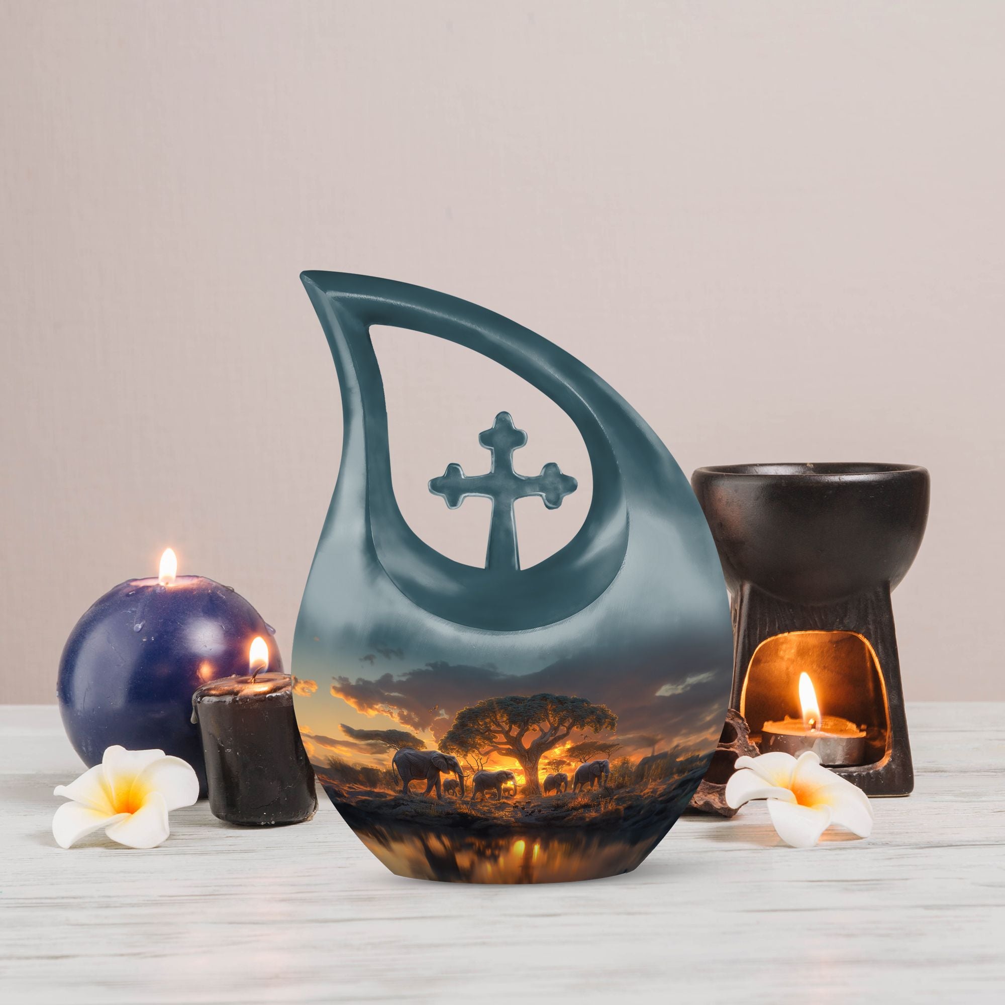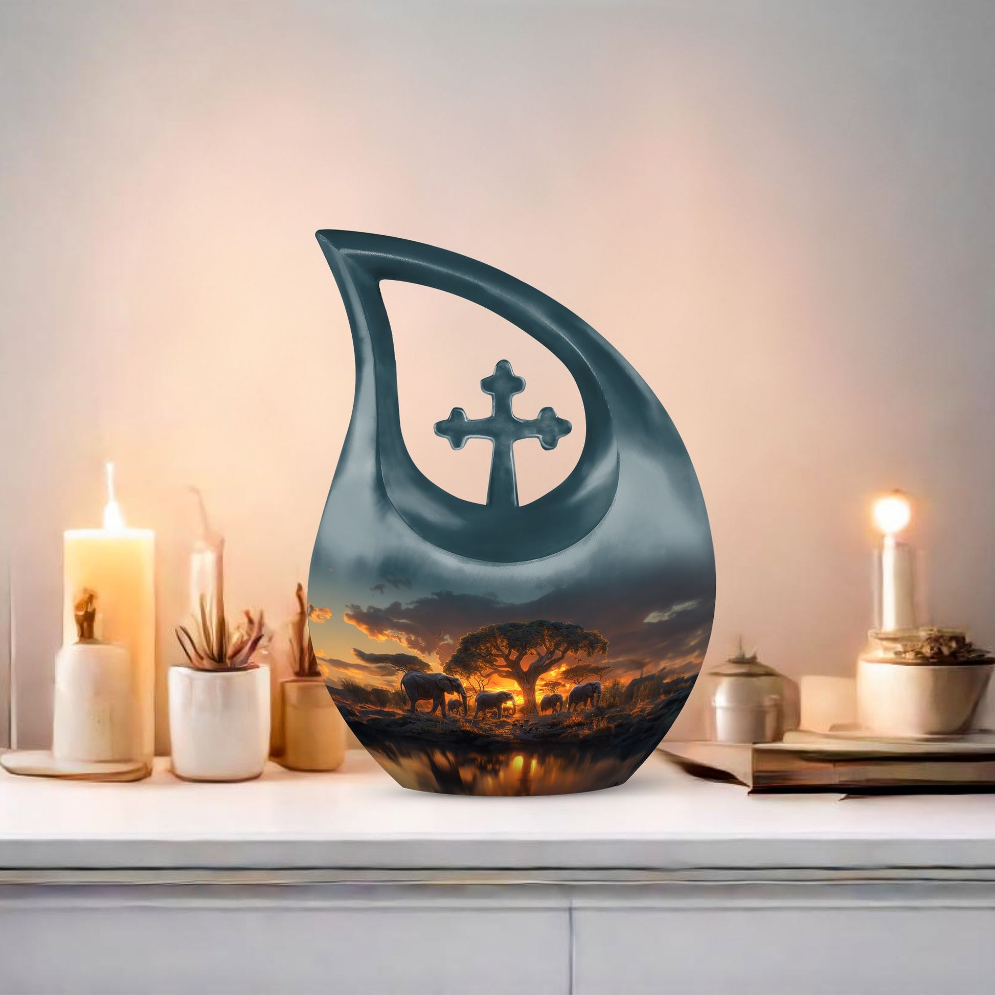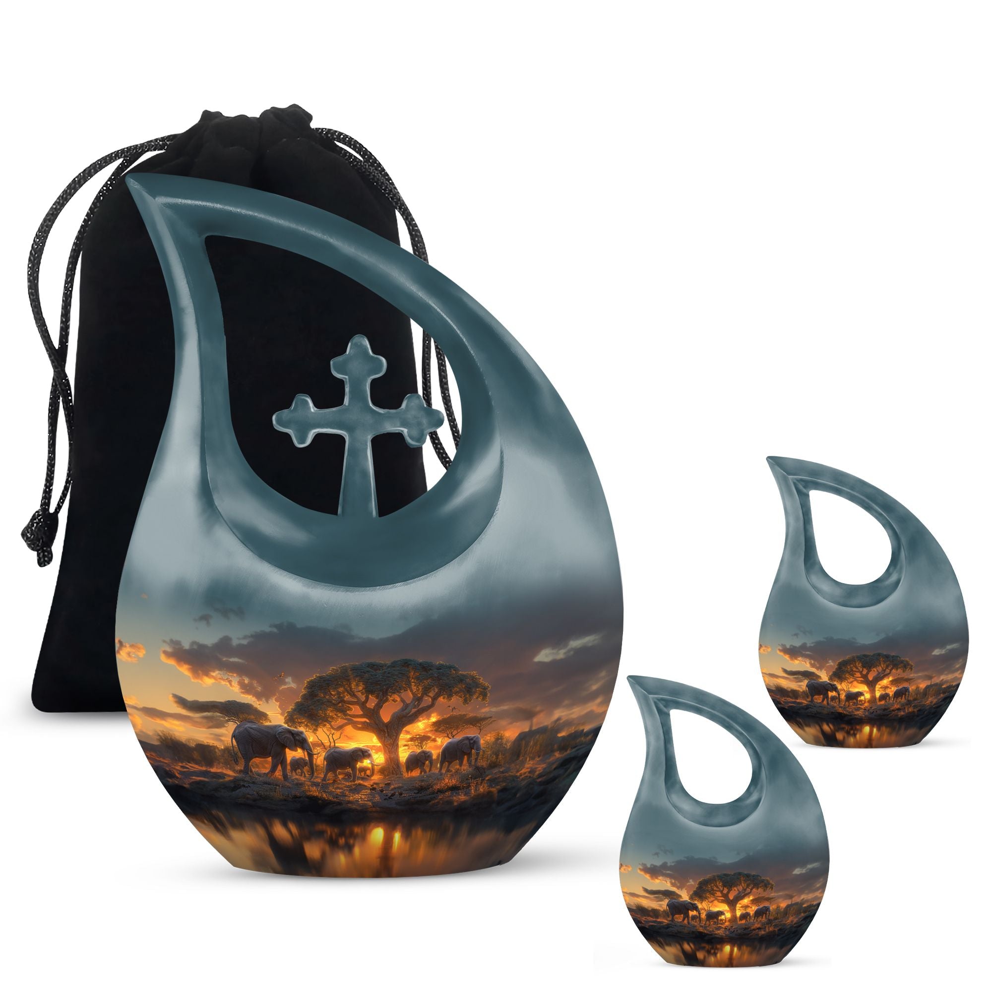 Showcase respect and love towards your departed loved ones with our Elephant Family Urn, an ideal choice in memorial urns. This cremation container is constructed exclusively from premium Aluminium, ensuring its durability and long-lasting nature. With its visuals inspired by the theme of the tightly knit Elephant family, the urn symbolizes unity, strength, and indomitable spirit. Its beautiful Cross Drop visuals evoke a sense of tranquility and peace. Garnering a capacity of 200 cubic inches, it can compassionately hold the ashes of your cherished one. The urn dimensions stand at a regal 10 inches in height and have a solid feel with a weight of 3.3 pounds. To enhance its sacred value, it allows for personalized engraving of names. Furthermore, the product comes with a soft velvet pouch designed for considerate containment of the ashes. The Elephant Family Urn is a perfect blend of both — a tasteful tribute and an elegant home decor, catering adeptly to your large urns requirement. Grace your memories with this remarkable piece today.