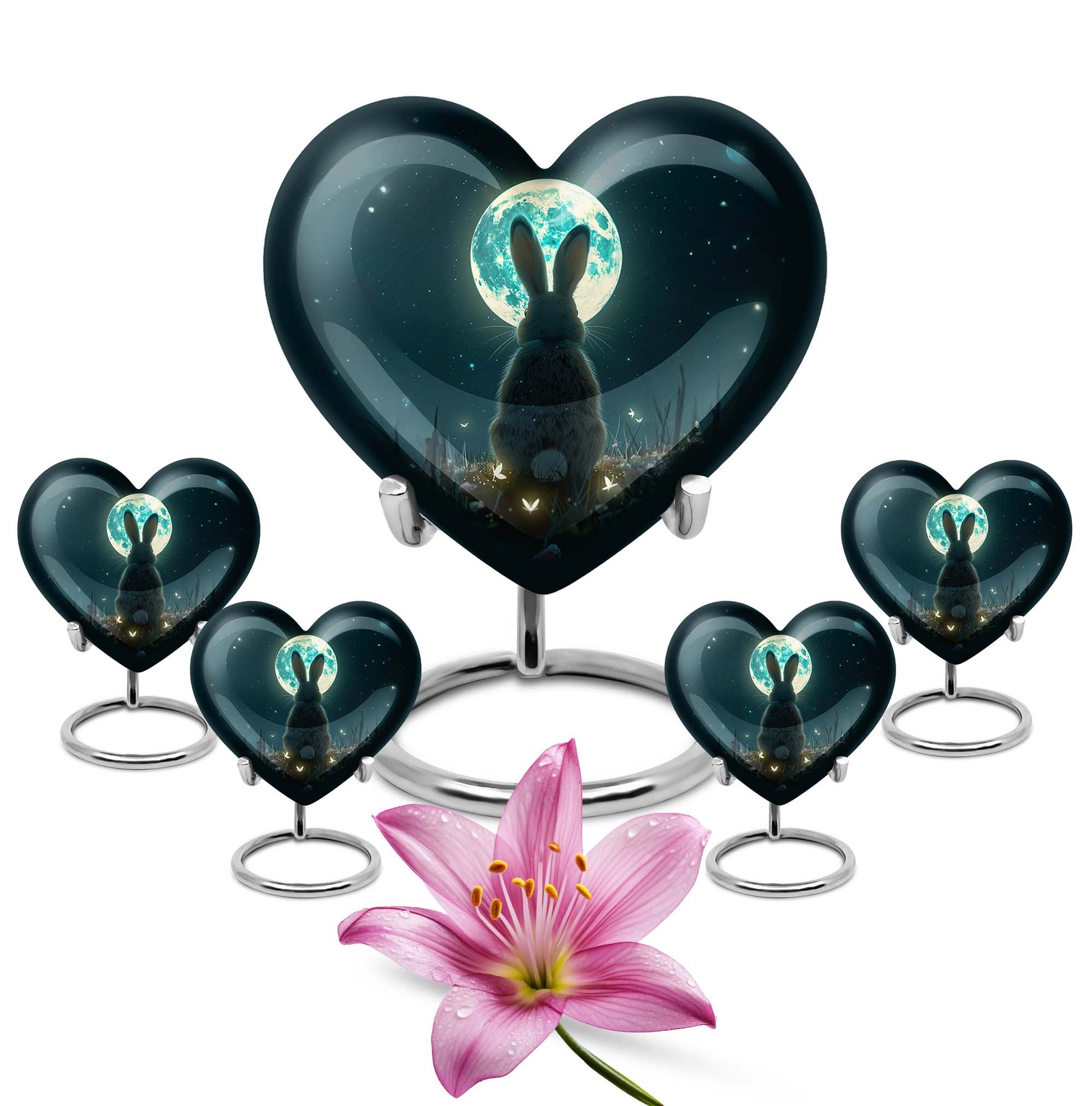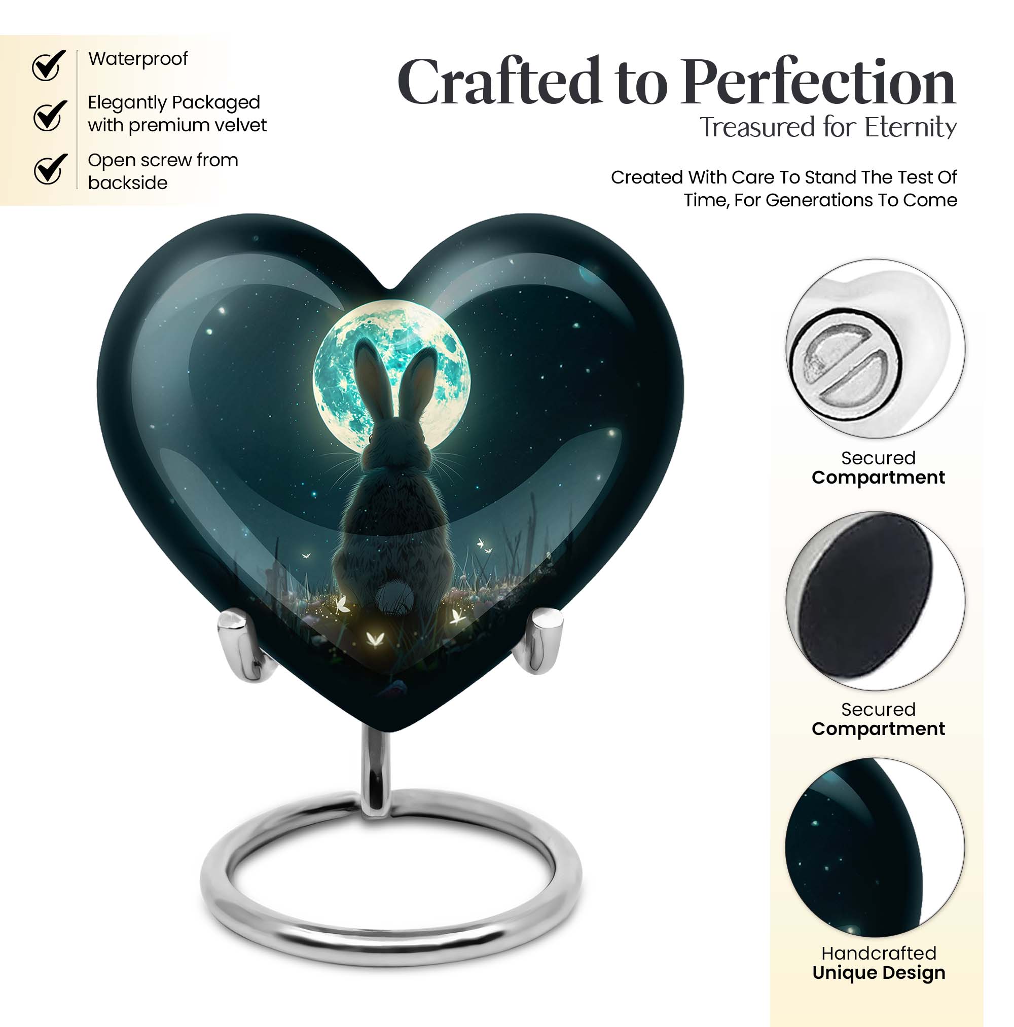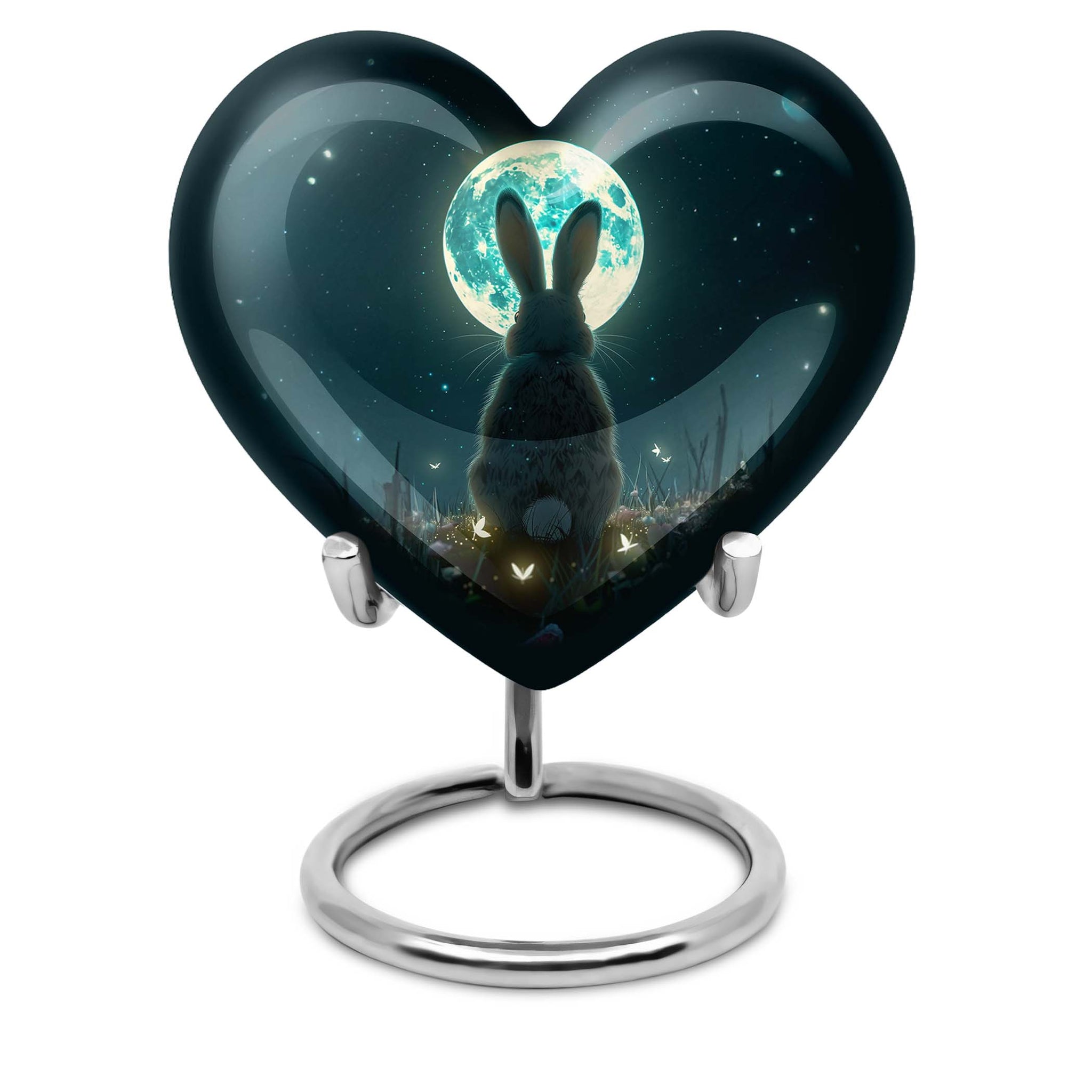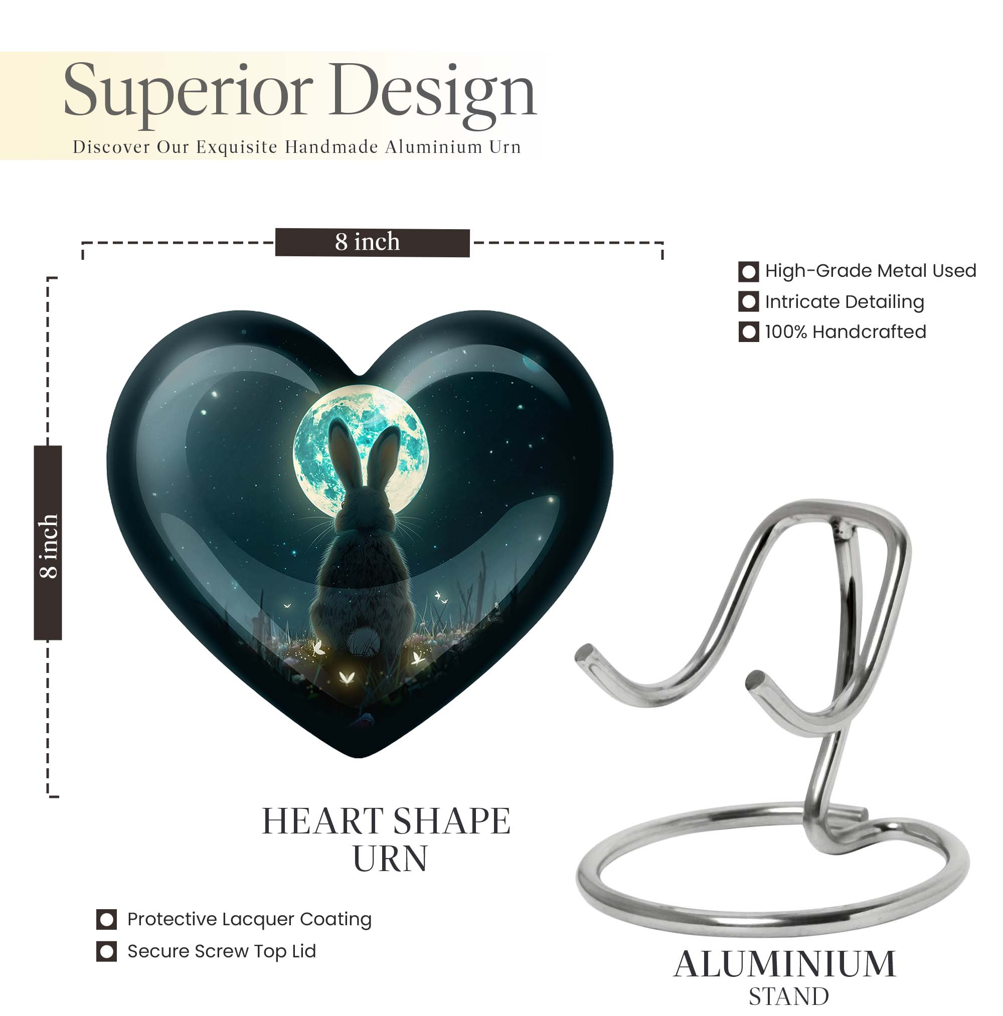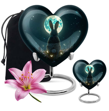 Behold the White bunny moon urn, a supreme example of skilled craftsmanship, designed with an abstract theme to honor loved ones passed. This memorial urn, meticulously carved from high-quality aluminium, stands proud at a height of 10 inches, and weighs in at a sturdy 3.3 pounds. Each detail of this large urn captures a unique essence, making it far more than a simple funeral urn for ashes. Functional yet extravagant, our urn offers an impressive capacity of 200 cubic inches, perfect for storing ashes of an adult male or dad with dignity and respect. The package includes a luxury velvet pouch for containment and secure keeping of the ashes. Moreover, our urn allows personalization with engraved names, adding an extra touch of homage to your beloved. Highly sought for its unique and uncommon design, reminiscent of serene moonlit nights, this is more than just an urn; it's a token of love and cherished memories. When searching for memorial urns, you won't find one quite likes this. It is a symbolic sanctuary, outdoing standard urn ash men with its radiant beauty and elegant construction.