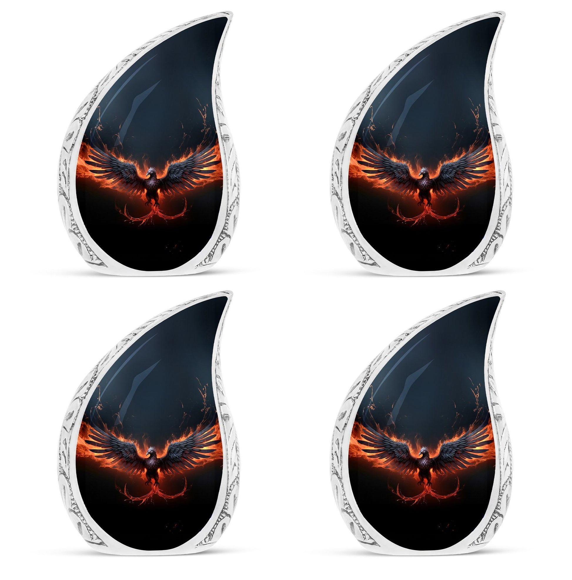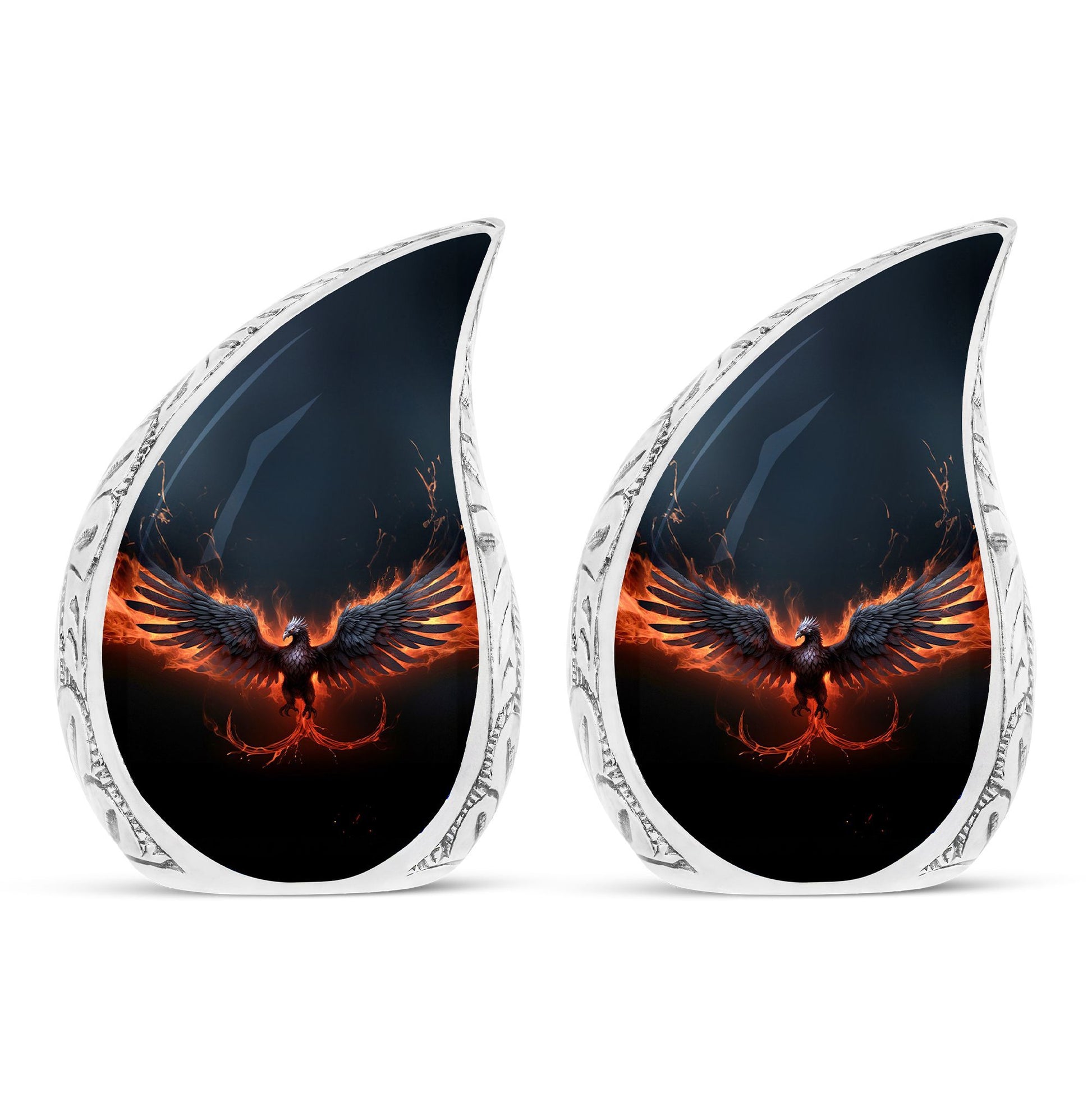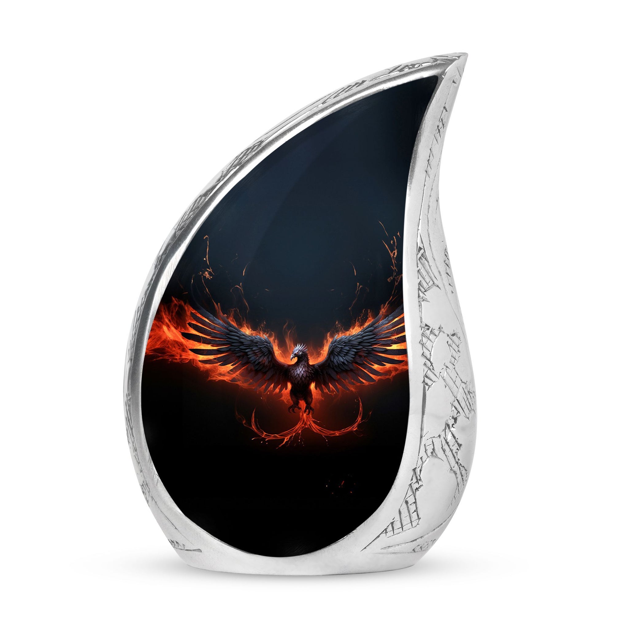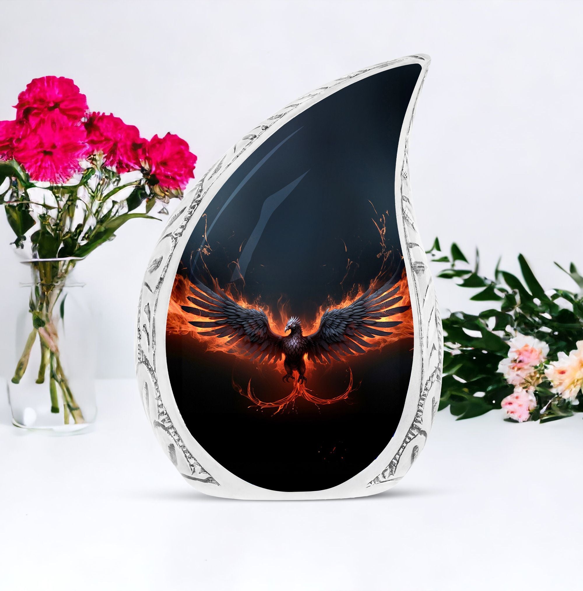 Honor your loved ones with the Black Phoenix Memorial Urn - a respectful and fitting tribute for preserving treasured memory. Expertly handcrafted with an aluminium body, this Large Urn stands 10 inches tall, with a capacity of 200 cubic inches, making it a suitable ashes container for adults. Despite its towering size, it has a manageable weight of 3.3 pounds, graced with an unmatched classic urn form that transcends temporal trends. The item also includes a thoughtful addition of a sumptuous velvet pouch to encase the ashes safely. Additionally, personal touches can render this urn more special. Engraved names allow you to uniquely customize the urn, adding a heartfelt touch to this important memento.