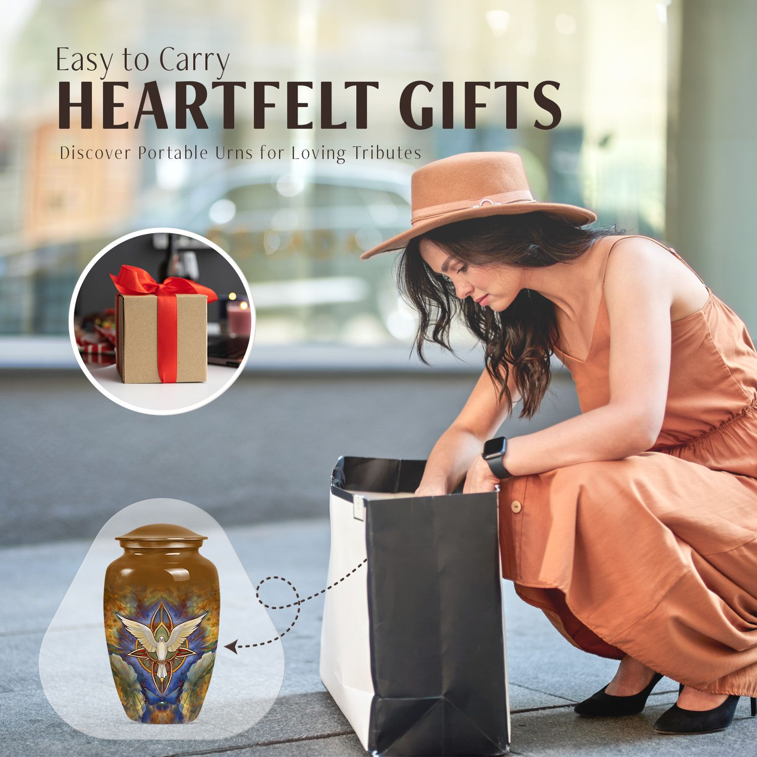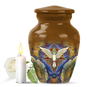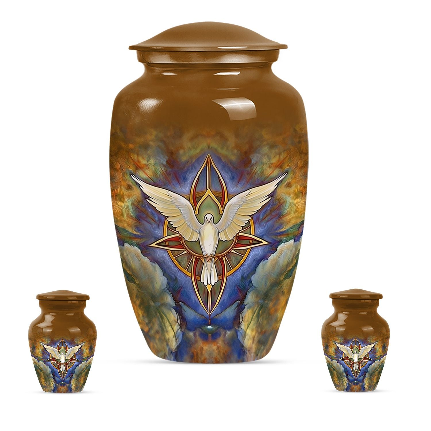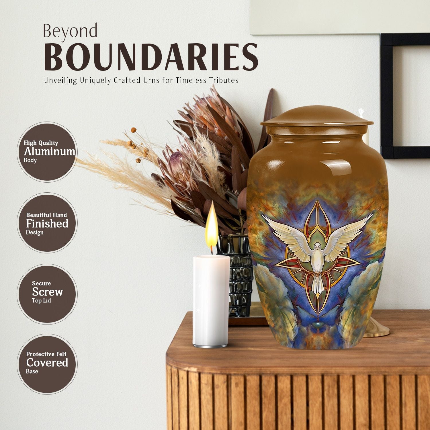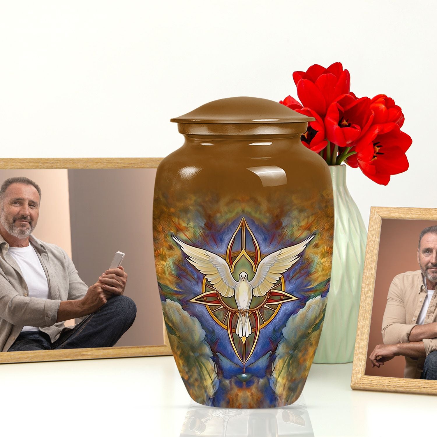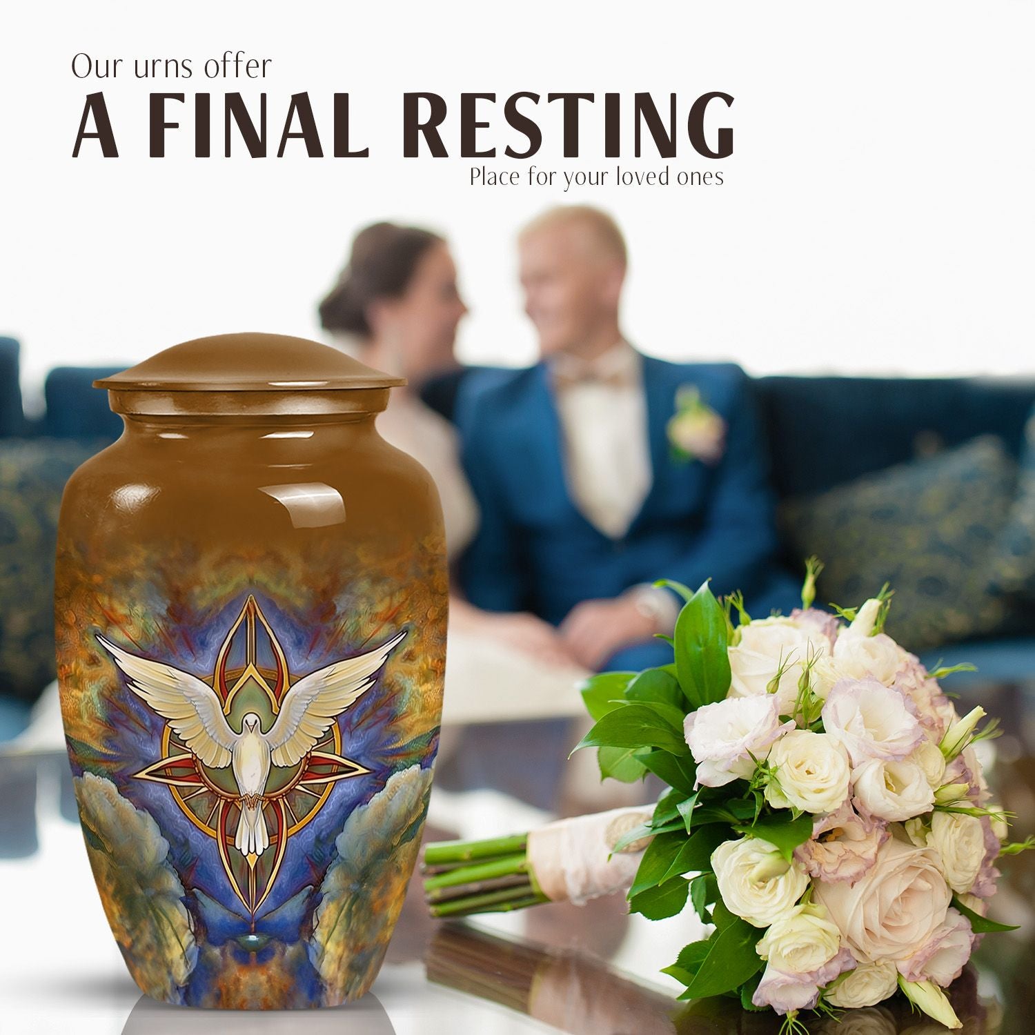 In memory of your beloved, this Catholic Urn is a perfect blend of dignity and reverence. Crafted from robust aluminium, this large urn, measuring 10 inches in height, offers an impressive capacity of 200 cubic inches, which easily accommodates cremation ashes. Weighing a humble 3.3 pounds, the abstract-themed classic urn is an embodiment of your enduring love and affection. To make it even more special, personalize this cremation urn with engraved names, adding a unique touch of intimacy. Each urn is prepared with care and comes with a velvet pouch, ensuring secure containment of ashes. This cremation urn is not just about remembrance, it's a heartfelt tribute catered to both men and women alike. Ideal for searching phrases like 'funeral urns for ashes', 'cremation urn', or 'metal funeral urns', this product is a distinctive piece of art, offering a sophisticated way to treasure your dear ones forever.