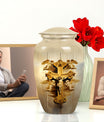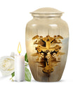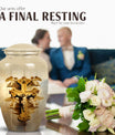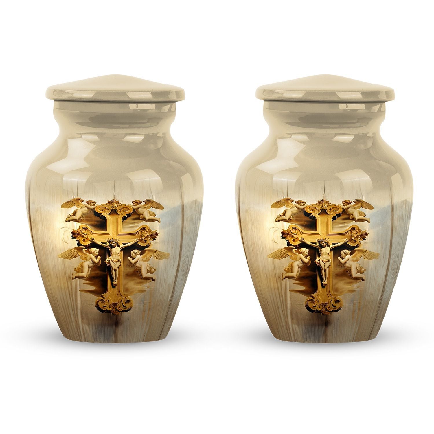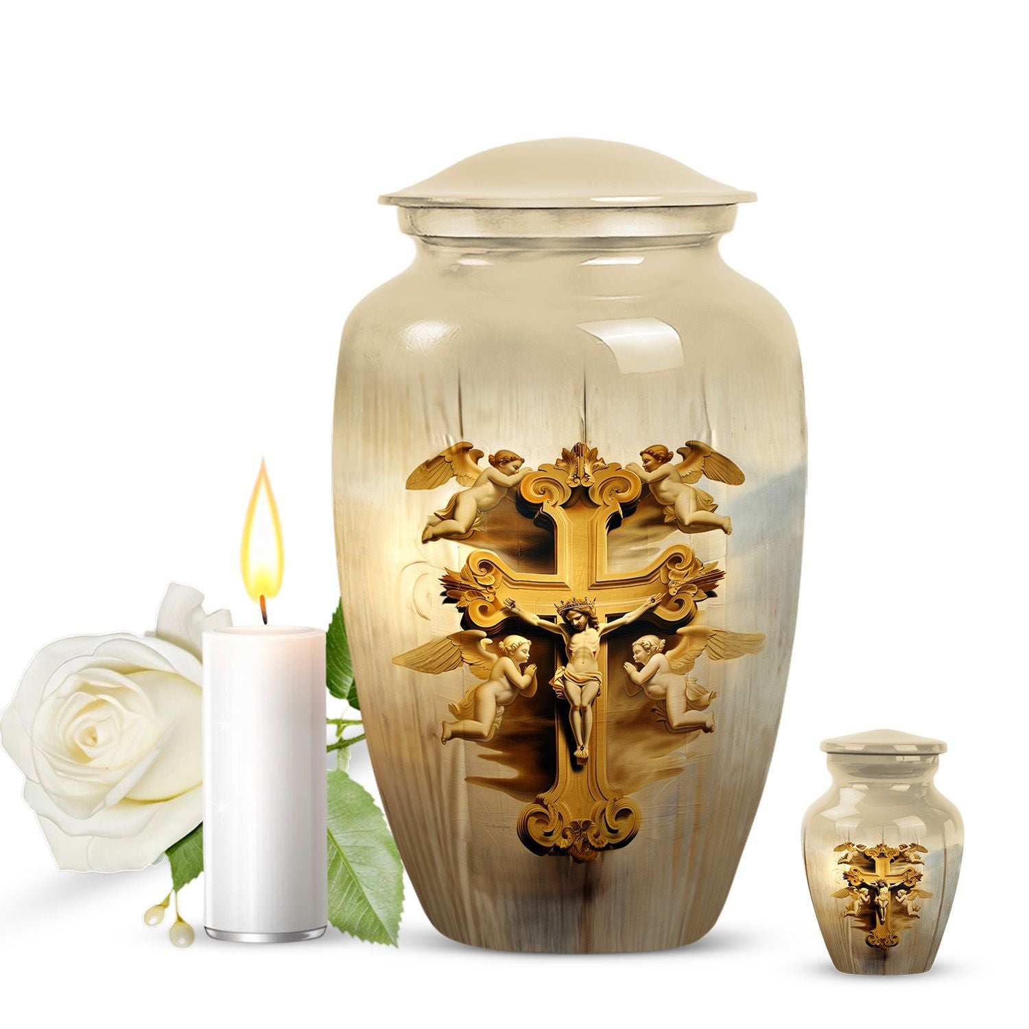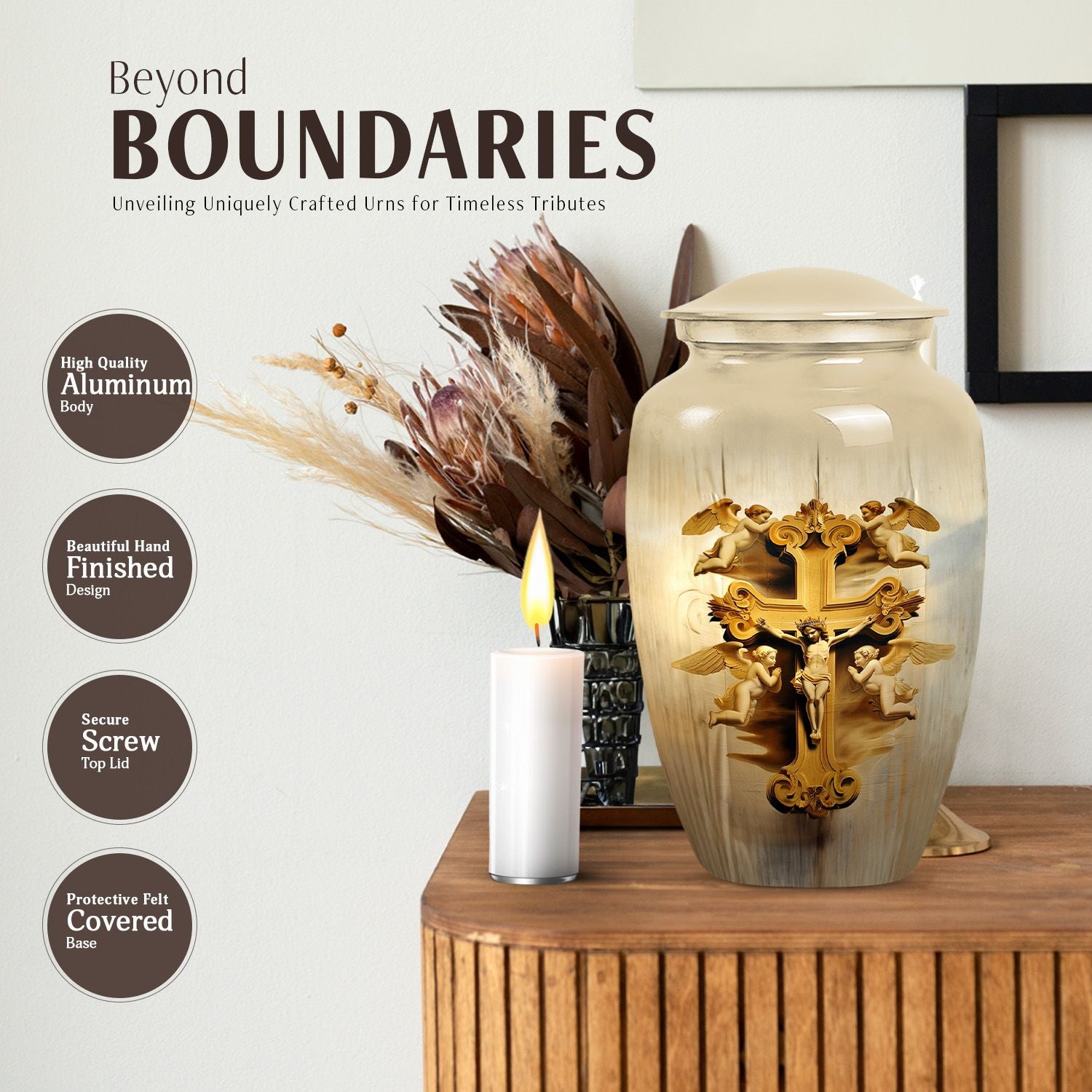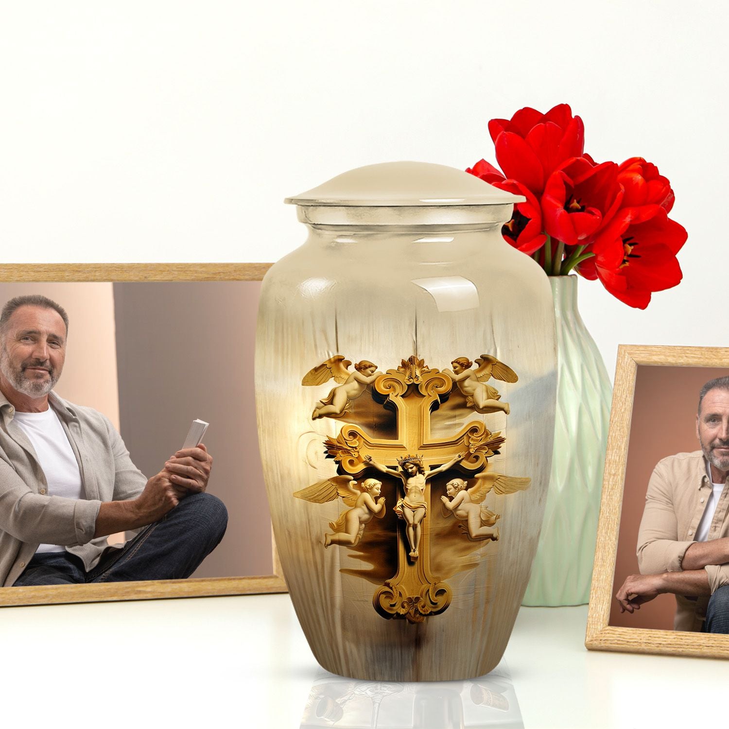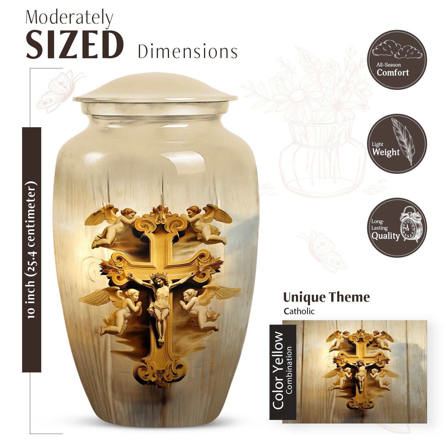 Introducing an elegant final resting place, our Catholic Urn is carefully crafted from premium Aluminium, ensuring durability and long-lasting peace of mind. Sized at a dignified 10 inches, this cremation urn for human ashes is an adult male size with a generous capacity of 200 cubic inches, suitable for various needs. Its substantial weight of 3.3 pounds further stamps its permanence. Provision for personal engraving allows you to etch the names of your loved ones, making this more than an urn, but a tribute. It steps away from mundane designs, showcasing an abstract theme that is unique, yet respectful. This packaged deal also comes with a sophisticated velvet pouch, facilitating easy containment and transportation of ashes. In the vast ocean of cremation urns, burial medium size urns, and funeral urns for adult ashes women, this Catholic Urn stands as a beacon, merging sentimentality with striking aesthetics. It is not only a large urn but a symbol of cherished memories cast in timeless aluminium.