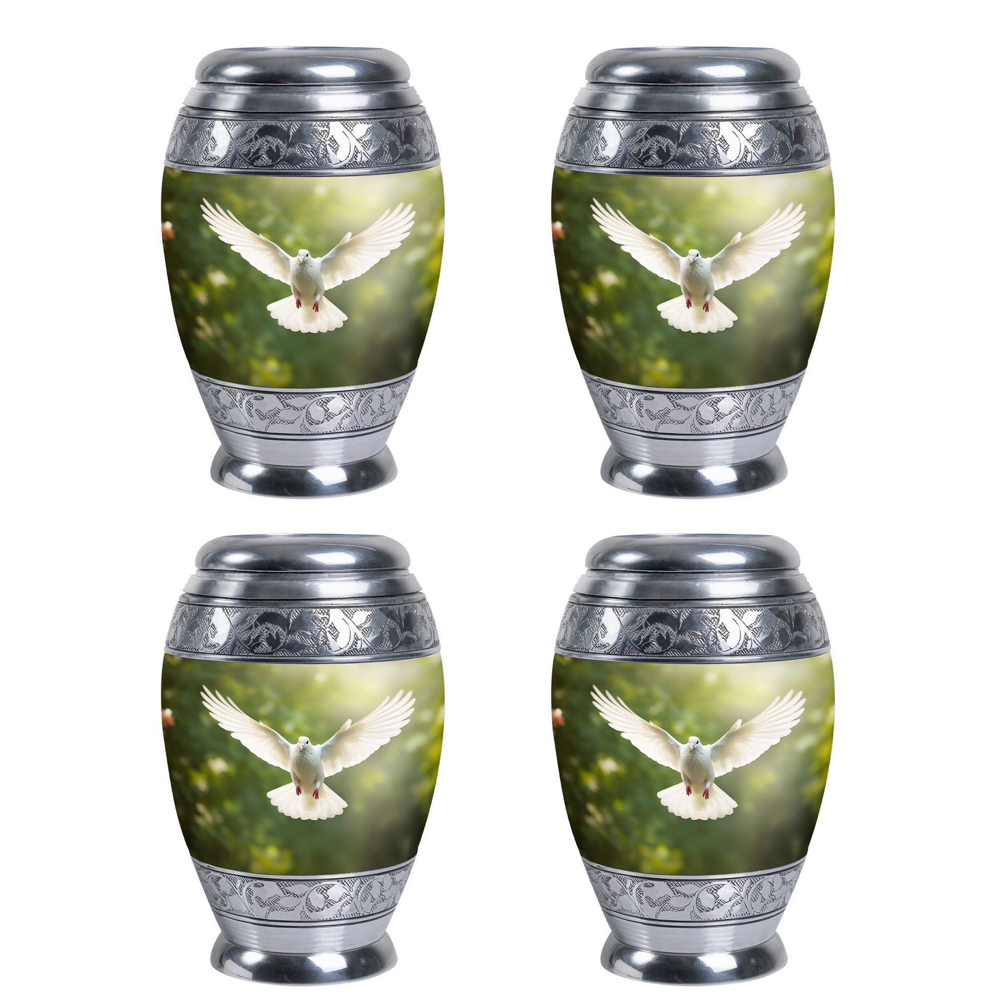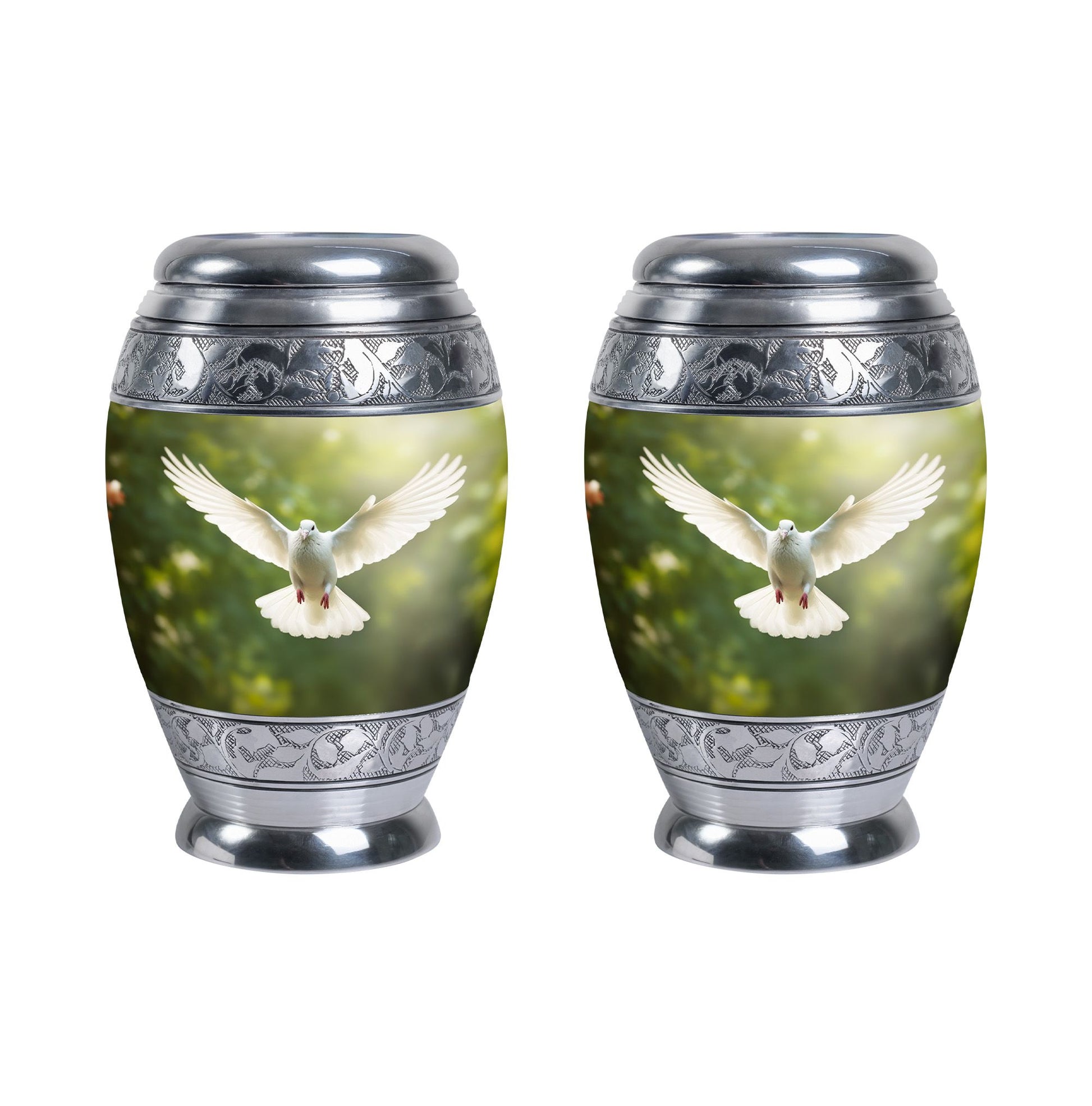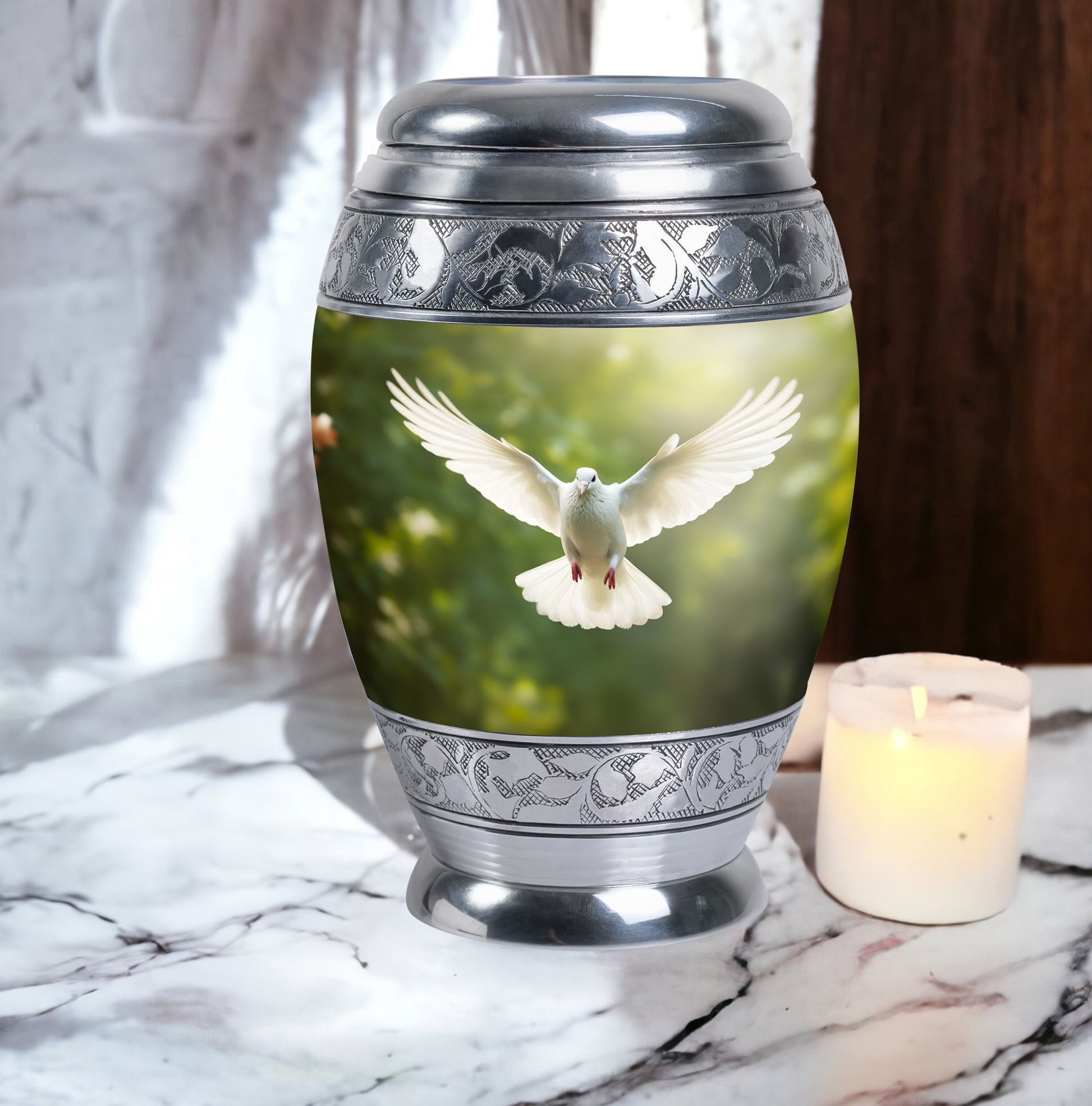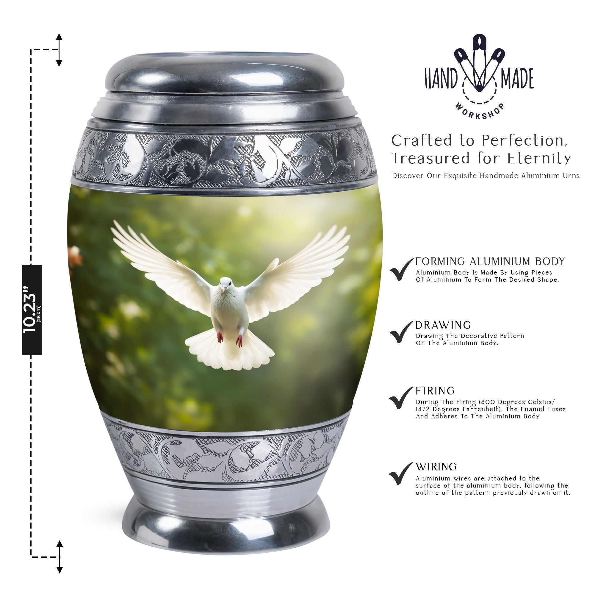 A symbol of dignity, respect, and remembrance, our Dove Cremation Urn is a tasteful and poignant piece. Sized at a compact 3 inches and weighing a sturdy 3.3 pounds, this Large Urn crafted from Aluminium is an elegant repository for your loved ones' ashes. Its dimensions stand at a respectable 10 inches in height, a classic urn style that is both timeless and universally appealing. With a capacity of 200 cubic inches, it can hold the ashes of adults. The product also comes with a quality velvet pouch to store the ashes securely and discreetly. The Dove Cremation Urn can be personalized with an engraving of your loved ones' names, offering a unique way to remember and honor their memory. A fine balance between 'Cremation Urns Ashes' and 'Ashes Holder', our Dove Cremation Urn is more than just an 'urn for ashes'; it is a dignified way to remember those who have departed.