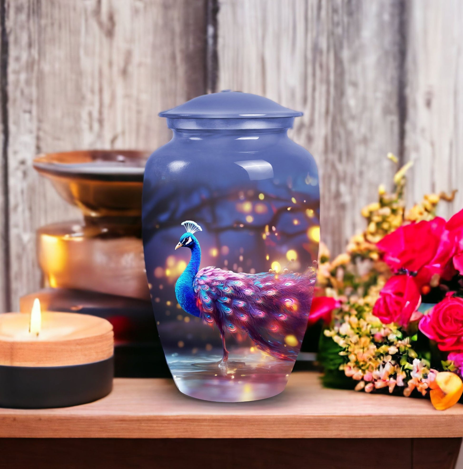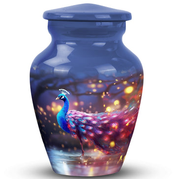 Our majestic Peacock urns for human ashes offer an elegant and timeless space to cherish the memories of your loved ones. Crafted with heart and made of durable Aluminium, these 3-inch large urns can hold up to 200 cubic inches, making them an ideal choice for human cremation ashes. Weighing at 3.3 pounds and 10 inches in height, these urns are compact yet prominent enough to keep your loved ones close at all times. Each package also comes with a velvet pouch for the containment of ashes, adding an extra layer of elegance and security. With an option to personalize with engraved names, you can honor your loved ones in the way they deserve. Perfect for those in search of memorial urns that strike that perfect balance between design and respect, these urns also make excellent decorative pieces, further testifying to the wonderful lives lived. Note that 'design' specifics are available upon ordering.