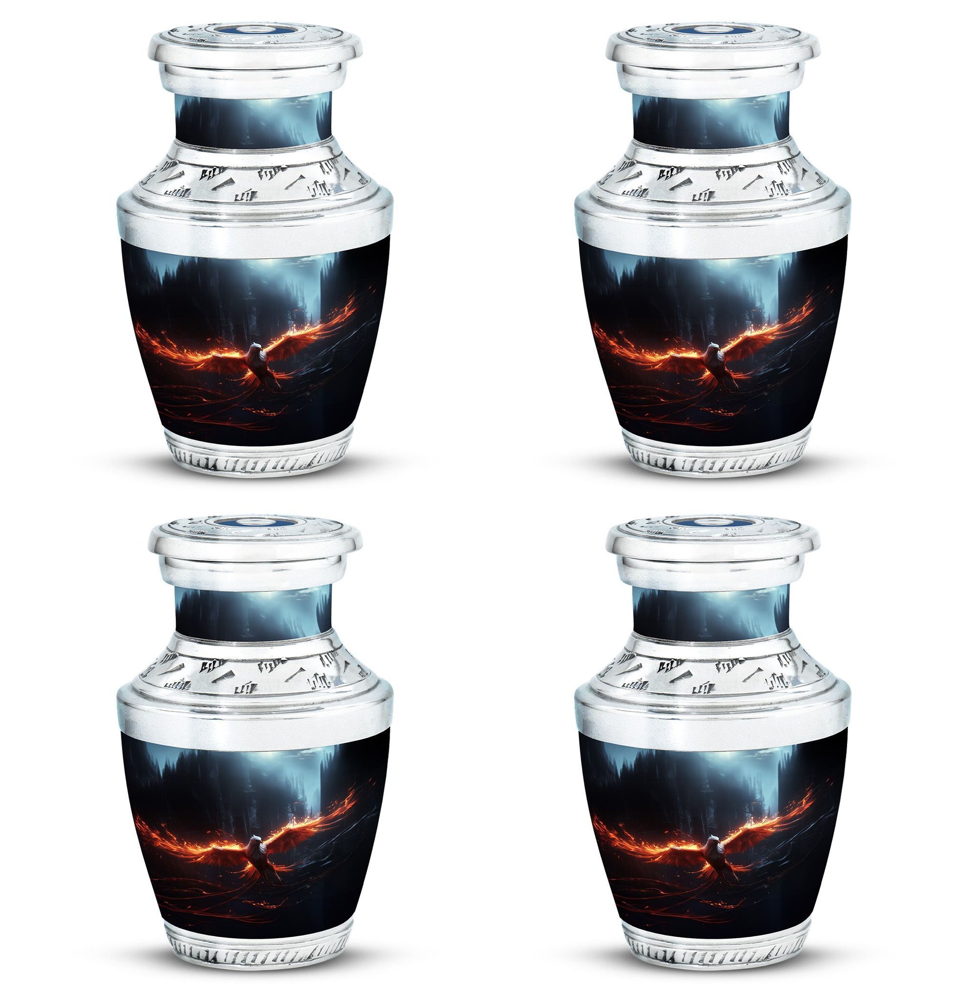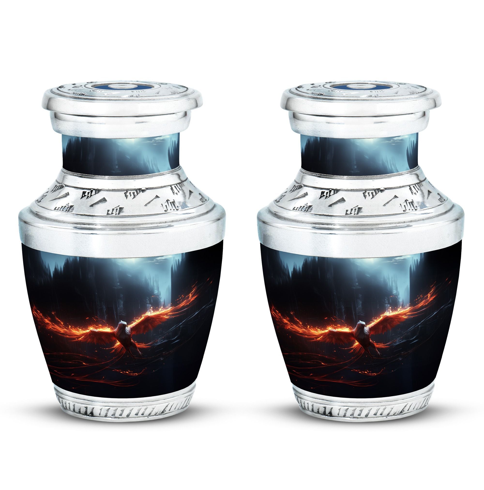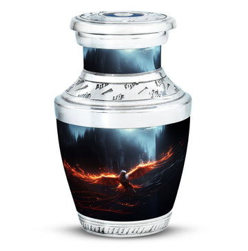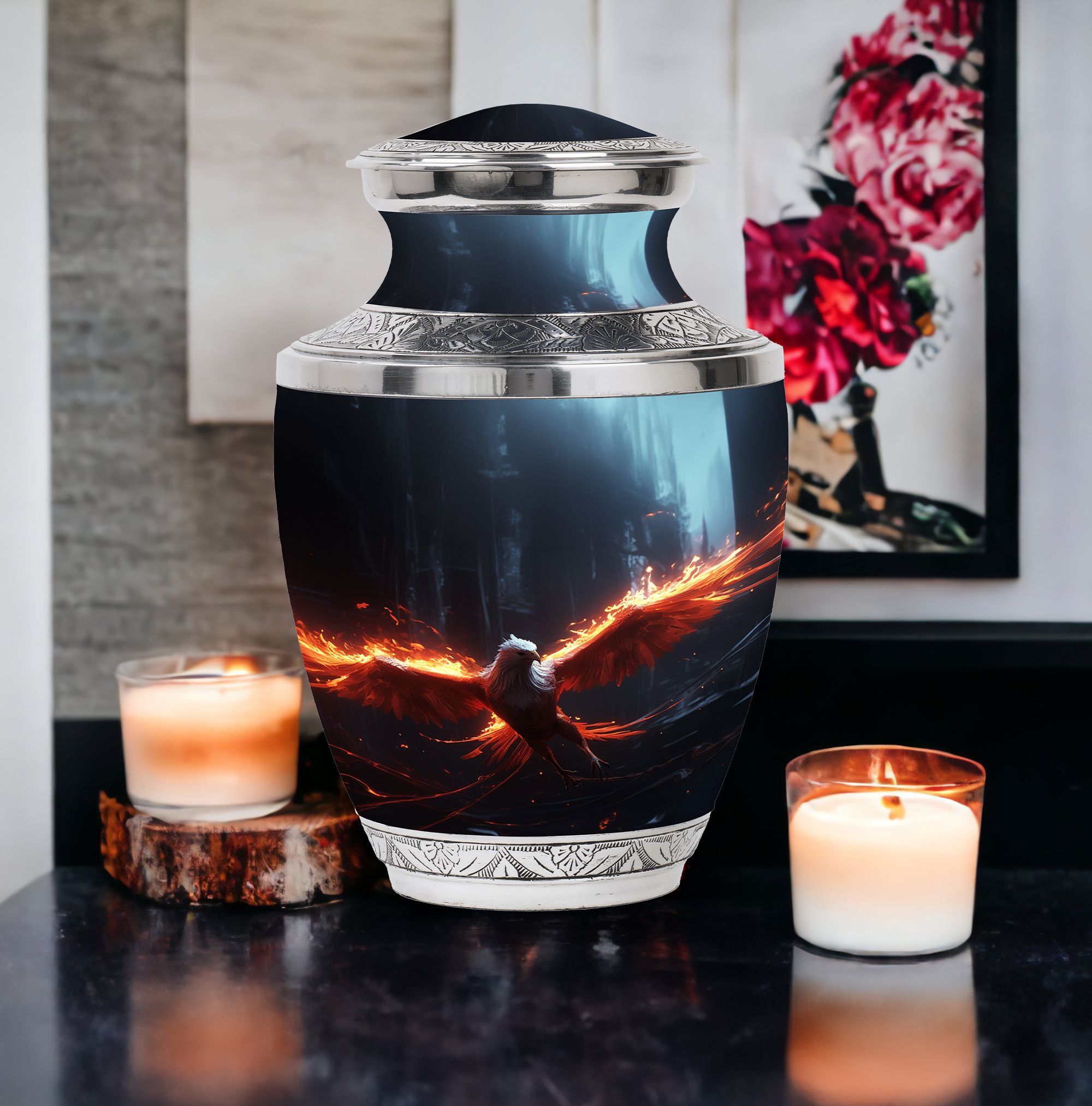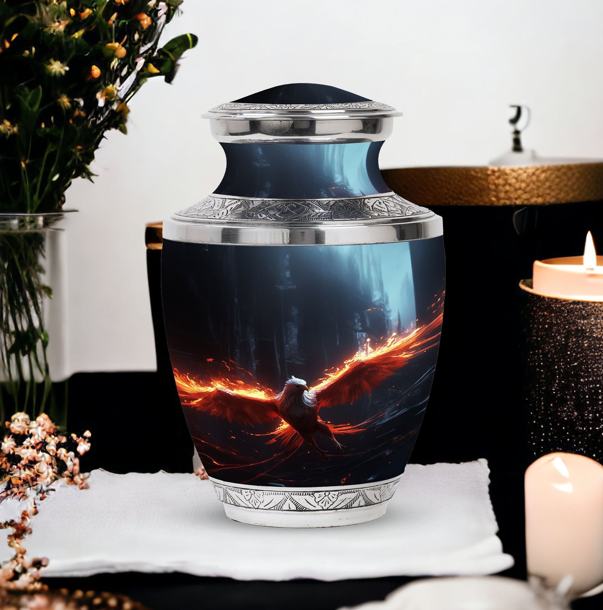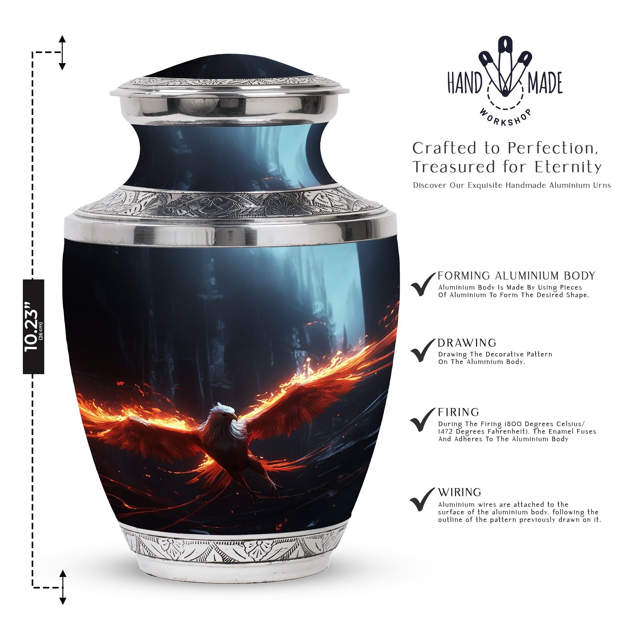 Introducing the exceptional Phoenix Cremation Urn, an emblem of reverence and devotion, ideal for those seeking a deeply meaningful memorial gift. Crafted from durable aluminium, this large urn prides itself on its timeless, classic design, standing proud at 10 inches in height and weighing a substantial 3.3 pounds. With a substantial capacity of 200 cubic inches, it ensures adequate containment for ashes. The urn accommodates unique, personal touches with its customizable engraving feature, ensuring the urn truly represents the one it memorializes. The item is conveniently complemented with a high-quality velvet pouch, ensuring secure retention of the ashes. Not your average cremation urn, this Phoenix Cremation Urn redefines memorial tributes and makes a valuable addition to your personalized urn for adults' collection. Radiating amalgamation of elegance and solace, it serves as a comforting tribute to your loved ones. A truly beautiful urn for mom or other cherished individuals.
