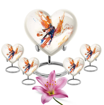 This Large 10-inch Aluminum Memorial Urn perfectly embodies the spirit of love and remembrance. Our heart-shaped urn, in an abstract theme, conveys a sense of timeless elegance, making it an ideal funeral urn for a loved one. The urn, weighing 3.3 pounds, offers a capacity of 200 cubic inches, making it suitable for both men and women. Customize your urn by personalizing with engraved names, adding a uniquely personal touch to this already distinctive piece. It comes securely packaged with a velvet pouch for effective containment of ashes, ensuring the utmost respect and care for your cherished memento. This unique urn is a beautiful way to pay tribute to your loved one, making it perfect for those searching for 'basketball urn', 'funeral urn for female', and 'cremation urns for men & women'. Capture the essence of the person you admired with our elegantly crafted, large, heart-shaped urn.