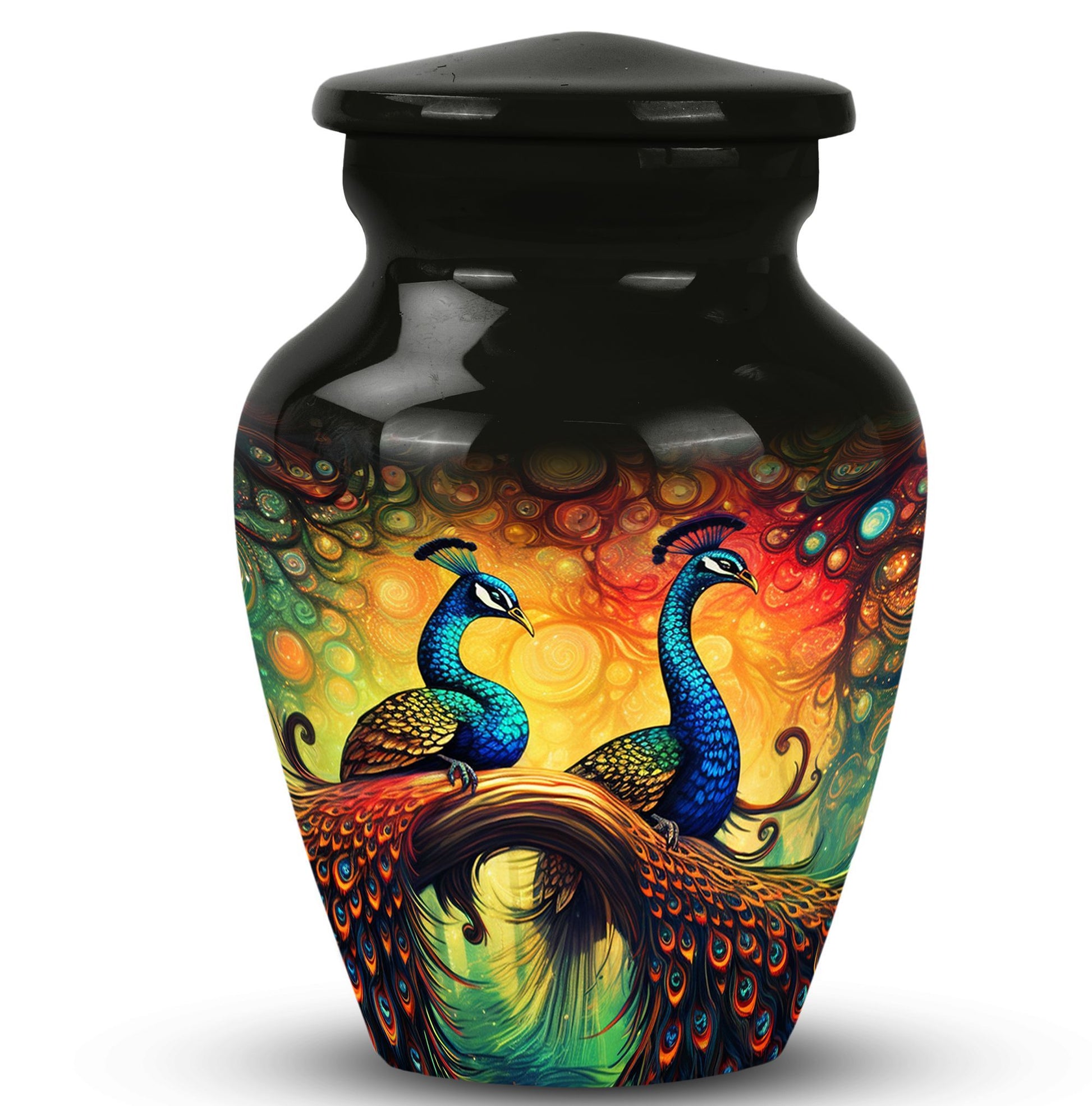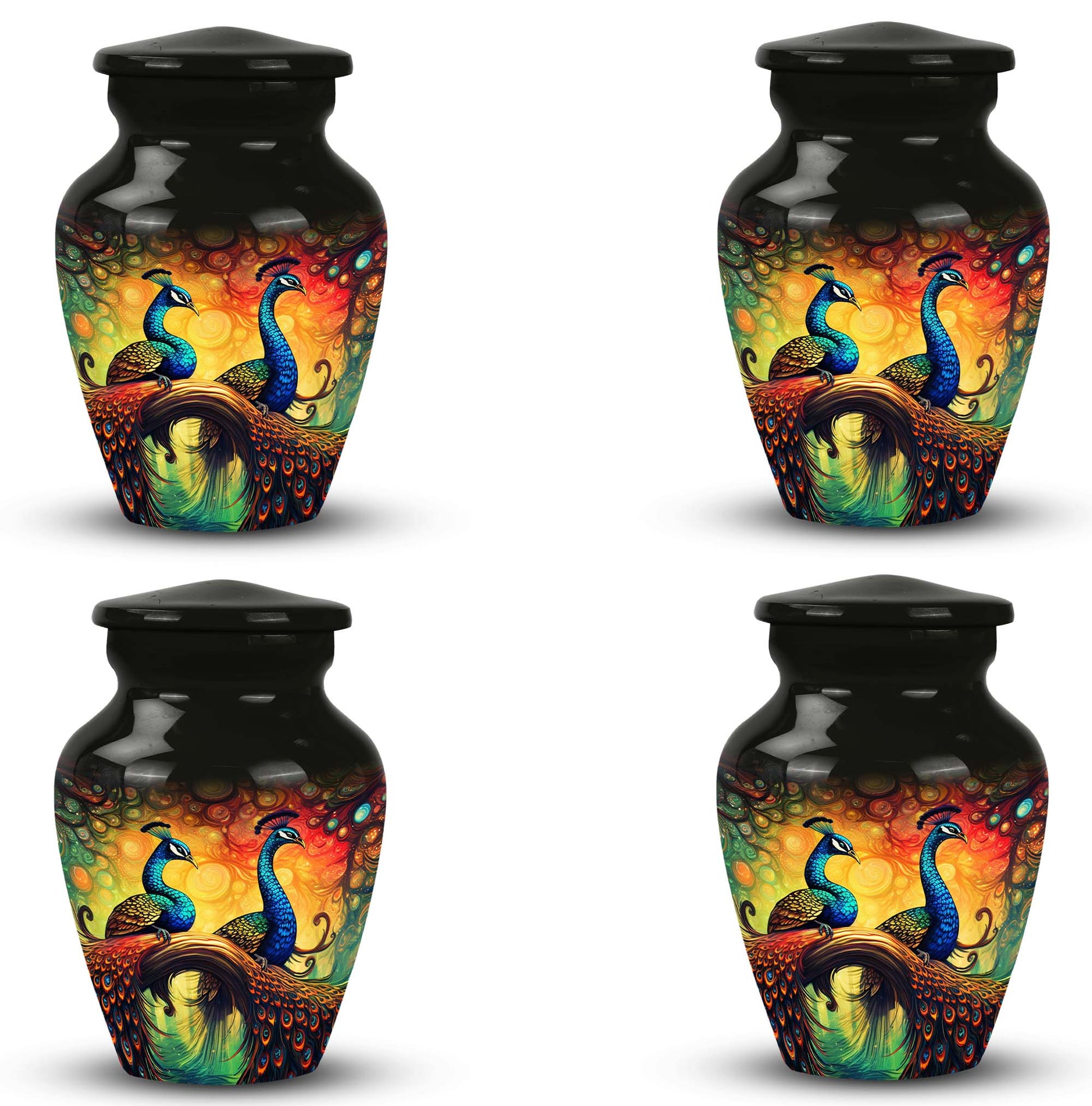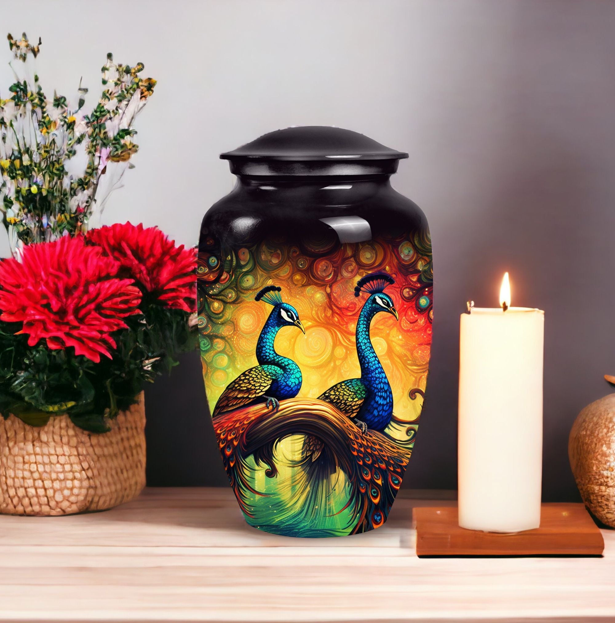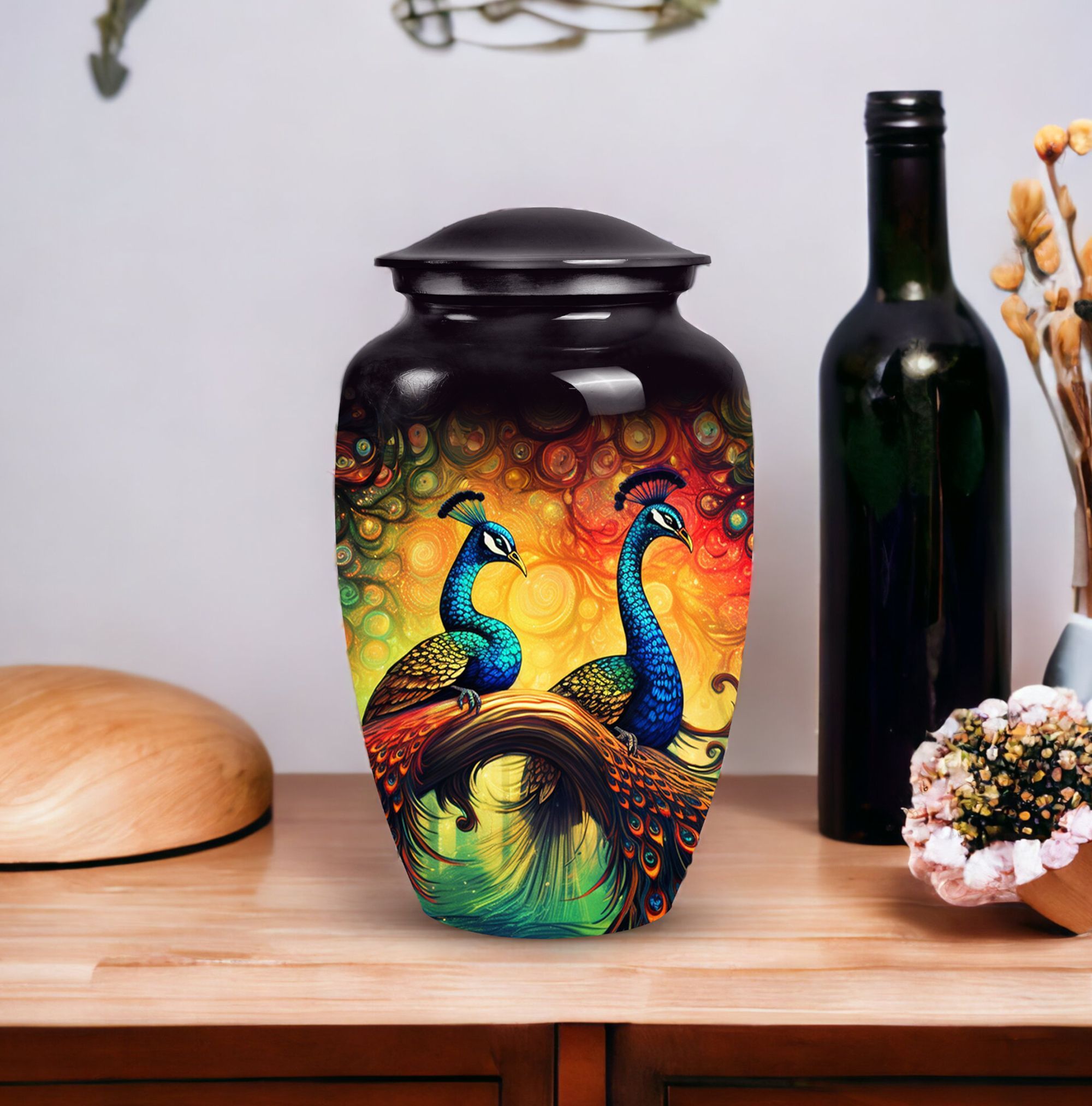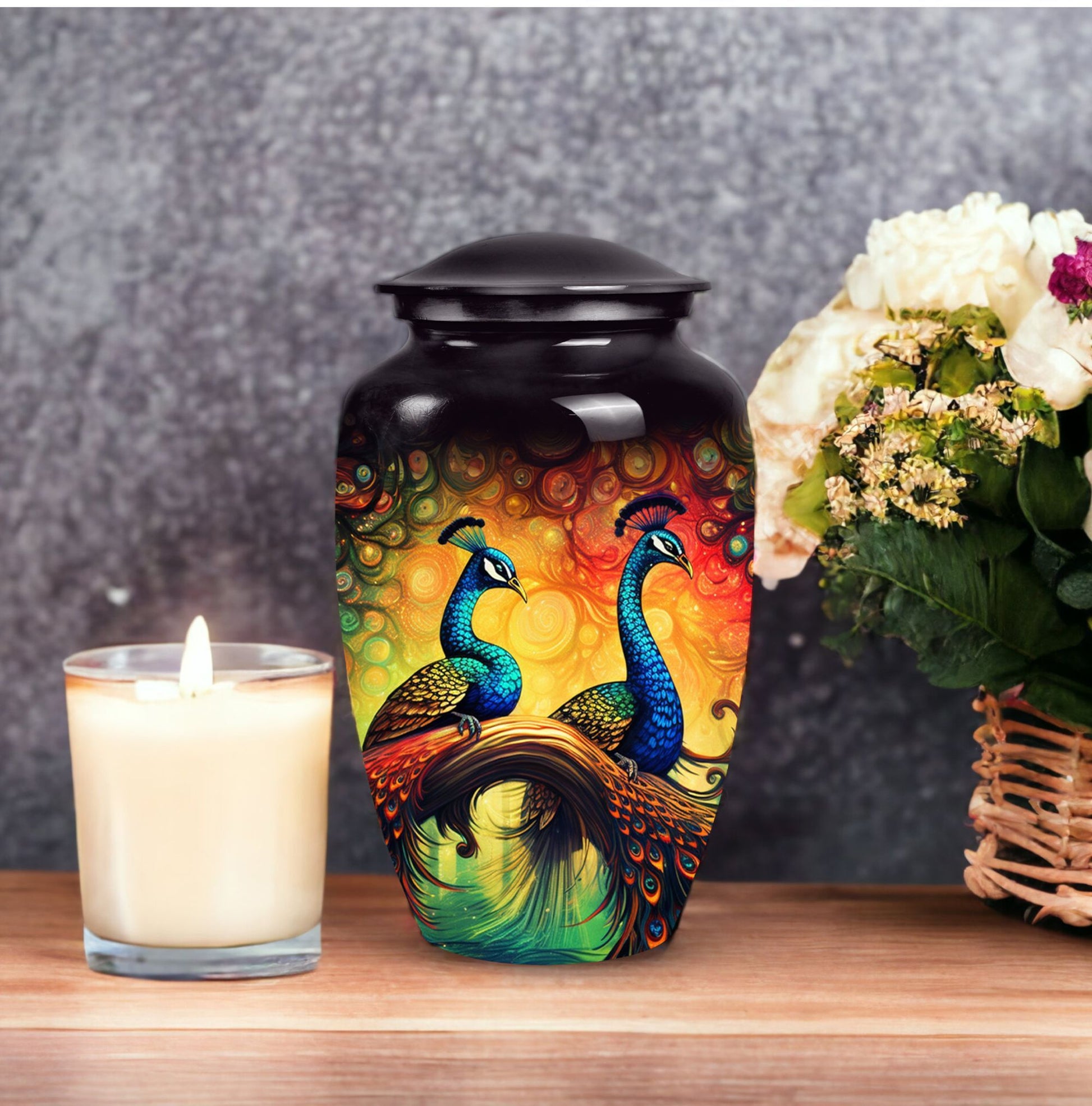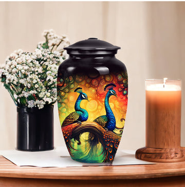 Departed loved ones deserve an honorable resting place and our Classic Cremation Urn is a dignified choice. These large urns are meticulously crafted from robust aluminium, weighing a substantial 3.3 pounds and standing tall at 10 inches in height. For those who appreciate subtlety in measurement, these urns are a perfect 3 inches in size. The unique urn has a generous capacity of 200 cubic inches, sufficient to house the ashes of adults. Personalize your urn with engraved names as a touching tribute to your dear ones. Every purchase of a peacock urn includes a velvet pouch, ensuring the graceful containment of your cherished one's ashes. For those seeking solace in this sorrowful period, our urns deliver compassion cliché: 'Sorry for your loss'. Navigate your grief journey with our classic urn, a standout piece in memorial ceremony supplies. From 'Metal Urns for Ashes' to 'Cremation Containers for Ashes', we offer a variety of items to commemorate.