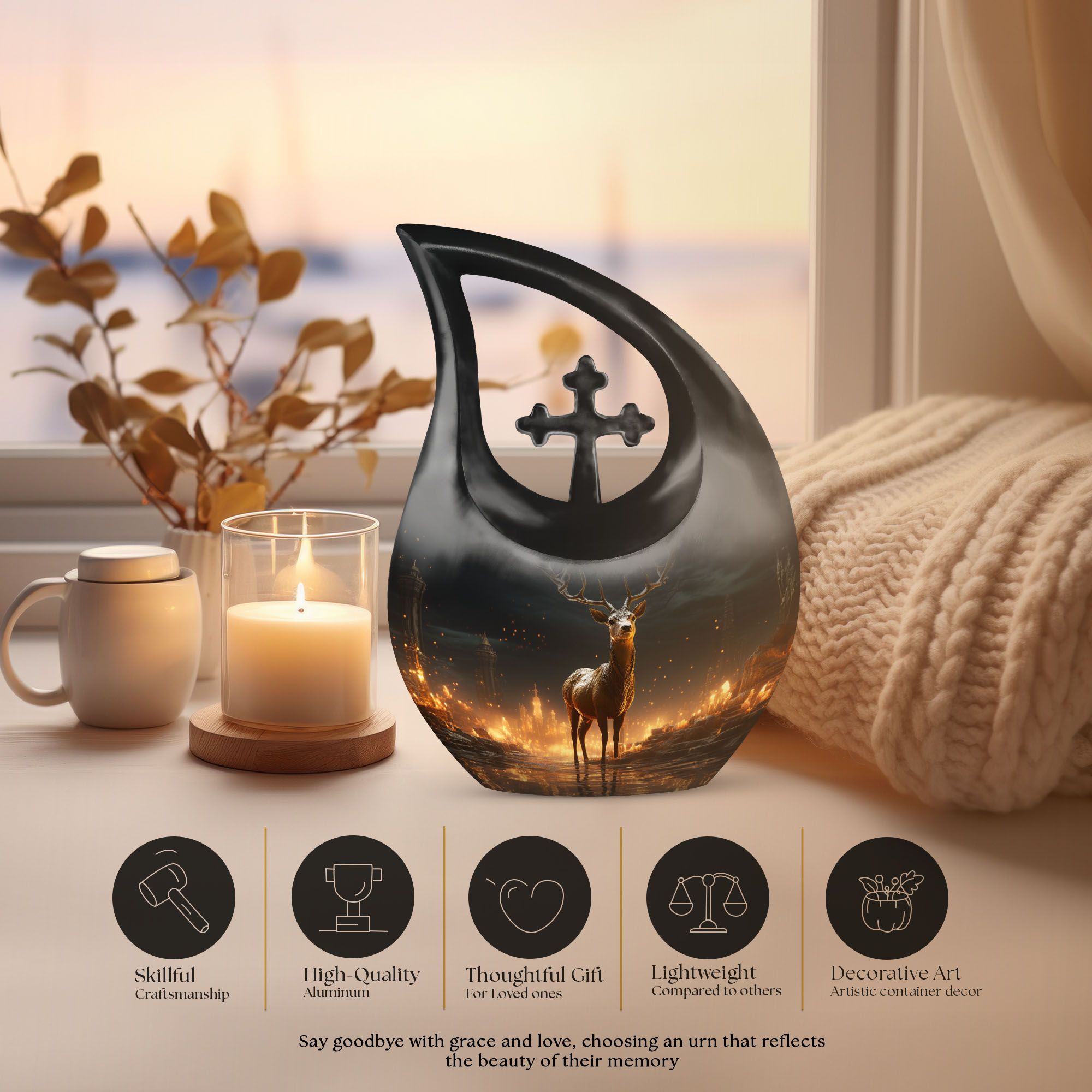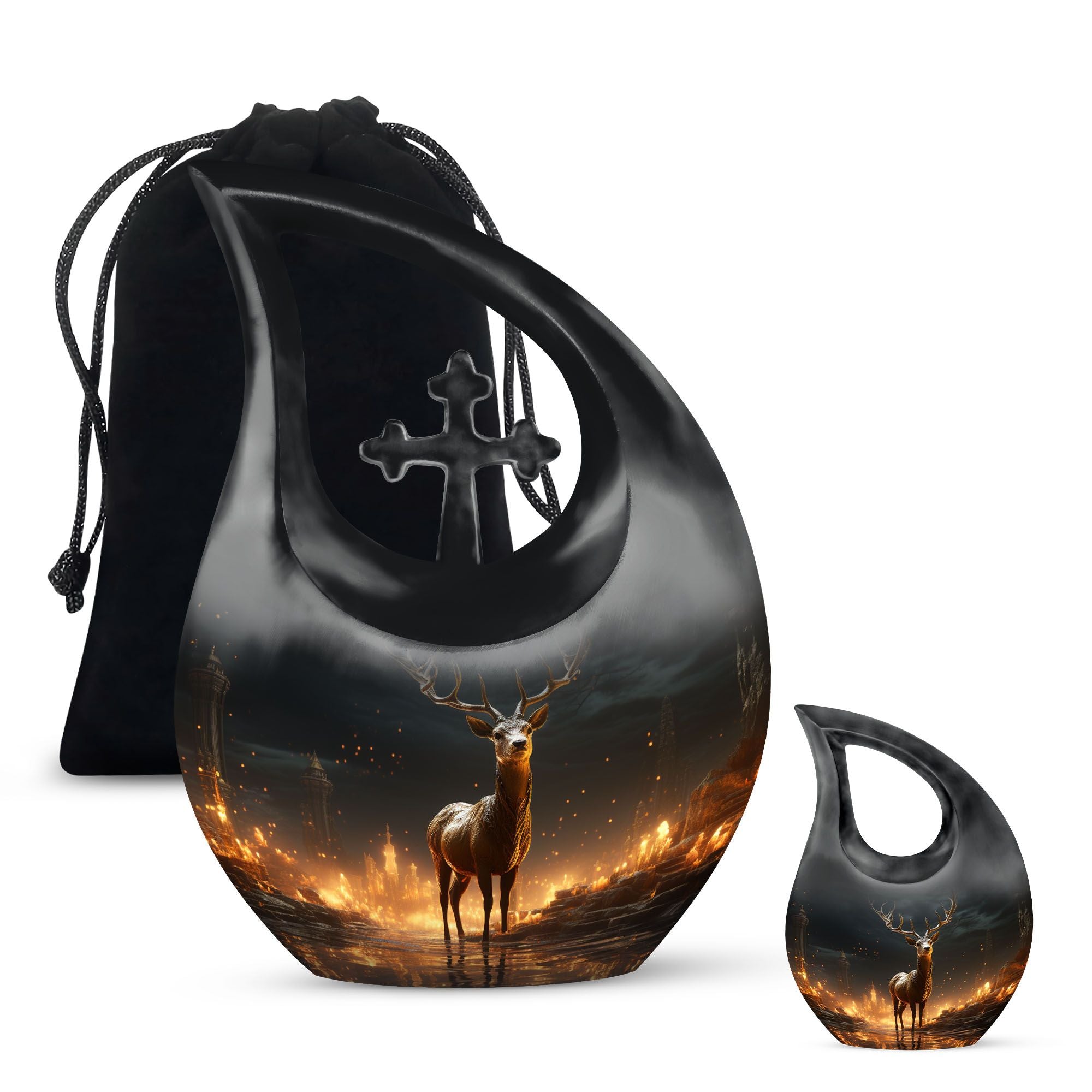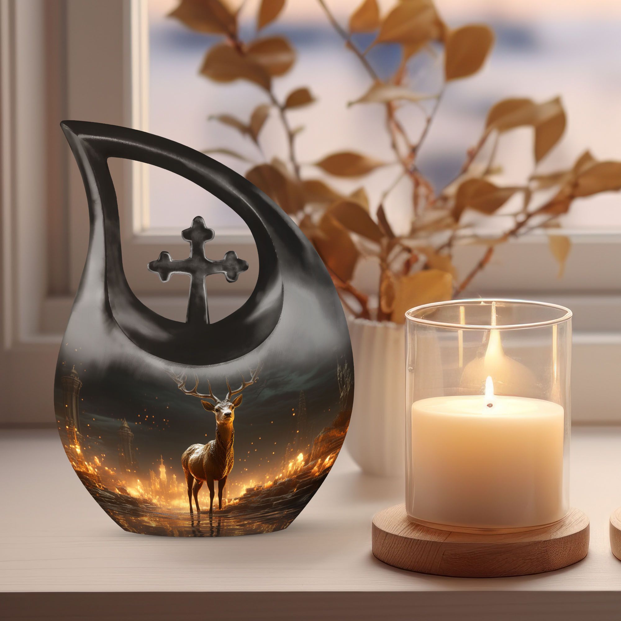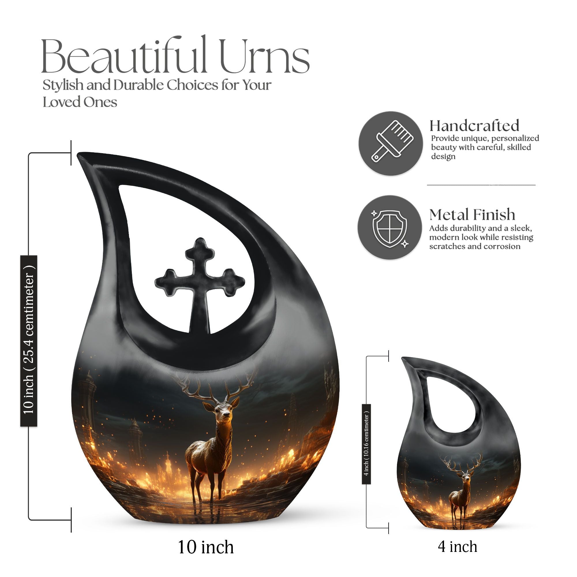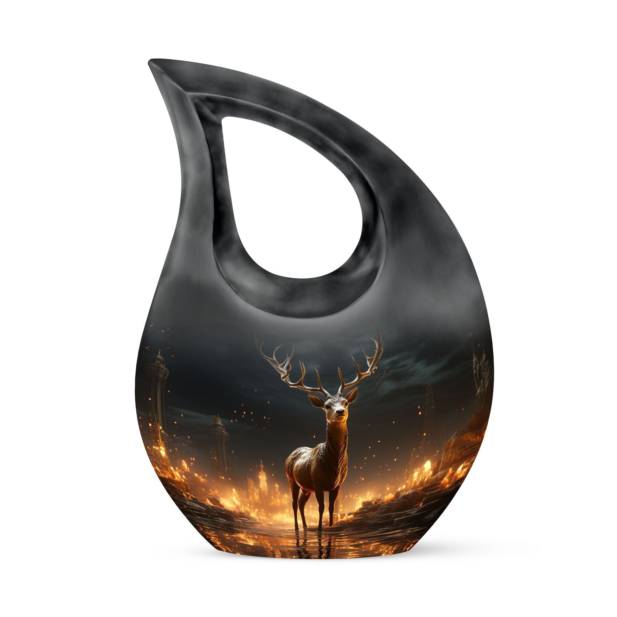 Reverently honor your beloved departed with this uniquely designed Deer Urn, a masterpiece meticulously crafted from high-quality aluminium. Standing at 10 inches high and weighing a comfortable 3.3 pounds, it promises to be a respectful and cherished memorial. Our Urn With Deer design mirrors the tranquillity of nature and is perfect for those forever captivated by the serene forest ambiance. With a capacity of 200 cubic inches, it holds a substantial amount of ashes and comes with a velvet pouch ensuring safekeep. Personalize it featuring the engraved names of your loved one. The Deer Cremation Urn is a distinctive choice in the market of large urns for human ashes, embodying a touch of elegance while serving as a sentimental tribute. Its 'Cross Drop' theme adds to the graceful presence of this Personalized Urn, making it a premium choice amongst decorative urns. Please note, our designs may vary slightly as all our urns are designed uniquely.
