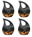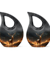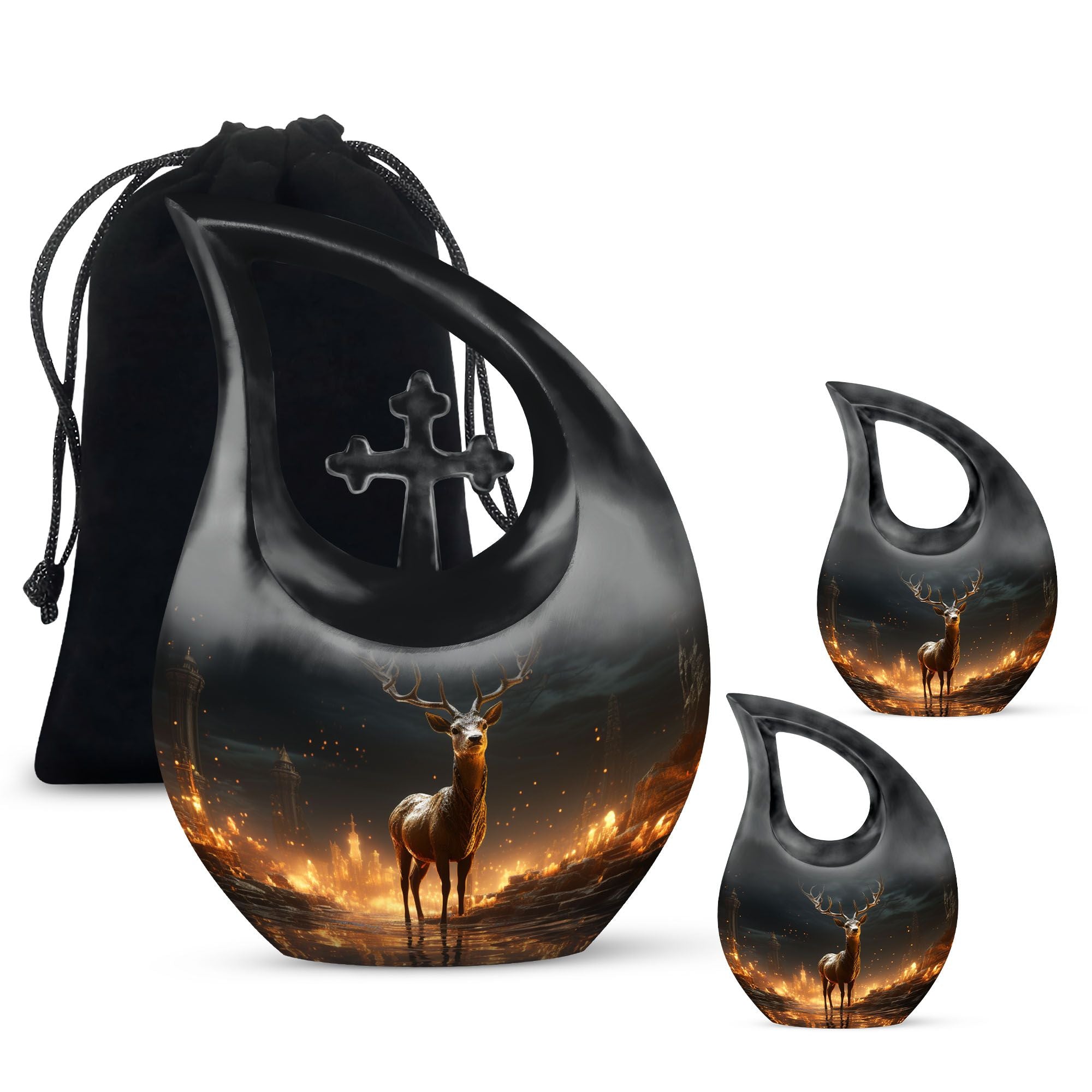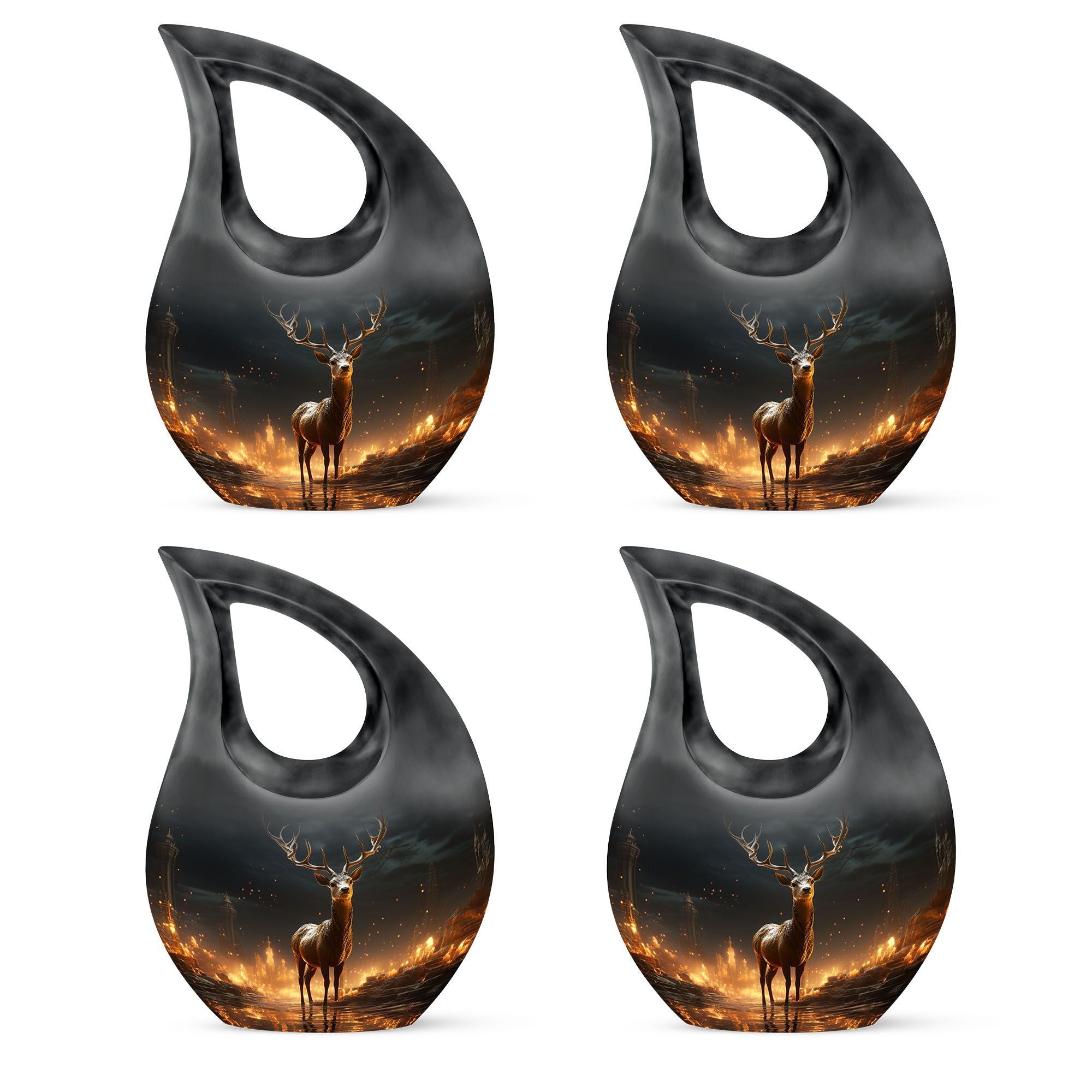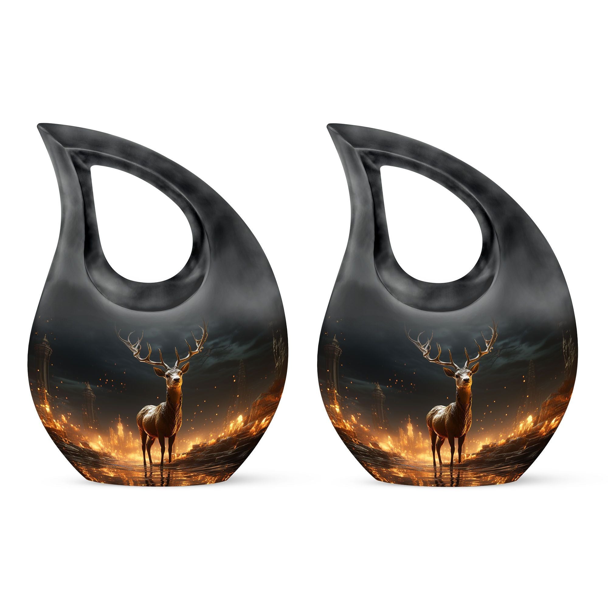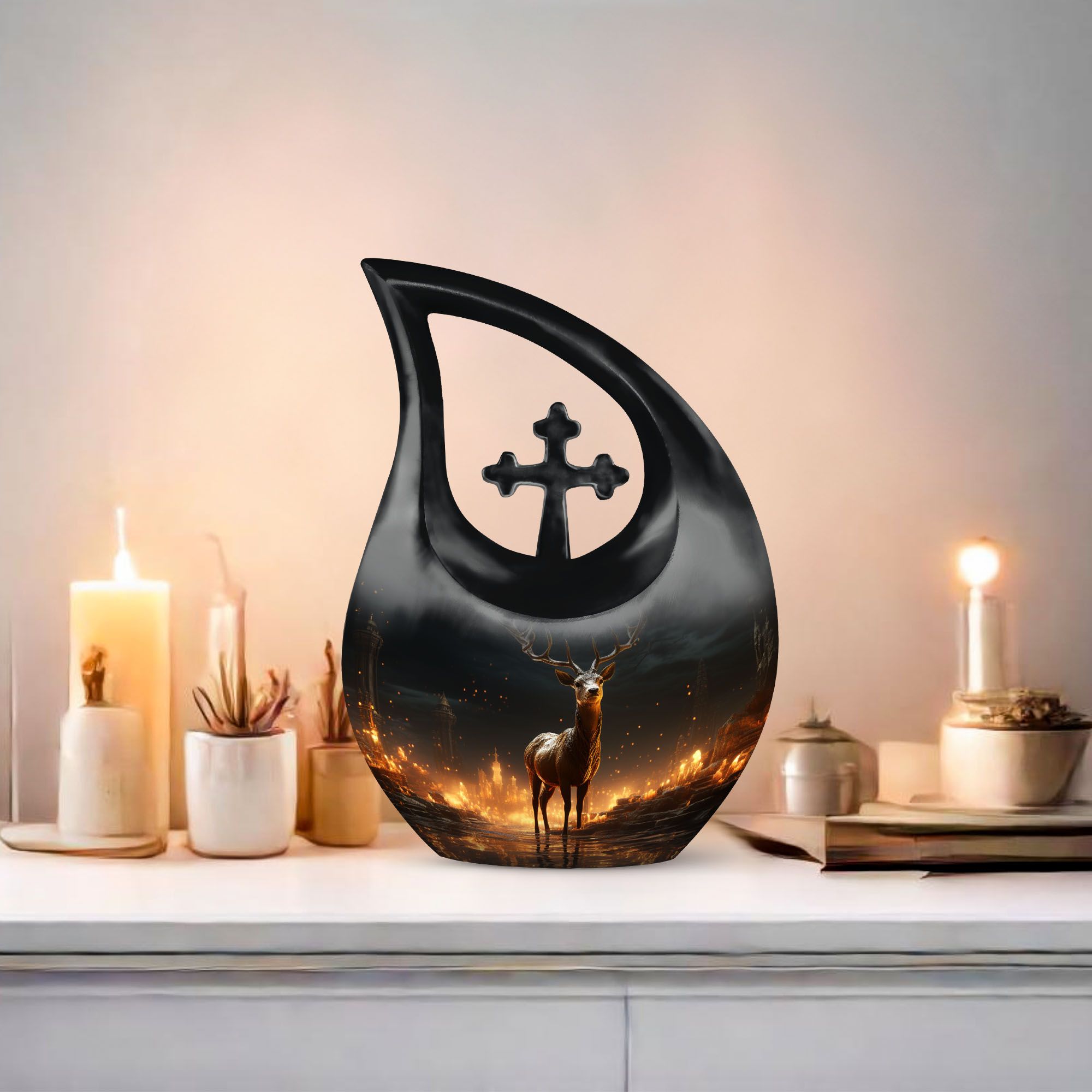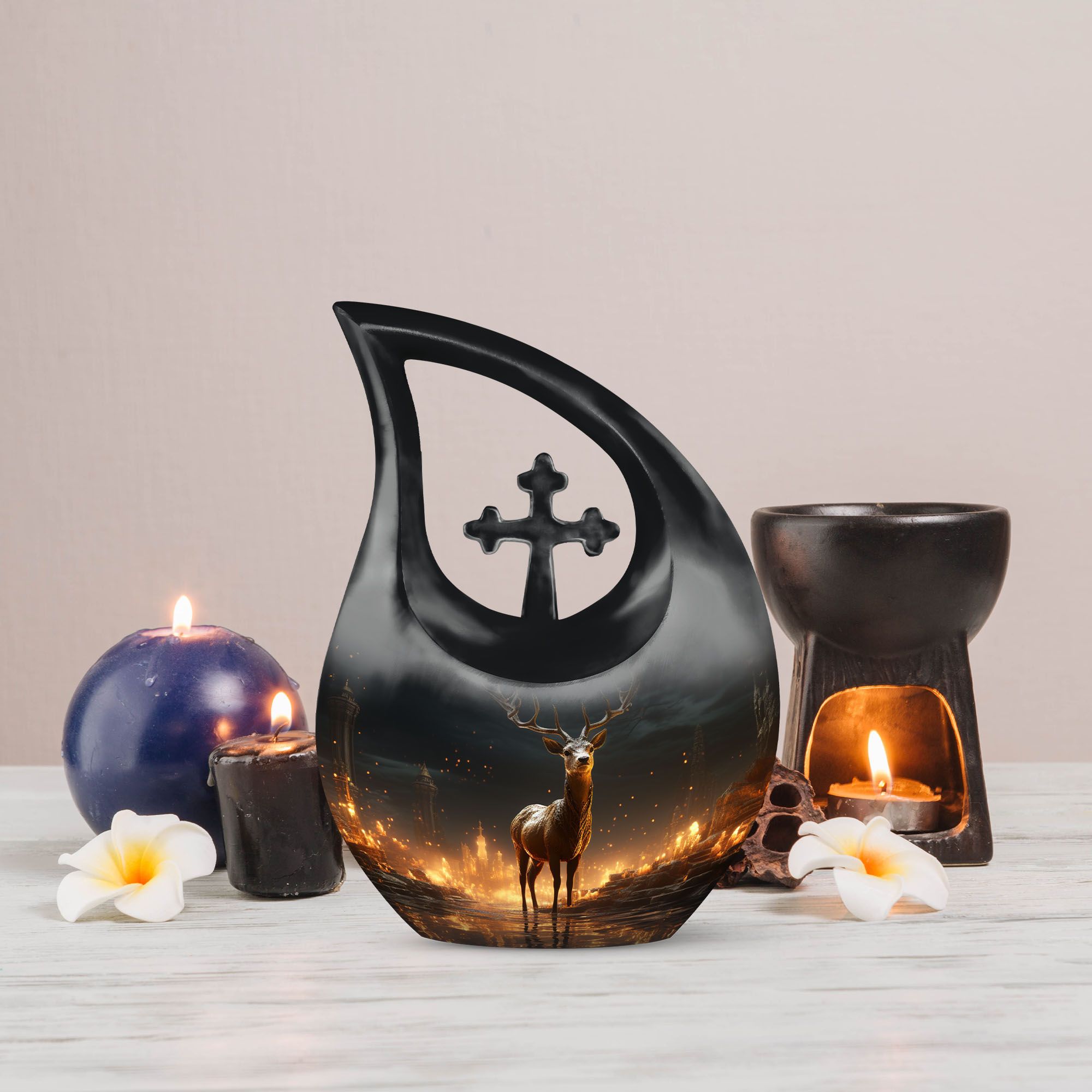 Reverently honor your beloved departed with this uniquely designed Deer Urn, a masterpiece meticulously crafted from high-quality aluminium. Standing at 10 inches high and weighing a comfortable 3.3 pounds, it promises to be a respectful and cherished memorial. Our Urn With Deer design mirrors the tranquillity of nature and is perfect for those forever captivated by the serene forest ambiance. With a capacity of 200 cubic inches, it holds a substantial amount of ashes and comes with a velvet pouch ensuring safekeep. Personalize it featuring the engraved names of your loved one. The Deer Cremation Urn is a distinctive choice in the market of large urns for human ashes, embodying a touch of elegance while serving as a sentimental tribute. Its 'Cross Drop' theme adds to the graceful presence of this Personalized Urn, making it a premium choice amongst decorative urns. Please note, our designs may vary slightly as all our urns are designed uniquely.
