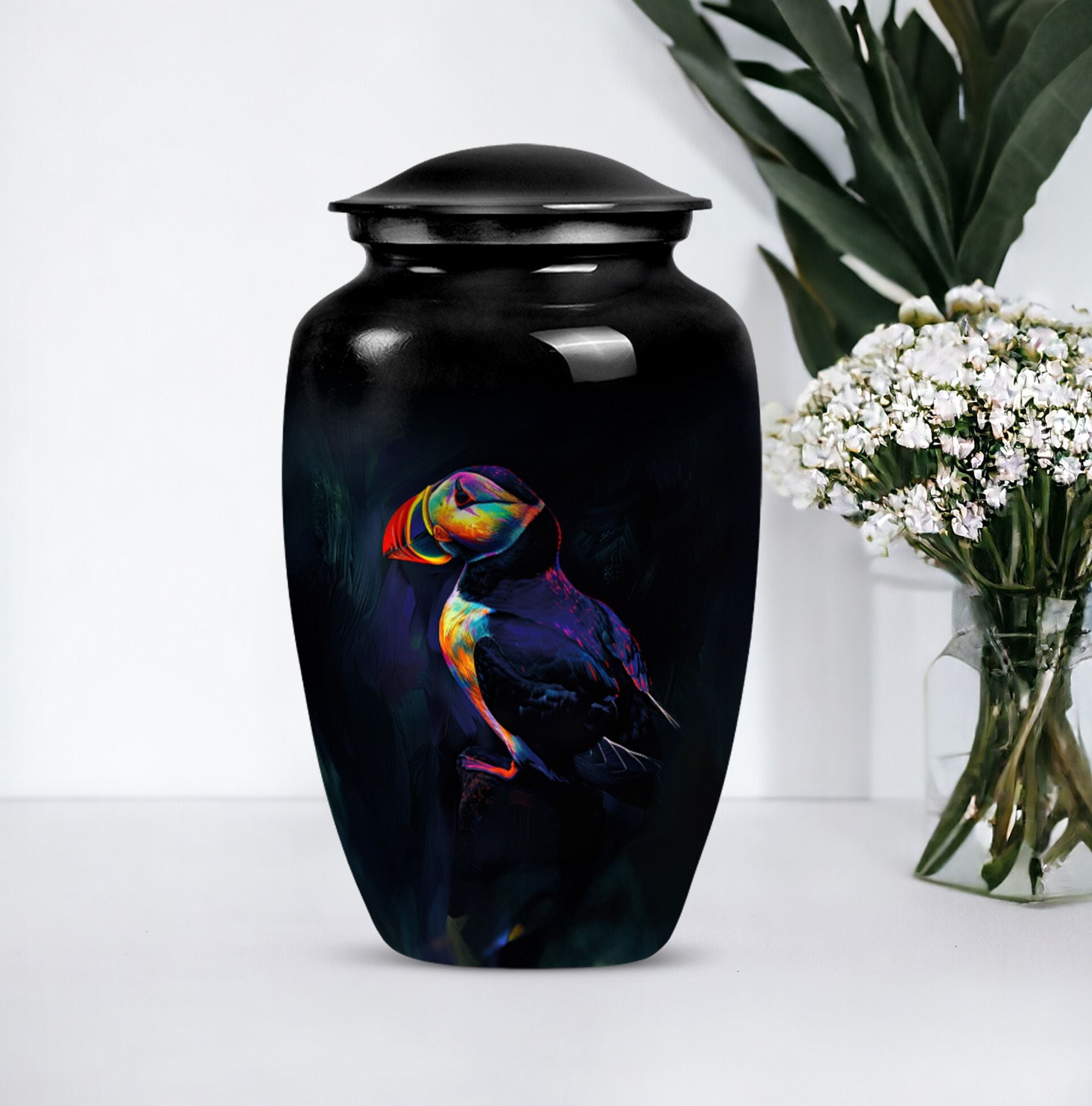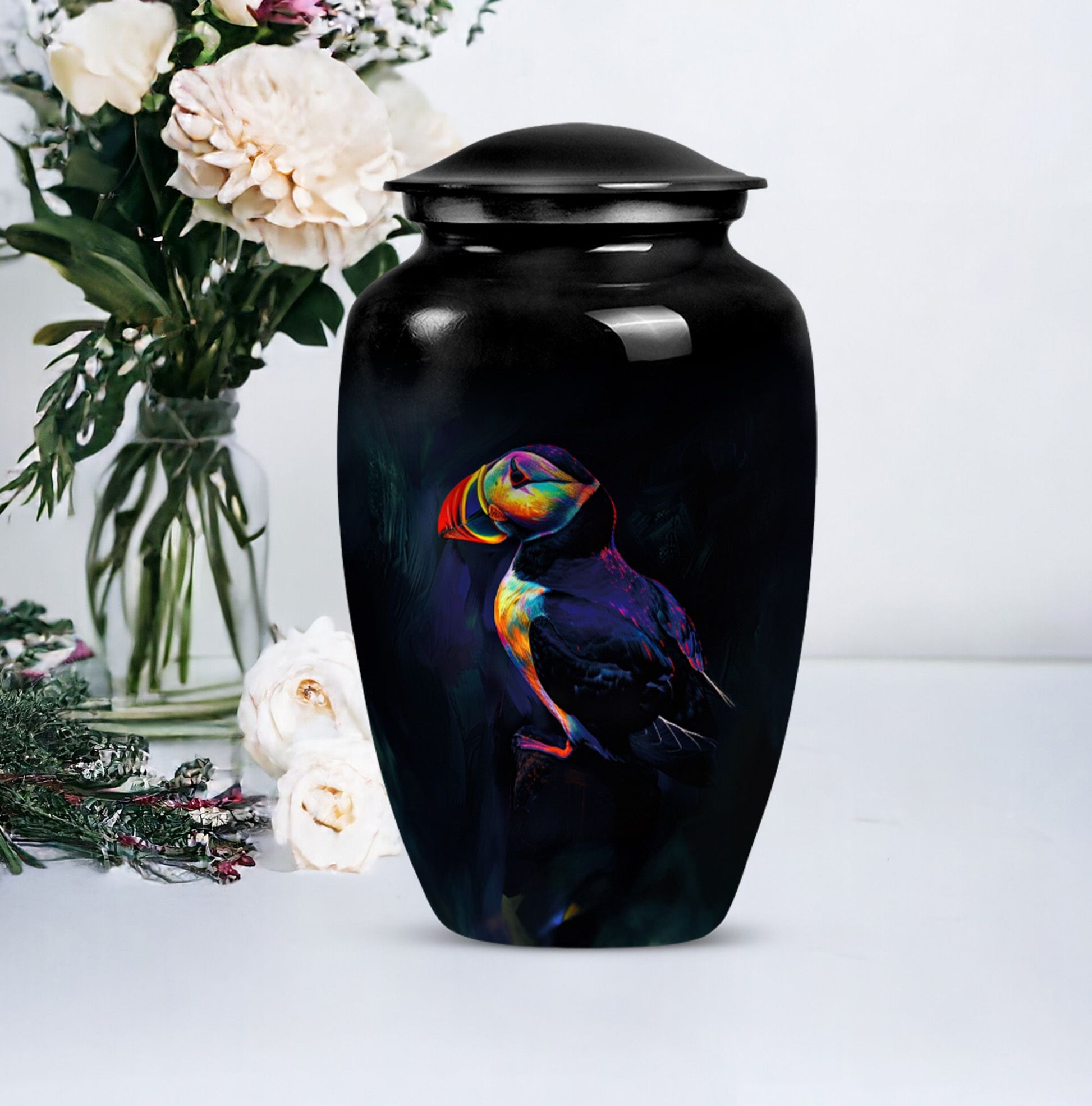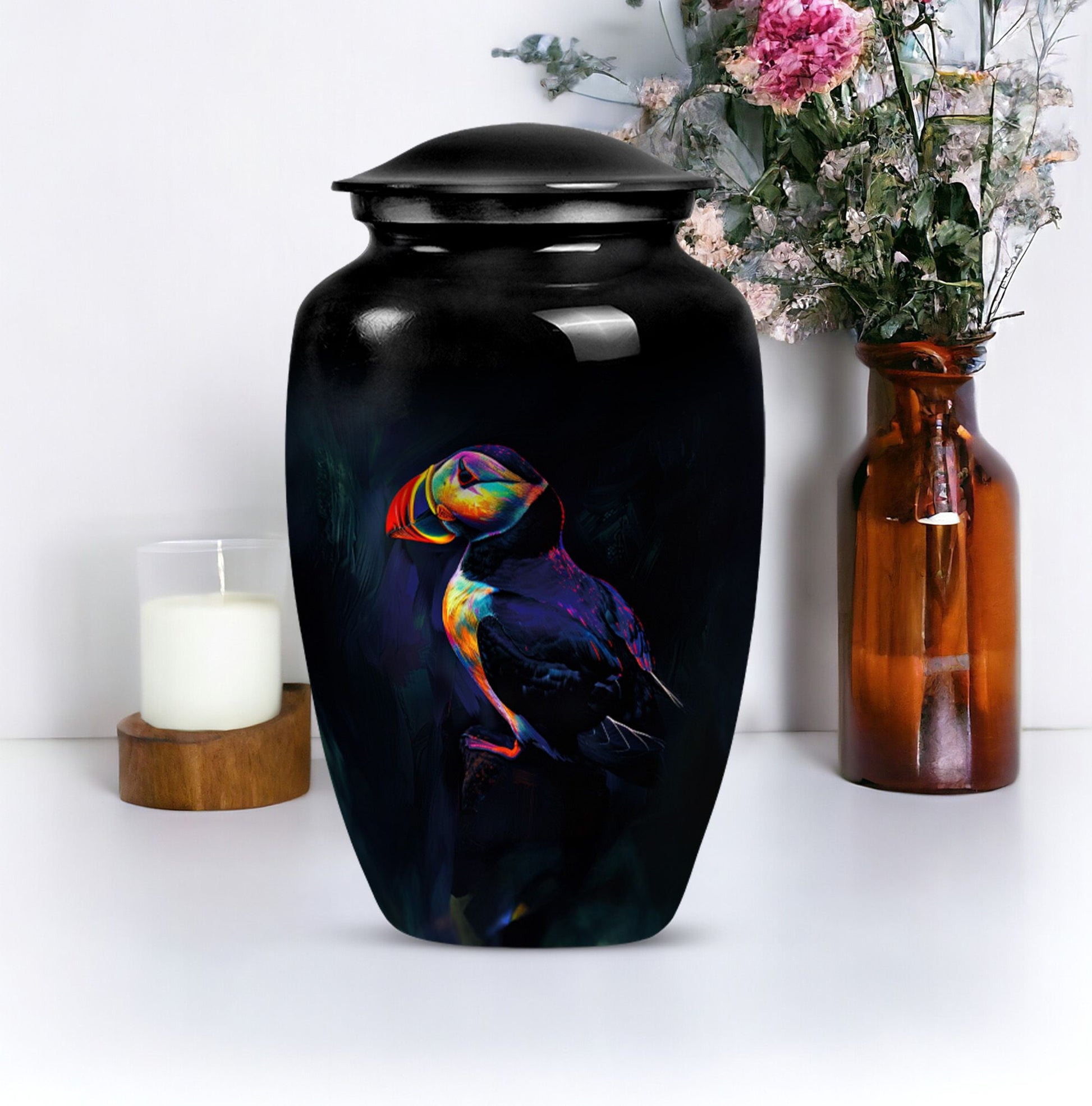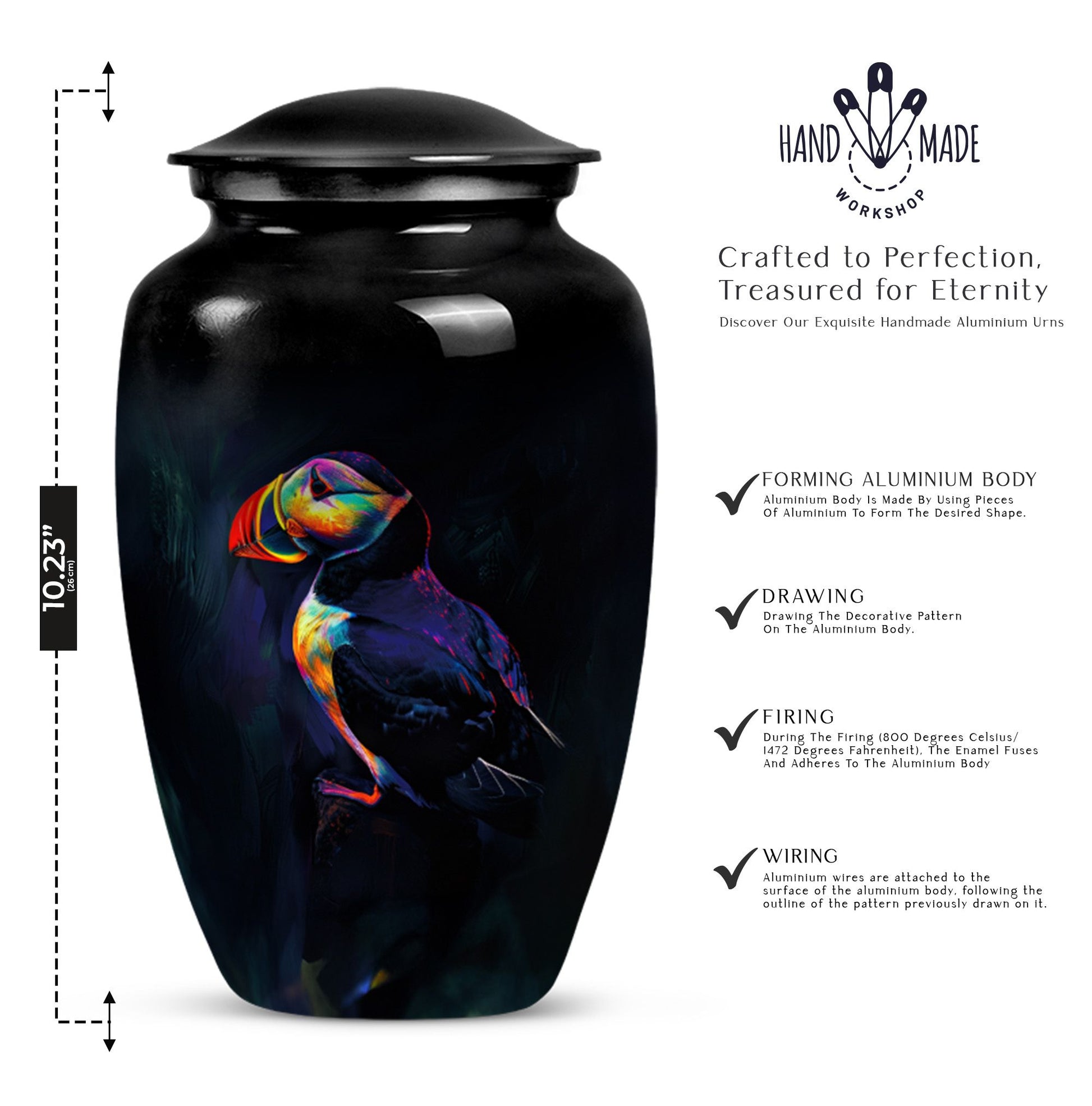 Masterfully designed and exquisitely handcrafted, this Puffin bird Urn pays tribute to the indomitable spirit of your loved ones and enables you to keep their treasured ashes close. Crafted from robust aluminum, this 10-inch, weighing 3.3 pounds, cremation urn is not your ordinary memorial large urn; it brings a unique abstract appeal that artful souls will appreciate. With a capacity of 200 cubic inches, it's a fitting memorial urn for the women who've shaped your life. Make it personal by adding engraved names, a tribute that stands the test of time. Our package comes complete with a velvet pouch for the containment of ashes - because we understand the immense value of gentle care in this time of remembrance. From Puffin bird Urn to Handcrafted Urns for Artistic Souls, make this an exemplary piece of your memorial ceremony supplies. Please note, ashes urn for adults may vary in appearance due to its handcrafted nature.