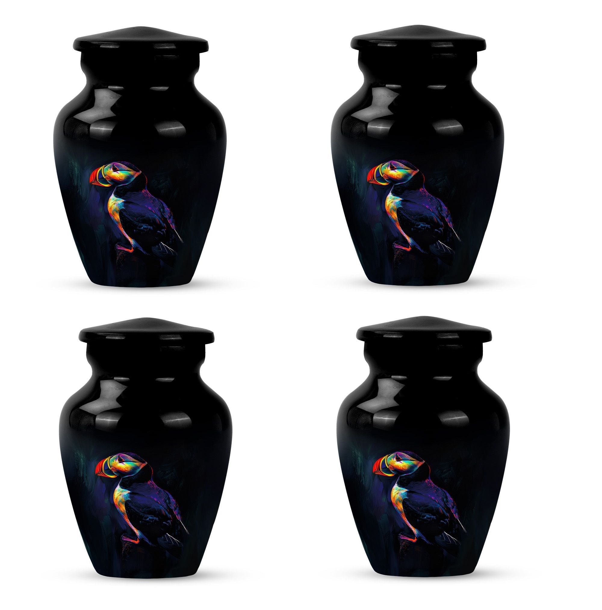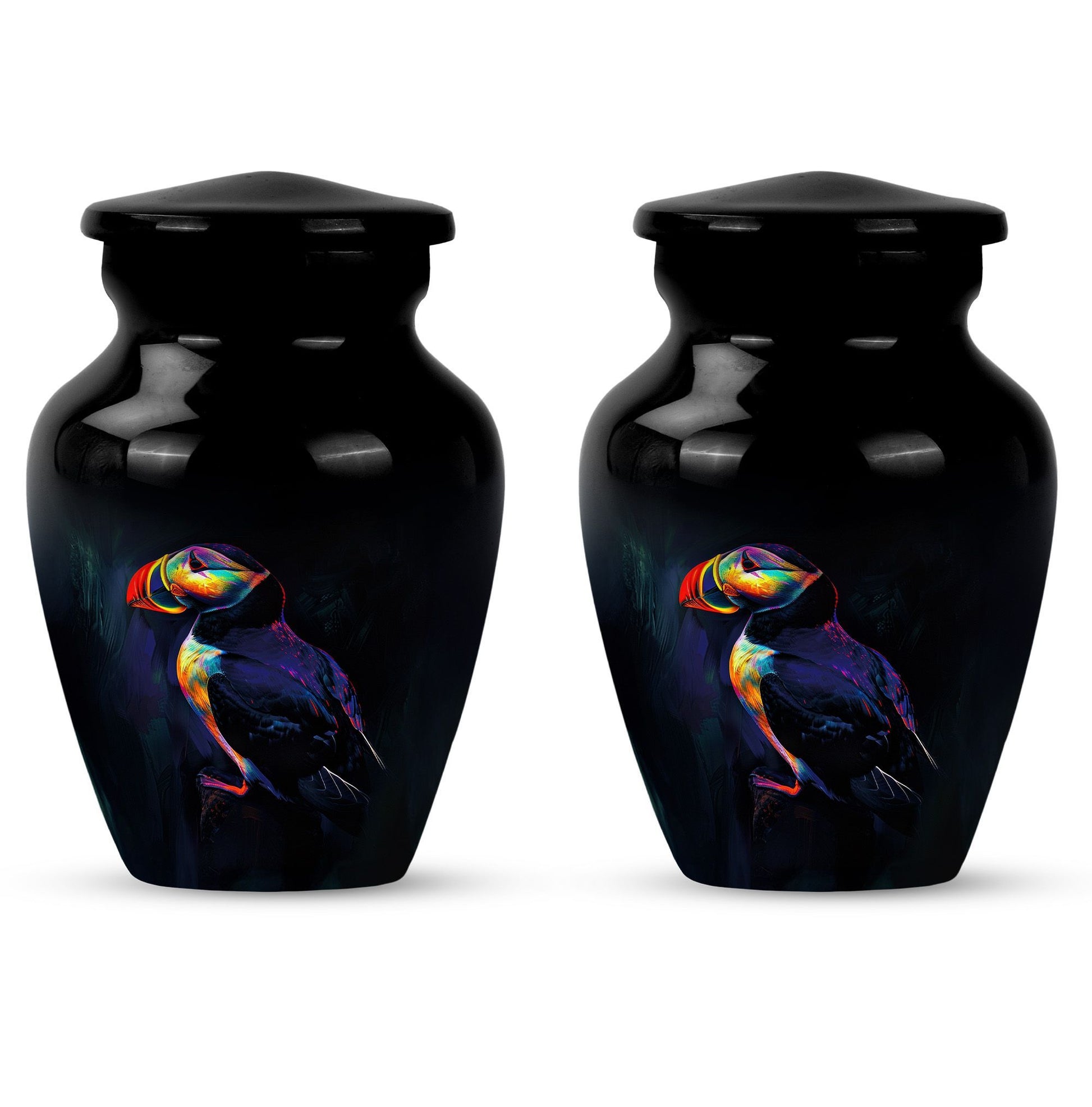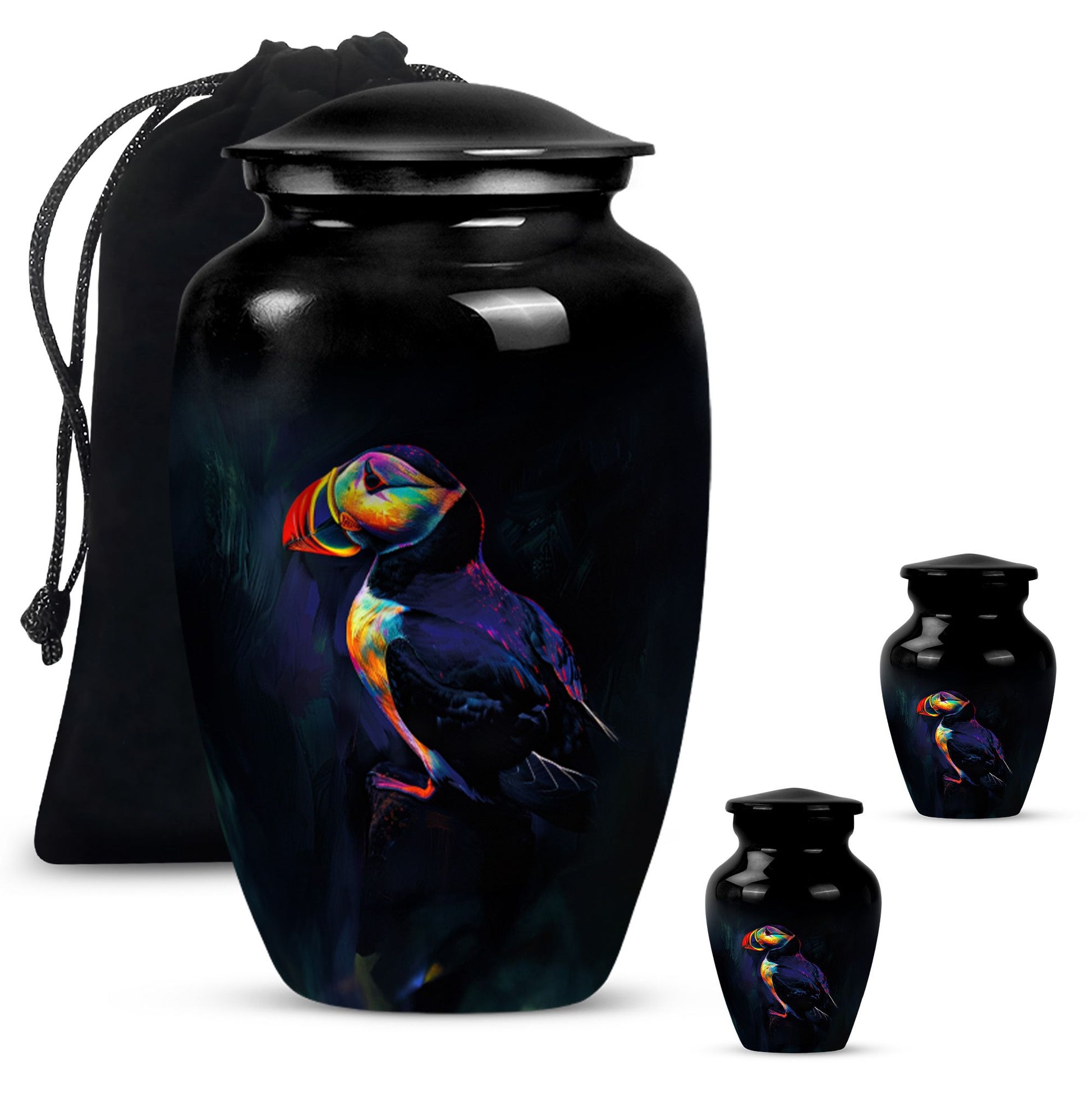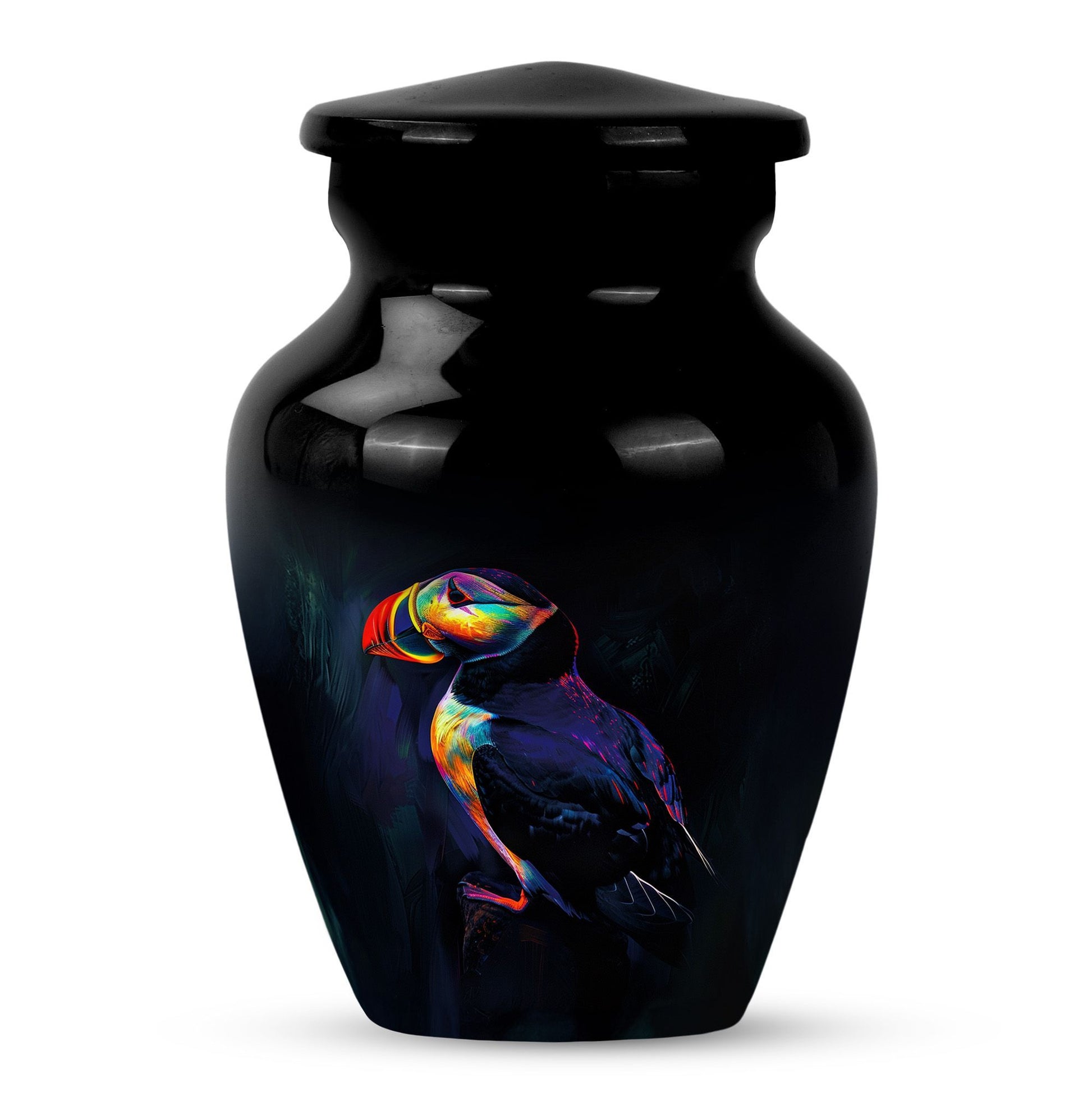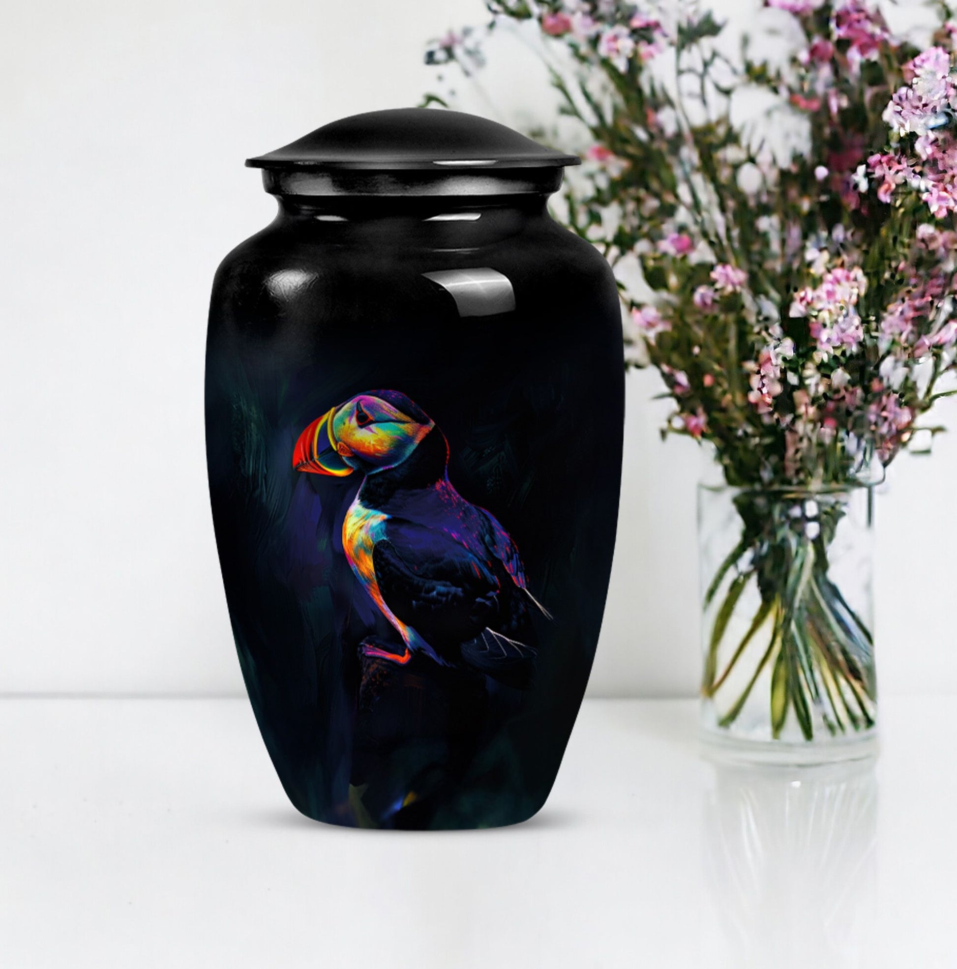 Masterfully designed and exquisitely handcrafted, this Puffin bird Urn pays tribute to the indomitable spirit of your loved ones and enables you to keep their treasured ashes close. Crafted from robust aluminum, this 10-inch, weighing 3.3 pounds, cremation urn is not your ordinary memorial large urn; it brings a unique abstract appeal that artful souls will appreciate. With a capacity of 200 cubic inches, it's a fitting memorial urn for the women who've shaped your life. Make it personal by adding engraved names, a tribute that stands the test of time. Our package comes complete with a velvet pouch for the containment of ashes - because we understand the immense value of gentle care in this time of remembrance. From Puffin bird Urn to Handcrafted Urns for Artistic Souls, make this an exemplary piece of your memorial ceremony supplies. Please note, ashes urn for adults may vary in appearance due to its handcrafted nature.