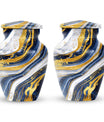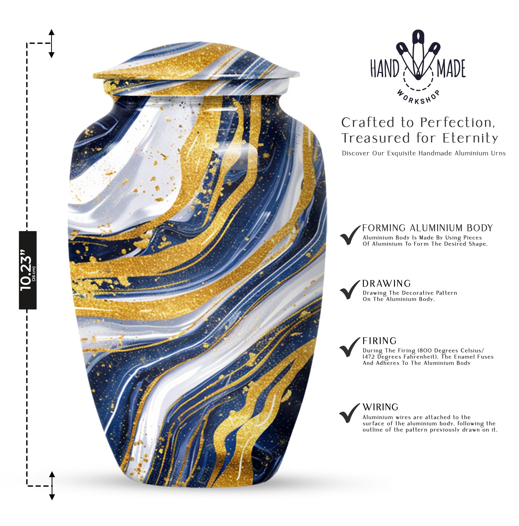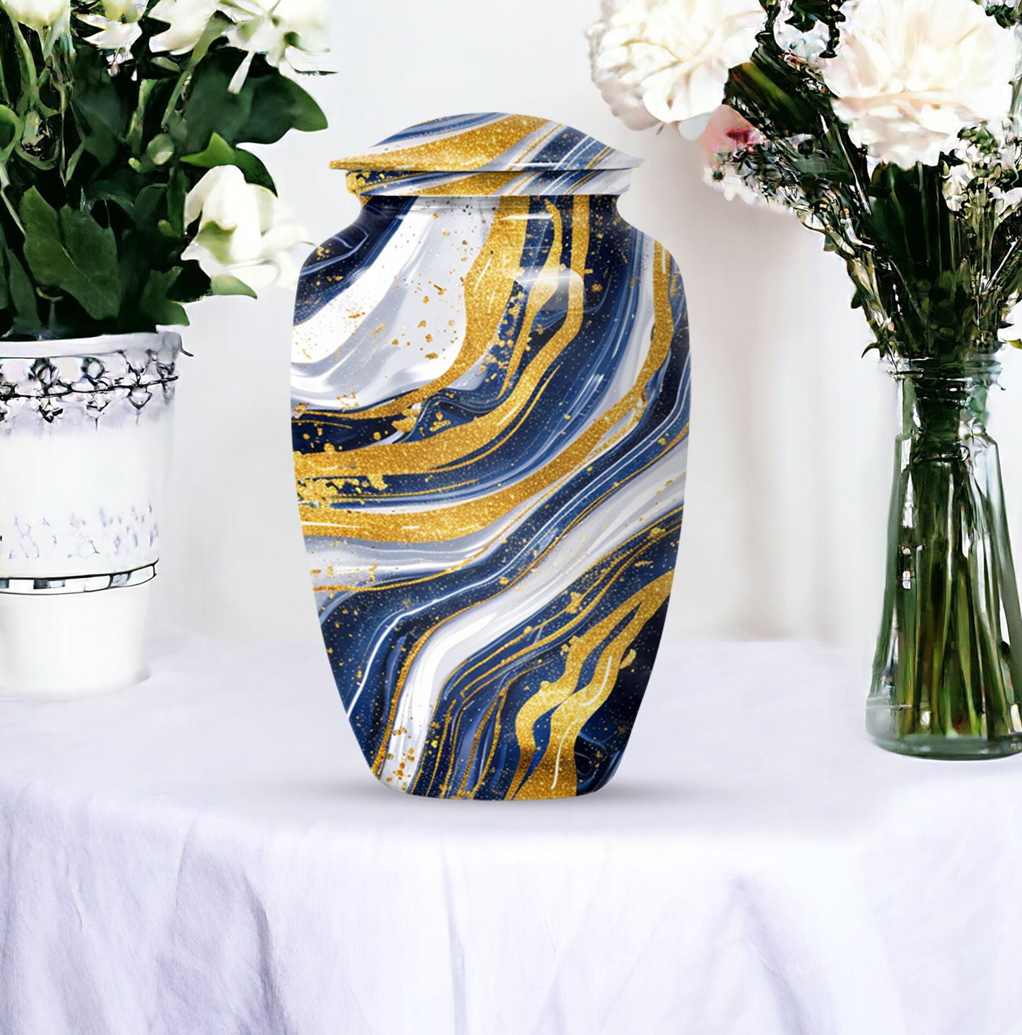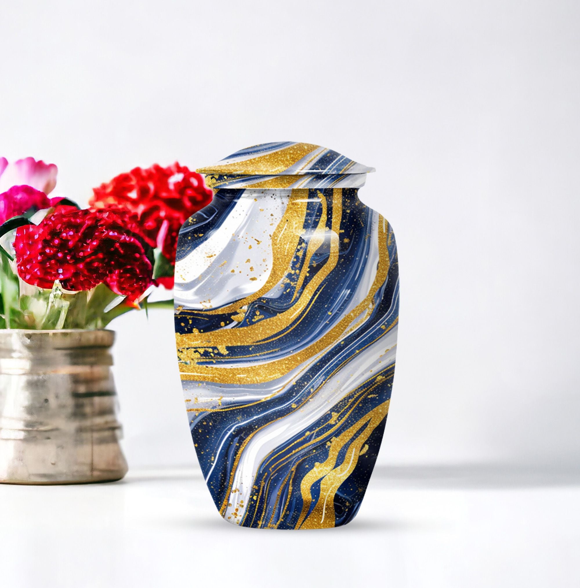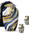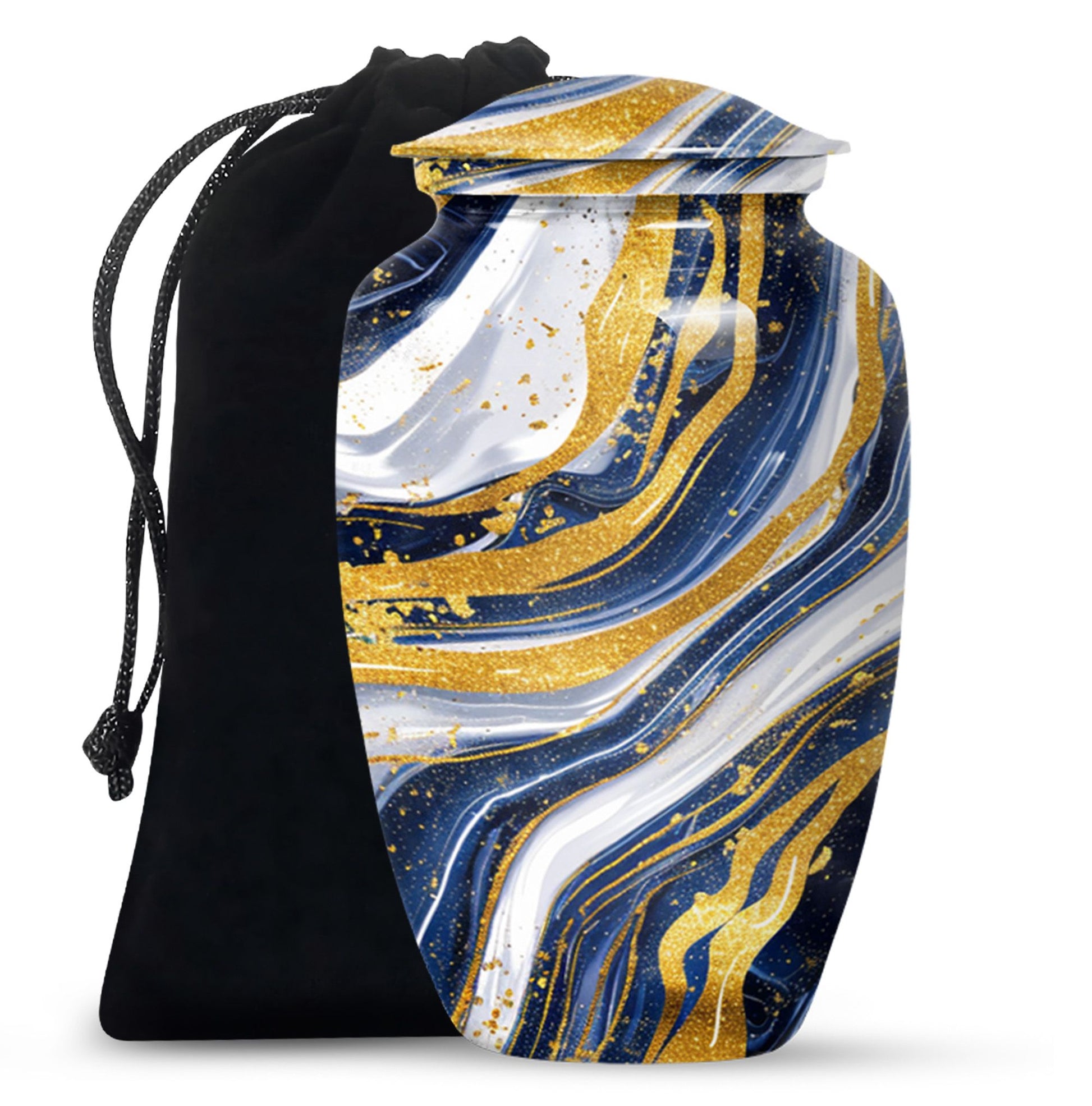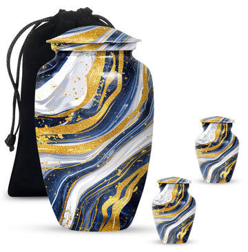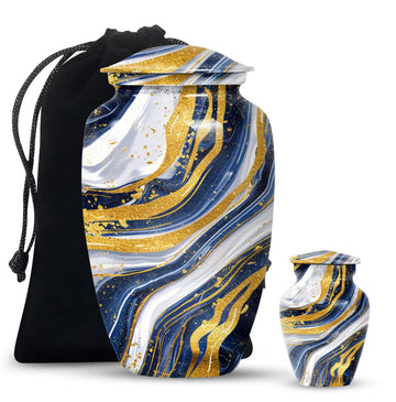 Step into the realm of peace, respect, and remembrance with our Artistic Design Urn. Expertly crafted to serve as a memorial forever urn, it is more than just a resting place for beloved human ashes. This large urn, embodying an abstract theme, exemplifies the epitome of reverence and love. It's made of durable aluminium, ensuring the longevity of this timeless tribute. Measuring 10 inches in height and weighing 3.3 pounds, its size is a perfect fit for any dedicated space. The urn has a substantial capacity of 200 cubic inches, promising enough room to hold adult human ashes. The package includes a thoughtful velvet pouch for containment of ashes, adding an extra layer of dignity and respect. Personalize your tribute with engraved names, tailoring the memorial to truly reflect the life it honors. This beautiful urn pulls away from the ordinary with its classic design. Make your peace with this artistic, sturdy memorial urn, and remember your loved ones in a way they deserve.