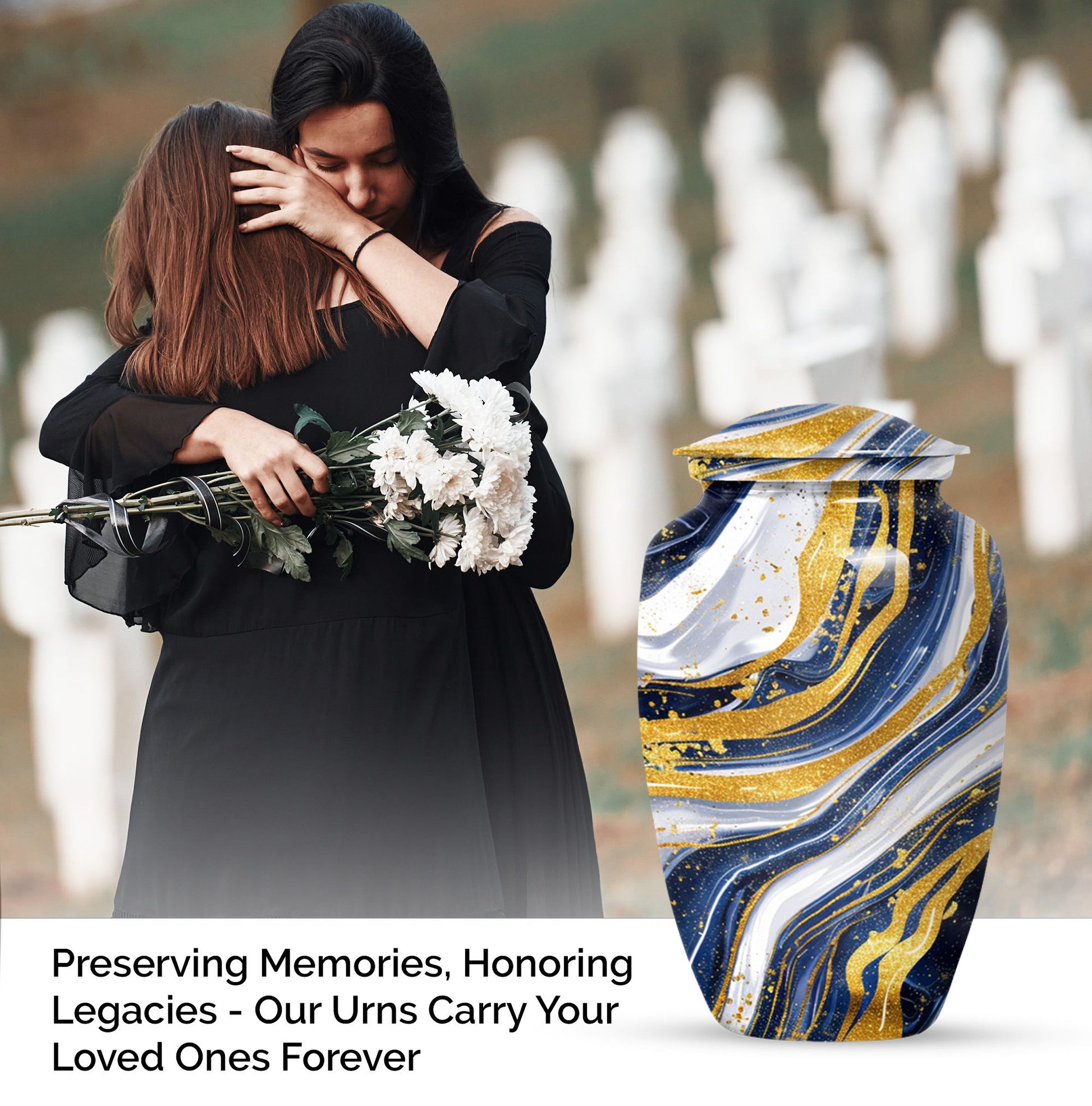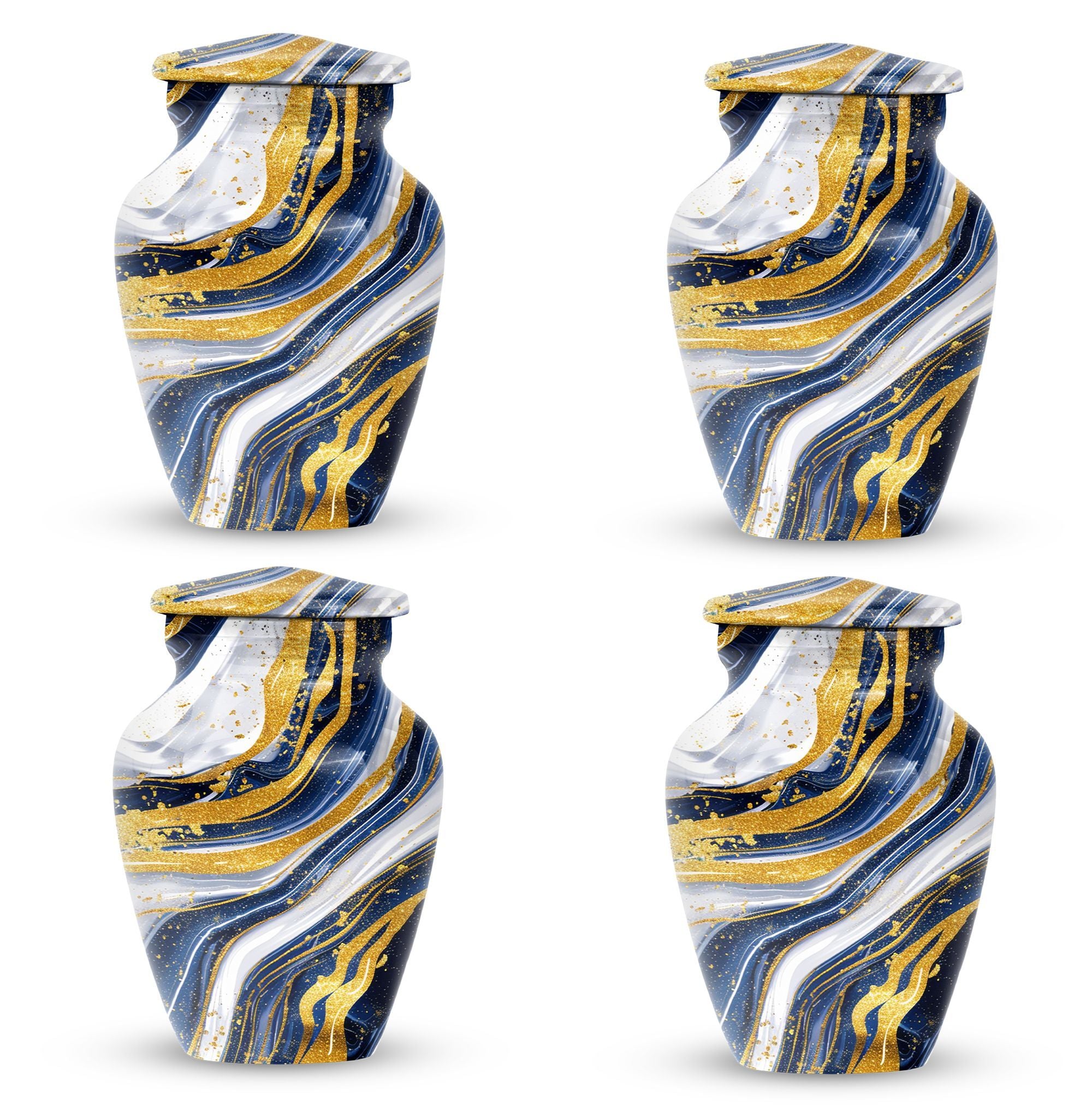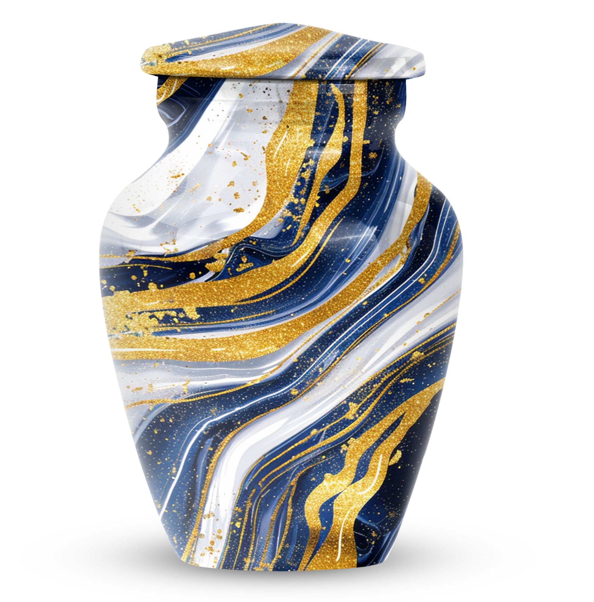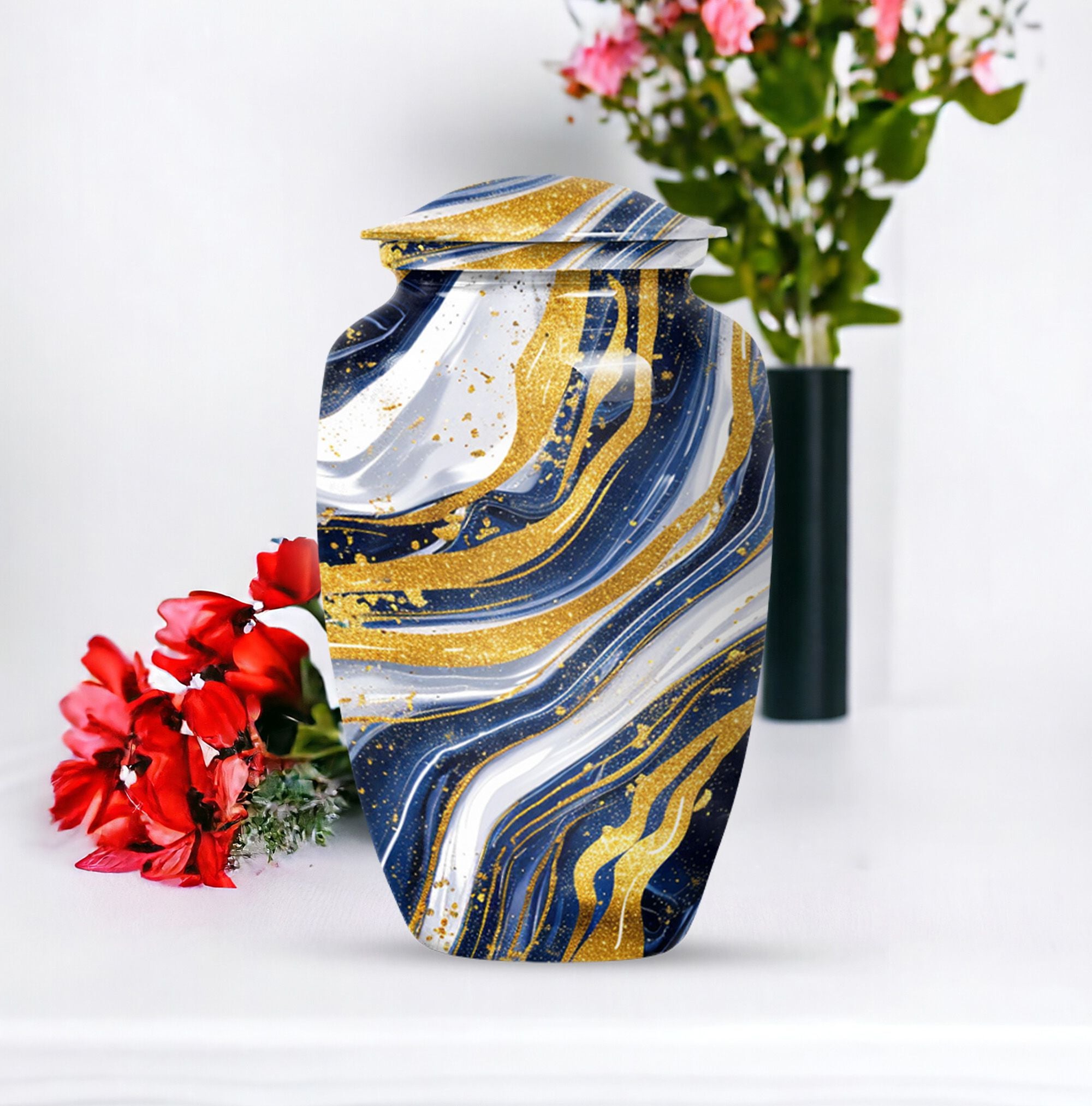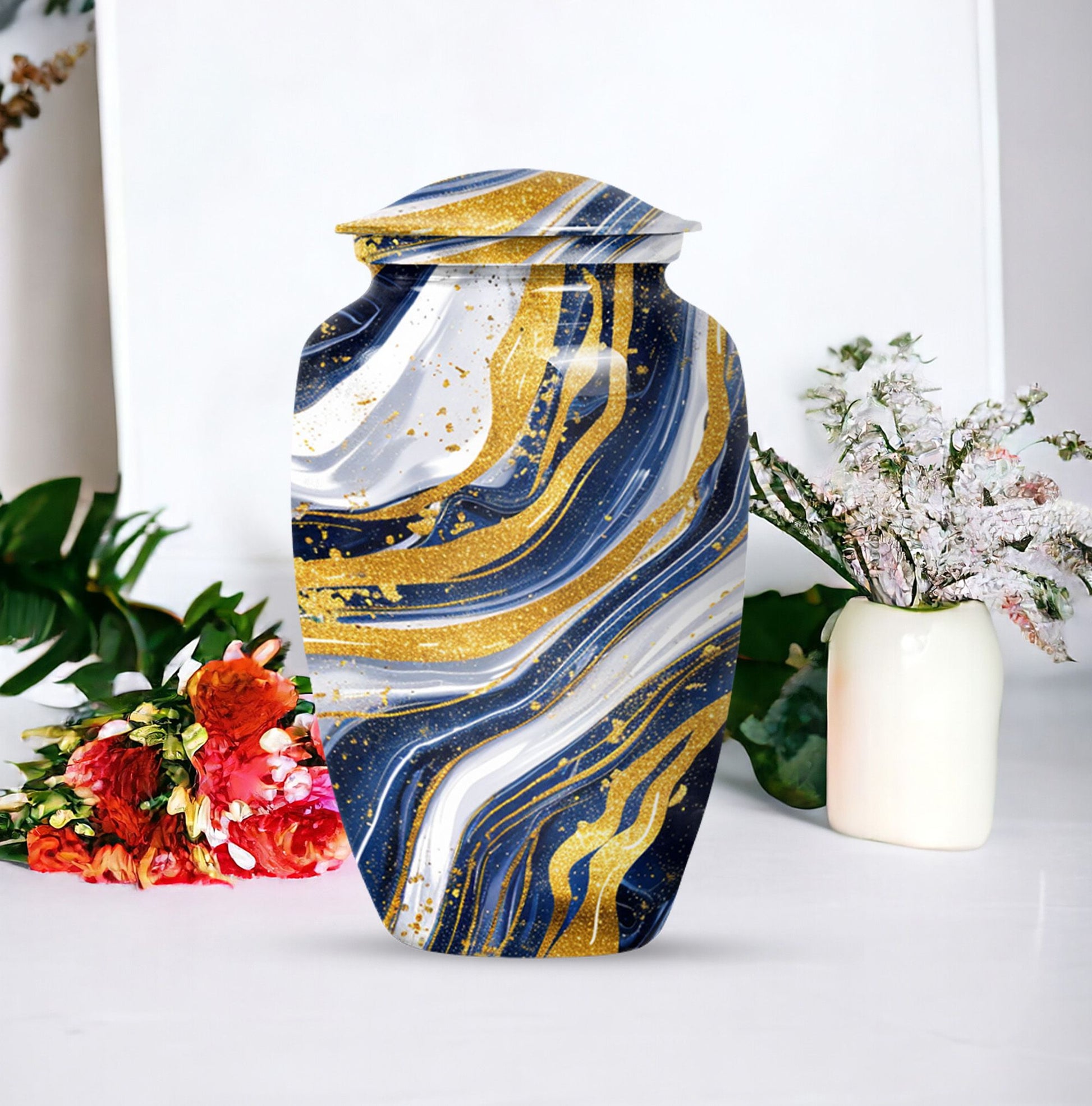 Step into the realm of peace, respect, and remembrance with our Artistic Design Urn. Expertly crafted to serve as a memorial forever urn, it is more than just a resting place for beloved human ashes. This large urn, embodying an abstract theme, exemplifies the epitome of reverence and love. It's made of durable aluminium, ensuring the longevity of this timeless tribute. Measuring 10 inches in height and weighing 3.3 pounds, its size is a perfect fit for any dedicated space. The urn has a substantial capacity of 200 cubic inches, promising enough room to hold adult human ashes. The package includes a thoughtful velvet pouch for containment of ashes, adding an extra layer of dignity and respect. Personalize your tribute with engraved names, tailoring the memorial to truly reflect the life it honors. This beautiful urn pulls away from the ordinary with its classic design. Make your peace with this artistic, sturdy memorial urn, and remember your loved ones in a way they deserve.