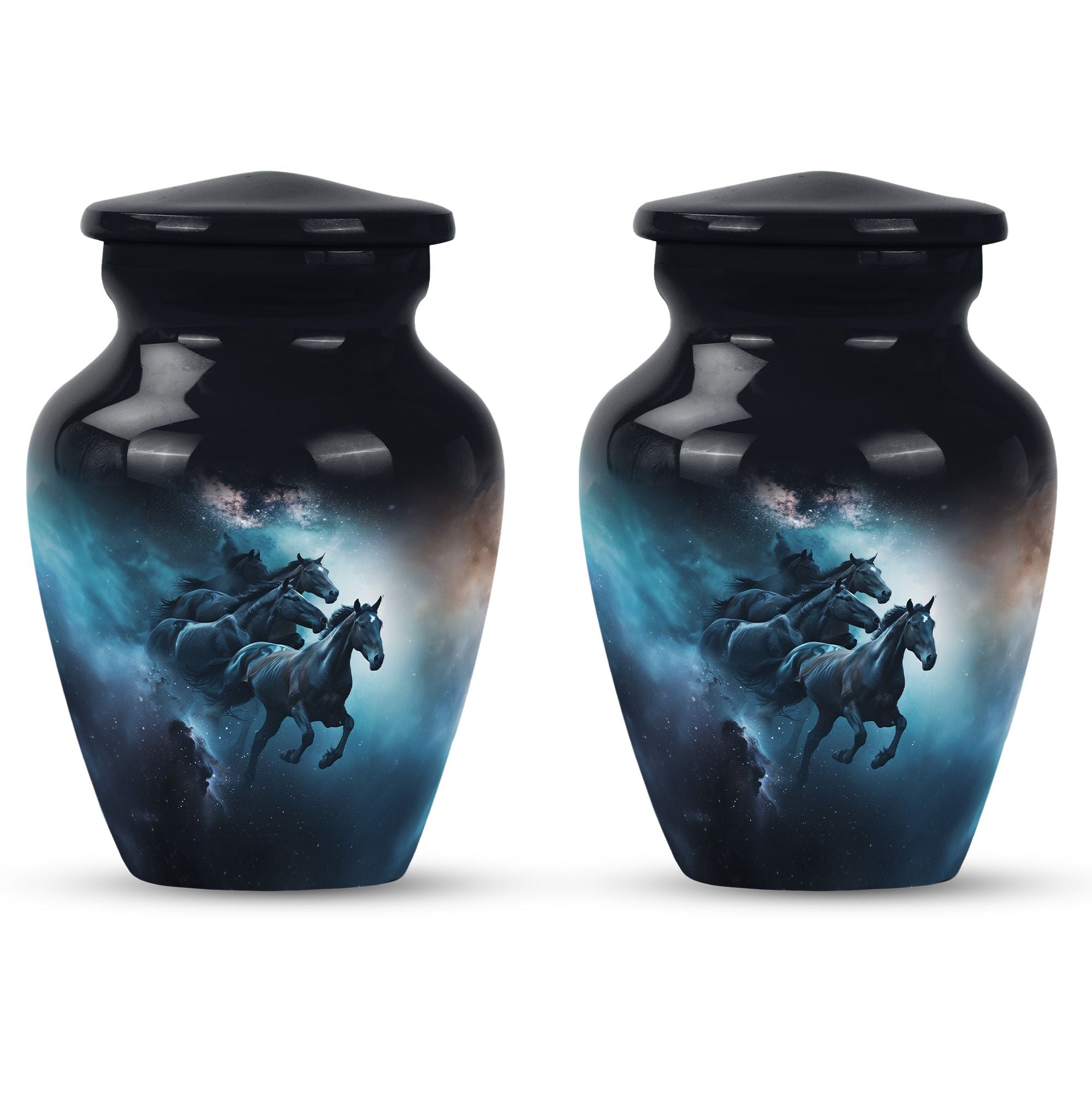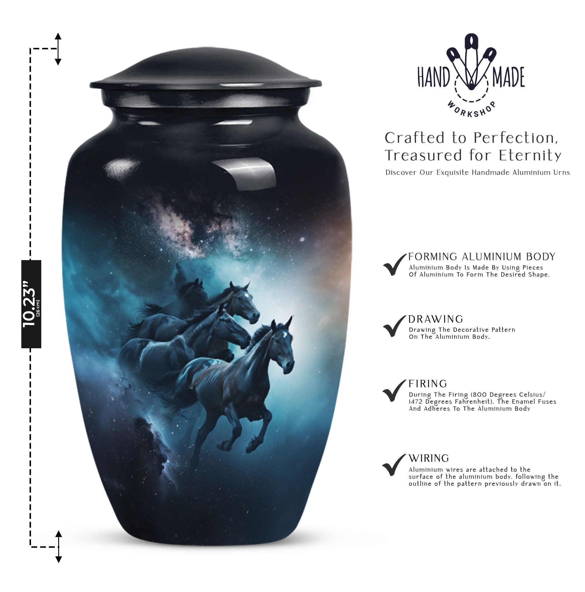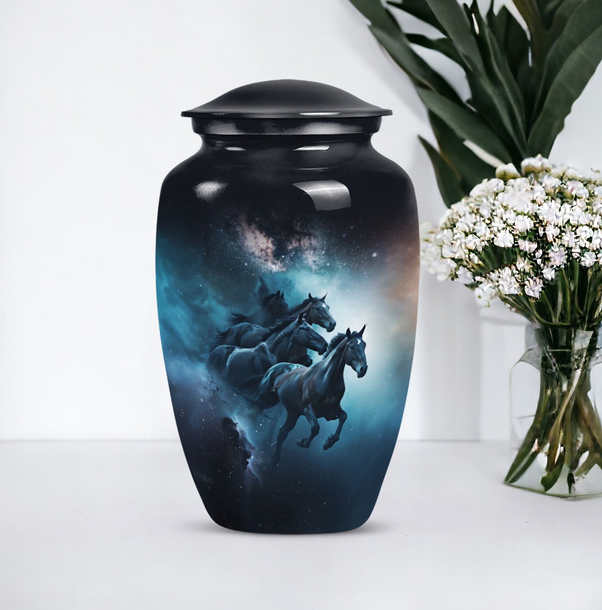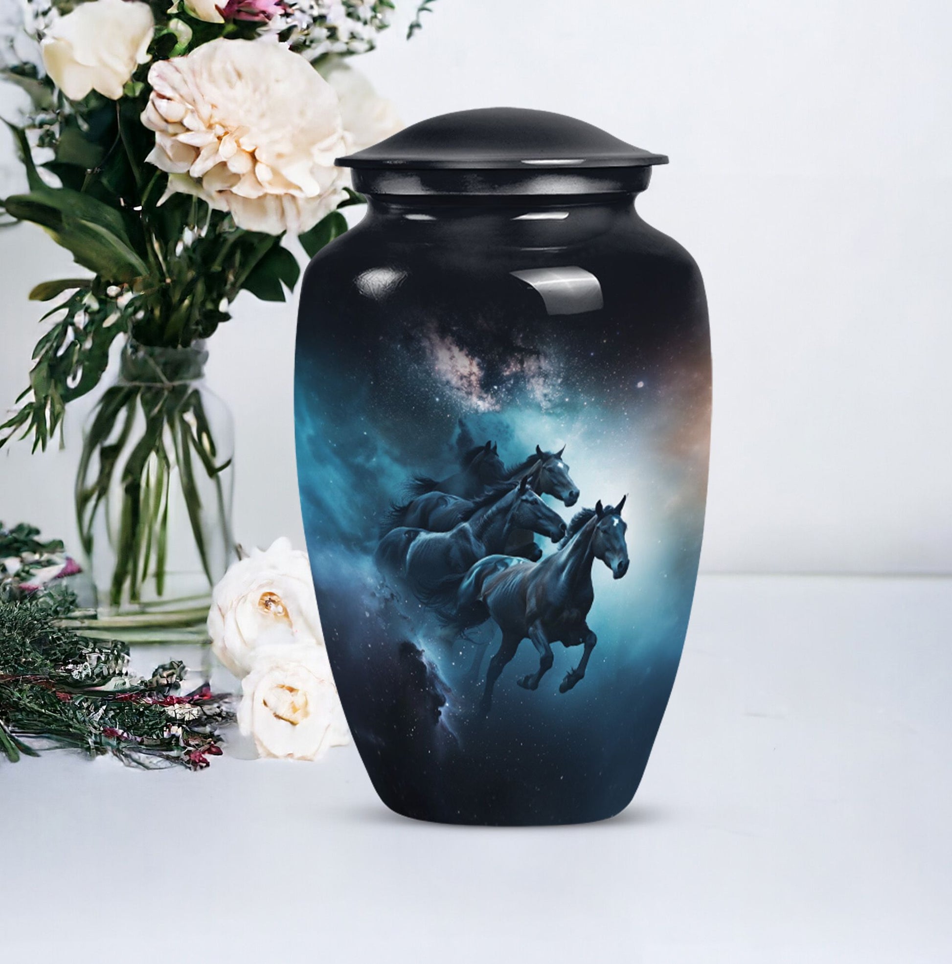 Capture a timeless tribute to a loved one with our meticulously crafted Horse Urn. This Large Urn, fabricated from premium quality Aluminum, spans 10 inches in height and weighs 3.3 pounds. The abstract theme strikes an ideal balance between artistry and symbolism, invoking meaningful reflection. Its robust construction and size of 10 inches can securely hold up to 200 cubic inches of ashes, making it suitable for adult men. This urn is not all about function but conveys an emotional connection through its Classic Urn representation. Other than its prominent aesthetic, we offer an added layer of personal sentiments by allowing customization - engrave names on it to make it even more special. Furthermore, each purchase comes with a velvet pouch, ensuring respectful containment of ashes. Ideal for those seeking affordable, quality, and heart-touching memorial urns. Perfect for capturing the essence of love and honor, our Horse Urn serves as an authentic homage to your dad, becoming a family treasure for years to come.