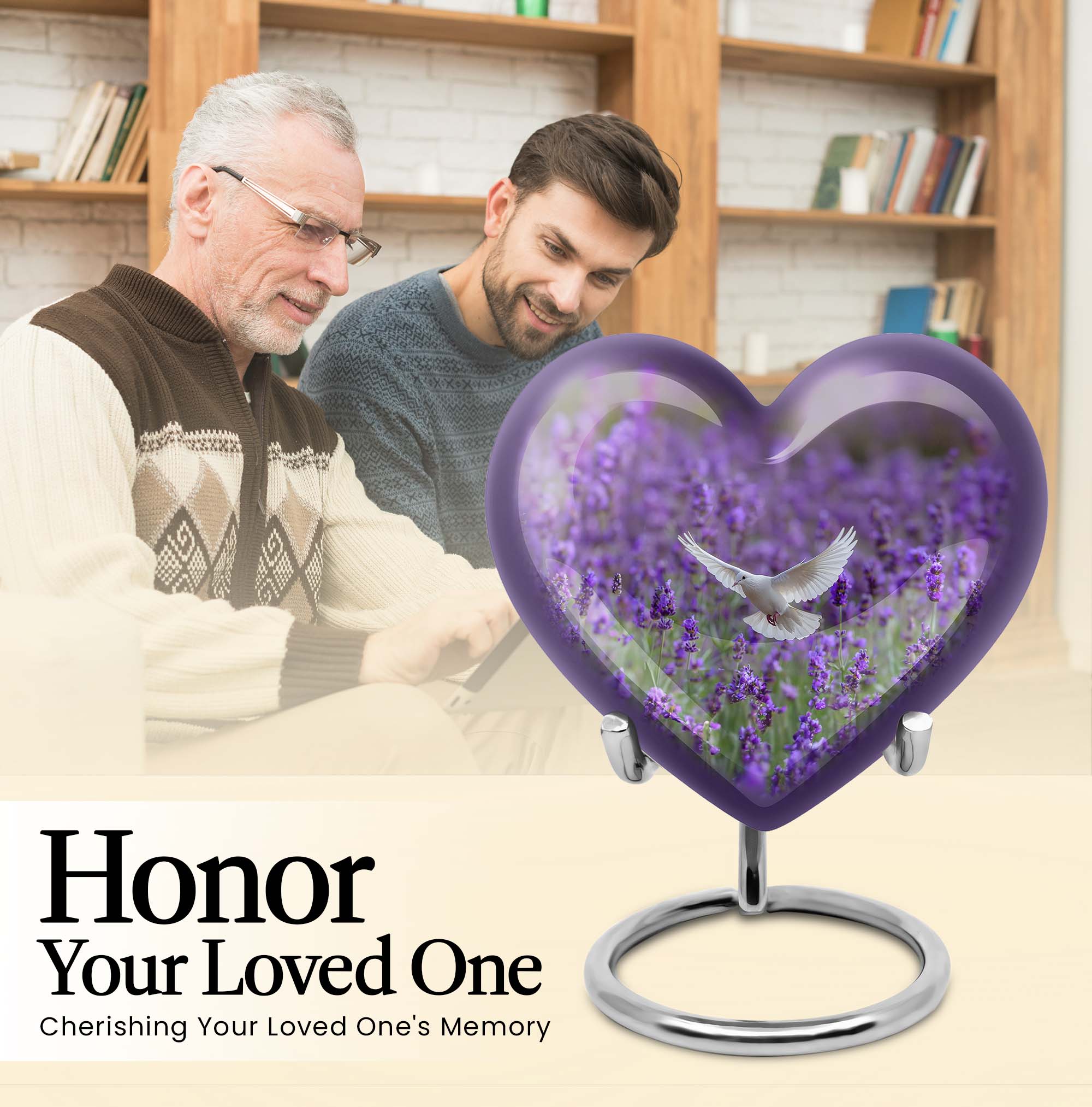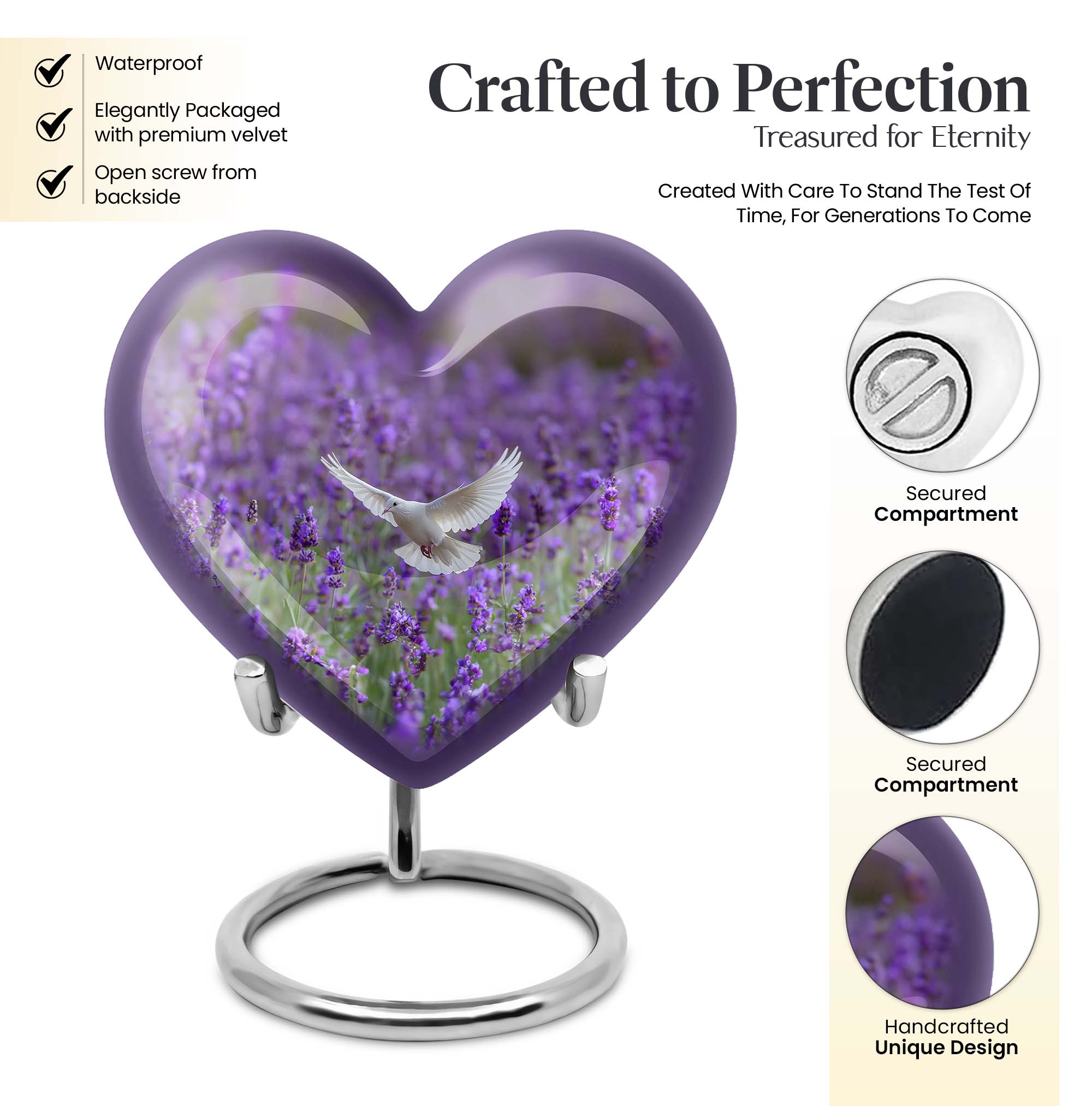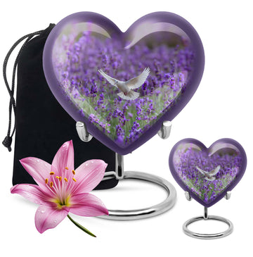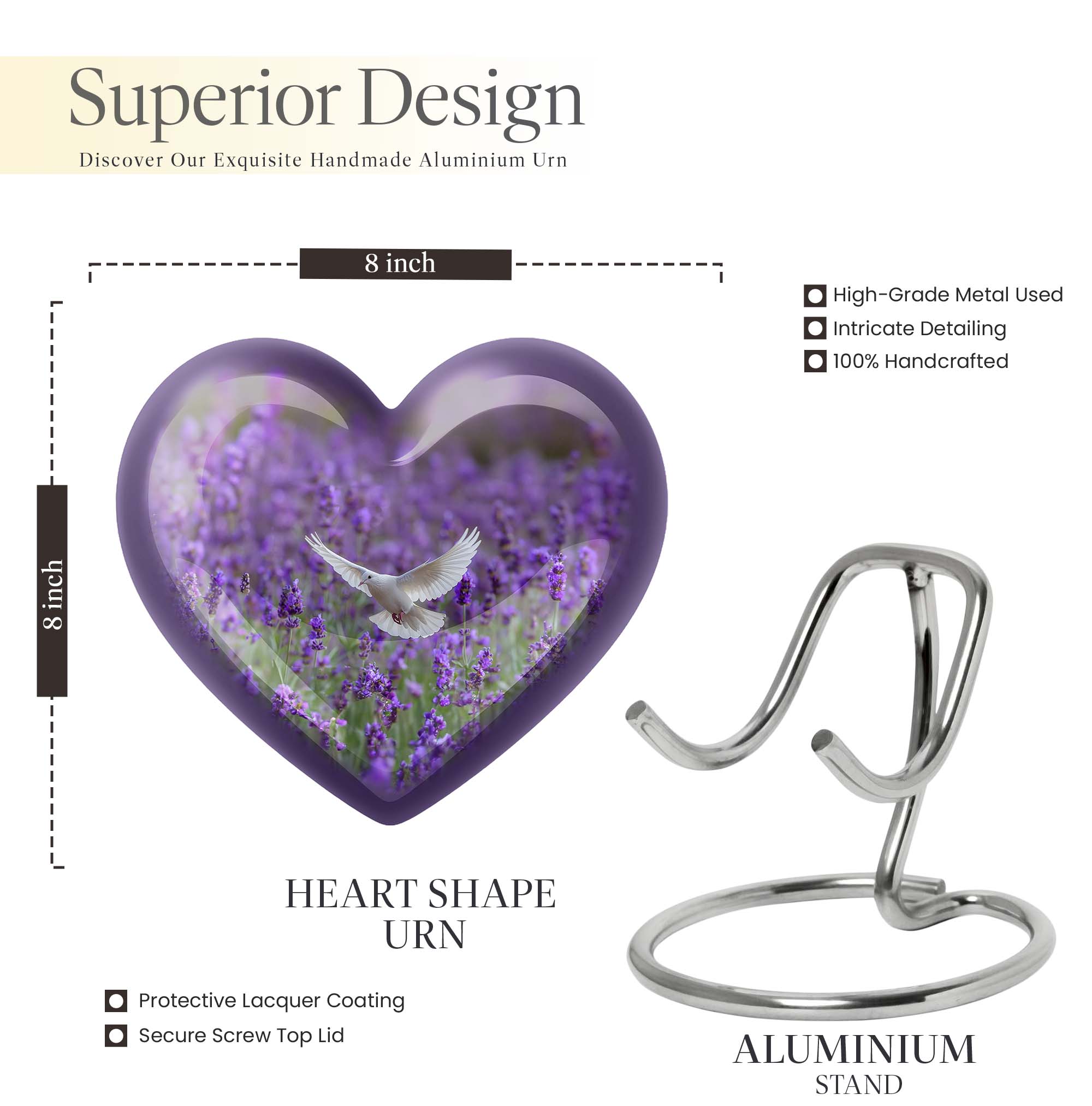 Honoring the beloved's last journey with our meticulously crafted 'Heart Urn'. A truly unique piece, this large White Dove on a Purple Urn is artfully crafted from Aluminium, ensuring durability and exquisite craftsmanship. It stands 10 inches in height, has a capacity of 200 cubic inches, and weighs a mere 3.3 pounds, making it conveniently manageable yet spacious. Being a cremation urn for ashes, it's big enough to hold the remains of an adult. The urn is tastefully accompanied by a velvet pouch for containment of the ashes, complementing the dignified design. Add further depth by personalizing it with engraved names, making it a special remembrance of your loved ones. Included in categories cremation medium urns, human ash urns, and can be a unique idea for funeral gifts. Among metal urns for human ashes, this stands out with its butterfly theme. Truly a beautiful and poignant addition to your memorial rituals.