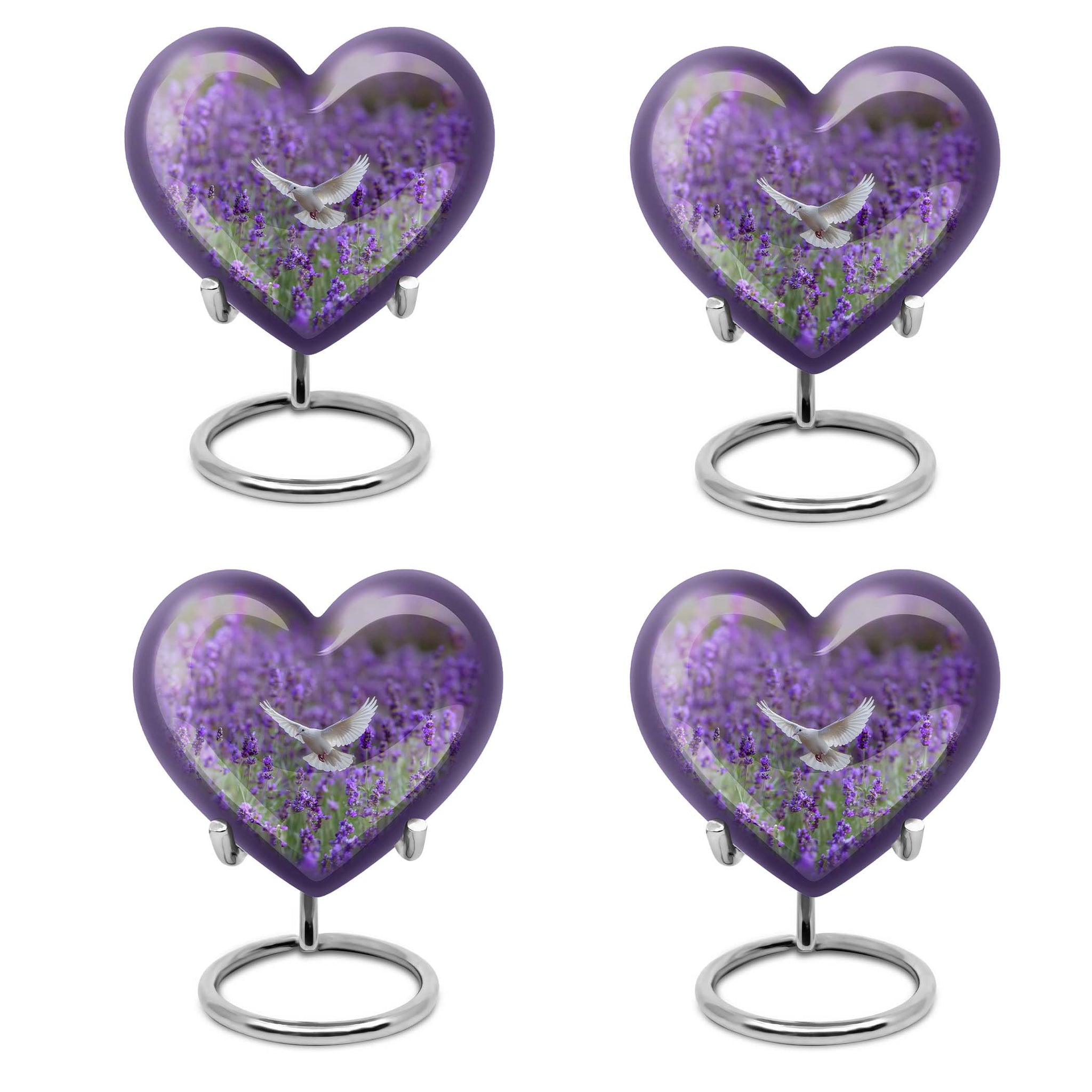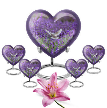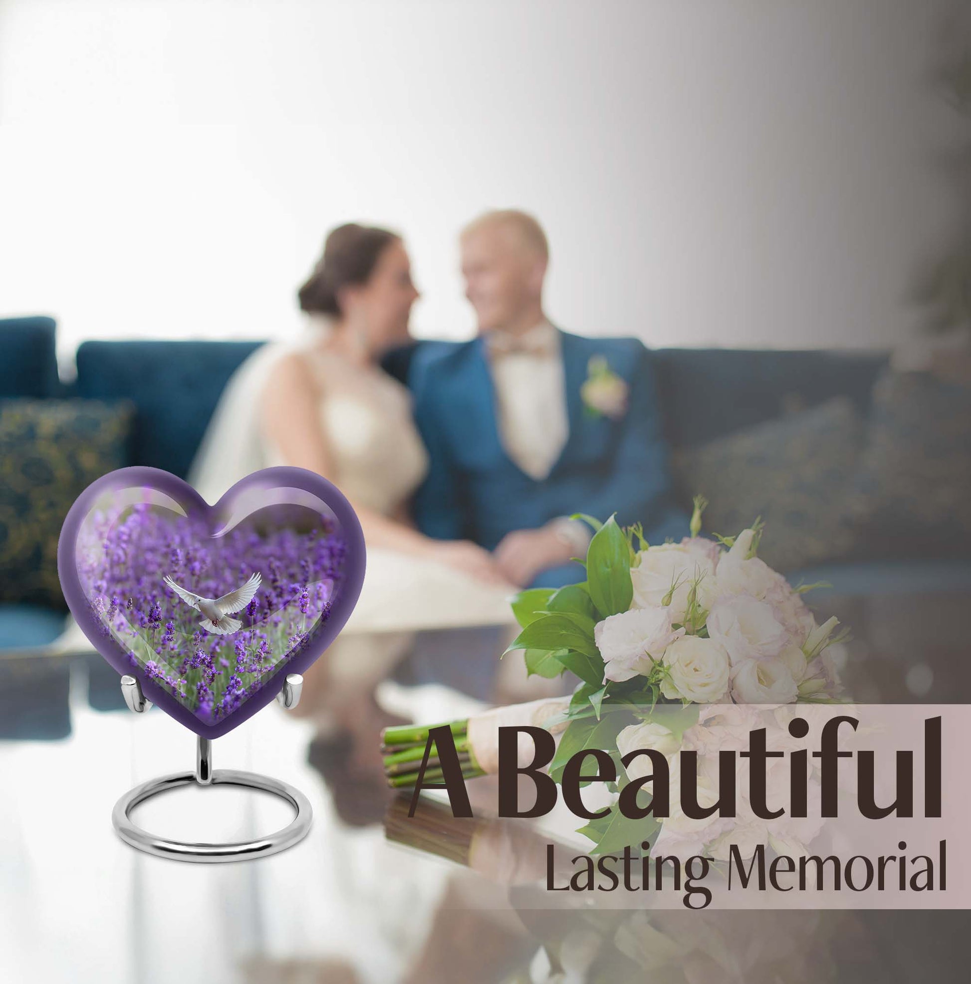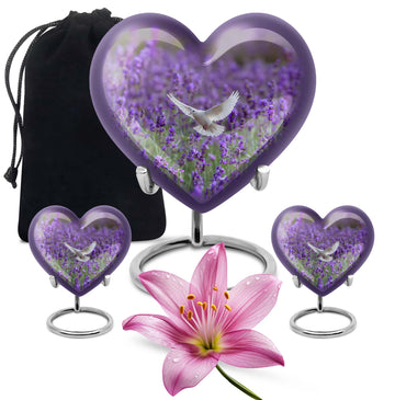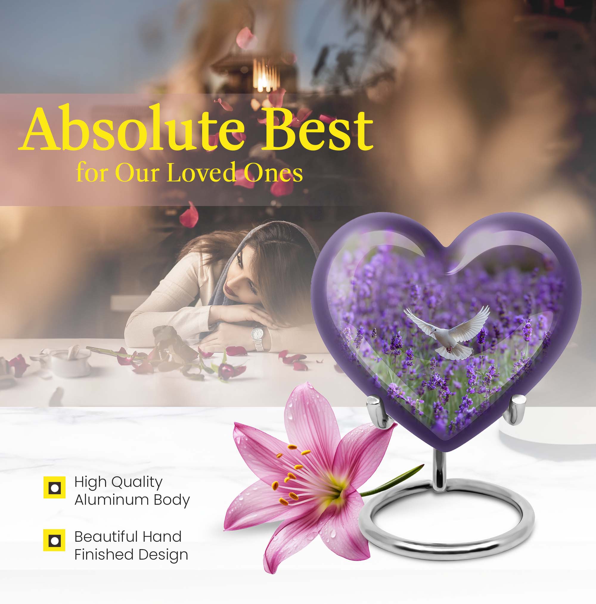 Honoring the beloved's last journey with our meticulously crafted 'Heart Urn'. A truly unique piece, this large White Dove on a Purple Urn is artfully crafted from Aluminium, ensuring durability and exquisite craftsmanship. It stands 10 inches in height, has a capacity of 200 cubic inches, and weighs a mere 3.3 pounds, making it conveniently manageable yet spacious. Being a cremation urn for ashes, it's big enough to hold the remains of an adult. The urn is tastefully accompanied by a velvet pouch for containment of the ashes, complementing the dignified design. Add further depth by personalizing it with engraved names, making it a special remembrance of your loved ones. Included in categories cremation medium urns, human ash urns, and can be a unique idea for funeral gifts. Among metal urns for human ashes, this stands out with its butterfly theme. Truly a beautiful and poignant addition to your memorial rituals.