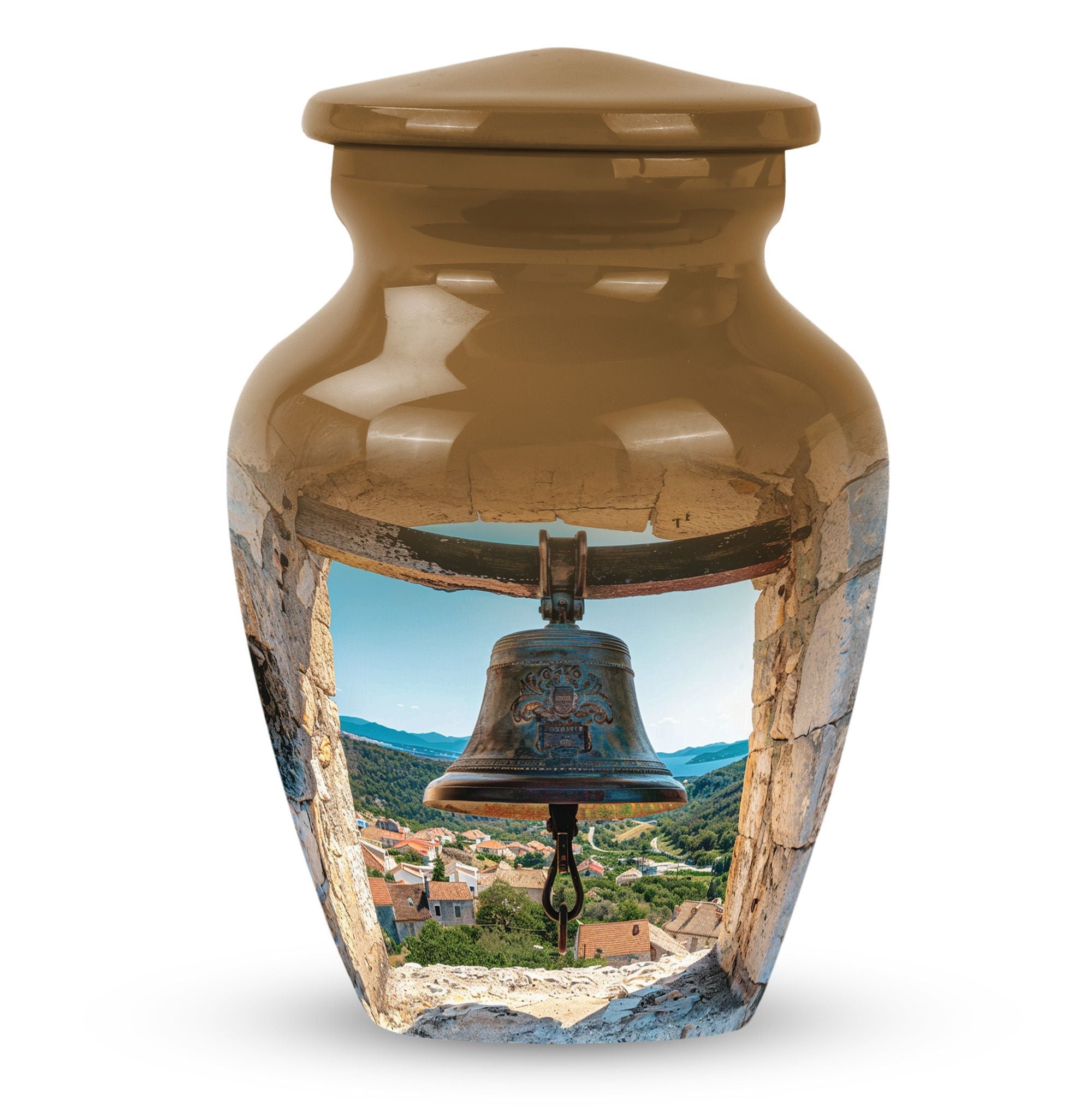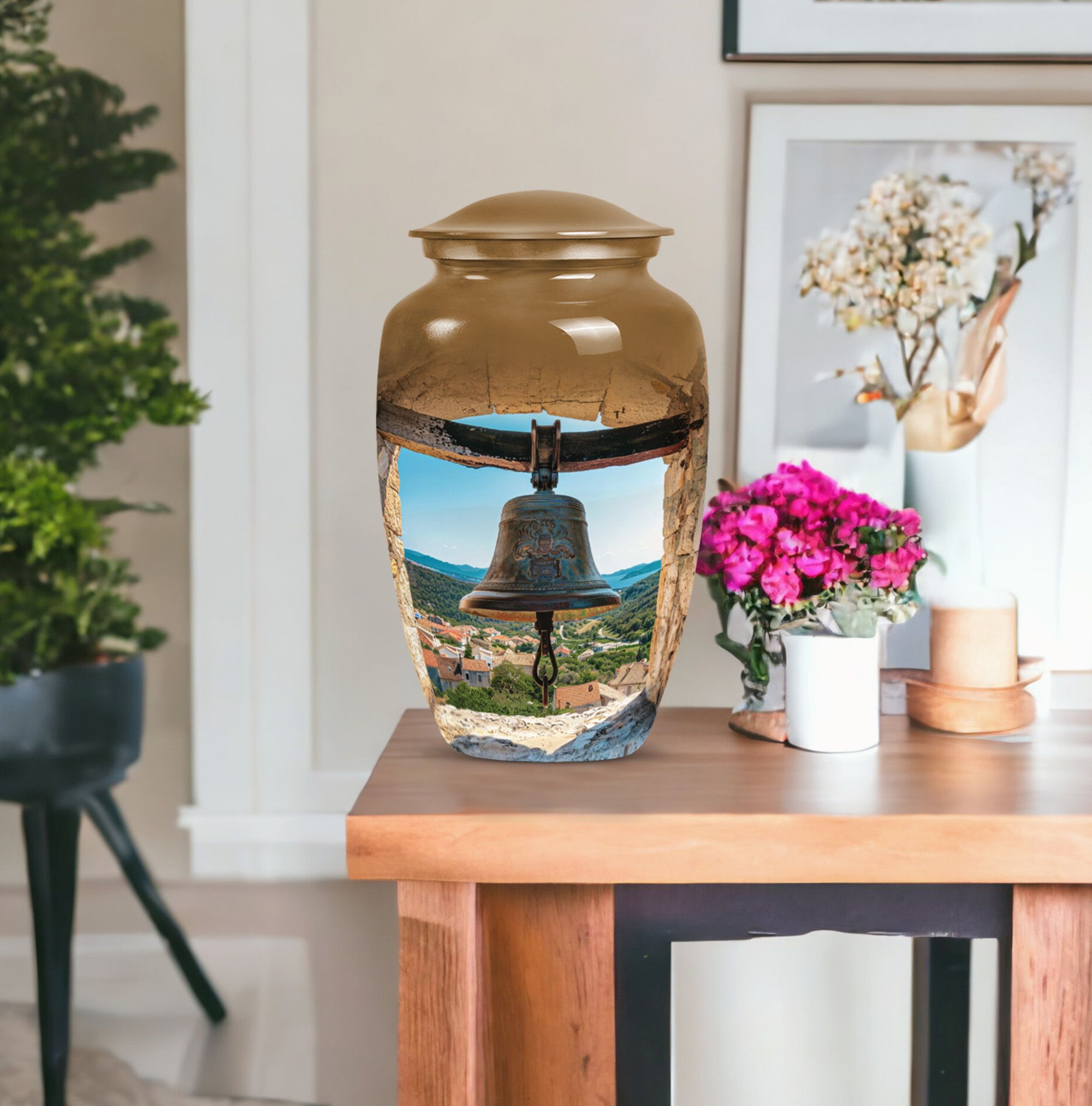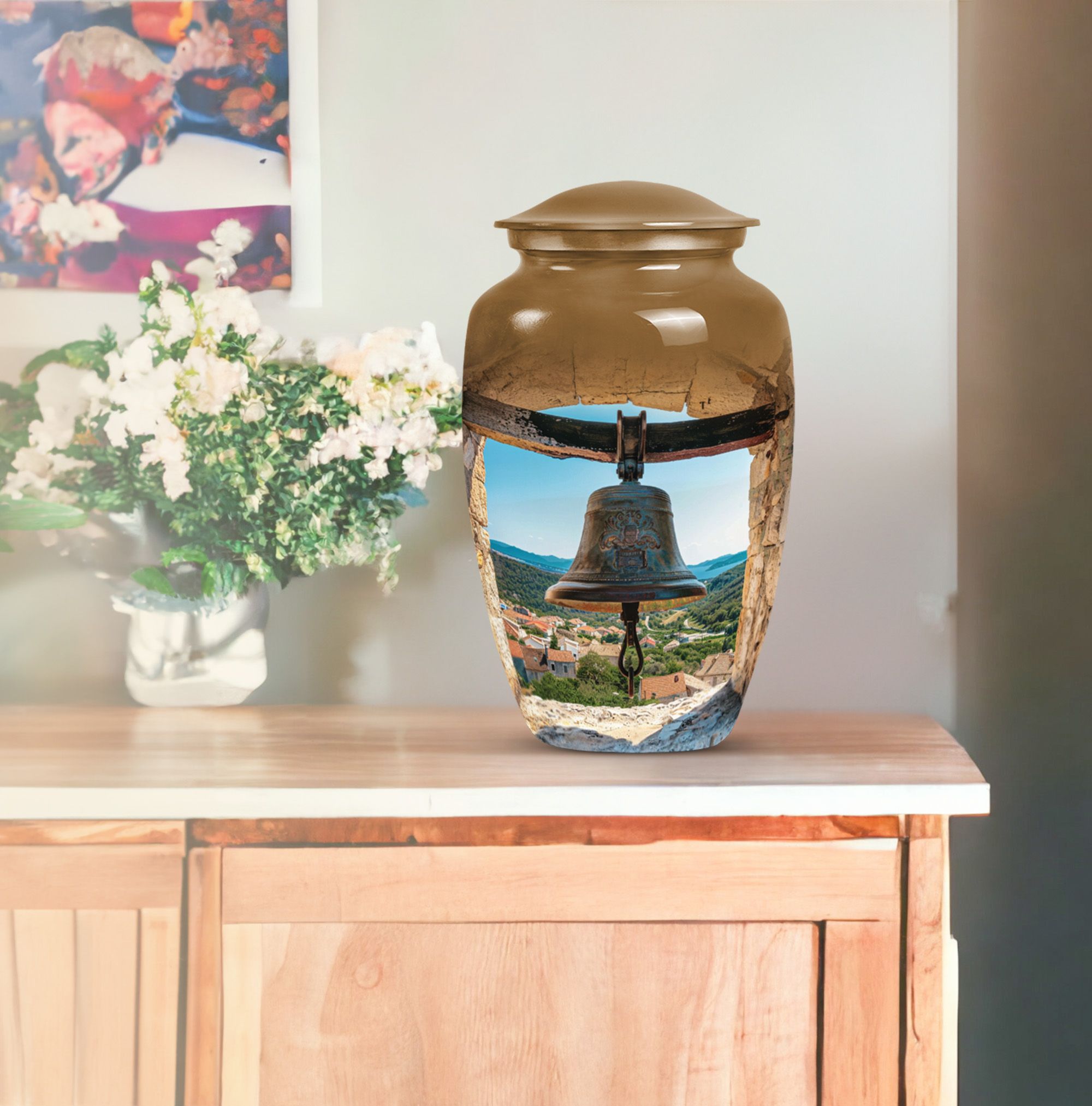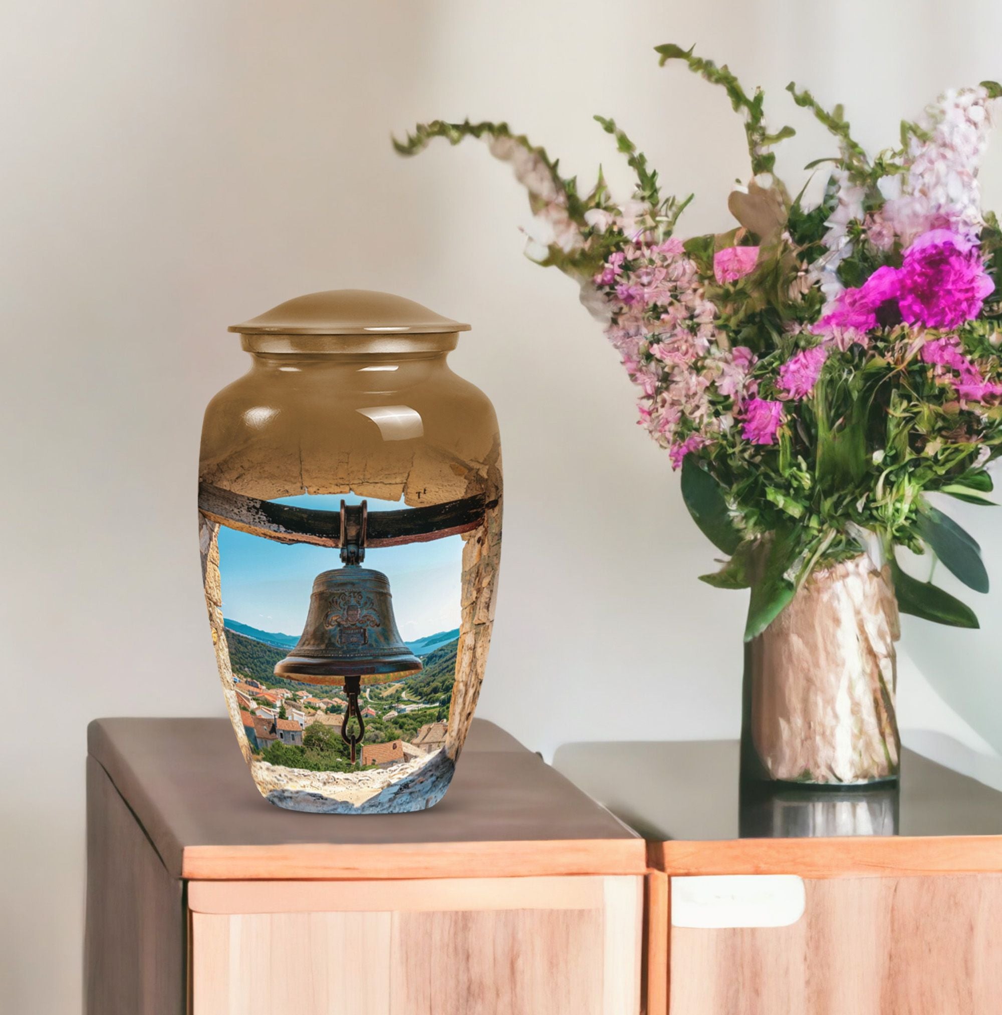 Indulge in a timeless tribute to your beloved with this sophisticated 10-inch Bell Urn - a unique choice amongst memorial urns. This cremation large urn for ashes resonates a classic aura, handcrafted from quality aluminium, weighing a substantial 3.3 pounds. Its 200 cubic inches capacity is exceptionally spacious, perfect for safeguarding the treasured ashes of your dear one. Each urn arrives with a luxurious velvet pouch, designed to securely contain the sacred ashes. Displaying an abstract theme, the Large Urn reflects a visual symphony that transcends cultures and traditions. Enrich your urn with a personalized touch, as you the option to engrave the names in the spirit of immortal memories. The urn, robust yet elegant, makes a soulful addition to your home or a heartfelt funeral gift. Our catalogue also includes cremation medium urns and metal urns for human ashes - nurturing memories with unique expressions.