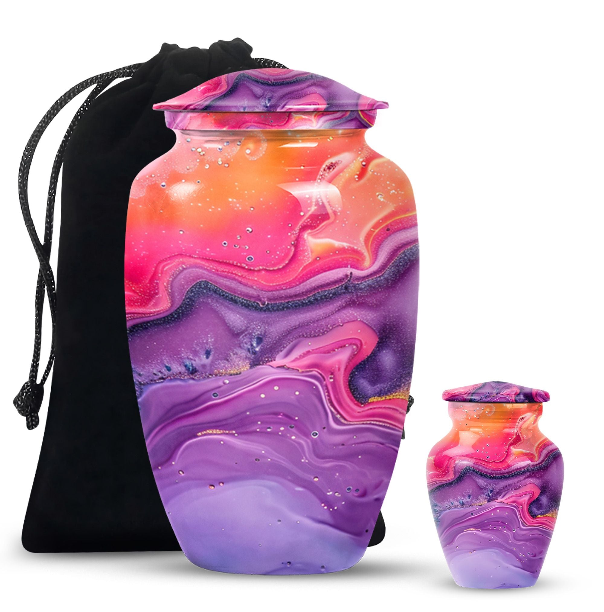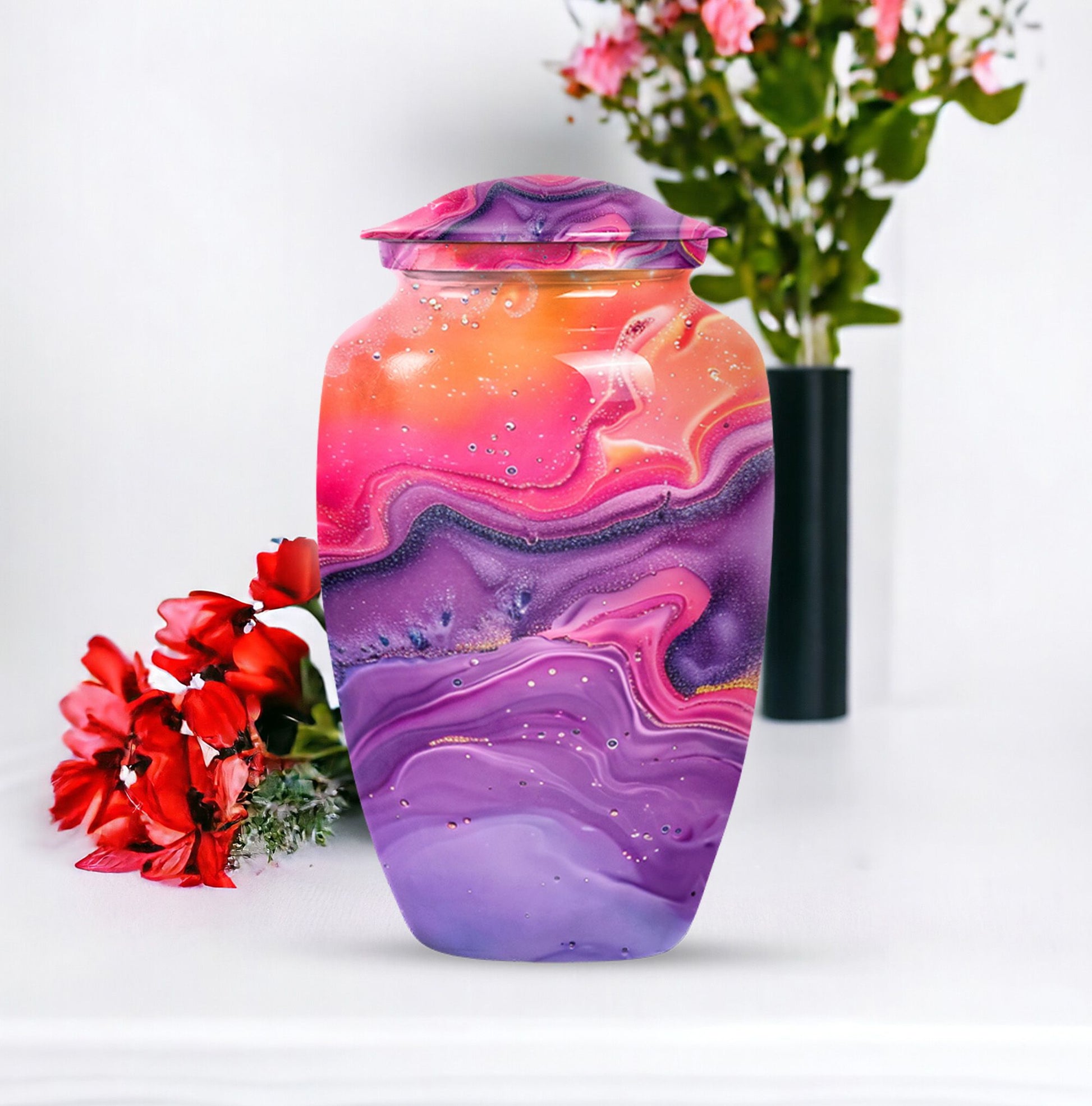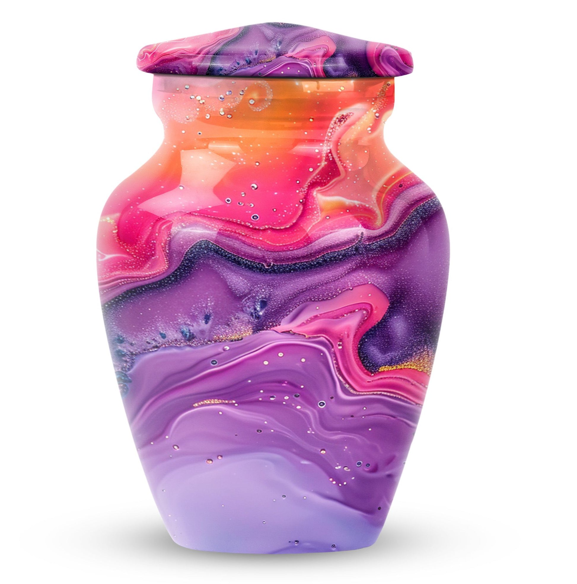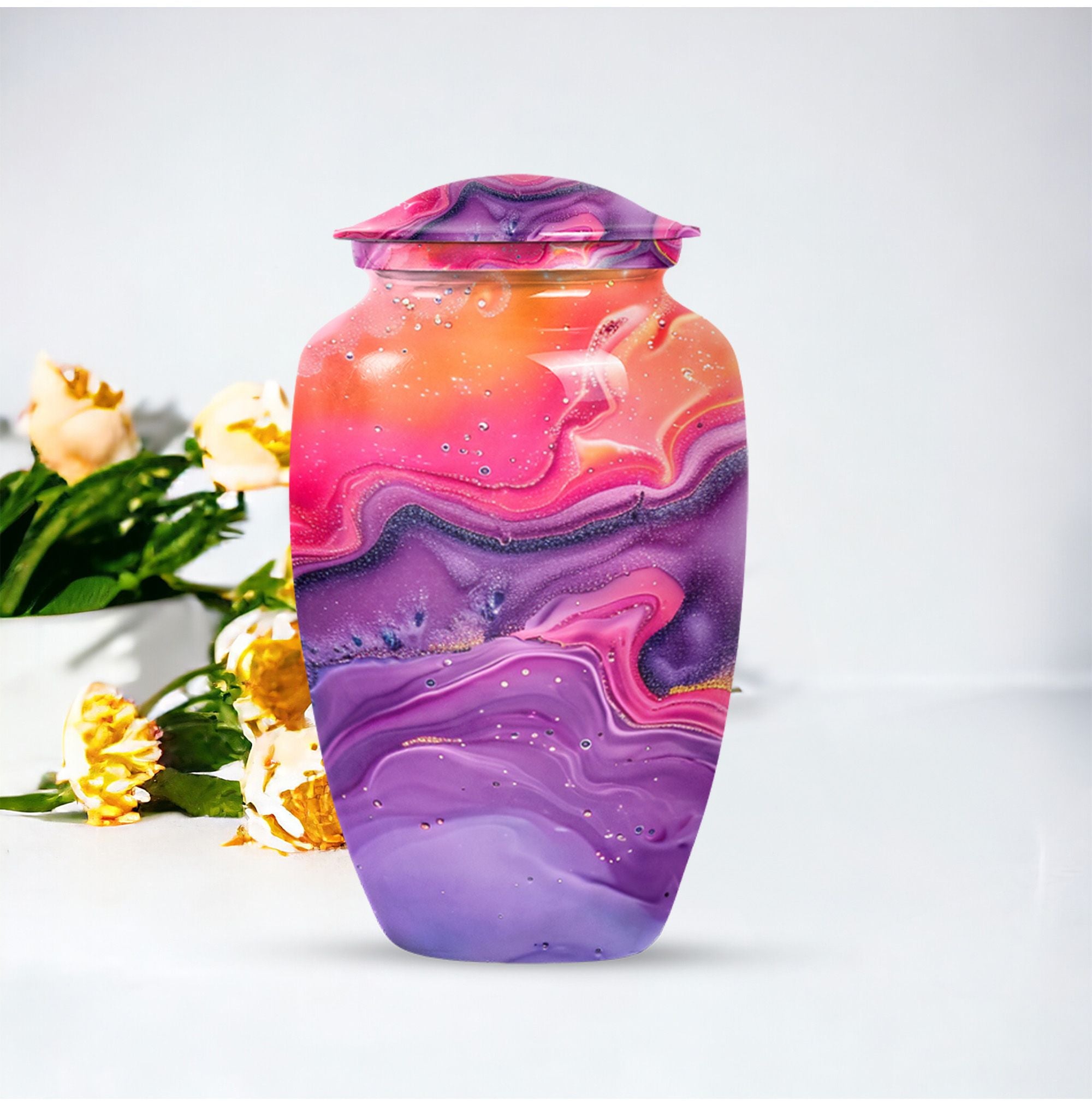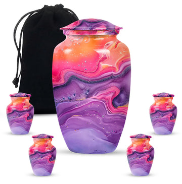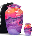 Imprint your everlasting memories in our artisan-crafted Abstract Urn, a standout choice for burial large urns amidst the flurry of generic memorial urns. This majestic 10-inch urn reignites an old-world charm, its robust build accredited to the quality aluminium used. Highly accommodating with a capacity of 200 cubic inches, this urn has enough room to house the ashes without difficulty. Weighing in at a sound 3.3 pounds, its sturdiness speaks of longevity - a permanent home for your beloved's essence. The package includes a velvet pouch, beautifully styled to confine the ashes, adding a touch of decorum to an otherwise heart-wrenching exercise. Our abstract urns are large, aptly fitting for adult funeral ceremonies. Additionally offered are customizations; engrave names to impart a personal touch. This cremation urn doubles as a timeless memento for your loved one, blending modernity with the ageless charm of traditional funeral cremation urns.