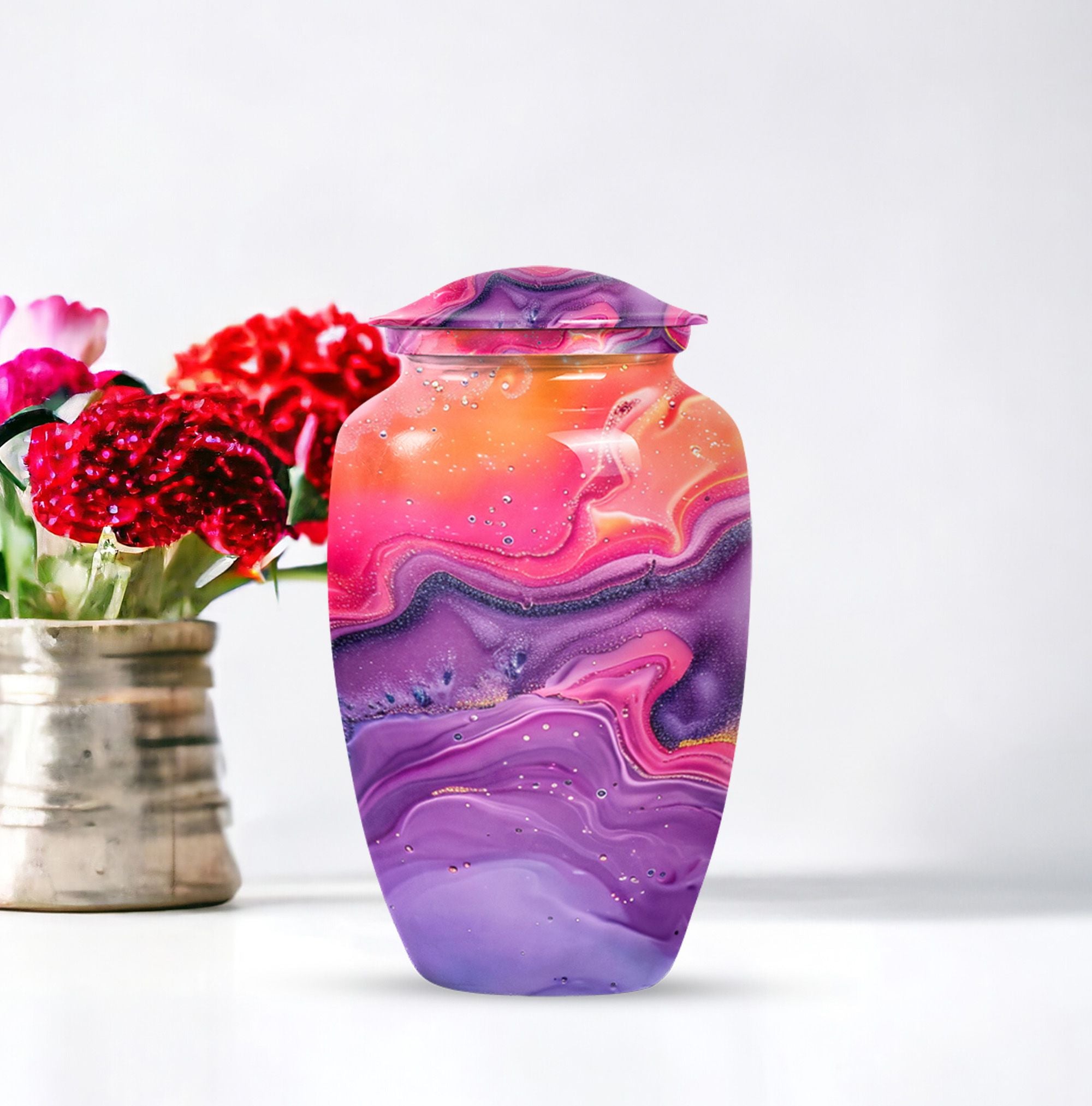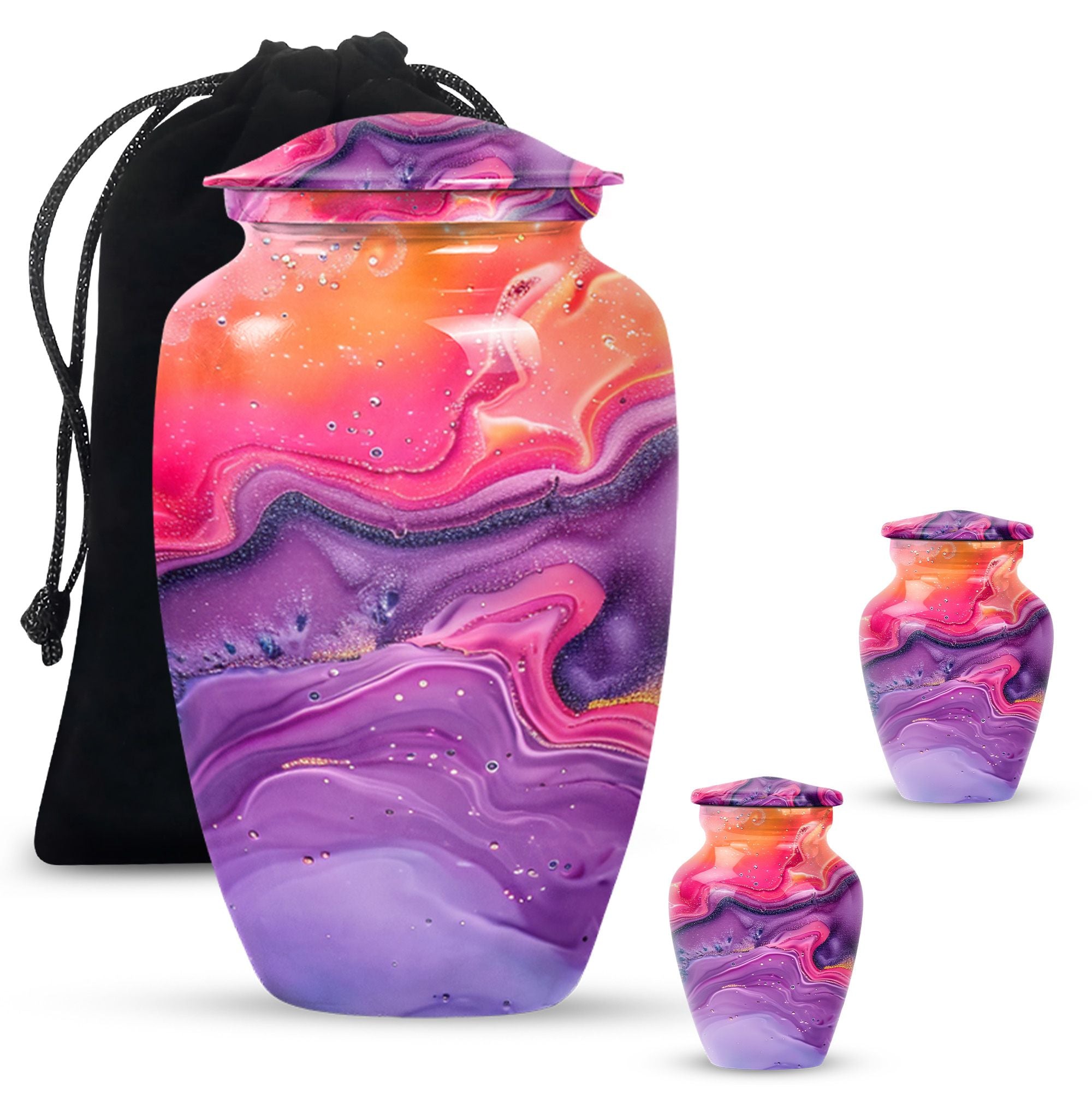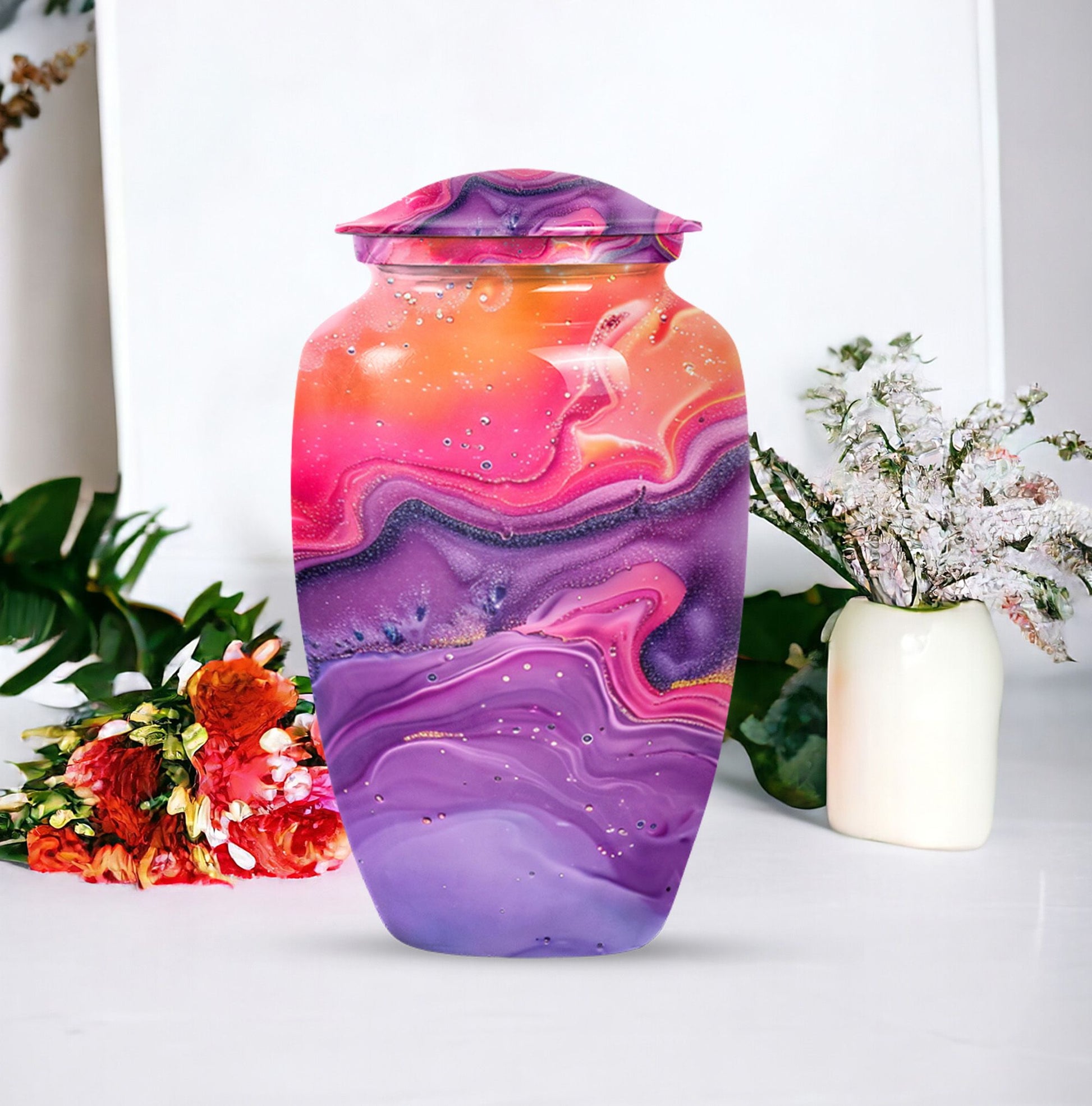 Imprint your everlasting memories in our artisan-crafted Abstract Urn, a standout choice for burial large urns amidst the flurry of generic memorial urns. This majestic 10-inch urn reignites an old-world charm, its robust build accredited to the quality aluminium used. Highly accommodating with a capacity of 200 cubic inches, this urn has enough room to house the ashes without difficulty. Weighing in at a sound 3.3 pounds, its sturdiness speaks of longevity - a permanent home for your beloved's essence. The package includes a velvet pouch, beautifully styled to confine the ashes, adding a touch of decorum to an otherwise heart-wrenching exercise. Our abstract urns are large, aptly fitting for adult funeral ceremonies. Additionally offered are customizations; engrave names to impart a personal touch. This cremation urn doubles as a timeless memento for your loved one, blending modernity with the ageless charm of traditional funeral cremation urns.