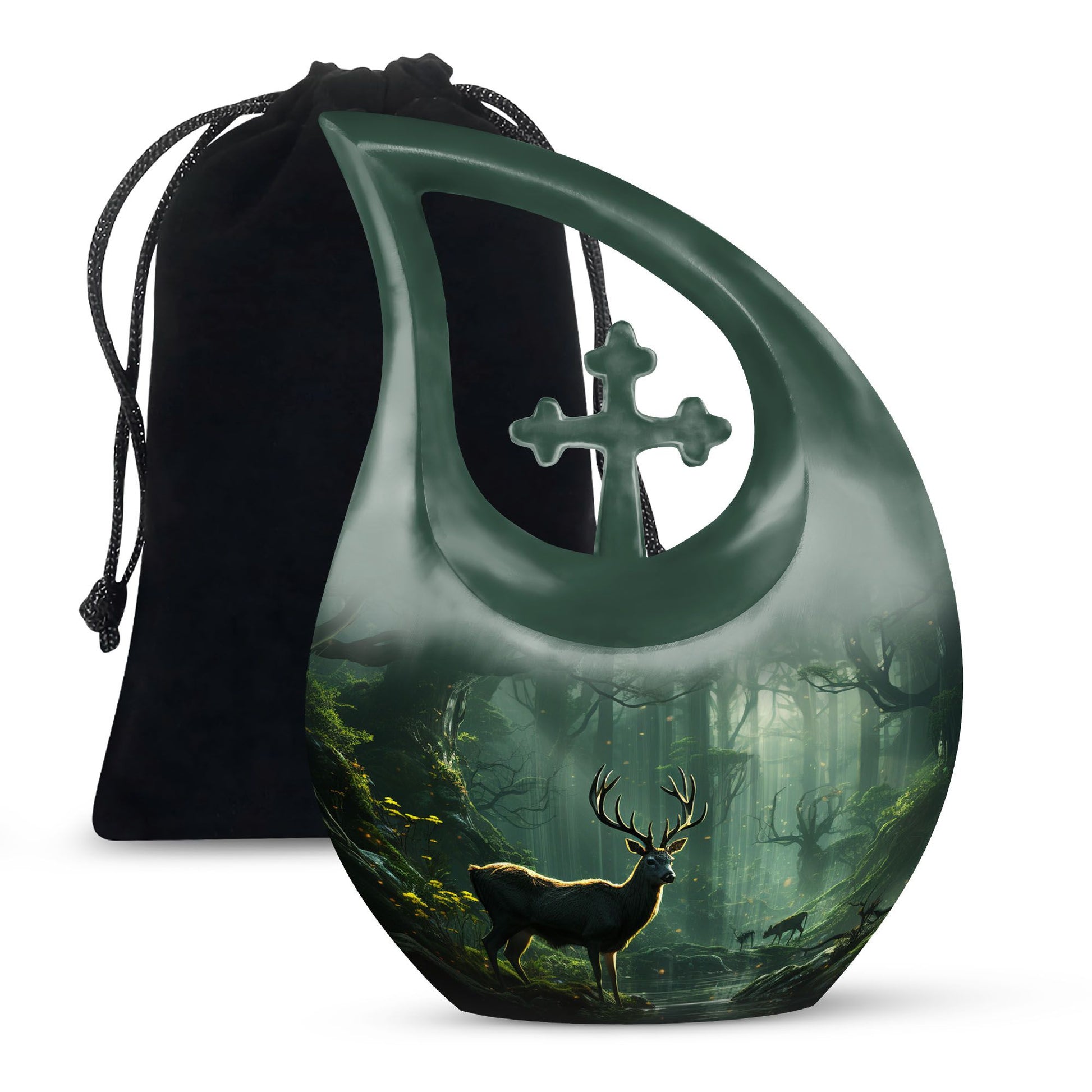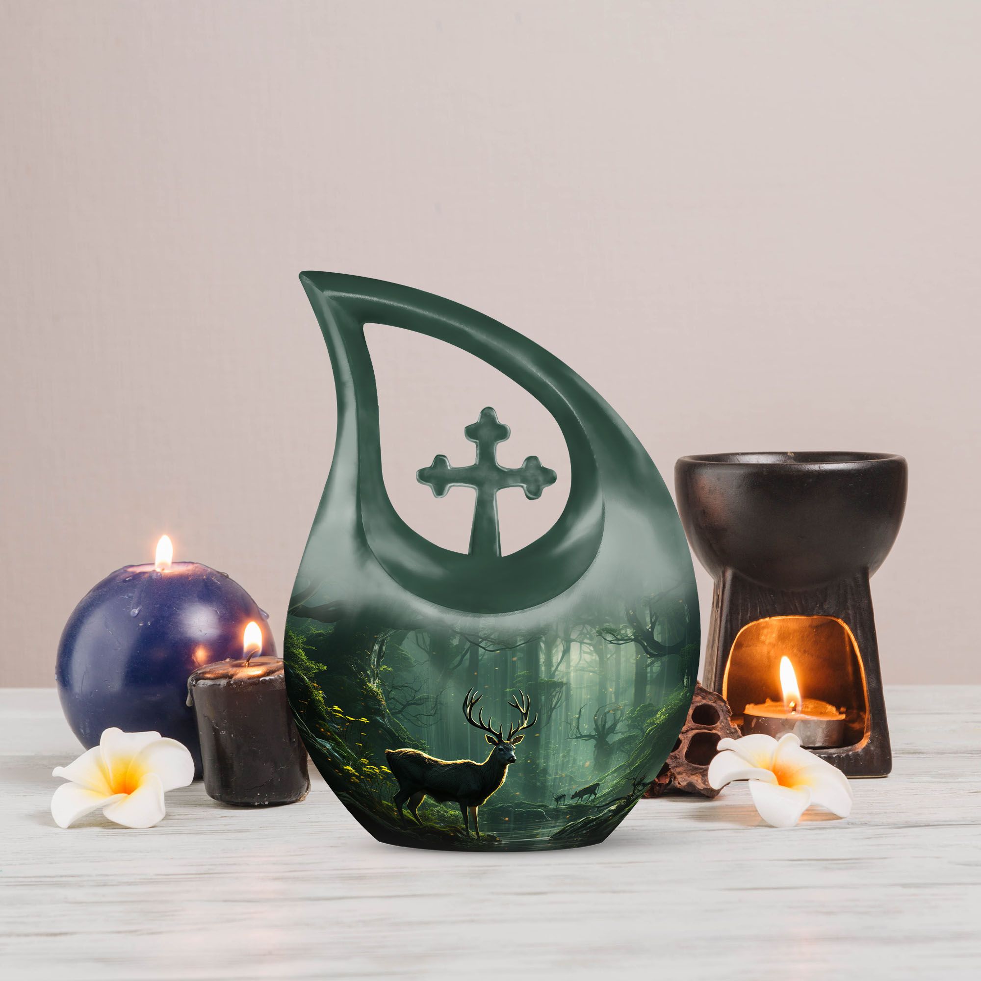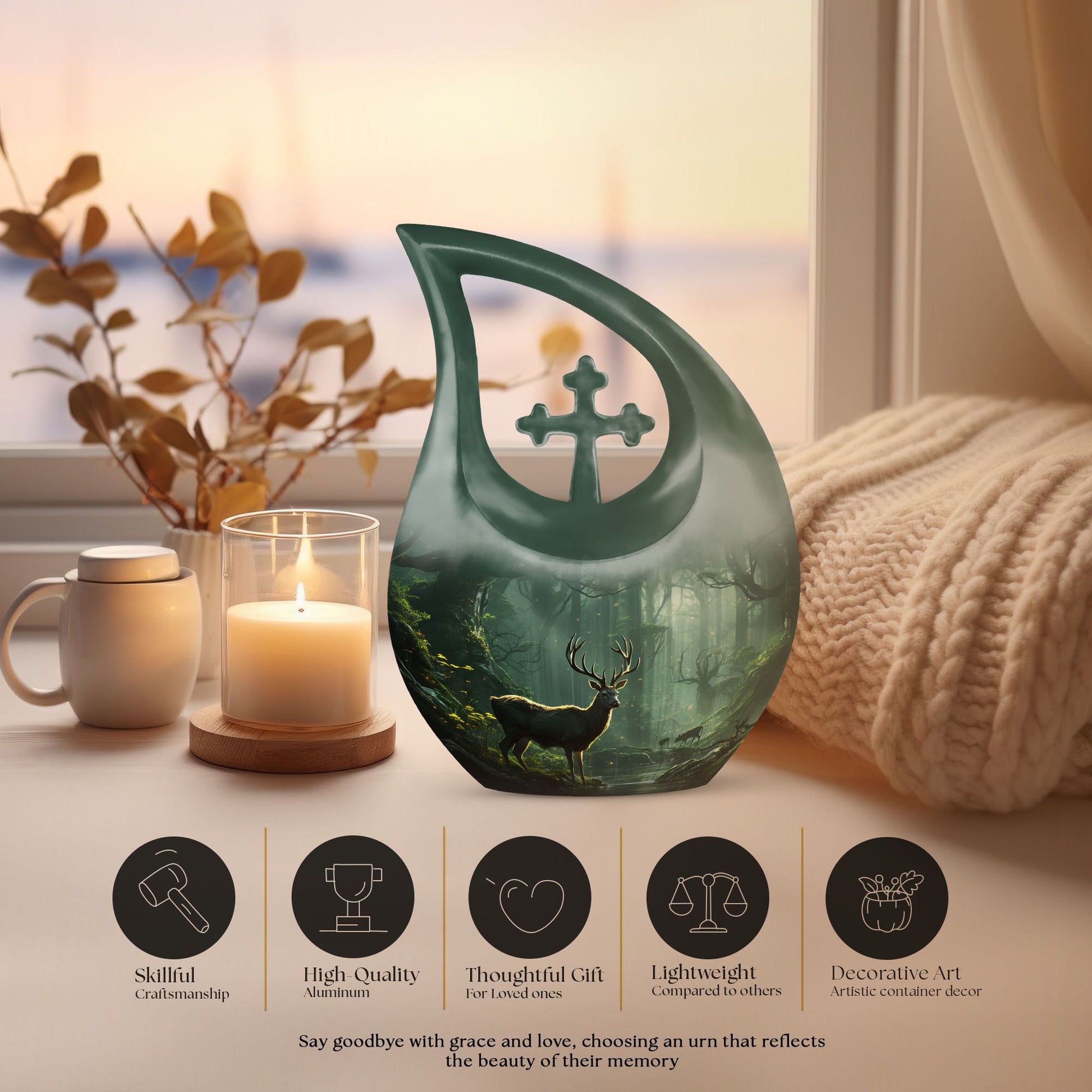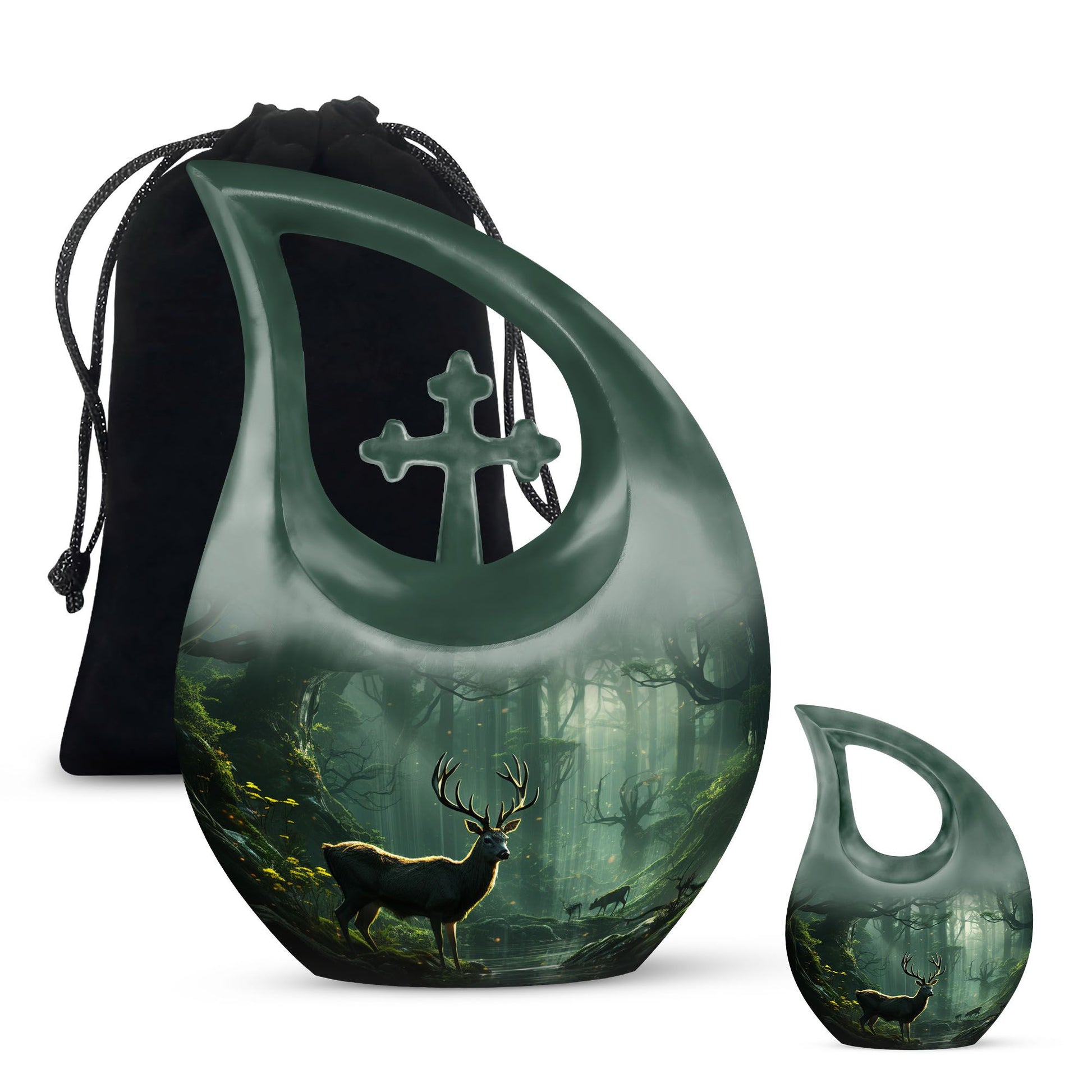 Discover a unique and enduring way to honor your loved ones with our 'Deer Urn'. This elegant 10-inch large urn, meticulously crafted from high-quality aluminium, becomes an unforgettable tribute to the departed soul. This Deer Cremation Urn, weighing a solid 3.3 pounds, ensures a robust, lasting, yet delicate keepsake. Within its dignified dimensions, it offers a generous capacity of 200 cubic inches. The package furthermore includes a velvet pouch to safely contain the ashes, adding an additional touch of respect and care. Our Cross Drop urn relinquishes the conventional and infuses the power of the unique. Complete with opportunities for personalization, engrave this Female Urn with the names of your lost loved ones, making it an exclusive tribute. Some keywords that align well with our product are Deer Urns For Human Ashes, Box Urns For Human Ashes, and Cool Urns, capturing the blend of our product's symbolic stature and contemporary edge.