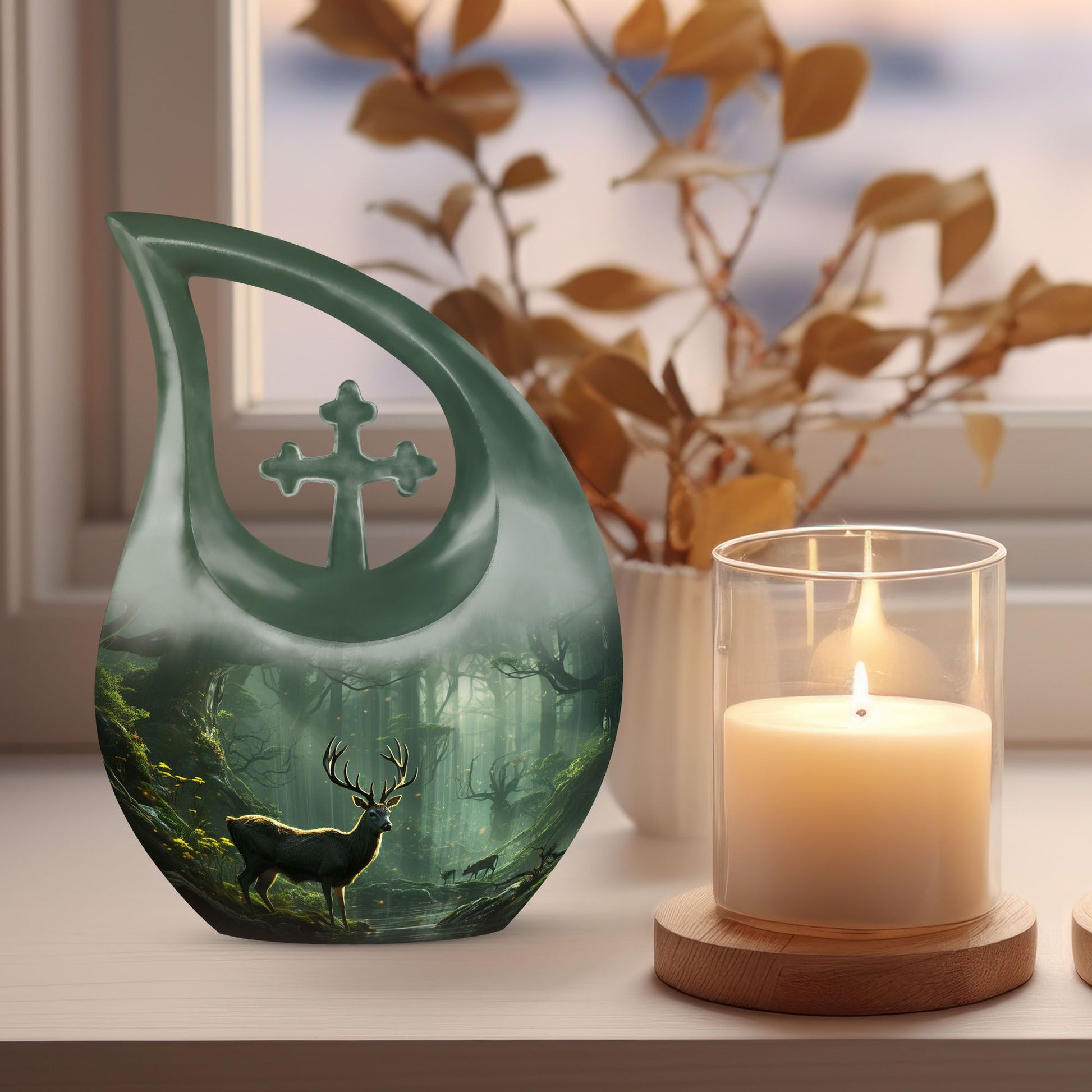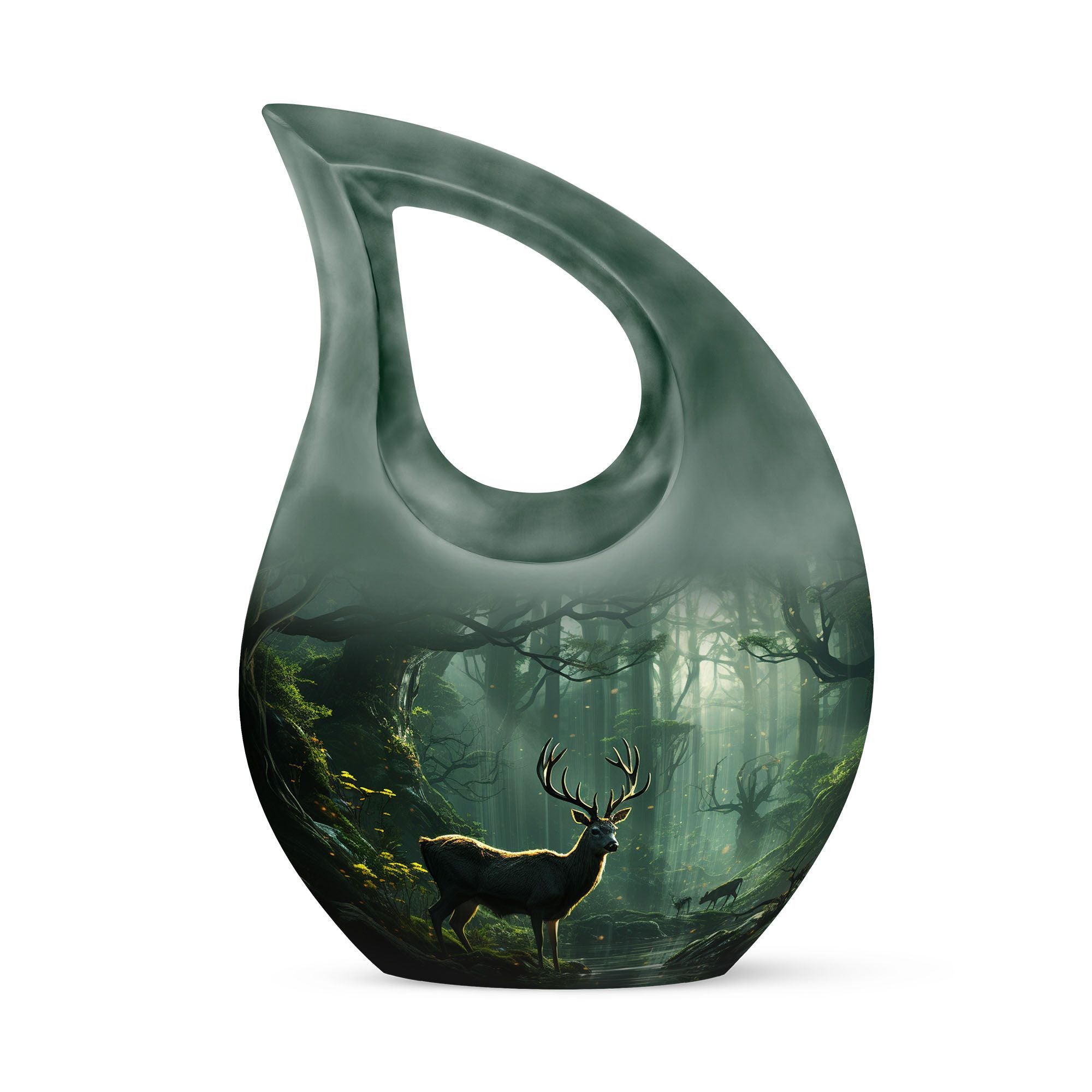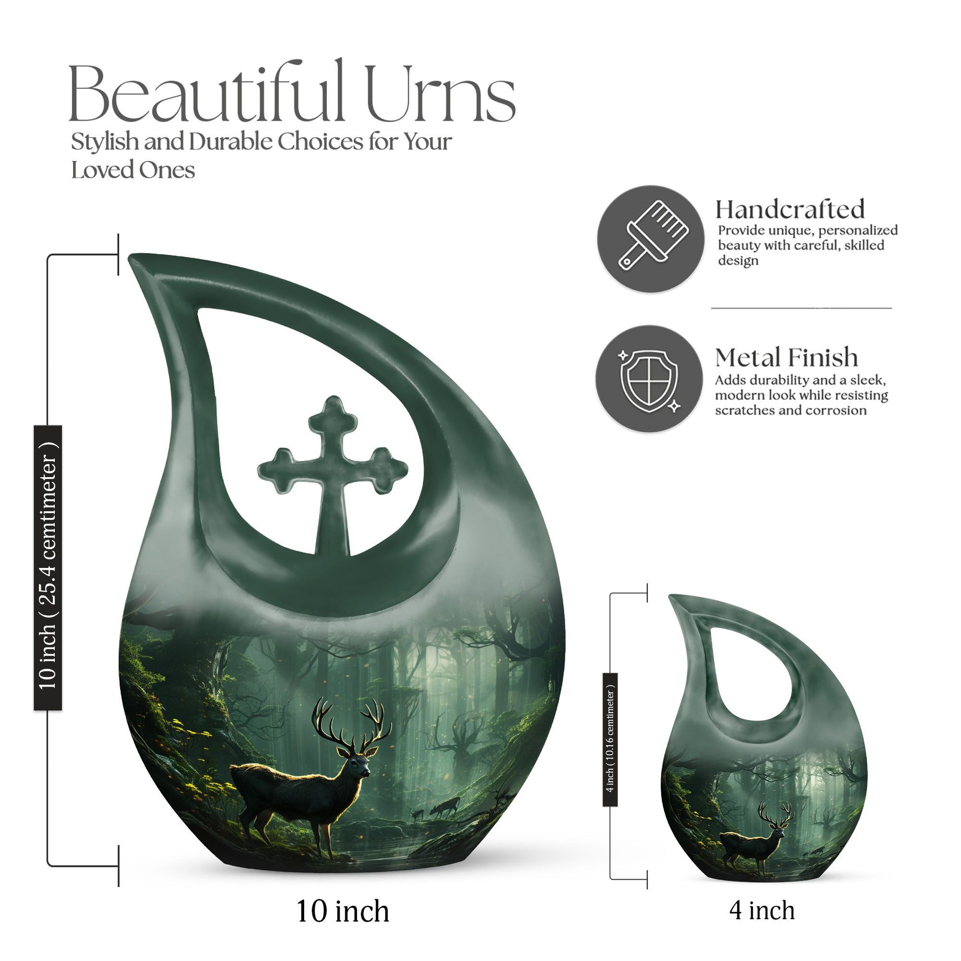 Discover a unique and enduring way to honor your loved ones with our 'Deer Urn'. This elegant 10-inch large urn, meticulously crafted from high-quality aluminium, becomes an unforgettable tribute to the departed soul. This Deer Cremation Urn, weighing a solid 3.3 pounds, ensures a robust, lasting, yet delicate keepsake. Within its dignified dimensions, it offers a generous capacity of 200 cubic inches. The package furthermore includes a velvet pouch to safely contain the ashes, adding an additional touch of respect and care. Our Cross Drop urn relinquishes the conventional and infuses the power of the unique. Complete with opportunities for personalization, engrave this Female Urn with the names of your lost loved ones, making it an exclusive tribute. Some keywords that align well with our product are Deer Urns For Human Ashes, Box Urns For Human Ashes, and Cool Urns, capturing the blend of our product's symbolic stature and contemporary edge.