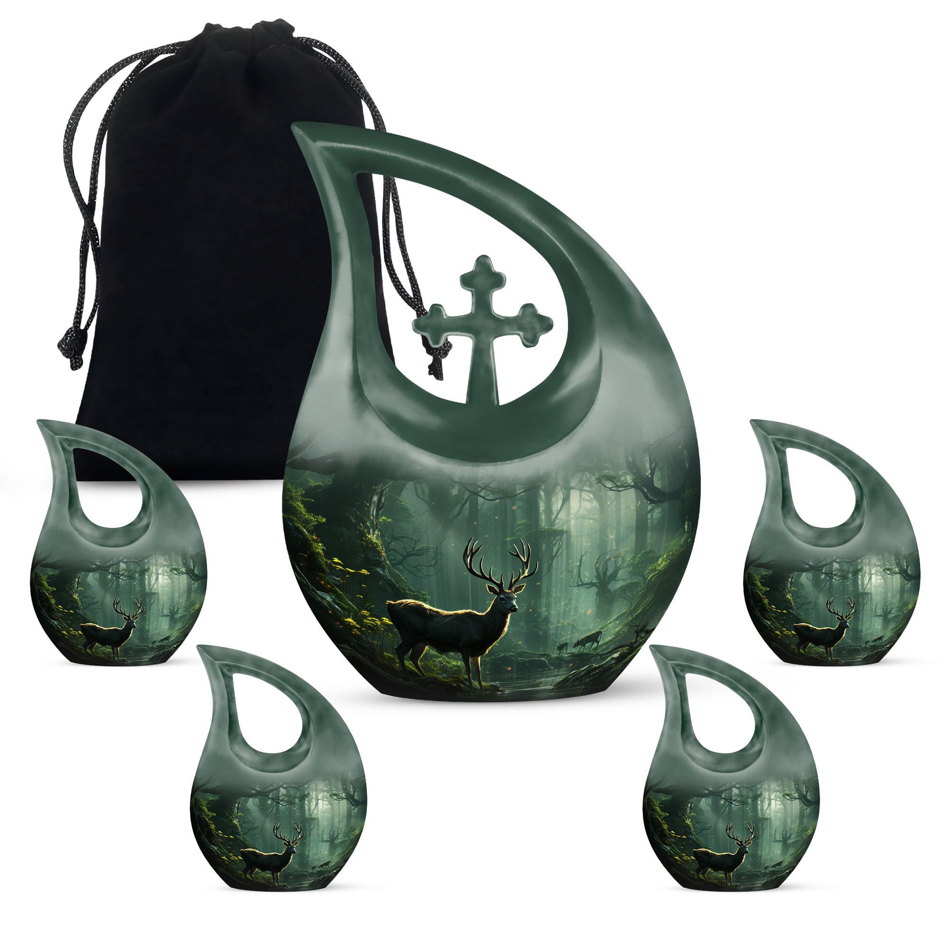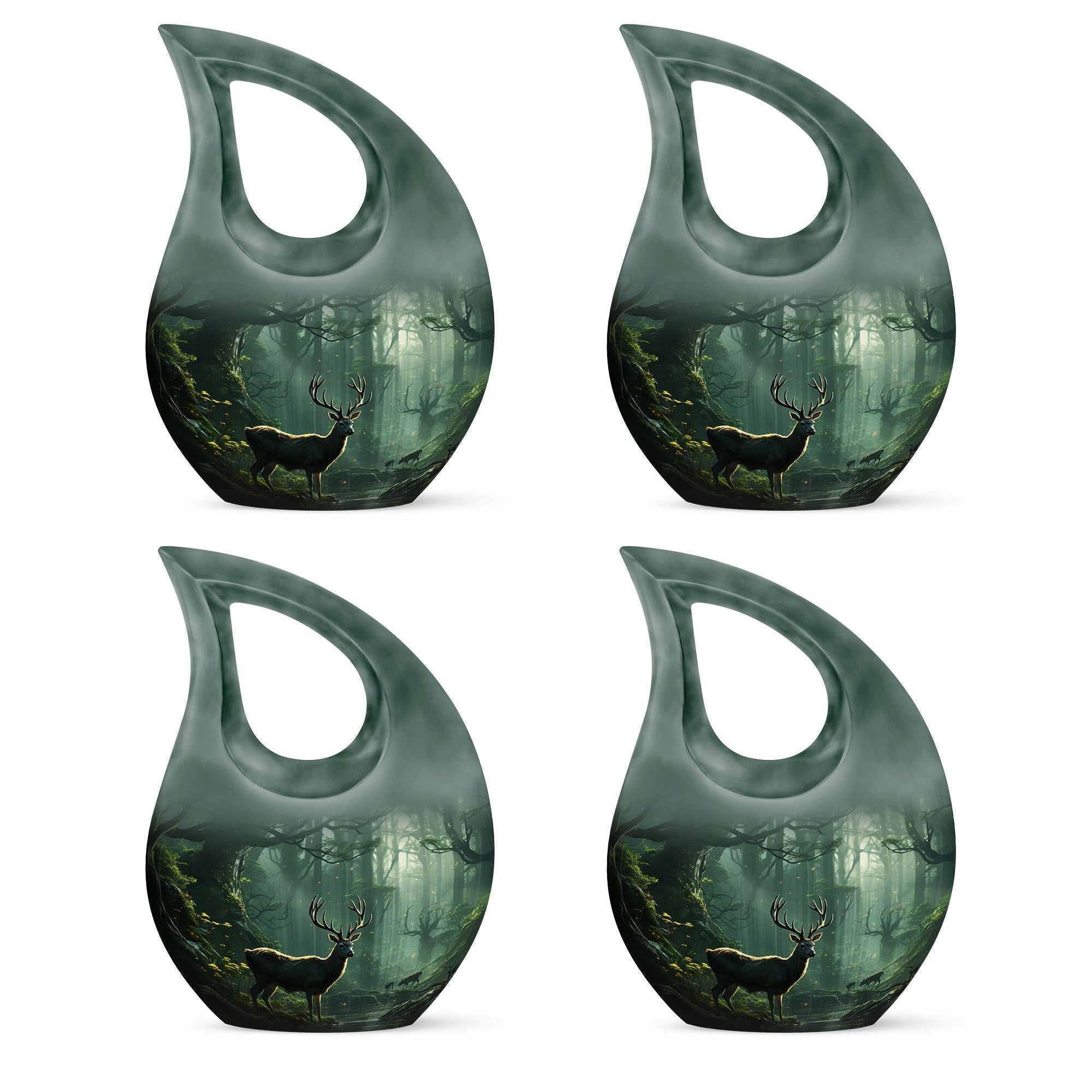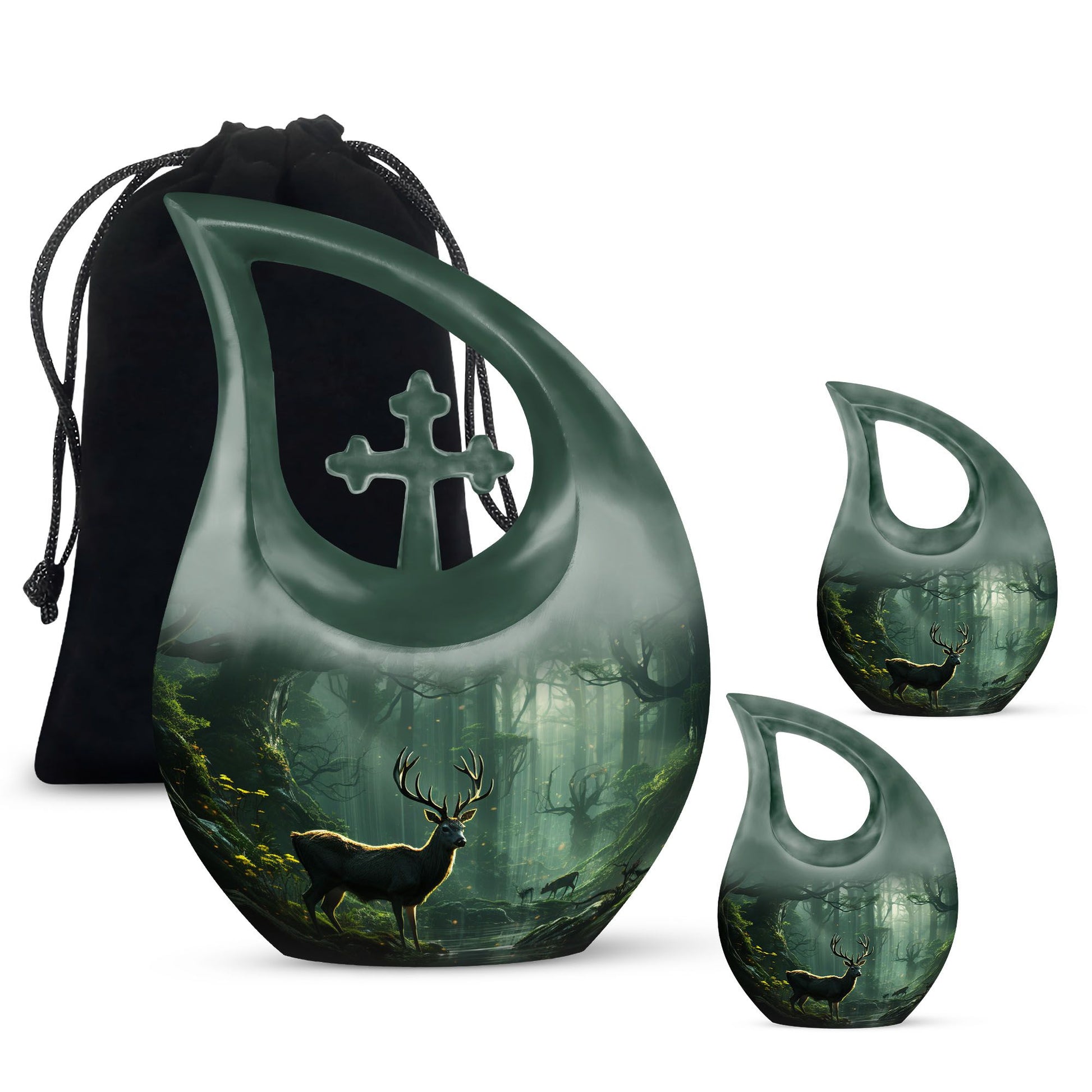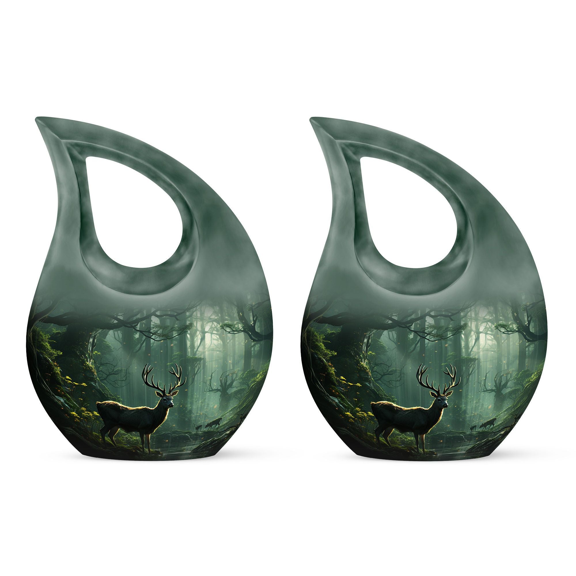 Discover a unique and enduring way to honor your loved ones with our 'Deer Urn'. This elegant 10-inch large urn, meticulously crafted from high-quality aluminium, becomes an unforgettable tribute to the departed soul. This Deer Cremation Urn, weighing a solid 3.3 pounds, ensures a robust, lasting, yet delicate keepsake. Within its dignified dimensions, it offers a generous capacity of 200 cubic inches. The package furthermore includes a velvet pouch to safely contain the ashes, adding an additional touch of respect and care. Our Cross Drop urn relinquishes the conventional and infuses the power of the unique. Complete with opportunities for personalization, engrave this Female Urn with the names of your lost loved ones, making it an exclusive tribute. Some keywords that align well with our product are Deer Urns For Human Ashes, Box Urns For Human Ashes, and Cool Urns, capturing the blend of our product's symbolic stature and contemporary edge.