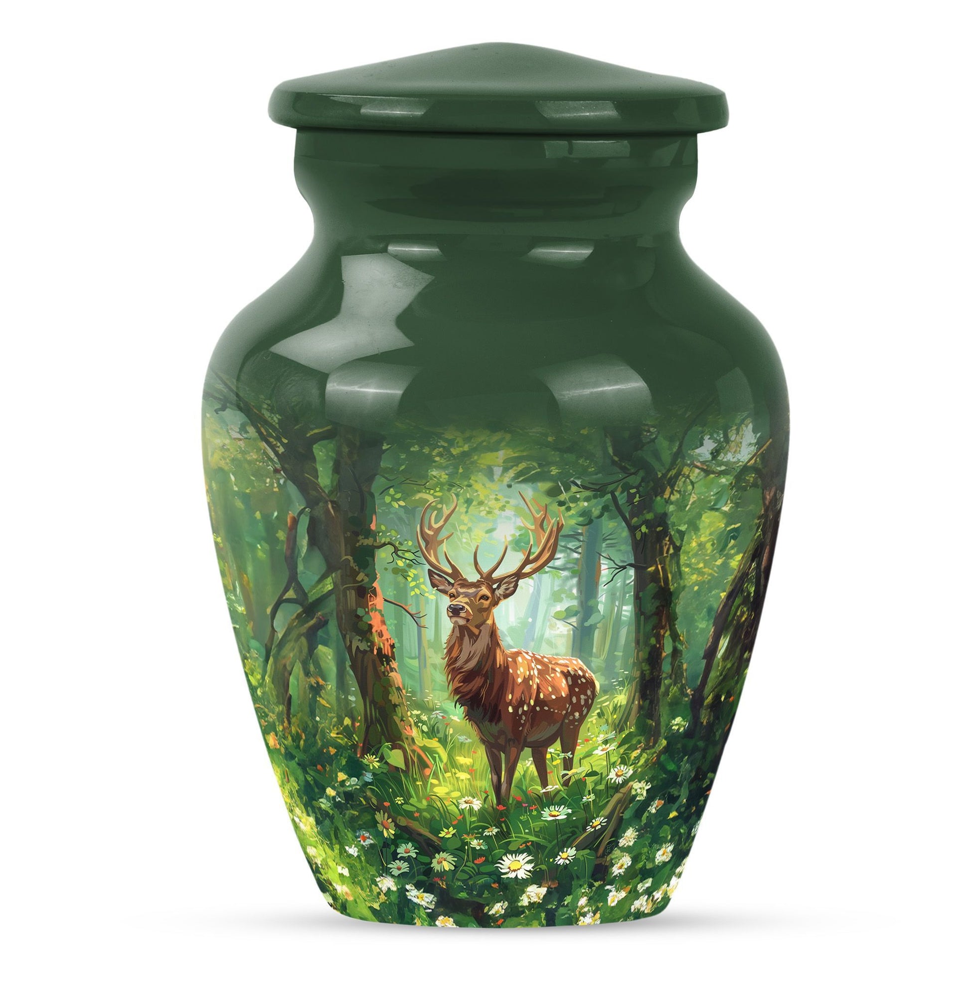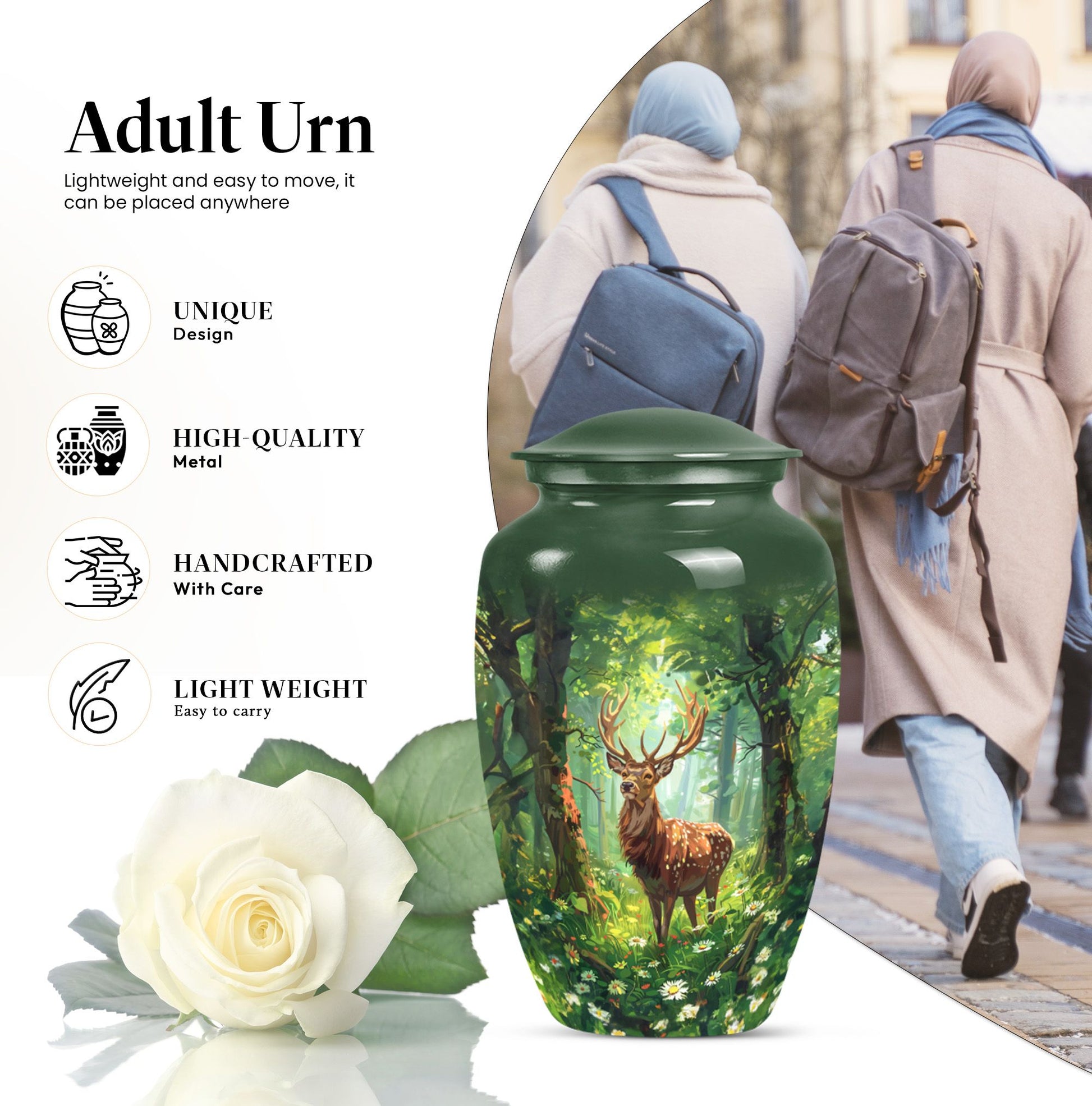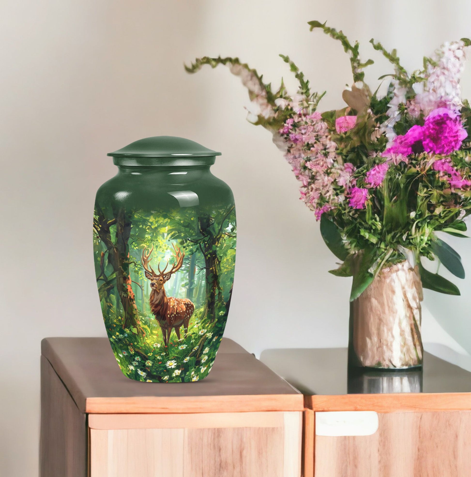 Preserve memory with this deer urn, a time-honoured tribute included in our funeral urns collection for adult human ashes. Crafted from high-grade aluminium, this 10-inch, 3.3-pound cremation urn has a stunning gramophone theme that reflects a solemn, yet serene remembrance. The urn features an impressive 200 cubic inch capacity, handling the full volume of an adult's cremation ashes with dignity and respect. Beyond its significant size and weighted stability, this Large urn sets itself apart with the ability to personalize through engraved names making this urn truly one-of-a-kind. Noteworthy is the inclusion of a velvet pouch, designed for the secure containment and respectful presentation of the loved one's ashes. This urn is not merely a vessel, but a significant memorial piece that captures unwavering love and respect for the departed. It powerfully stands as an 'Innovative Modern Urn for Human Ashes', designed to evoke reverence and tranquillity.