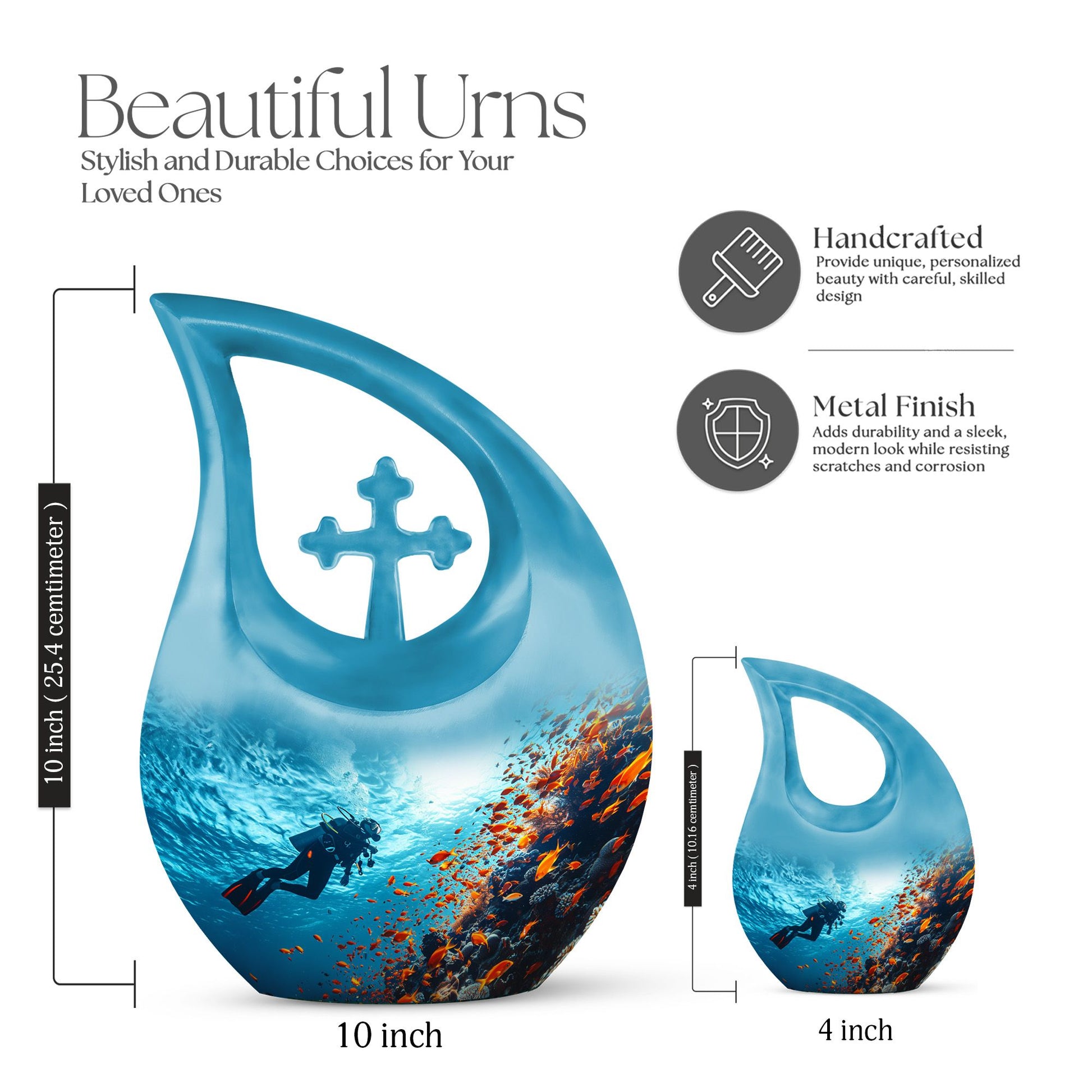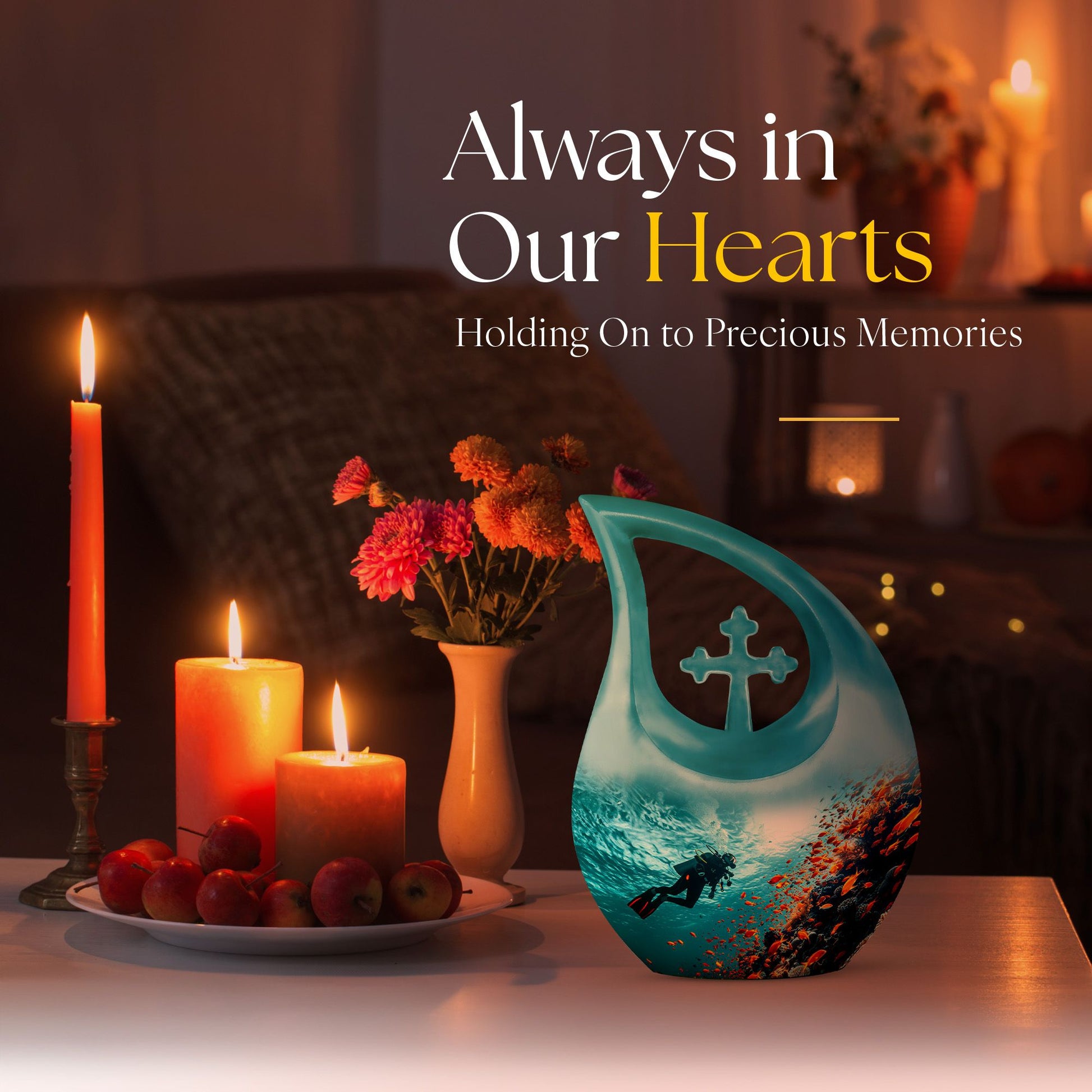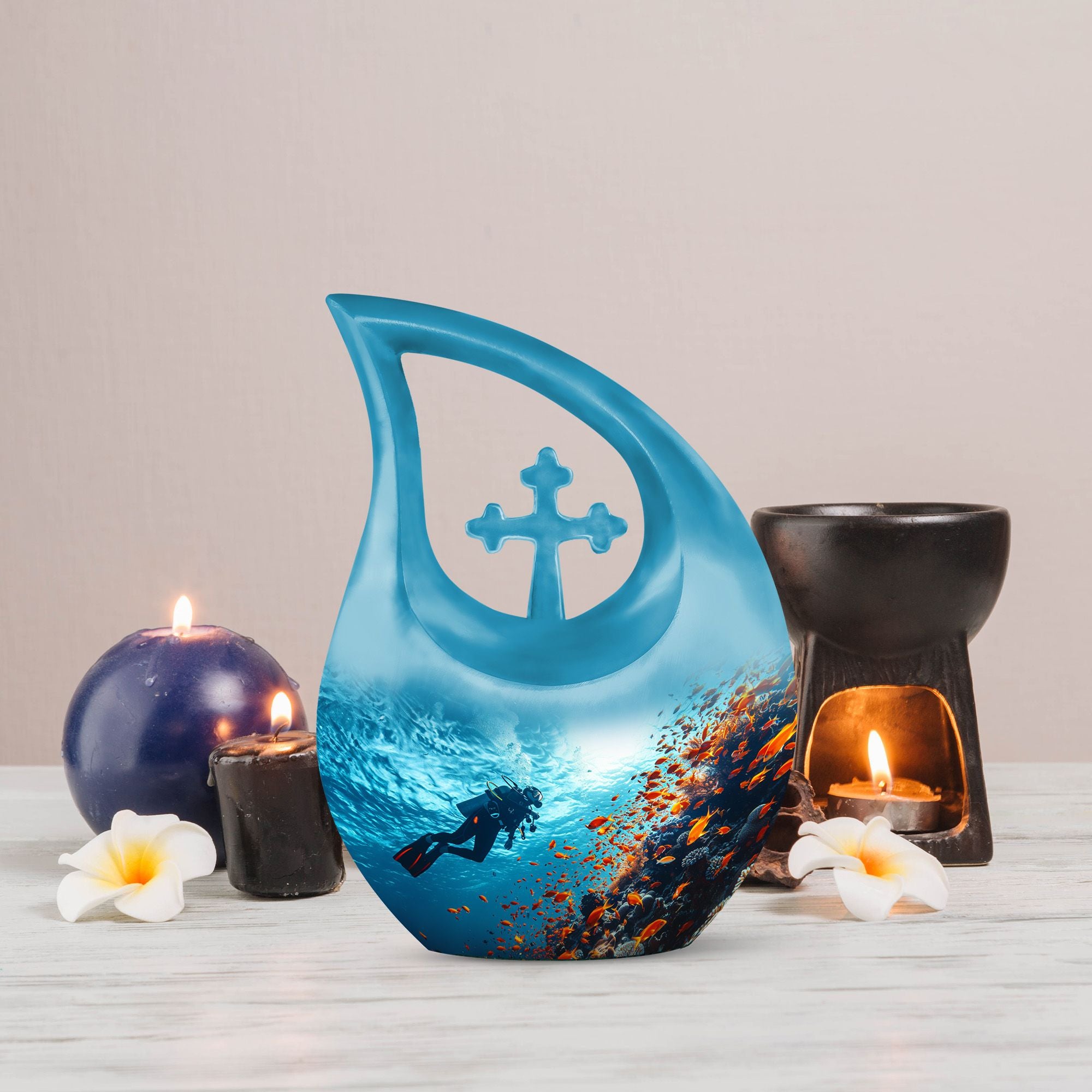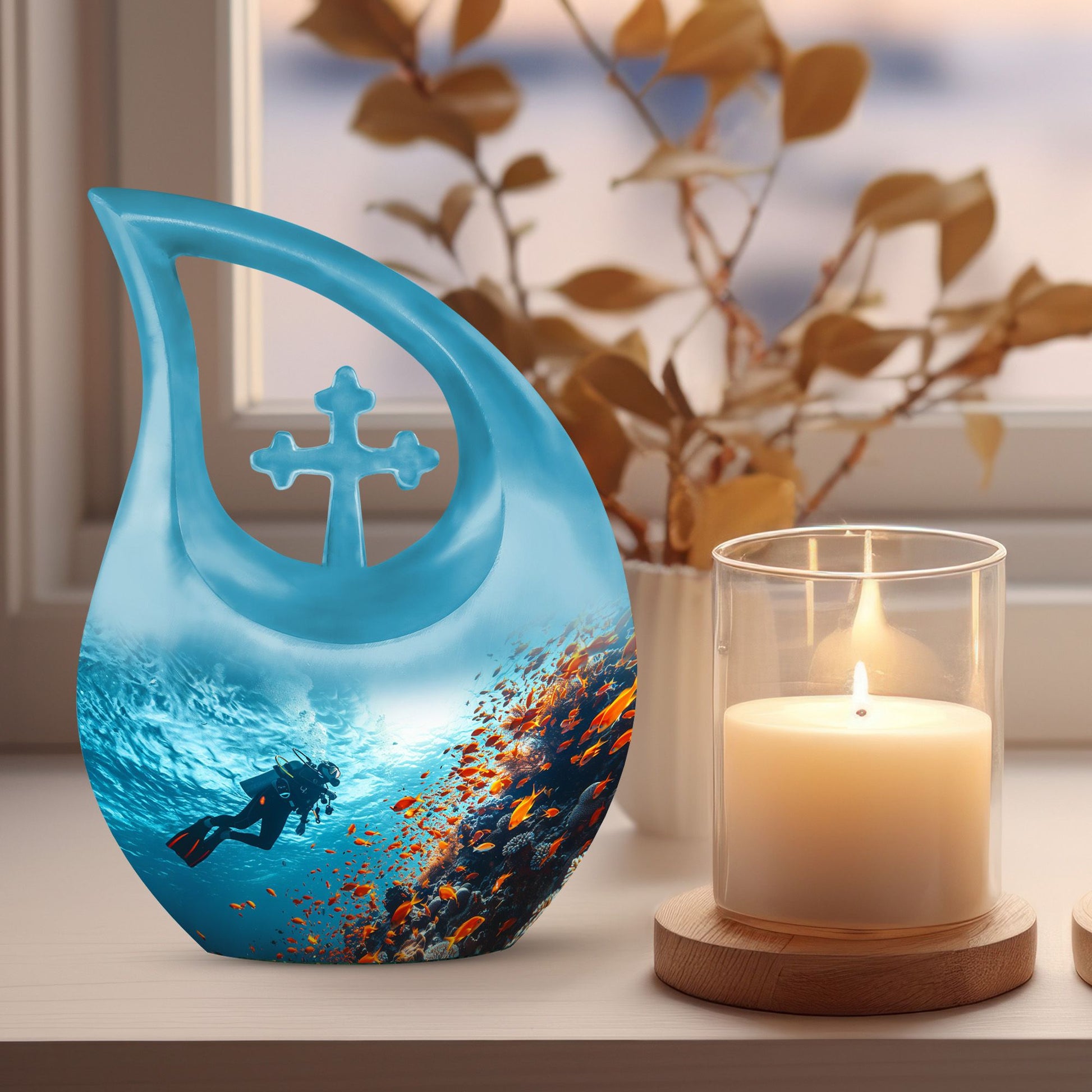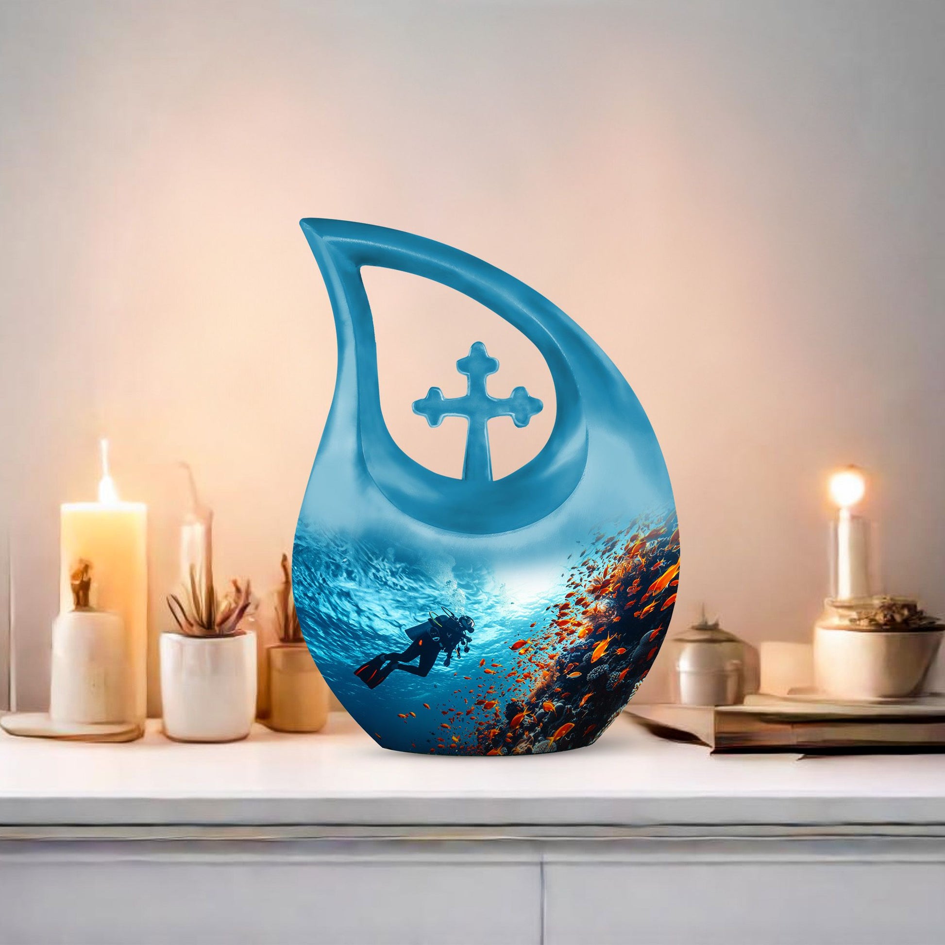 Crafted with care, this cremation urn features high-quality materials and intricate detailing that captures the spirit of the sea. Its durable construction ensures longevity while its artistic scuba diver theme adds a personal touch. Suitable as cremation urns for adult ashes women or adult urns for men & women, it balances elegance with meaningful design.