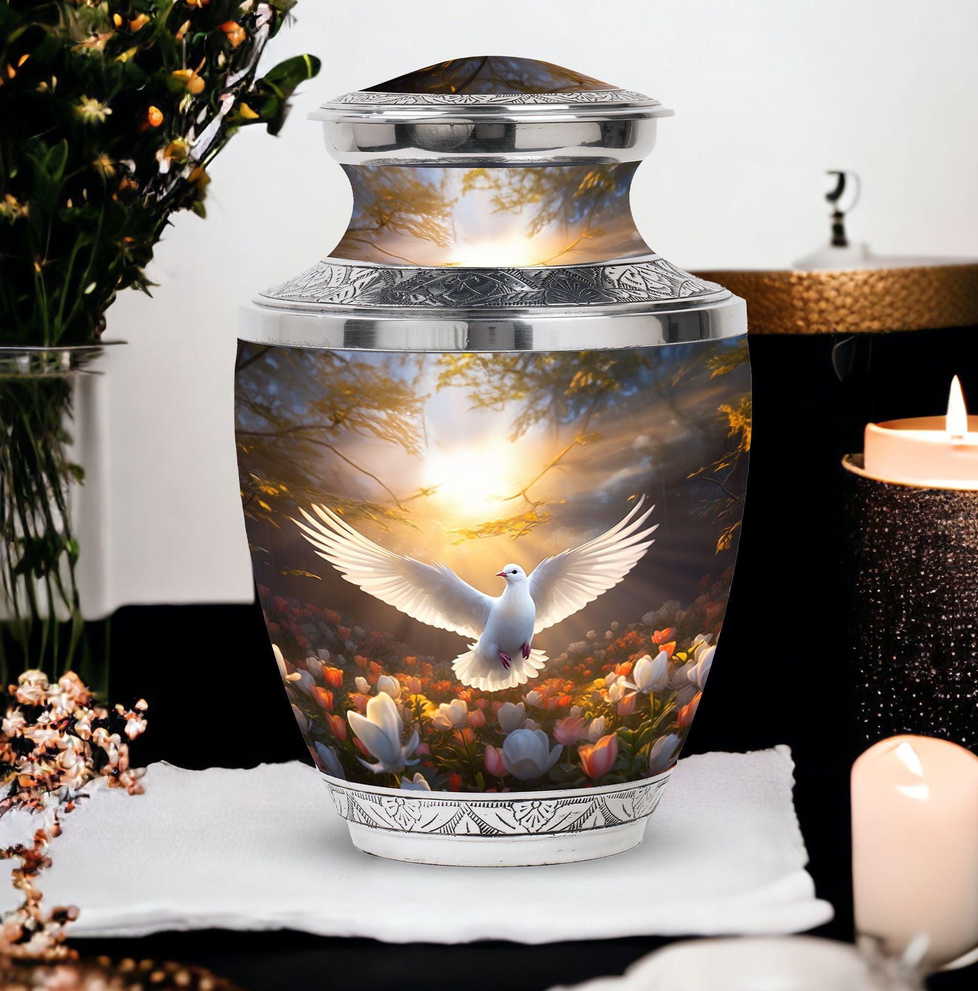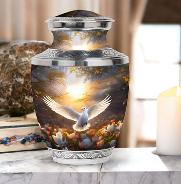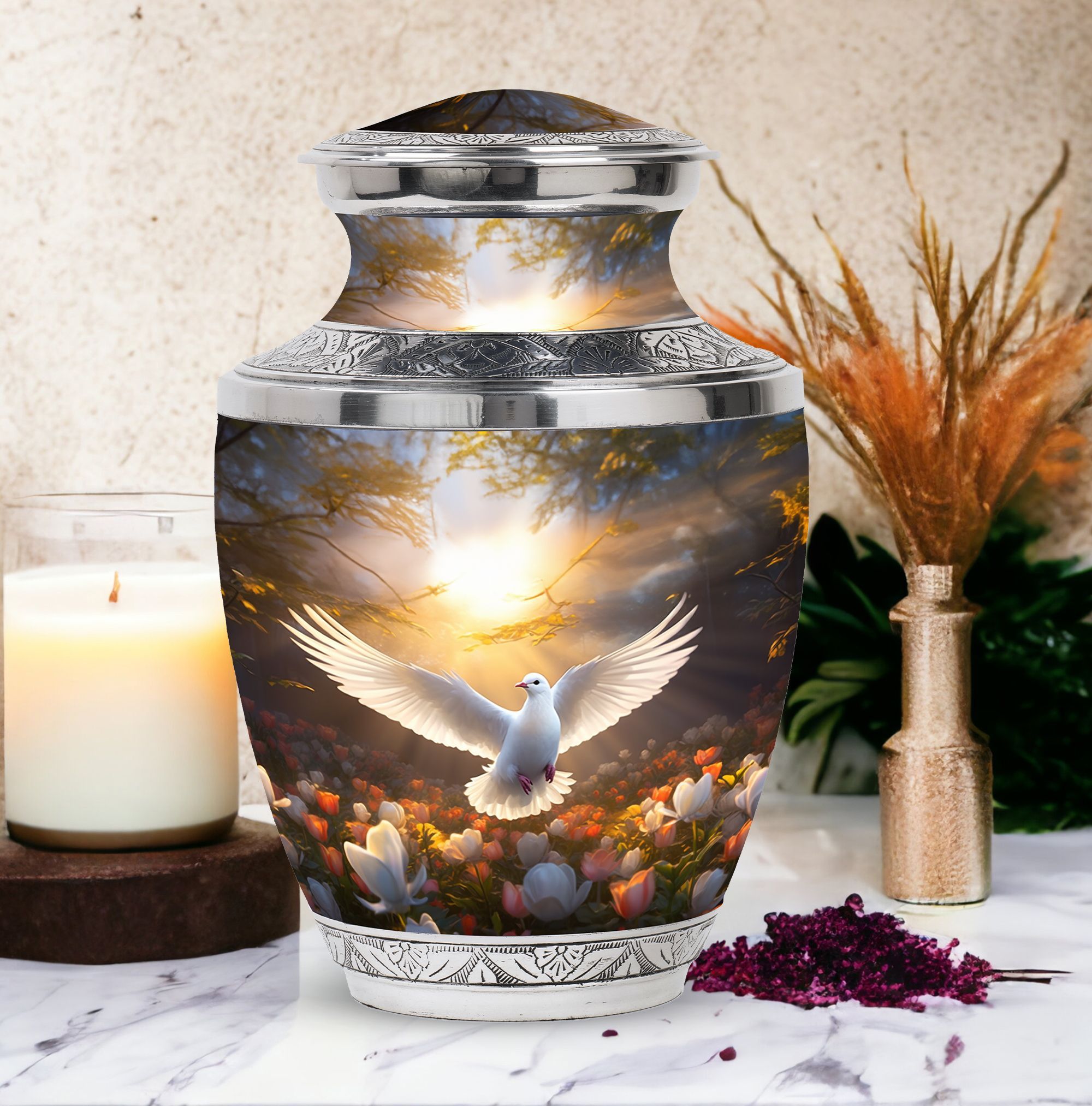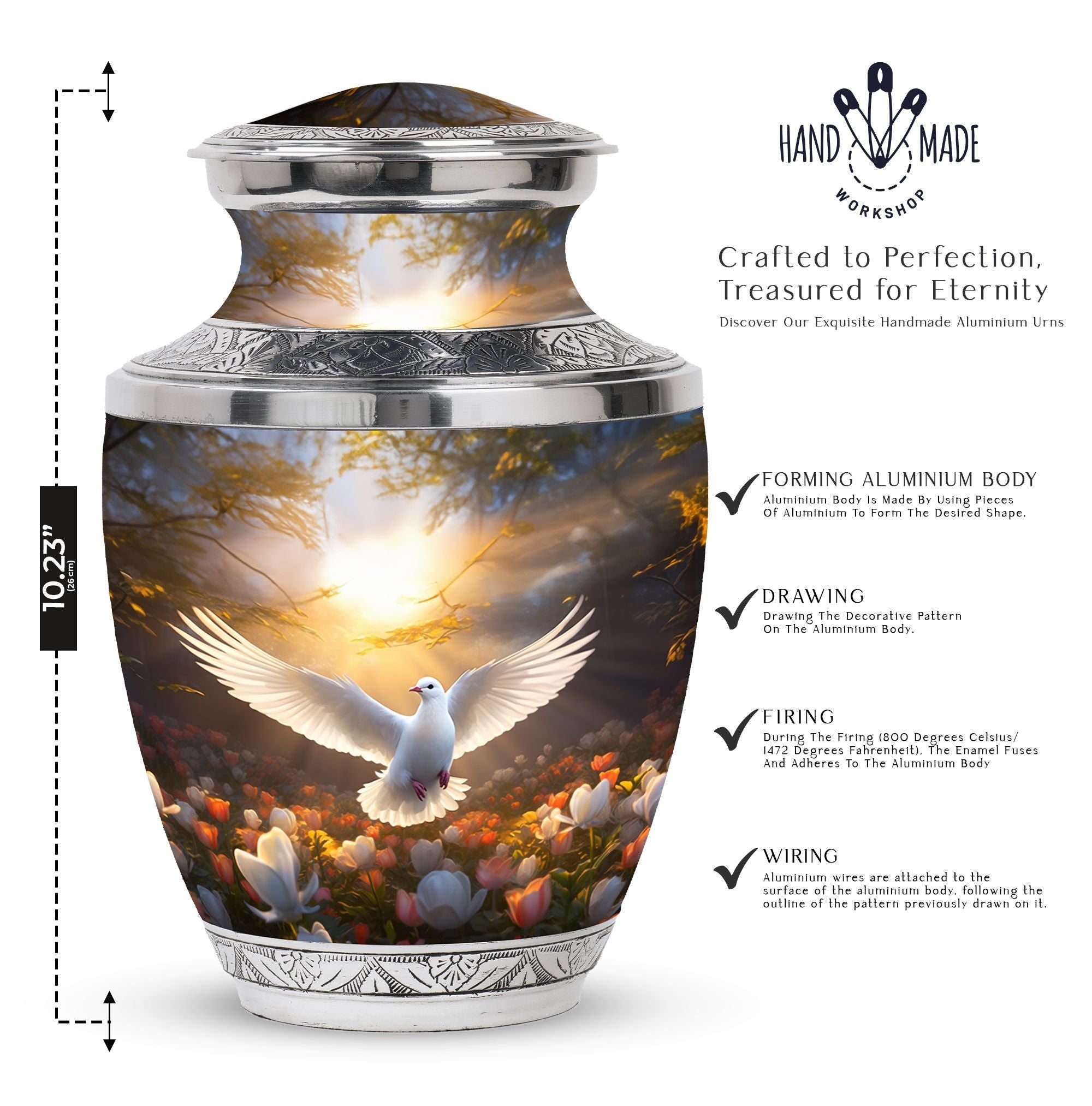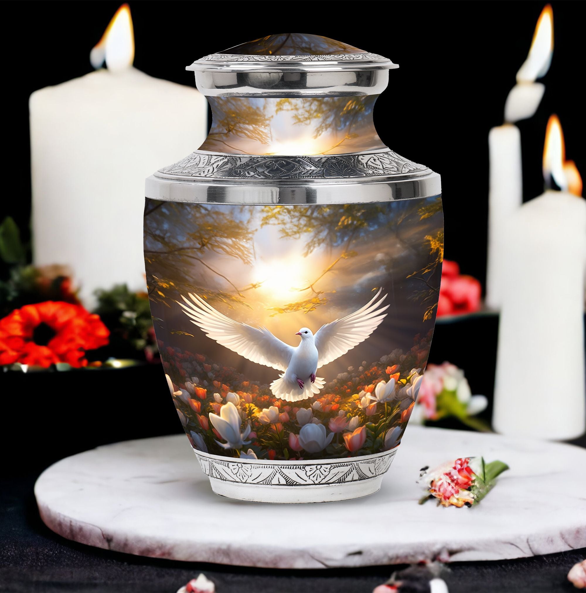 Light this Dove Memorial Urn on your mantle, exuding a comforting reflection of your cherished one. Crafted meticulously from resilient aluminium, this large urn gravitates with a classic style, honouring the spirit of your beloved. Its handsomely designed form is not only visually attractive, but also of considerable capacity, holding up to 200 cubic inches of ashes. Standing tall at 10 inches and weighing 3.3 pounds, this cremation urn is an embodiment of subtleness yet strong endurance. It comes along with a plush velvet pouch, ensuring the respectful containment of your dear one's mortal remains. Offering you to personalize it with engraved names, the urn gently tugs at the heartstrings reminding of the everlasting bond. Fitting for those final partings, it is an exceptional choice for human ashes. A beautiful remembrance, this urn delivers solace during those moments of 'sorry for your loss'.