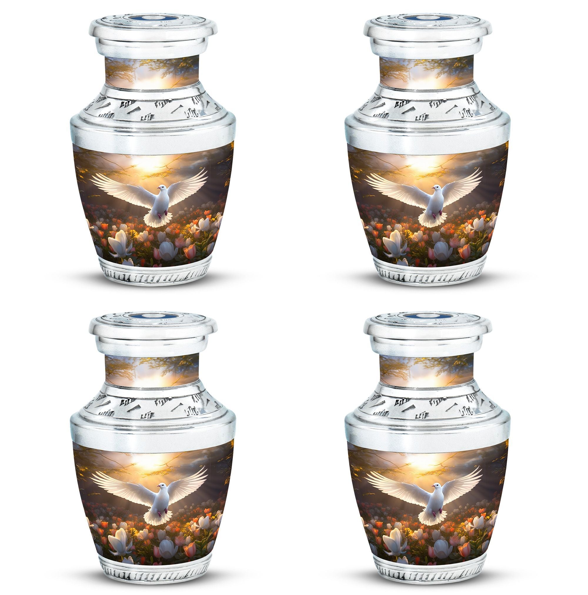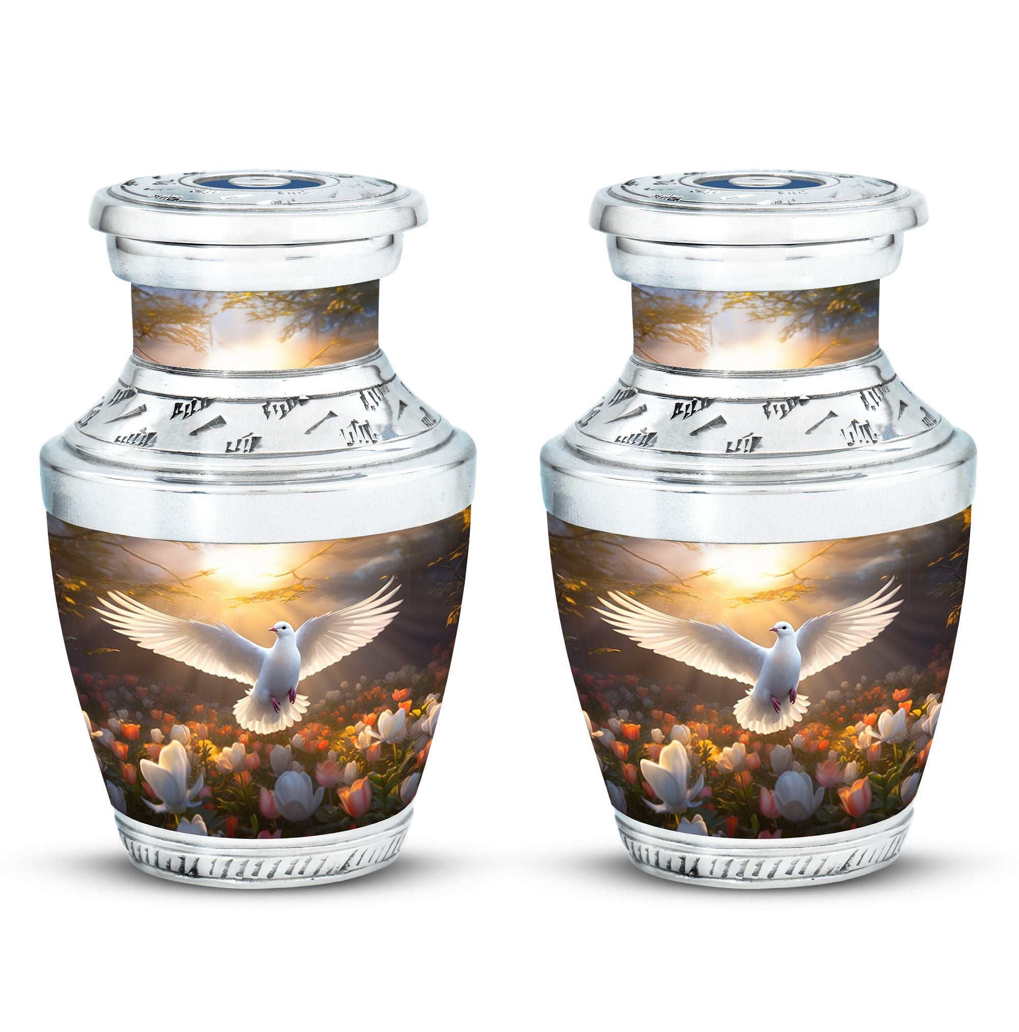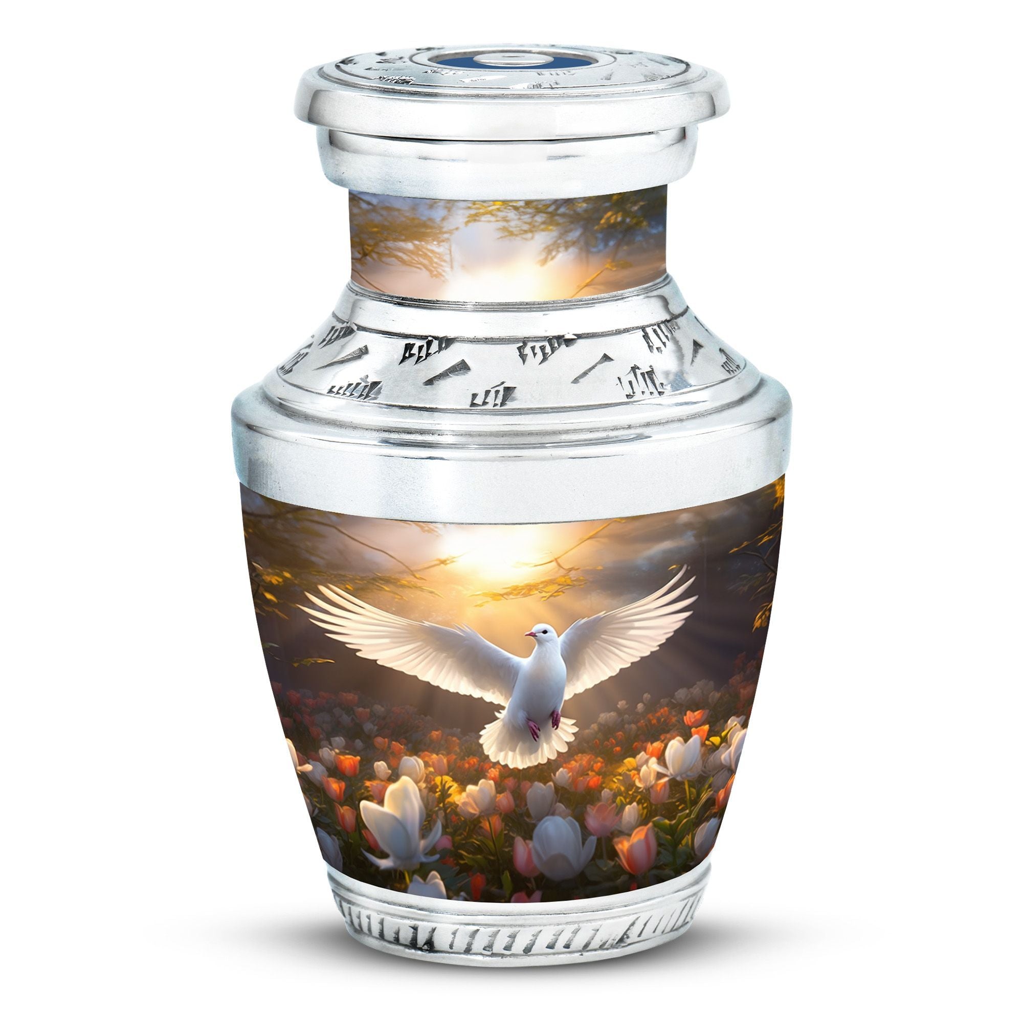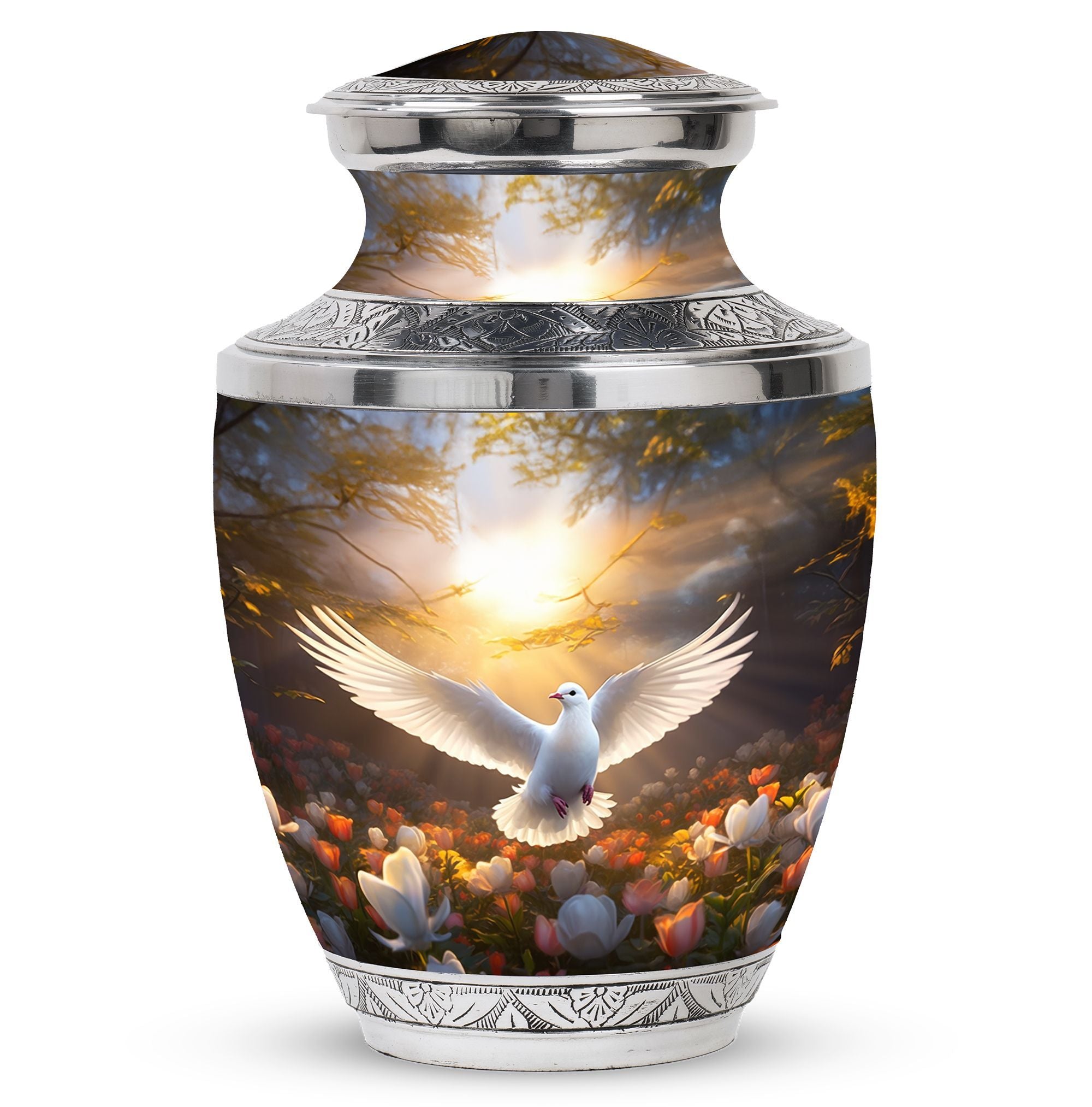 Light this Dove Memorial Urn on your mantle, exuding a comforting reflection of your cherished one. Crafted meticulously from resilient aluminium, this large urn gravitates with a classic style, honouring the spirit of your beloved. Its handsomely designed form is not only visually attractive, but also of considerable capacity, holding up to 200 cubic inches of ashes. Standing tall at 10 inches and weighing 3.3 pounds, this cremation urn is an embodiment of subtleness yet strong endurance. It comes along with a plush velvet pouch, ensuring the respectful containment of your dear one's mortal remains. Offering you to personalize it with engraved names, the urn gently tugs at the heartstrings reminding of the everlasting bond. Fitting for those final partings, it is an exceptional choice for human ashes. A beautiful remembrance, this urn delivers solace during those moments of 'sorry for your loss'.