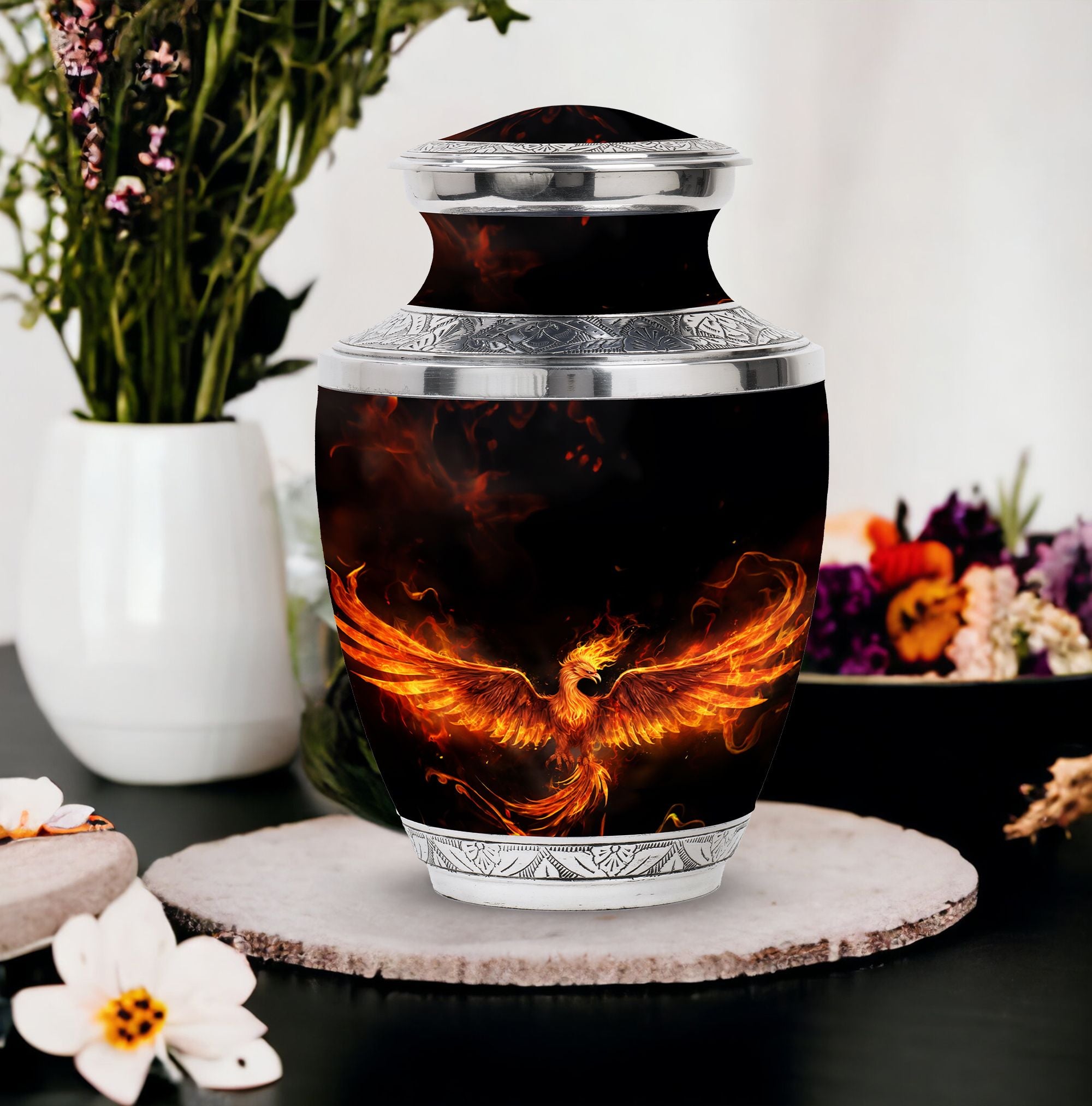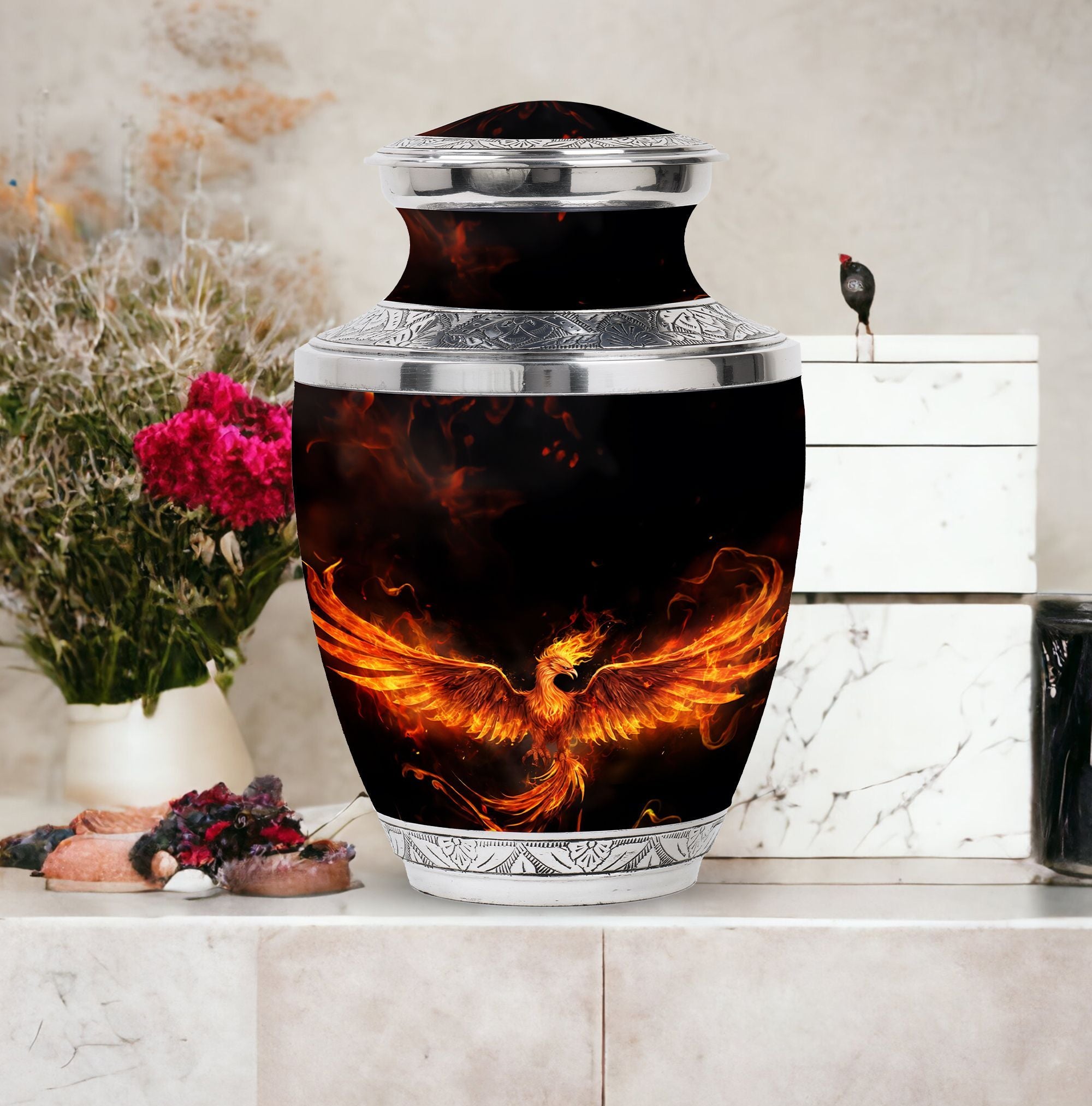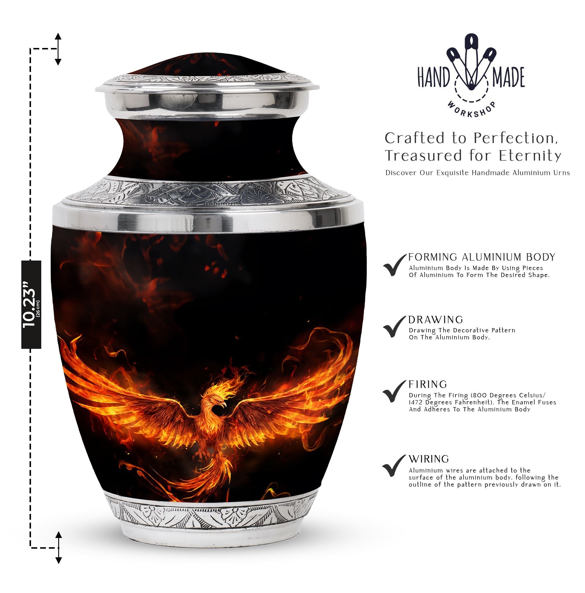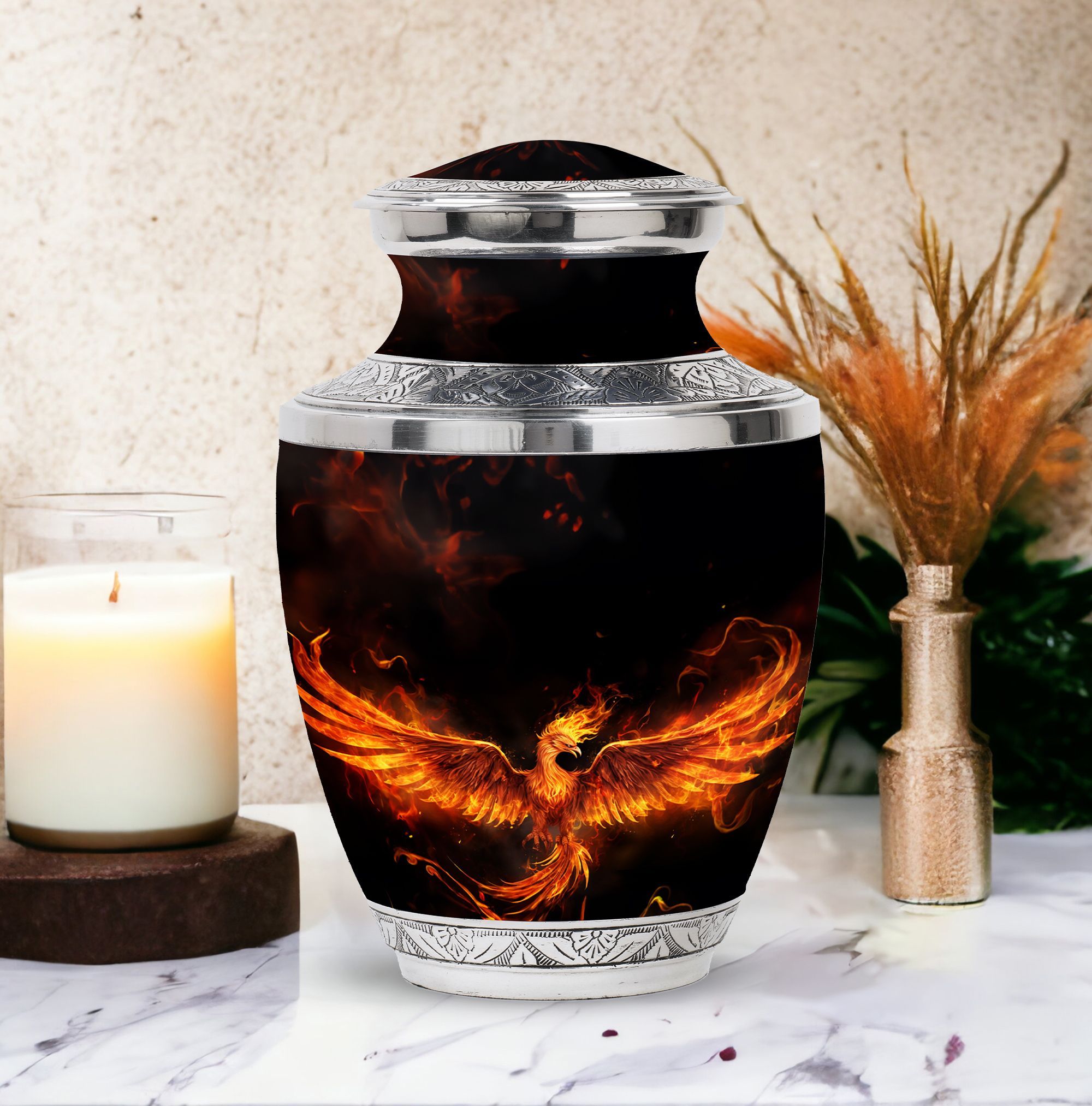 Honor your beloved with our timeless 'Fire Phoenix Memorial Urn'. Crafted from durable aluminium and sized at a comfortable 3 inches, markings are to blend flawlessly with any decor. This large urn weighs 3.3 pounds and stands tall at 10 inches in height. It is designed to hold approximately 200 cubic inches of cremated remains, the overall volume a conventional adult can hold. Each urn comes with a soft velvet pouch for the containment and protection of ashes. Add a personal touch to your memorial urn with the option of engraving names for a lasting tribute. This stirring Fire Phoenix Memorial Urn is more than a funeral product; it is a commemoration of a life lived. Our urns transform a simple vessel to hold ashes into a beautiful piece of art.