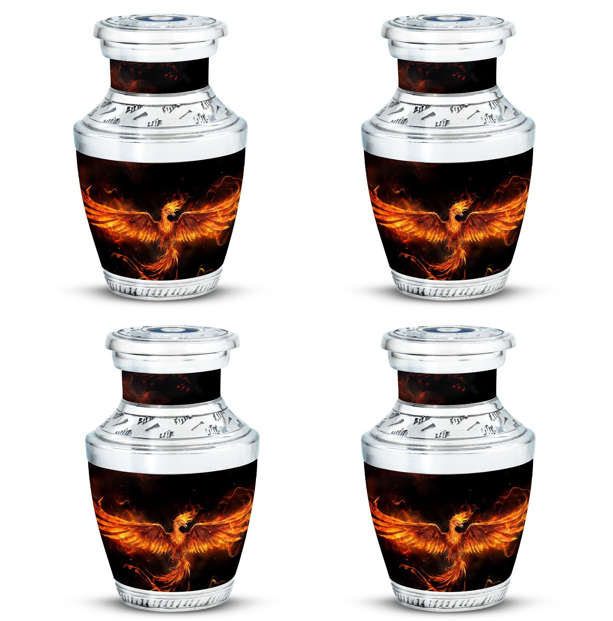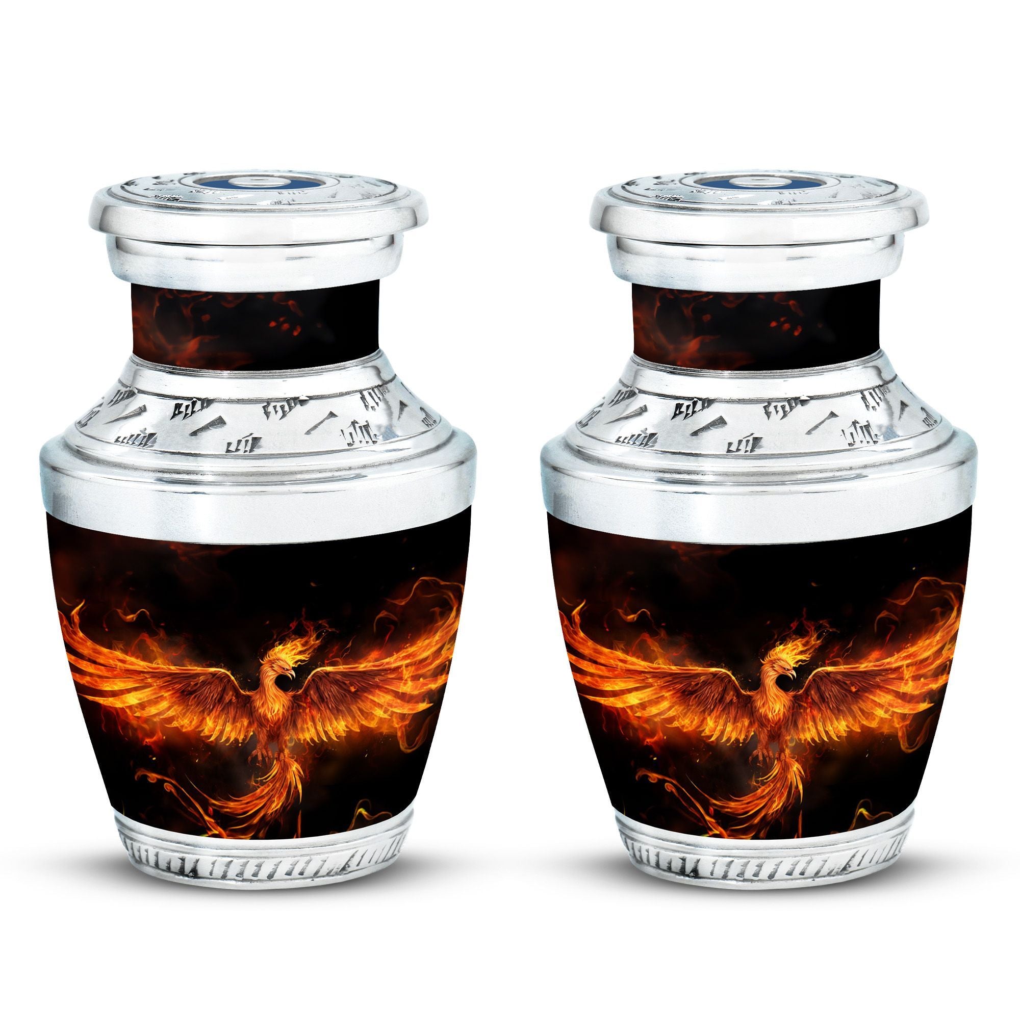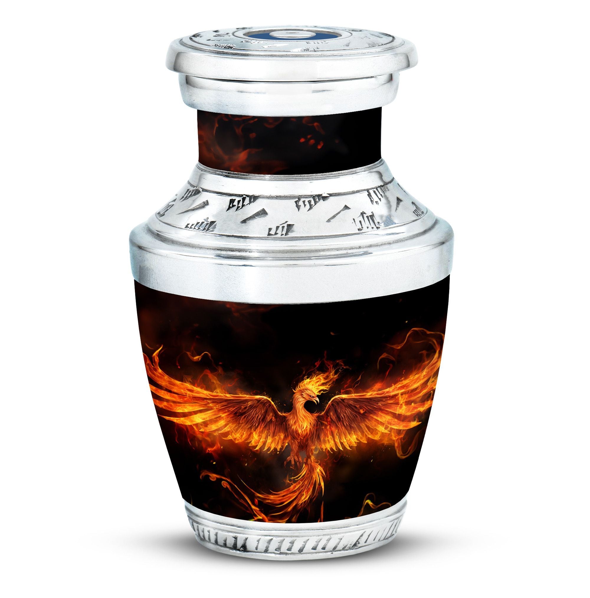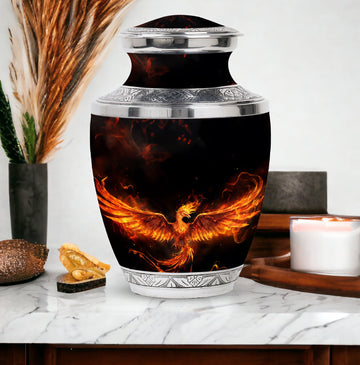Honor your beloved with our timeless 'Fire Phoenix Memorial Urn'. Crafted from durable aluminium and sized at a comfortable 3 inches, markings are to blend flawlessly with any decor. This large urn weighs 3.3 pounds and stands tall at 10 inches in height. It is designed to hold approximately 200 cubic inches of cremated remains, the overall volume a conventional adult can hold. Each urn comes with a soft velvet pouch for the containment and protection of ashes. Add a personal touch to your memorial urn with the option of engraving names for a lasting tribute. This stirring Fire Phoenix Memorial Urn is more than a funeral product; it is a commemoration of a life lived. Our urns transform a simple vessel to hold ashes into a beautiful piece of art.