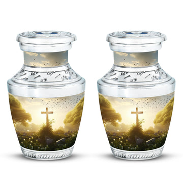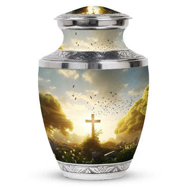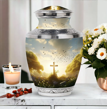 Honor your departed loved ones with a dignified lasting memory when you choose this Holy Cross Cremation Urn. Named for its Large Urns classification, it symbolizes a heartfelt goodbye that acknowledges a loved one's eternal spiritual journey. This 'Modern Urn' exhibits a sturdy build, having a solid weight of 3.3 pounds and standing at 10 inches in height. Crafted meticulously from strong Aluminium, the urn’s 200 cubic inch capacity can hold human ashes, making it practical and versatile for your need. To ensure the sacred keepsake remains secure, we include a velvet pouch for containment of ashes. Add an emotionally meaningful touch by personalizing this Classic Urn with engraved names. Lend a serene, timeless aura to your memorial ceremonies with this unique, Personalised Urn. This Modern Cremation Urn is an eloquent tribute to celebrate your loved one's life and cherished memories.