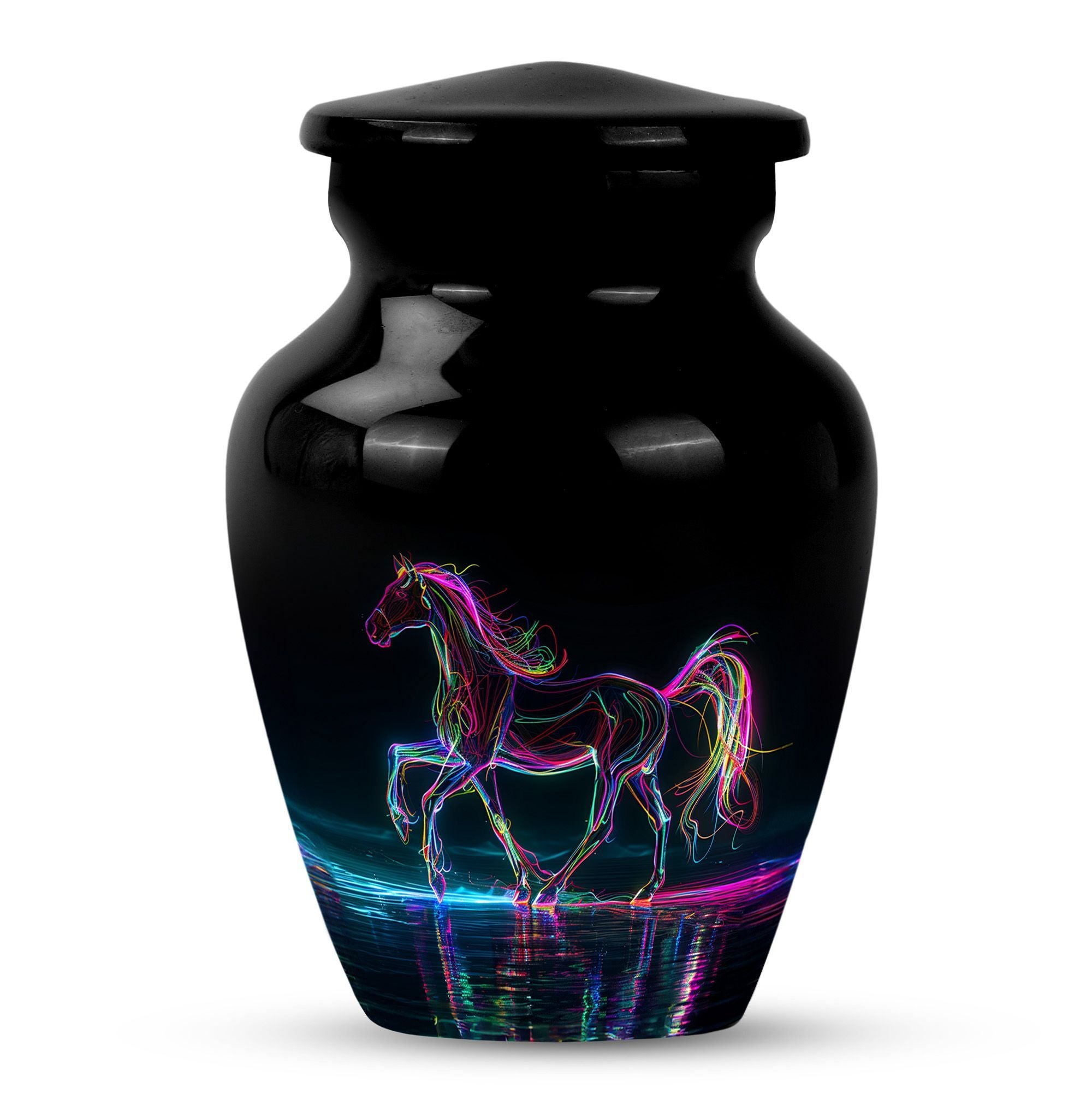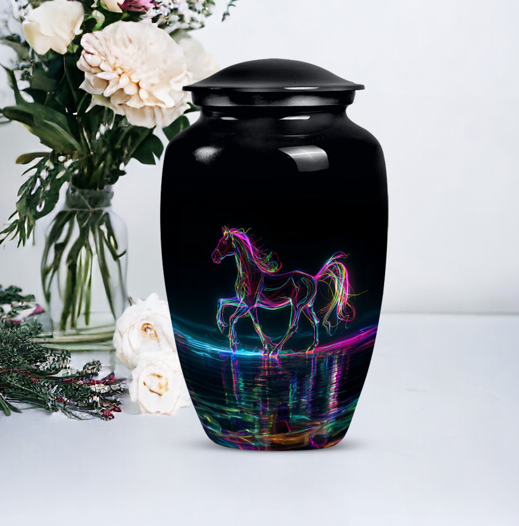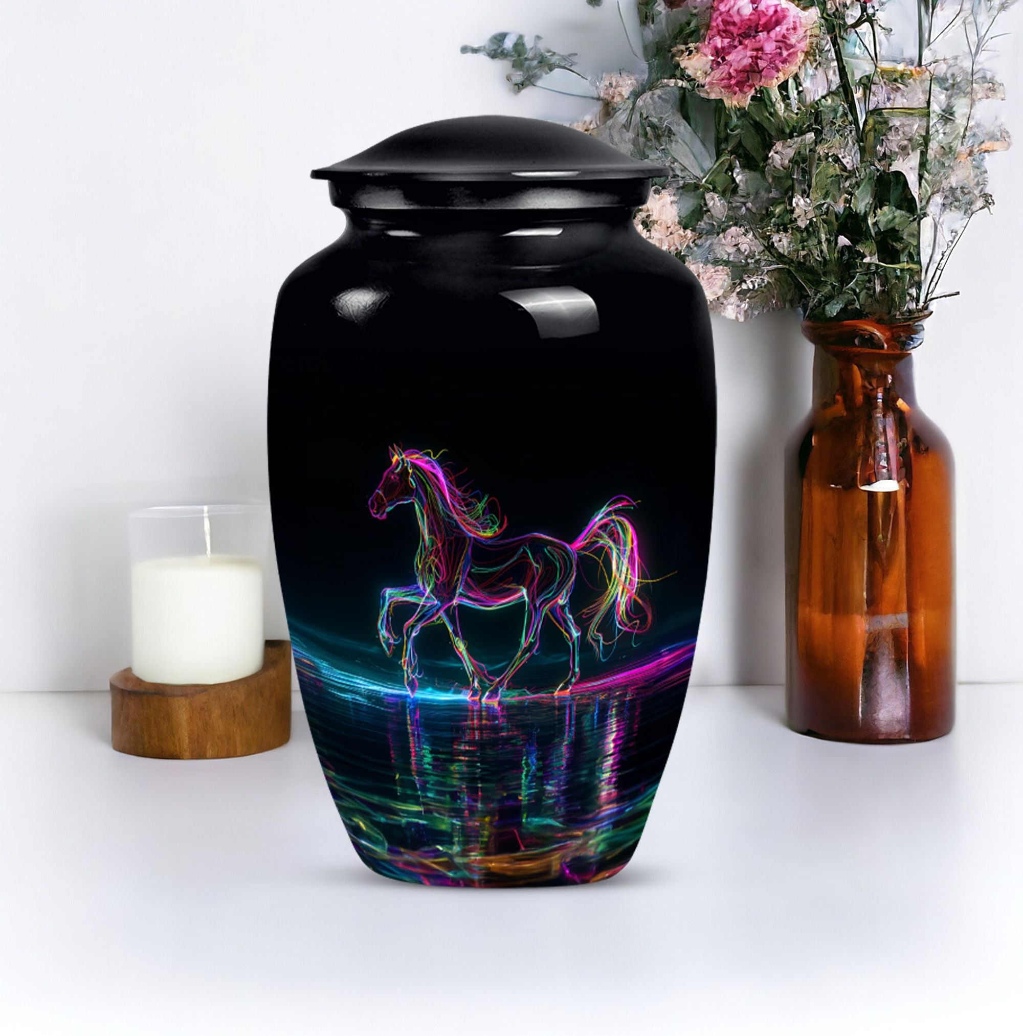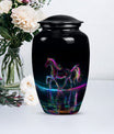 Presenting a uniquely crafted Horse Urn for the ones beloved. This specially designed classic urn, measuring 10 inches in stature and weighing just 3.3 pounds, is the epitome of elegance and thoughtfulness. It's constructed with durable aluminium, ensuring long-lasting resilience. The urn offers a substantial capacity of 200 cubic inches, ample space to hold the ashes of an adult male. Going beyond its practical aspect, this cherished keepsake is graced with an intriguing abstract theme. Making this urn even more special is the offering of personalized engraving, allowing for intimate customization. With purchase, you'll also receive a plush velvet pouch perfect for the containment of the ashes. This Horse Urn is an adored choic within the categories of 'Burial medium size urns', 'urn human ash cremation urn', and 'funeral urns for adult ashes women'. Honor your loved one with this beautifully designed, large-size cremation urn.