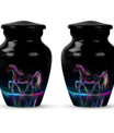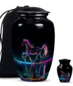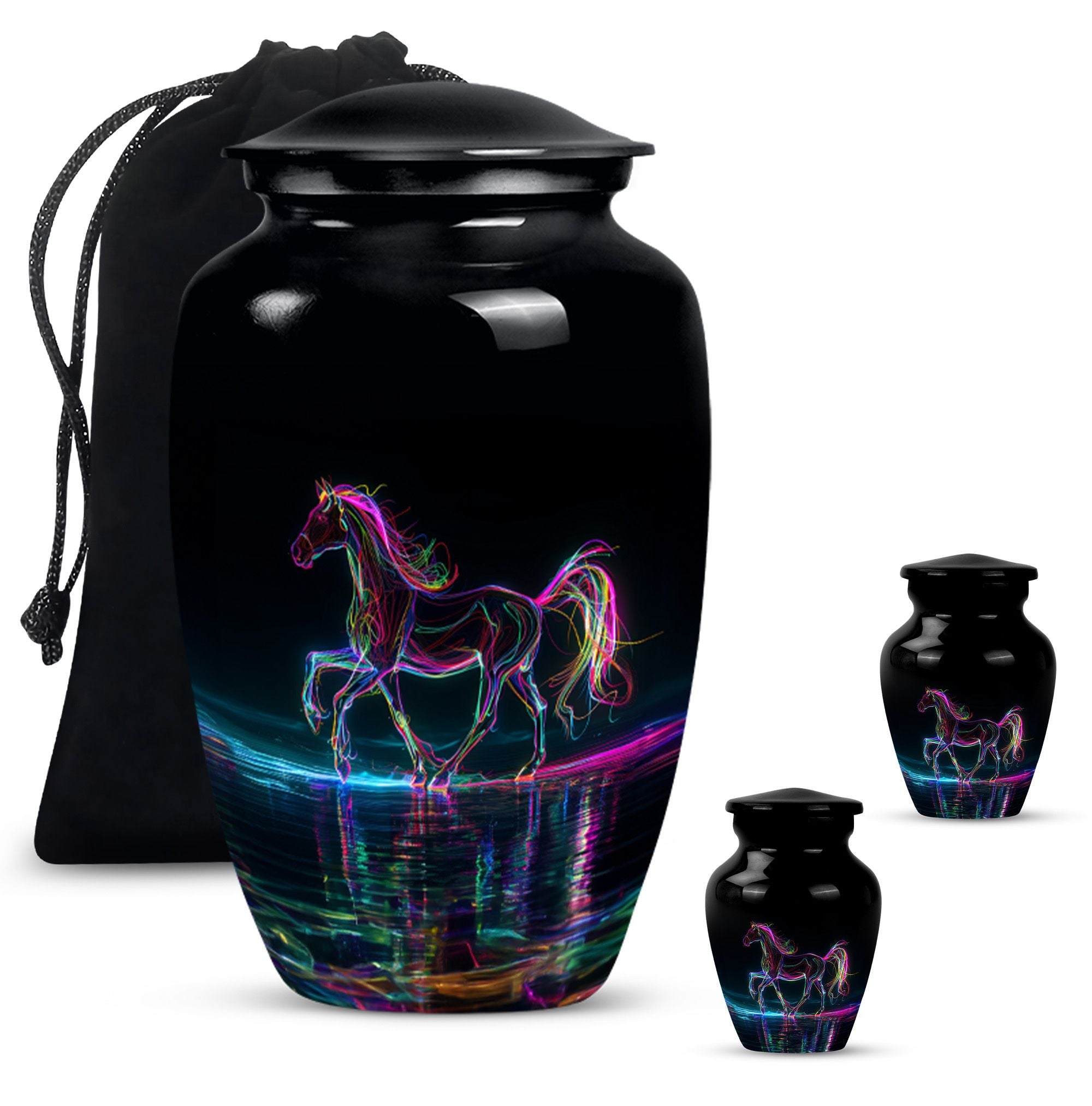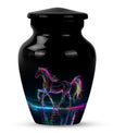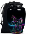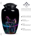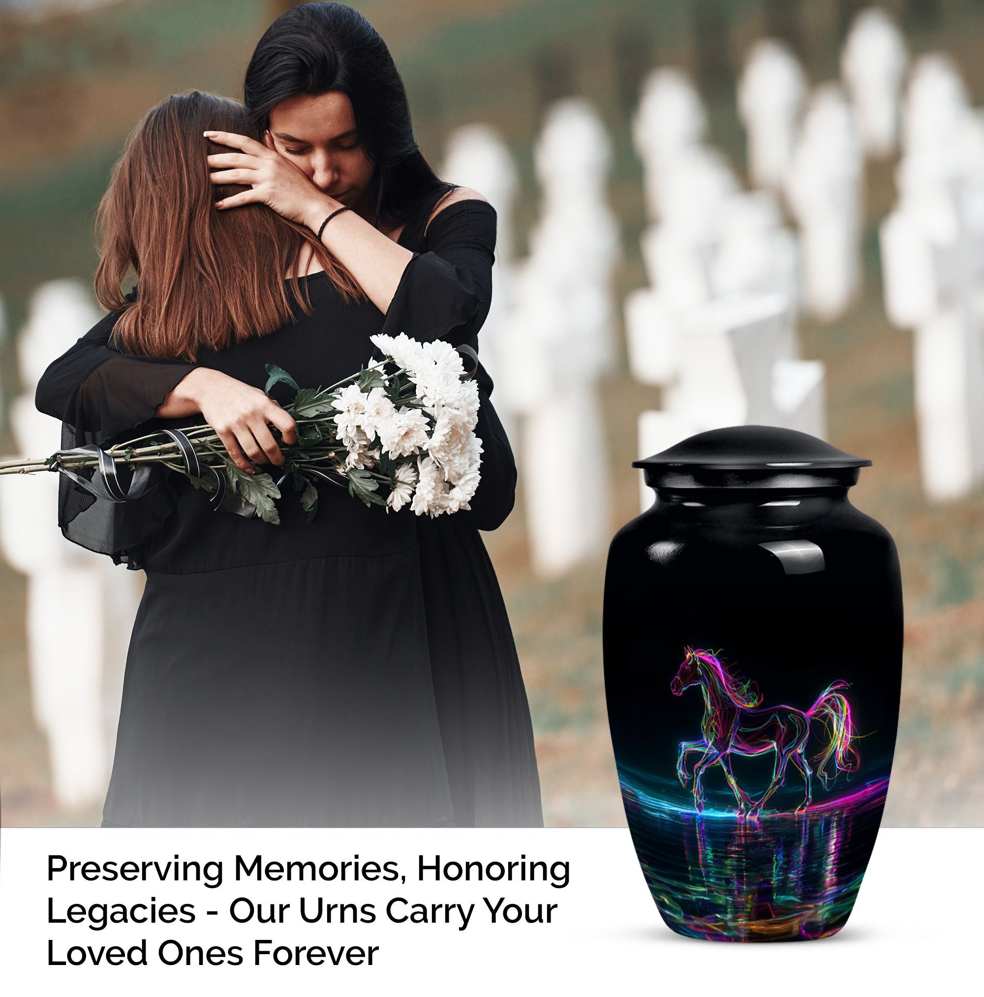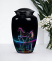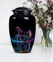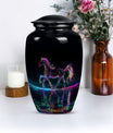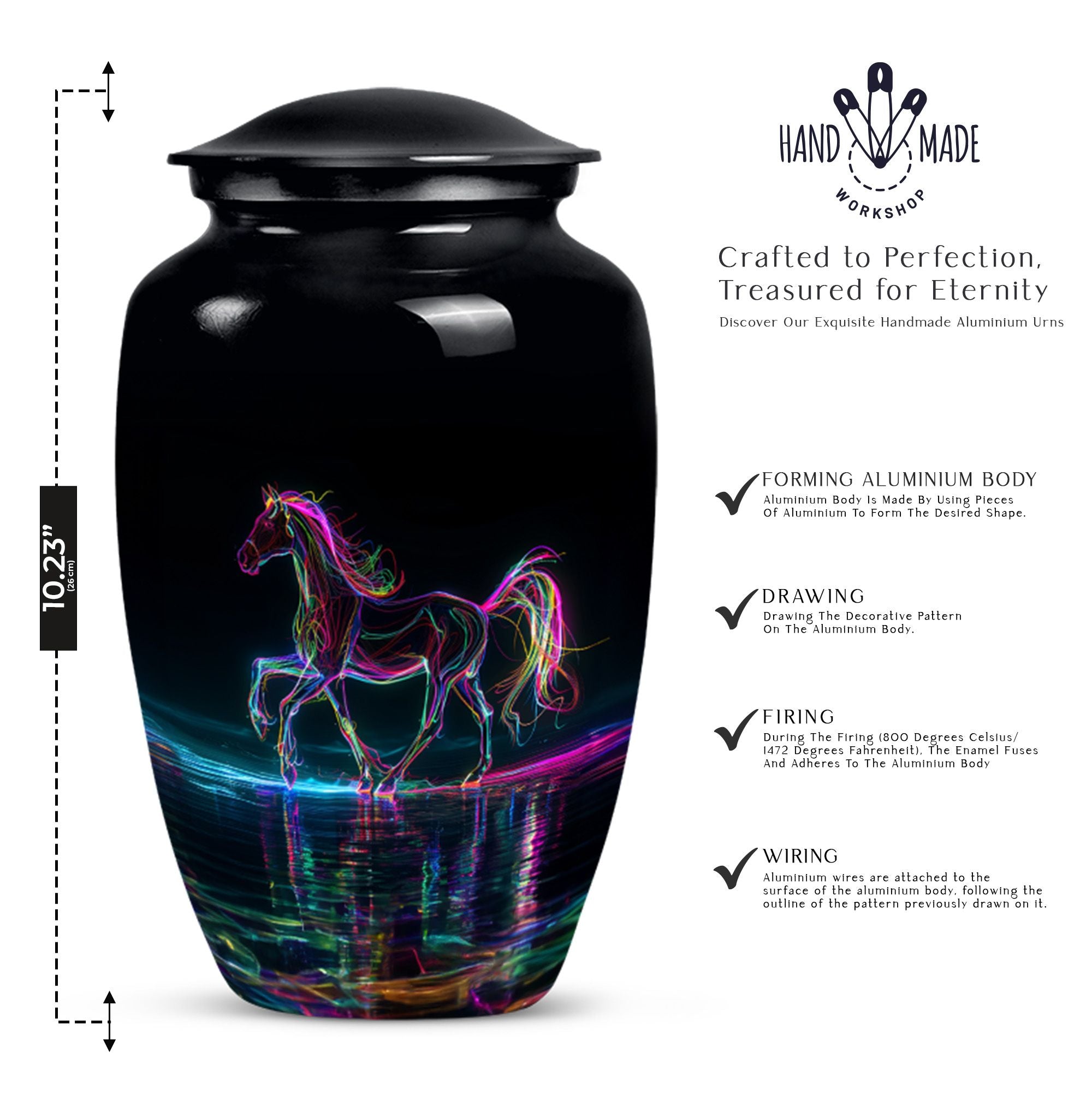 Presenting a uniquely crafted Horse Urn for the ones beloved. This specially designed classic urn, measuring 10 inches in stature and weighing just 3.3 pounds, is the epitome of elegance and thoughtfulness. It's constructed with durable aluminium, ensuring long-lasting resilience. The urn offers a substantial capacity of 200 cubic inches, ample space to hold the ashes of an adult male. Going beyond its practical aspect, this cherished keepsake is graced with an intriguing abstract theme. Making this urn even more special is the offering of personalized engraving, allowing for intimate customization. With purchase, you'll also receive a plush velvet pouch perfect for the containment of the ashes. This Horse Urn is an adored choic within the categories of 'Burial medium size urns', 'urn human ash cremation urn', and 'funeral urns for adult ashes women'. Honor your loved one with this beautifully designed, large-size cremation urn.