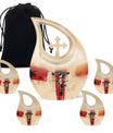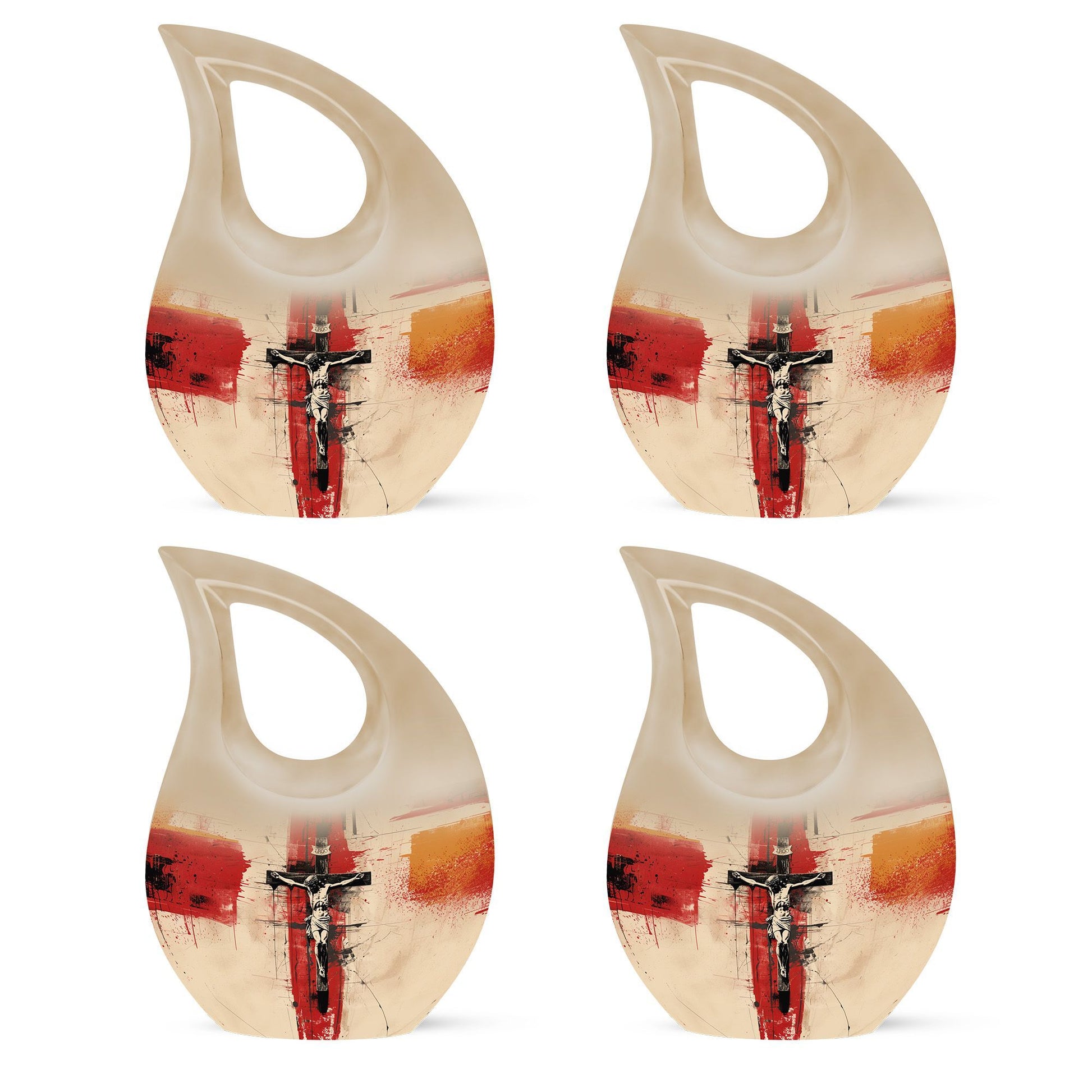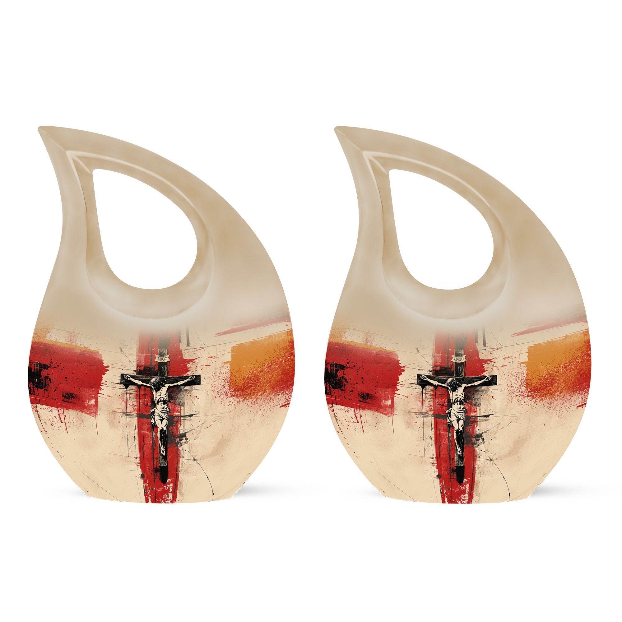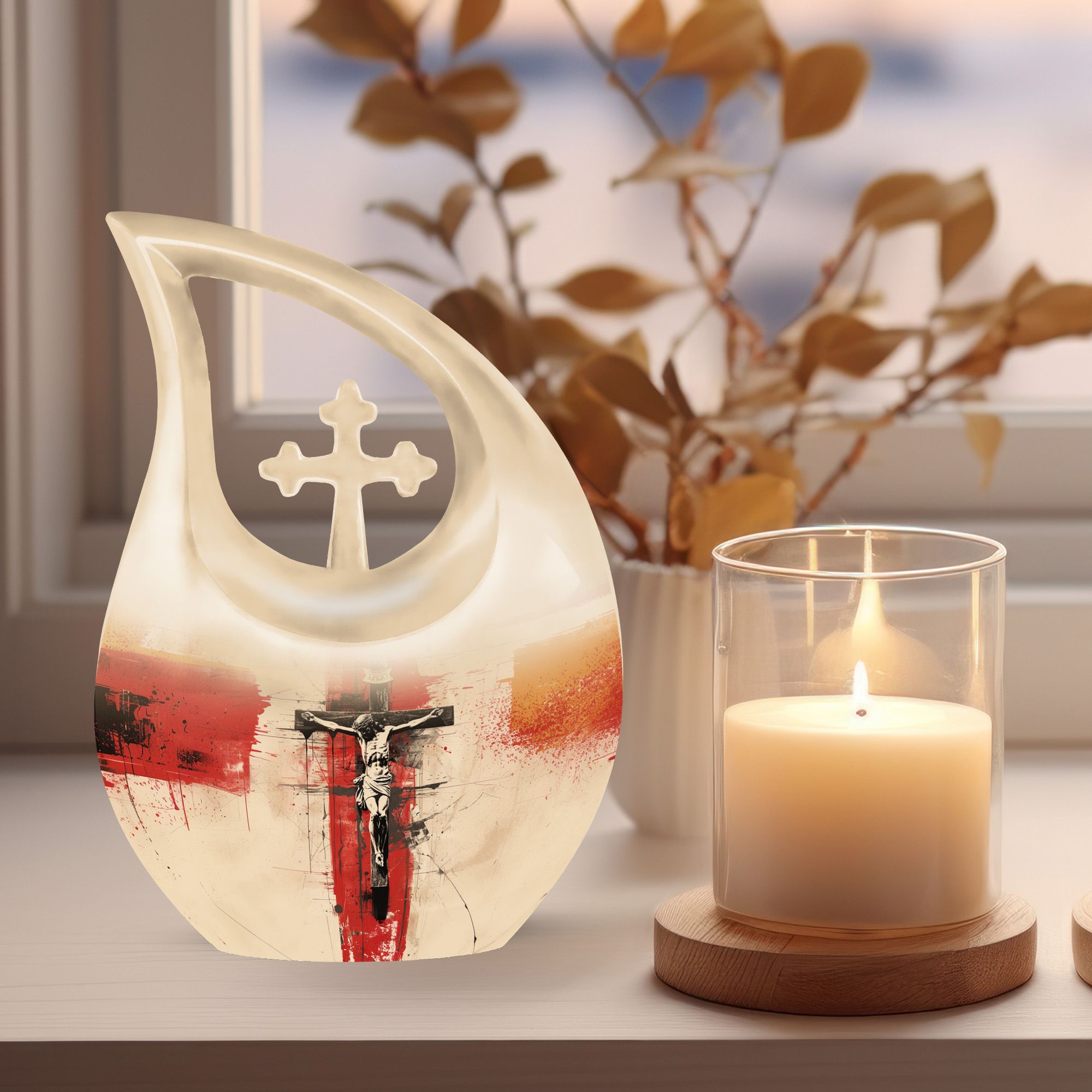 Dignified and elegant, this 10-inch Jesus Urn is characterized by its unique Cross Drop shape. Crafted from high-quality aluminium, it is lightweight yet sturdy, tipping the scales at 3.3 pounds. Despite its size, it can comfortably hold up to 200 cubic inches of ashes. Encompassing the essence of remembrance, this large urn is designed to serve as a beautiful, visual tribute to your beloved, attaining a blend of reverence and affordability characteristic of cremation urns. This piece also offers the potential for customization, enabling you to etch names onto its surface, thereby turning it into an object of personal reverence. Coming along with a velvet pouch, it ensures safe containment of the ashes. This urn has been created with seniors and adults in mind, looking for a fitting way to memorialize their departed. These affordable urns are not just containers for ashes, but silent narrators of a beautiful life lived. Perfect for those searching for 'Cheap Funeral Urns' or 'Urns For Sale', this superior piece combines dignity with affordability. Purchase it today and let the legacy live on.