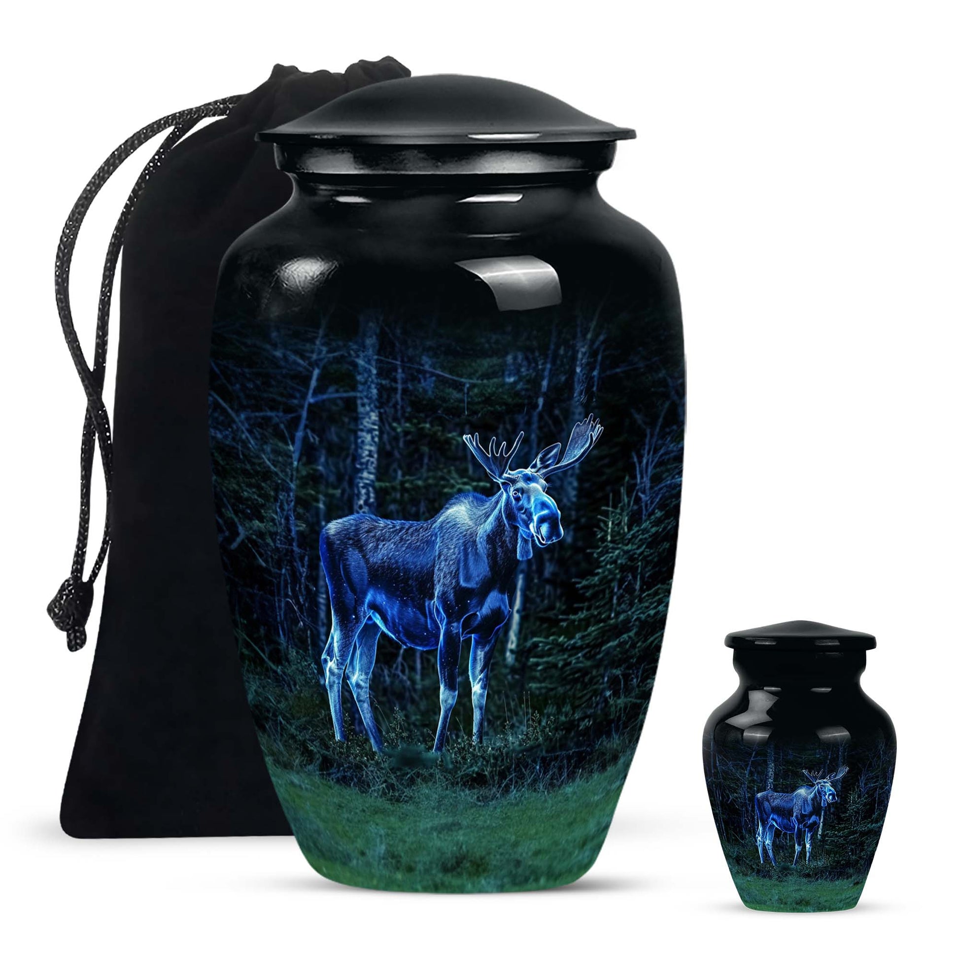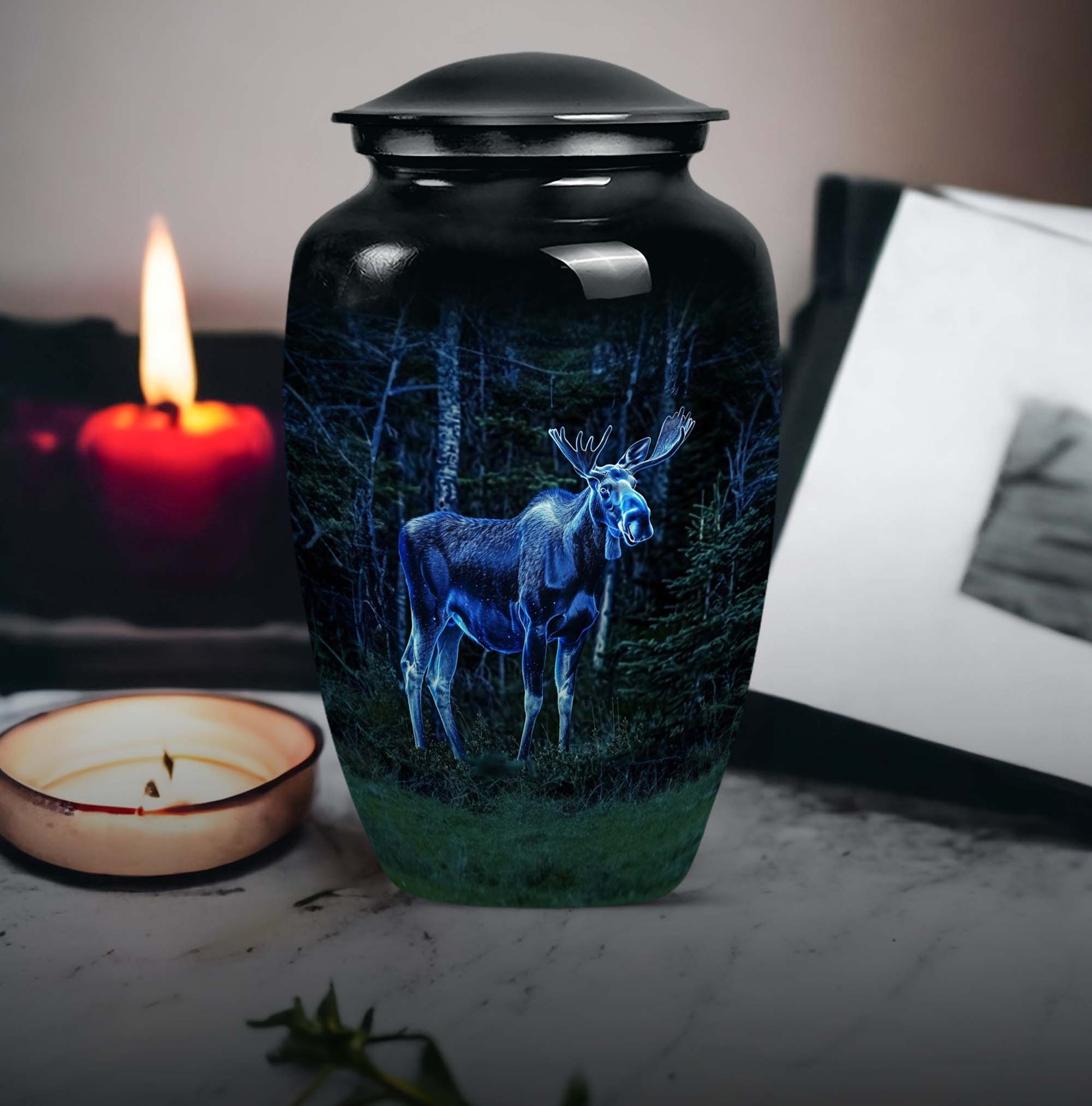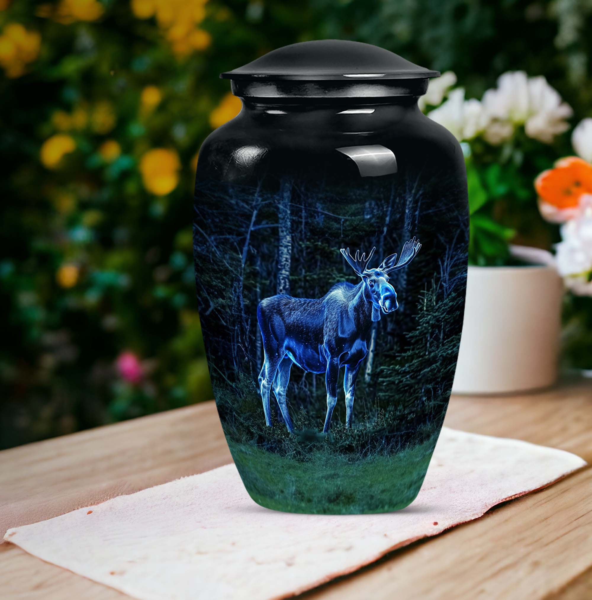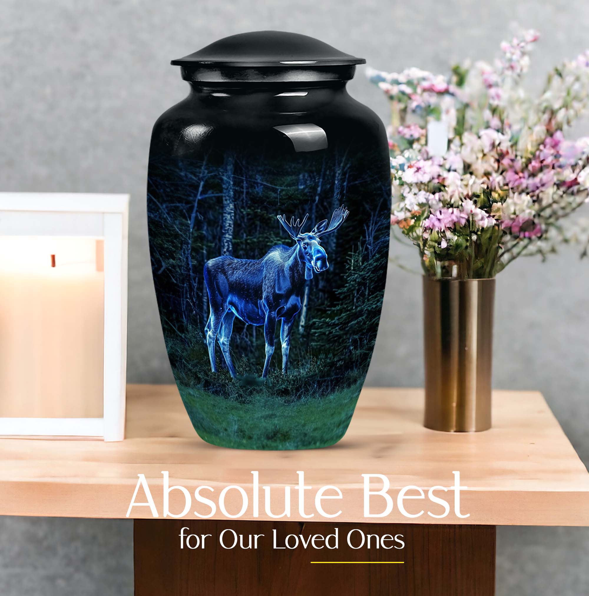 Looking to pay tribute to a cherished one with a unique touch? Discover our Moose Walking Urn, an exquisite and substantial memorial urn to honor your loved one's life journey. Composed of high-quality aluminium, this funeral urn for burial is intricately designed to embody abstract themes in a sophisticated 10-inch classic urn format. The large urn weighs a sturdy 3.3 pounds, signifying the heaviness of remembrance and unshakeable love. Designed to accommodate up to 200 cubic inches of cremains, this memorial powerfully symbolizes the spirit of your departed loved one. With an added option to personalize with engraved names, it enables an intimate connection with the essence they left behind. The urn arrives with a plush velvet pouch, ensuring containment of ashes is done with respect and dignity. Recommended keywords for search might include 'cremation urn for dad', 'urn human adult urns', and 'adult burial cremation urns'. This elegantly-crafted urn encapsulates the timeless bond between you and your beloved, serving as a beacon of their life and love.