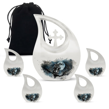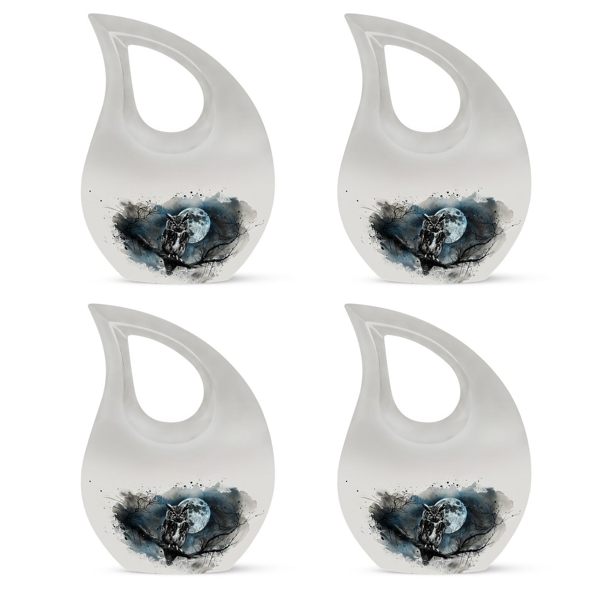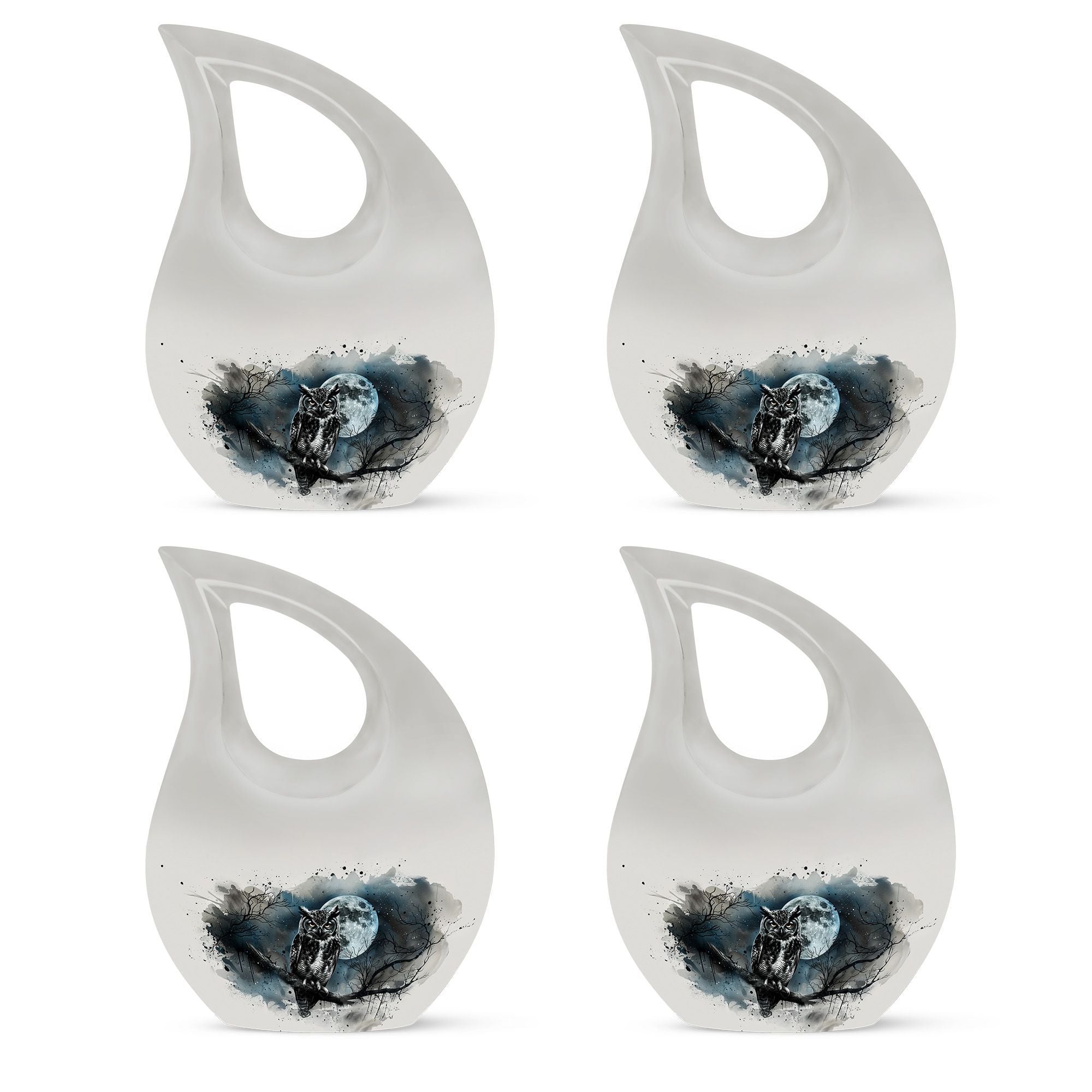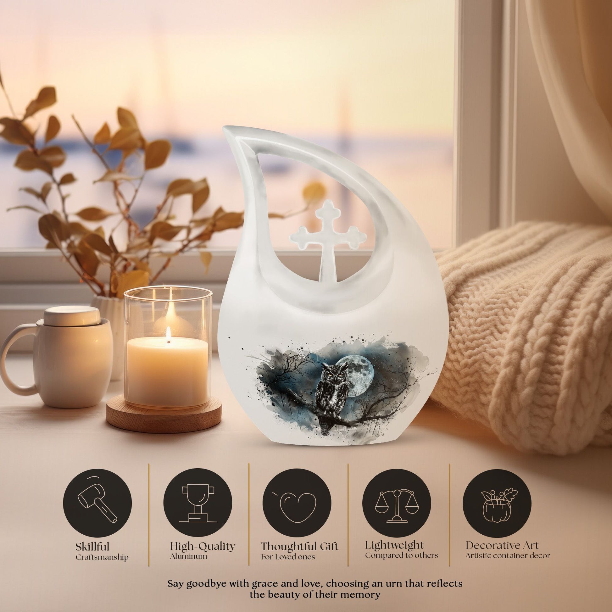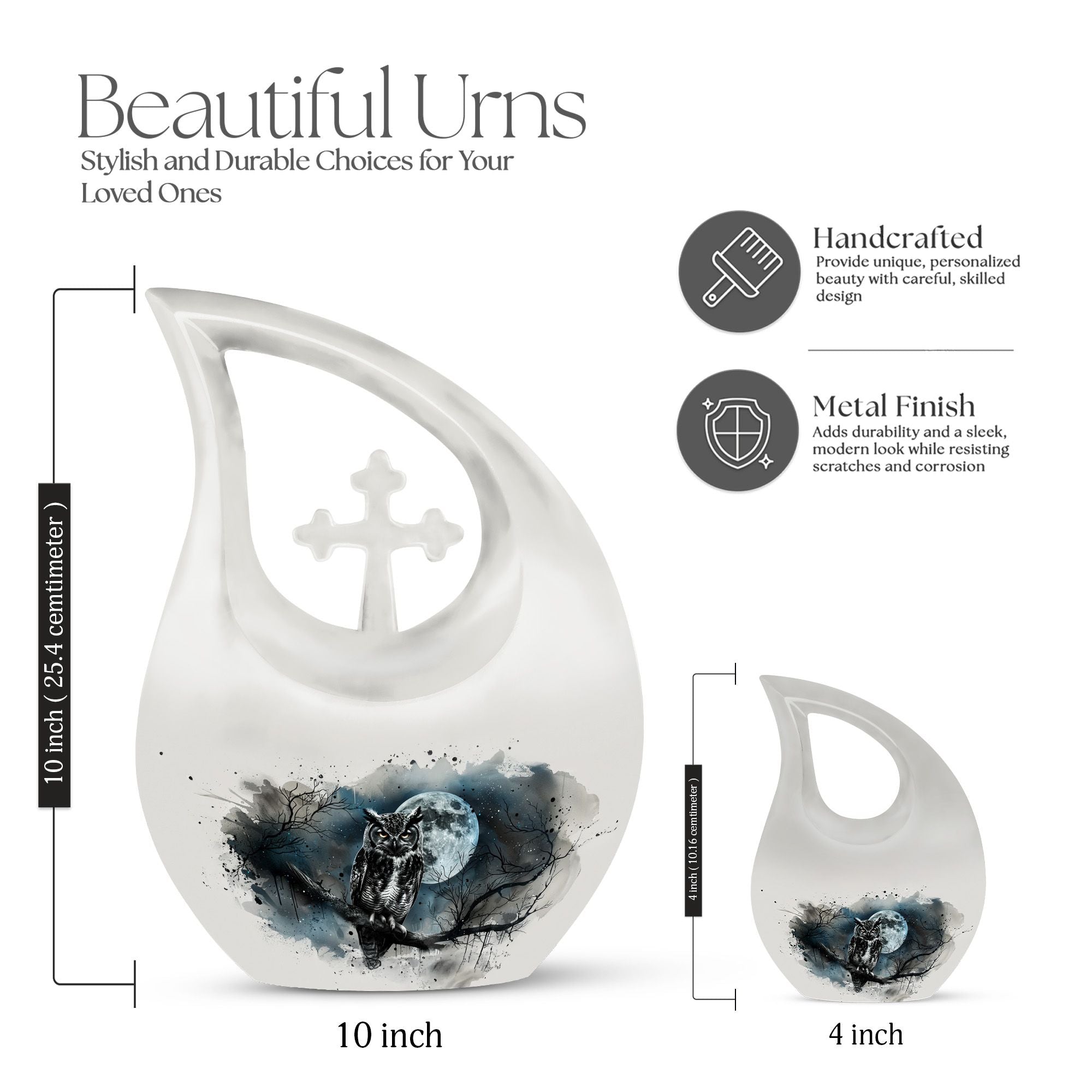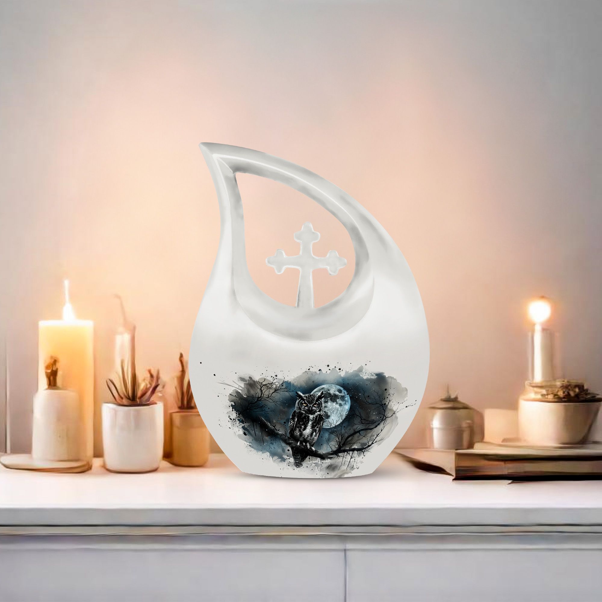 Handmade from premium aluminium, this 10 inch urn showcases a serene white finish paired with intricate owl artwork, symbolizing wisdom, guidance, and eternal peace. Its secure screw-top lid protects the ashes, making it suitable whether you need a cremation urn small, a cremation keepsake urn, or urns for cremation ashes small. The refined design makes it ideal for those seeking small cremation urns for ashes or urns for cremation that balance durability with elegance.