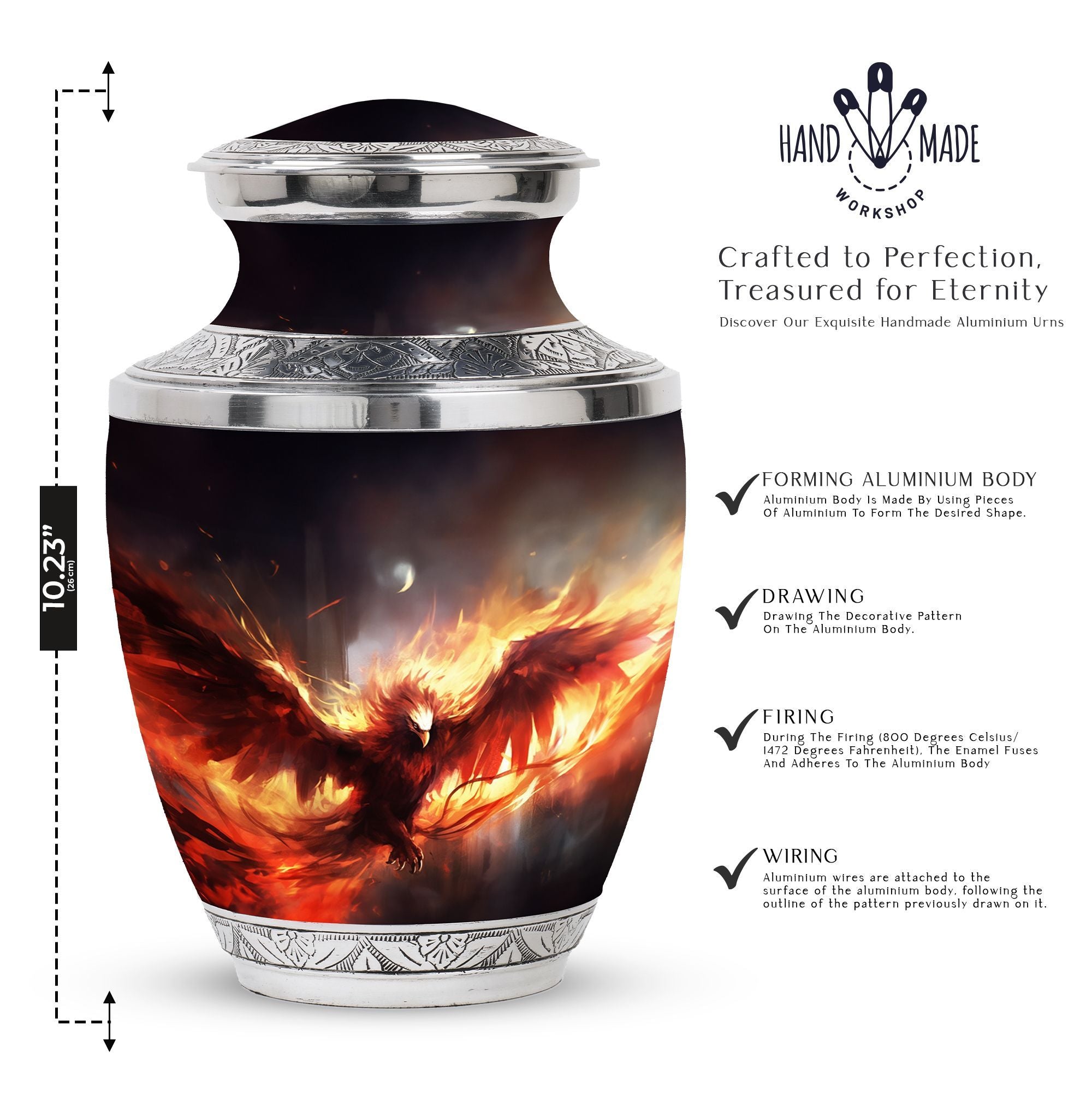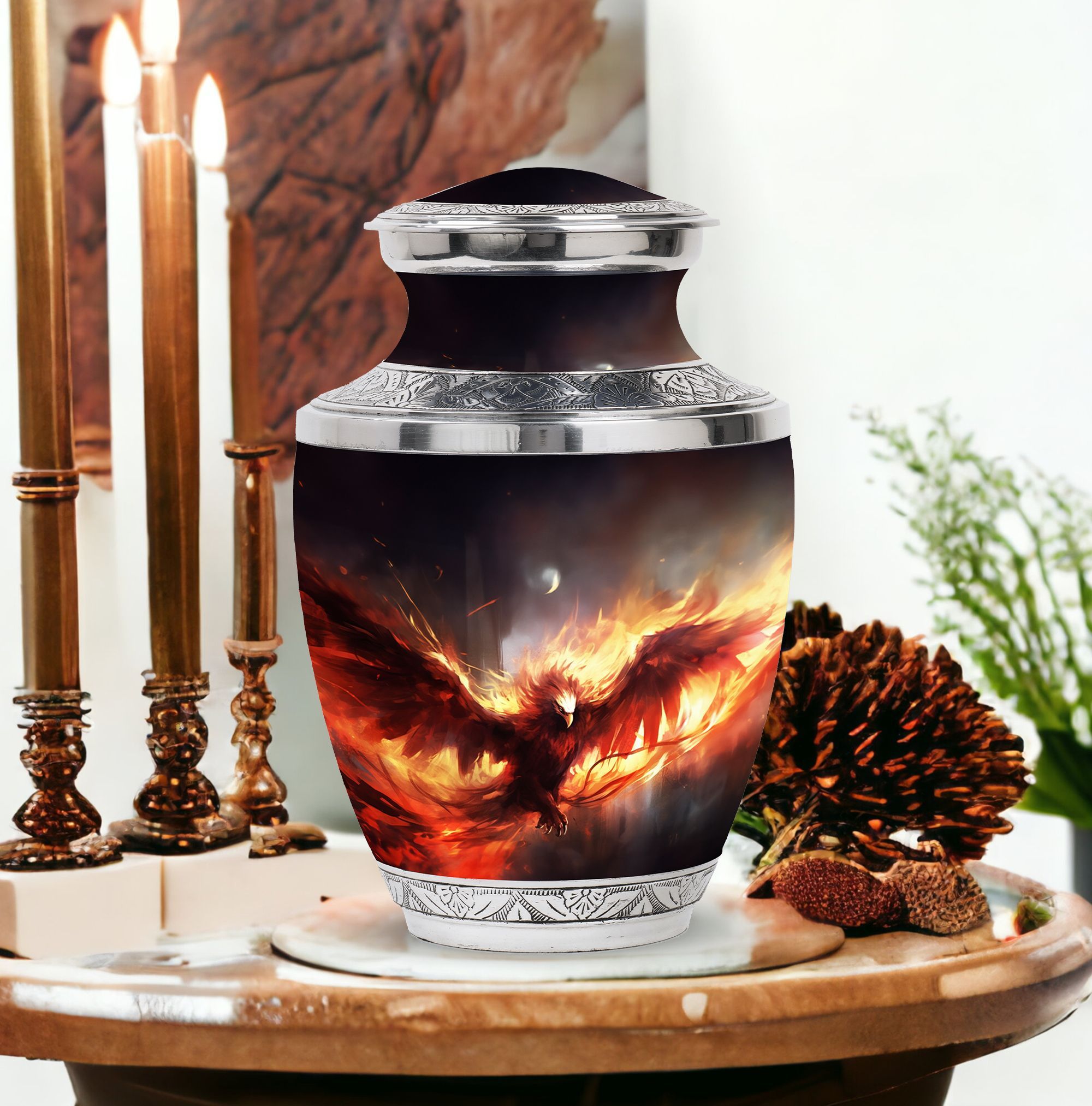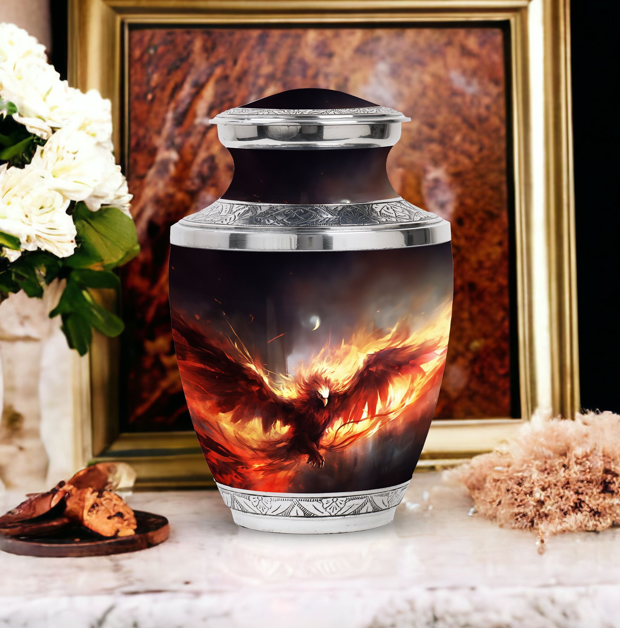 Experience the serene allure of the Red Phoenix Cremation Urn. A thoughtful choice in Memorial Ceremony Supplies, this large urn combines traditional aesthetics with practical purpose. Made from resilient Aluminum, it stands 10 inches tall and tips the scale at a sturdy 3.3 pounds. Its unique design offers an impressive capacity of 200 cubic inches. The added value is the velvet pouch provided for securely containing the cremation ashes. The urn's 3-inch size makes it an elegant and poignant keepsake. You can also personalize it by adding engraved names, further commemorating your lost loved one. This urn is not just for mom or dad, but a universal solution for paying tribute to all departed loved ones. So when looking for Metal Urns for Human Ashes, pick the Red Phoenix. Its timeless design and resilience make it a beautiful oasis for resting total tranquility.