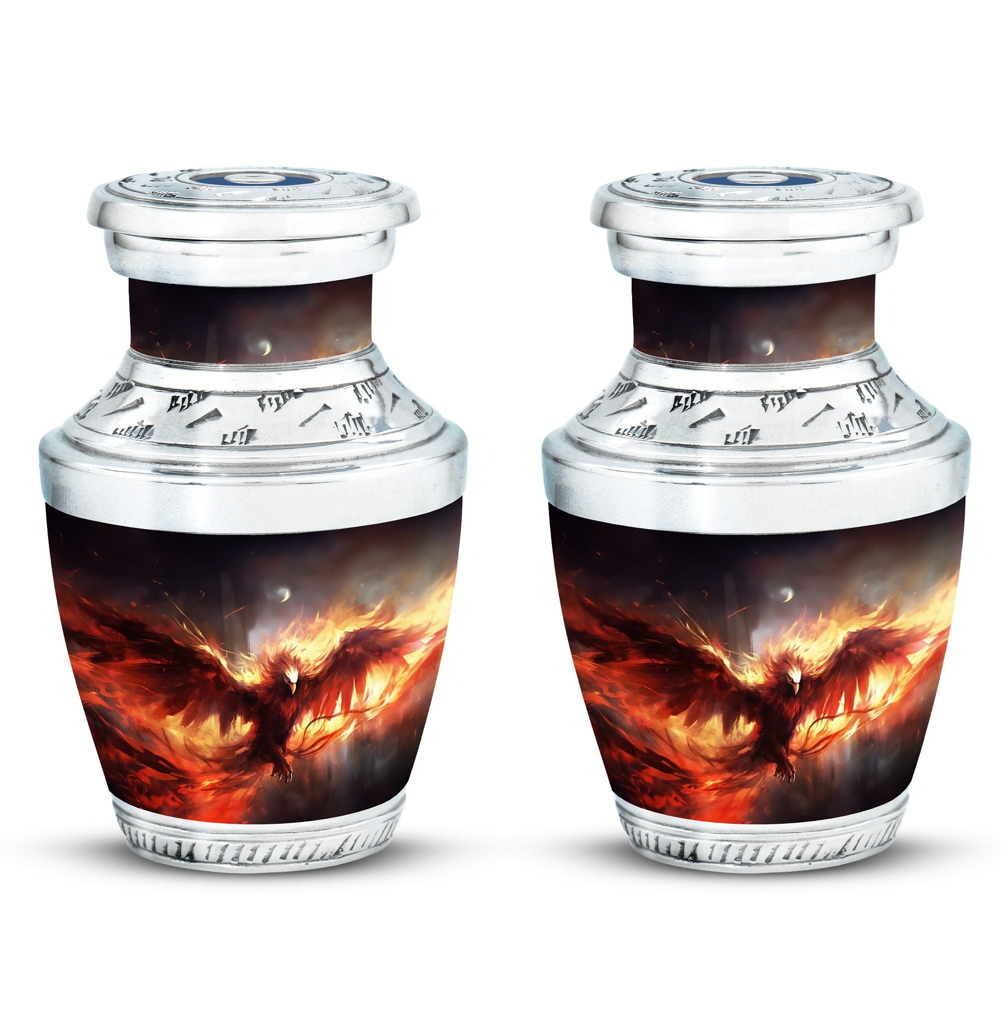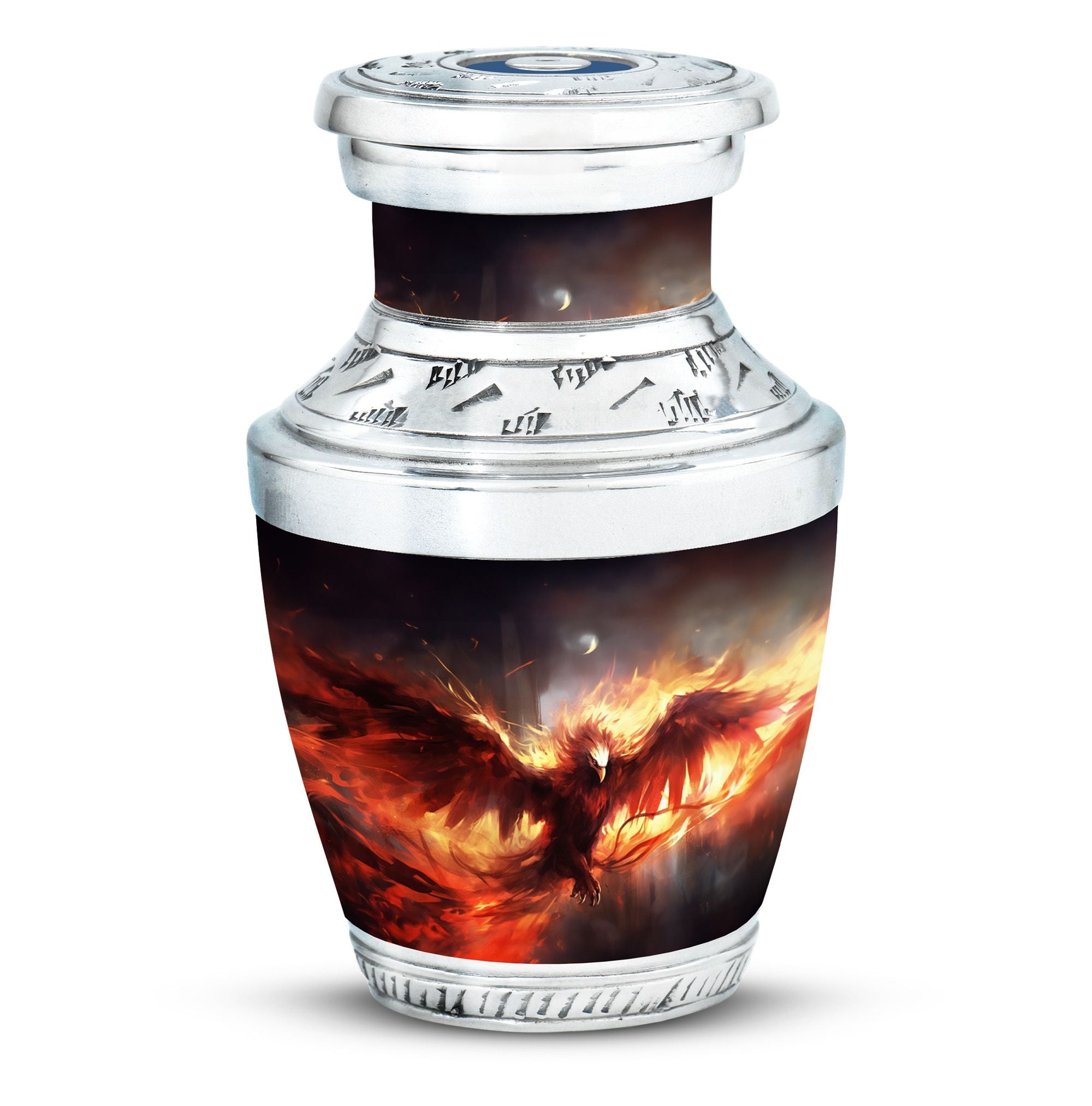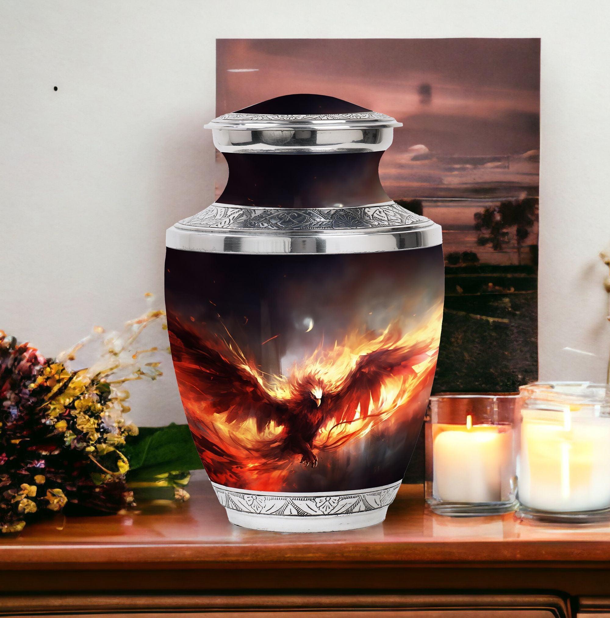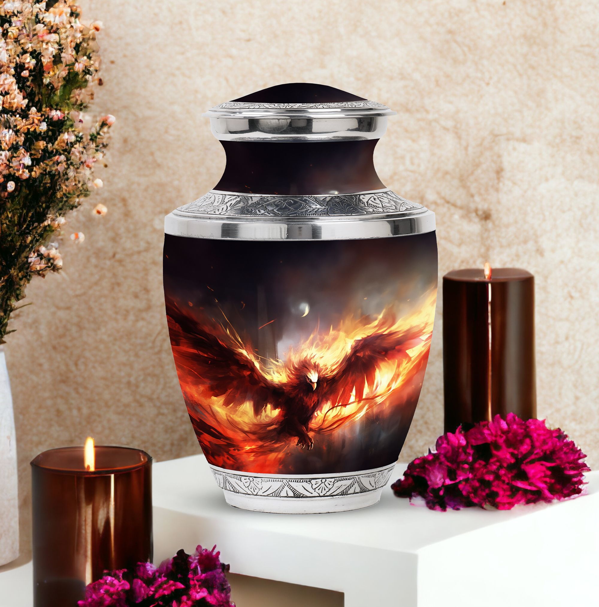 Experience the serene allure of the Red Phoenix Cremation Urn. A thoughtful choice in Memorial Ceremony Supplies, this large urn combines traditional aesthetics with practical purpose. Made from resilient Aluminum, it stands 10 inches tall and tips the scale at a sturdy 3.3 pounds. Its unique design offers an impressive capacity of 200 cubic inches. The added value is the velvet pouch provided for securely containing the cremation ashes. The urn's 3-inch size makes it an elegant and poignant keepsake. You can also personalize it by adding engraved names, further commemorating your lost loved one. This urn is not just for mom or dad, but a universal solution for paying tribute to all departed loved ones. So when looking for Metal Urns for Human Ashes, pick the Red Phoenix. Its timeless design and resilience make it a beautiful oasis for resting total tranquility.