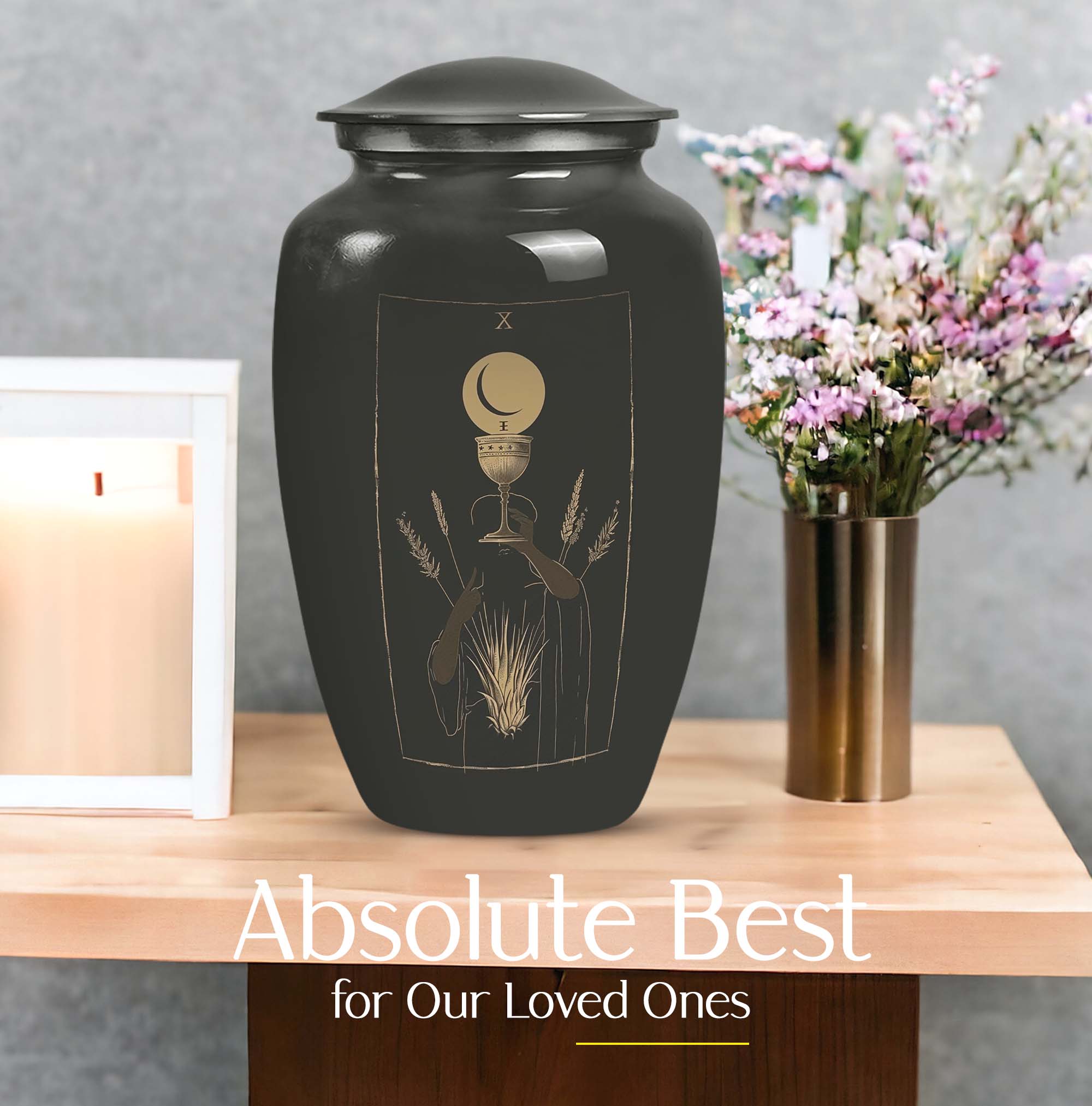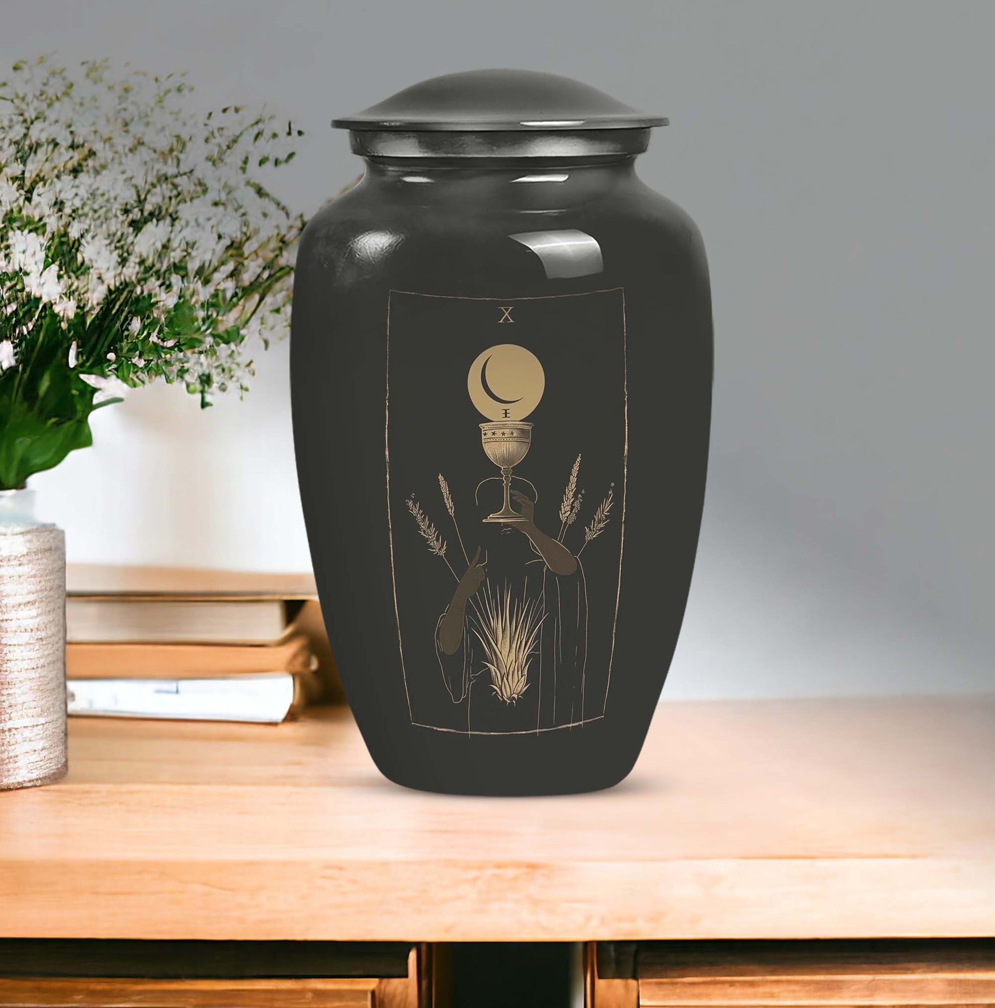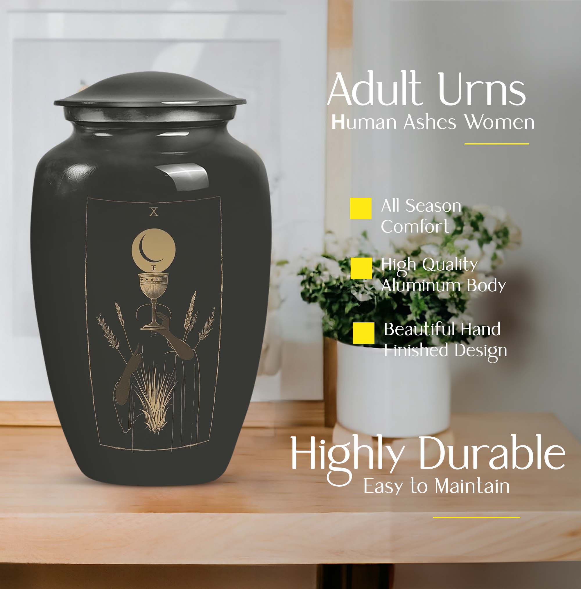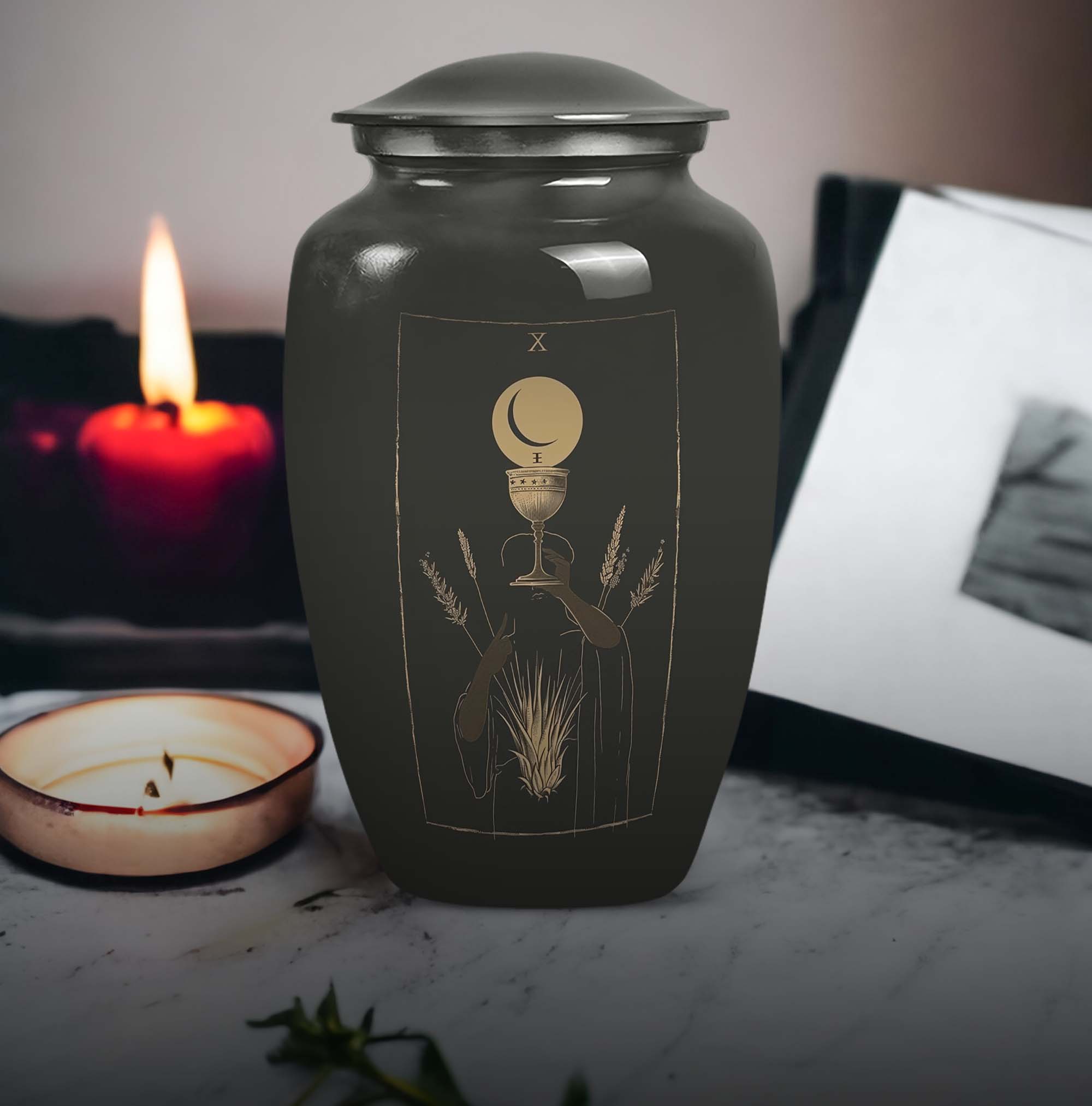 Honor your departed loved ones with our Tarot Urn, an elegant funeral adult urn for human ashes offering a warm and comforting presence. Crafted from sturdy aluminum, this 10-inch urn is meant to last, carrying a weight of 3.3 pounds. Its roomy interior boasts a capacity of 200 cubic inches, ensuring adequate space for your loved one's remains. This large urn stands prominently at a height of 10 inches, an imposing yet serene touch to any room. Included in the package is a velvet pouch, perfect for safe containment of ashes. The urn carries an abstract theme, a thoughtful symbol of life's mysteries and complexities. For a truly personal touch, customize this masterpiece by engraving names. It makes for a beautiful memorial forever urn or a touching tribute for mom. Note that apart from its heartwarming qualities, it also serves as aesthetic decor. This cremation urn doesn't just hold ashes - it encapsulates memories, souls, and boundless love.
