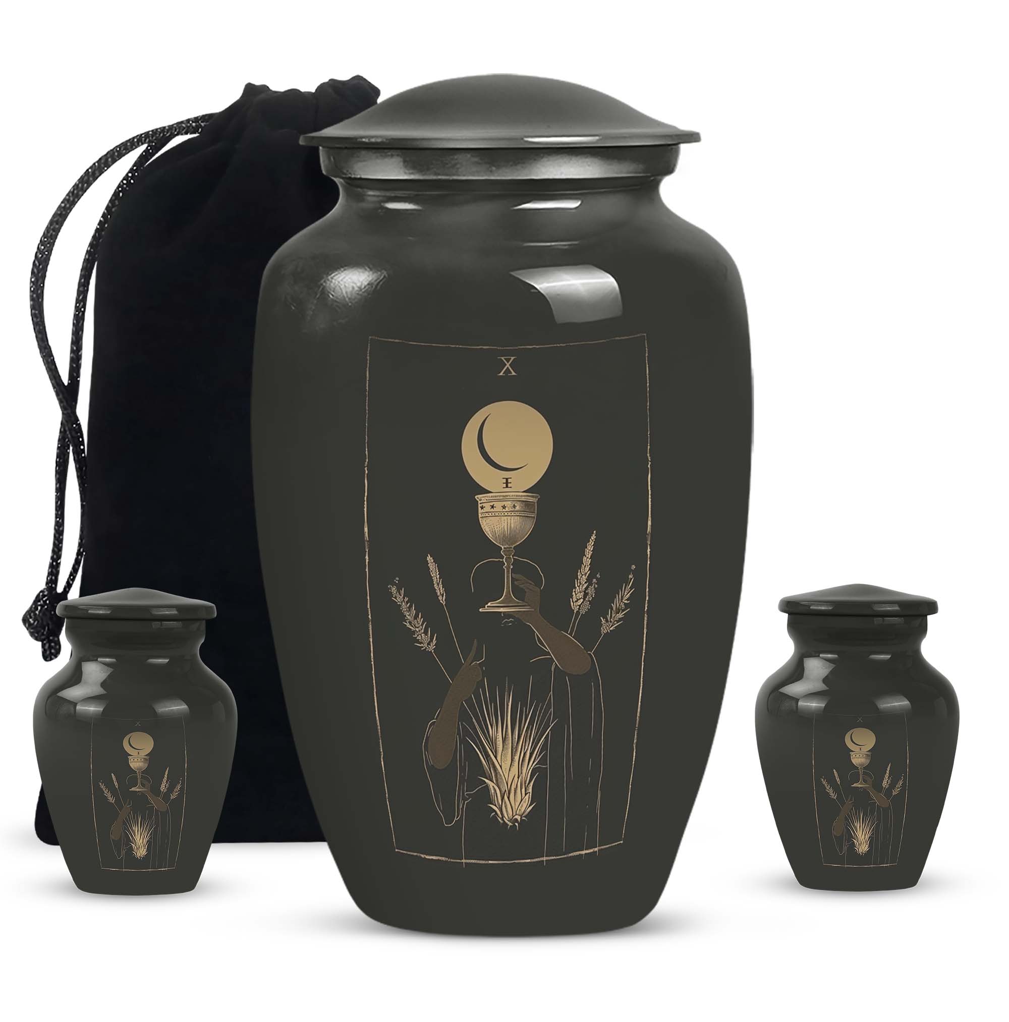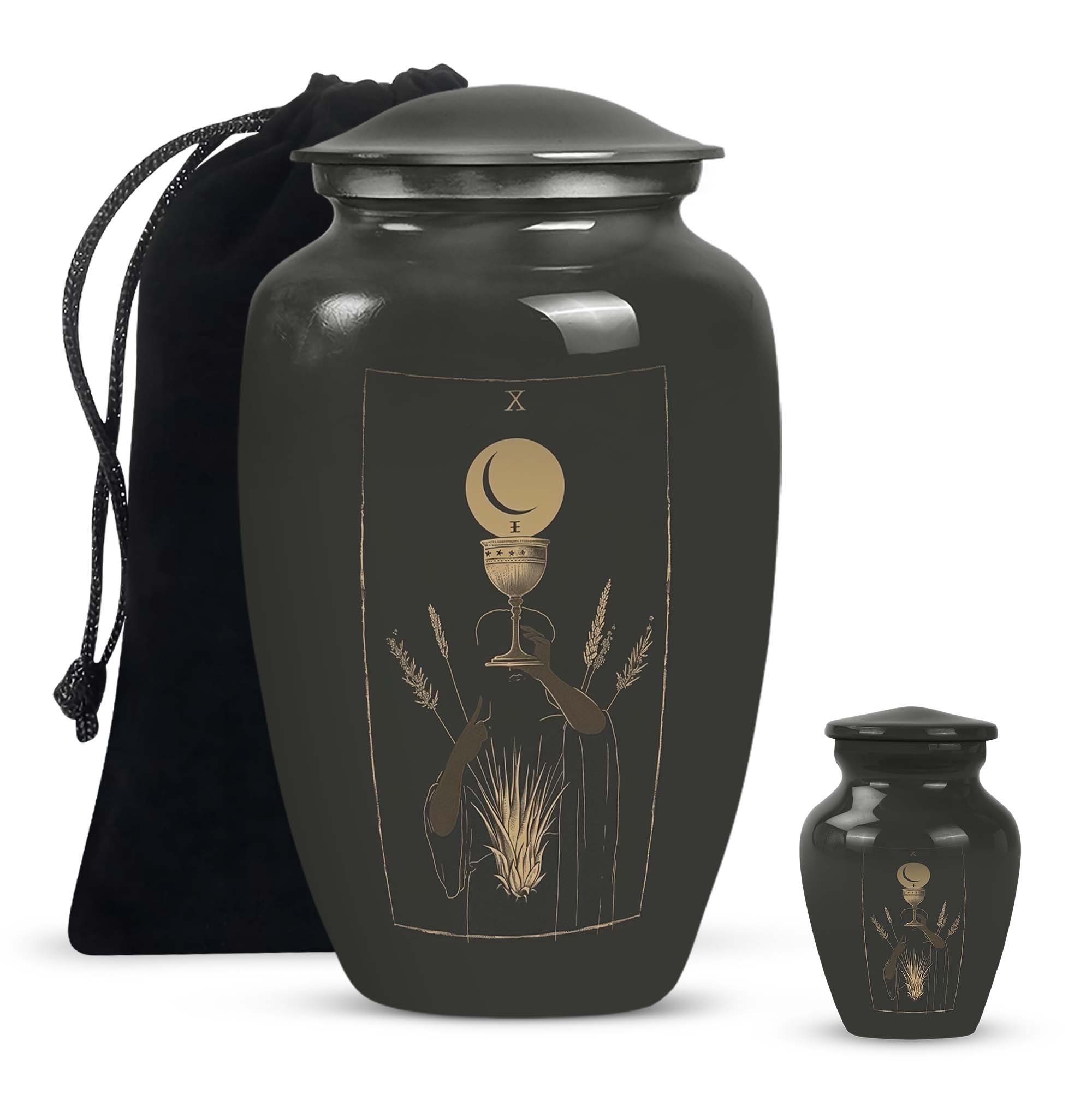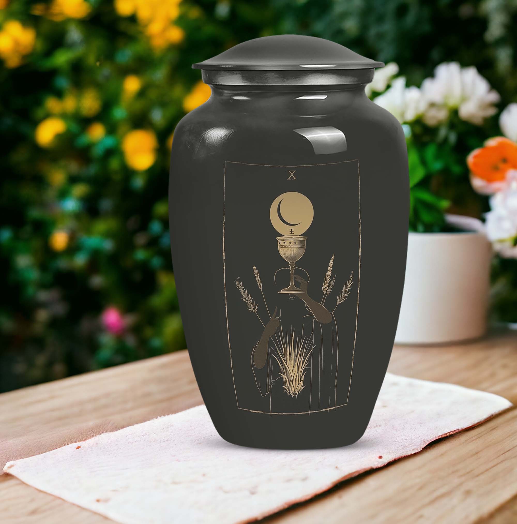 Honor your departed loved ones with our Tarot Urn, an elegant funeral adult urn for human ashes offering a warm and comforting presence. Crafted from sturdy aluminum, this 10-inch urn is meant to last, carrying a weight of 3.3 pounds. Its roomy interior boasts a capacity of 200 cubic inches, ensuring adequate space for your loved one's remains. This large urn stands prominently at a height of 10 inches, an imposing yet serene touch to any room. Included in the package is a velvet pouch, perfect for safe containment of ashes. The urn carries an abstract theme, a thoughtful symbol of life's mysteries and complexities. For a truly personal touch, customize this masterpiece by engraving names. It makes for a beautiful memorial forever urn or a touching tribute for mom. Note that apart from its heartwarming qualities, it also serves as aesthetic decor. This cremation urn doesn't just hold ashes - it encapsulates memories, souls, and boundless love.