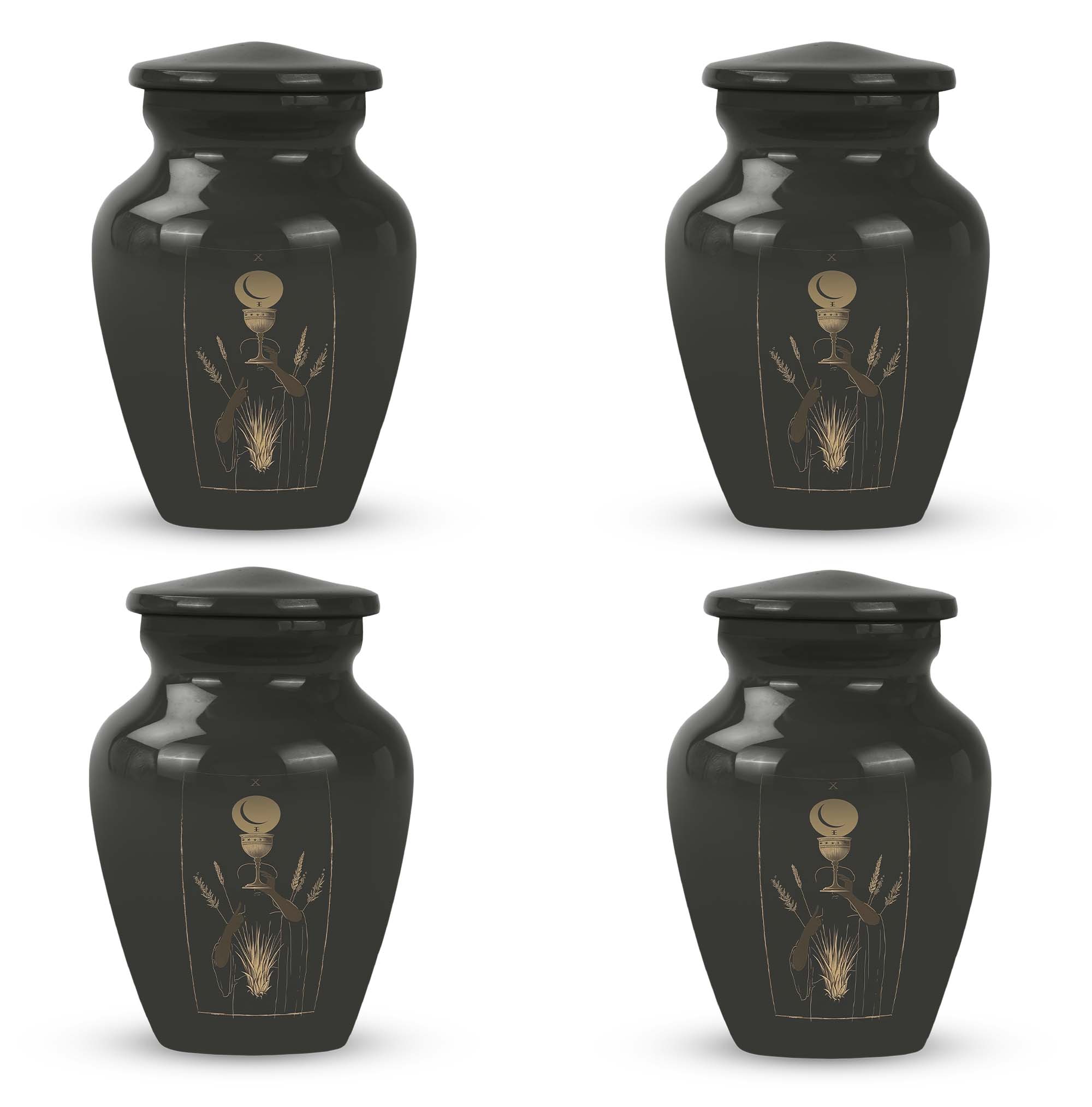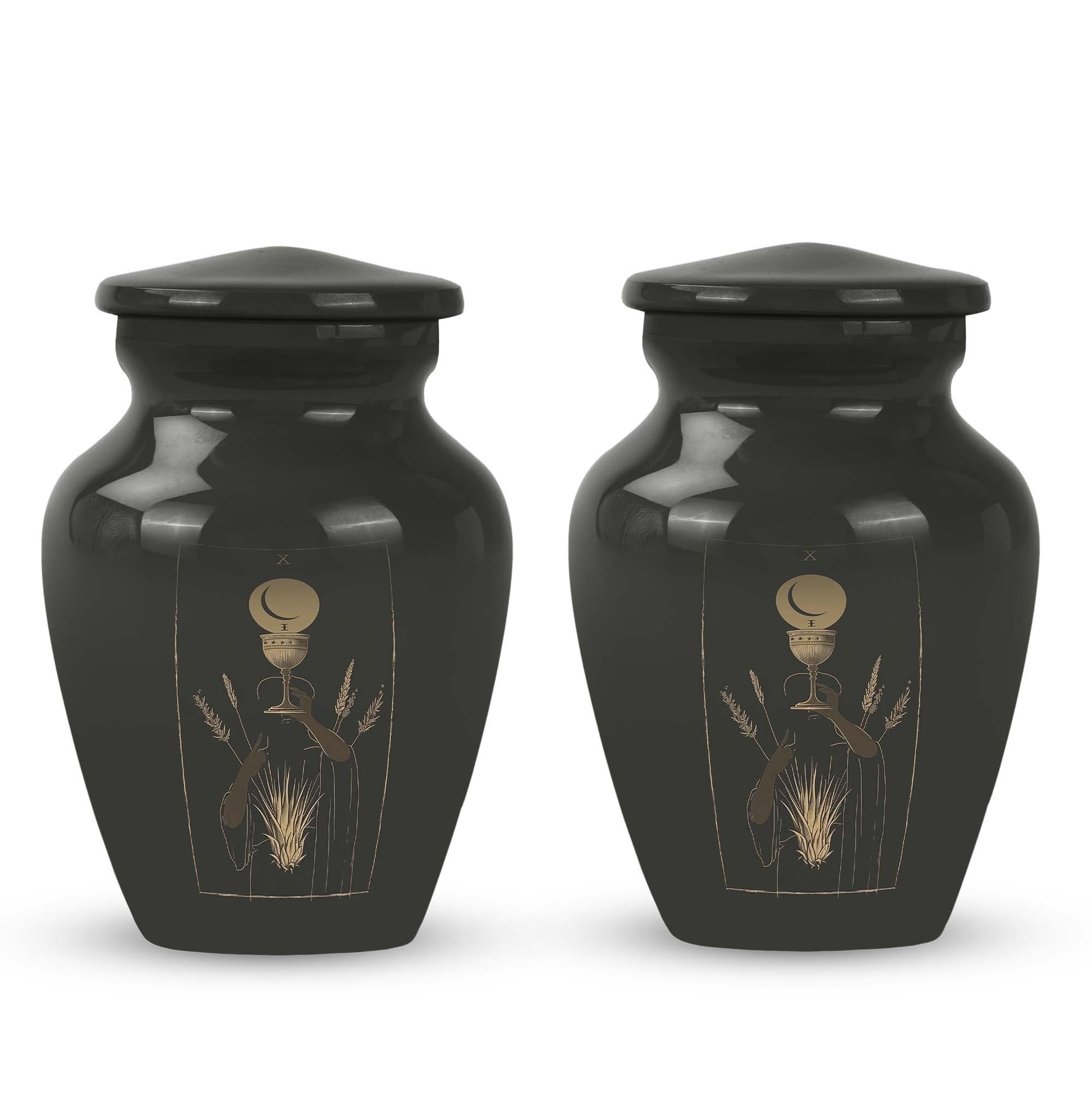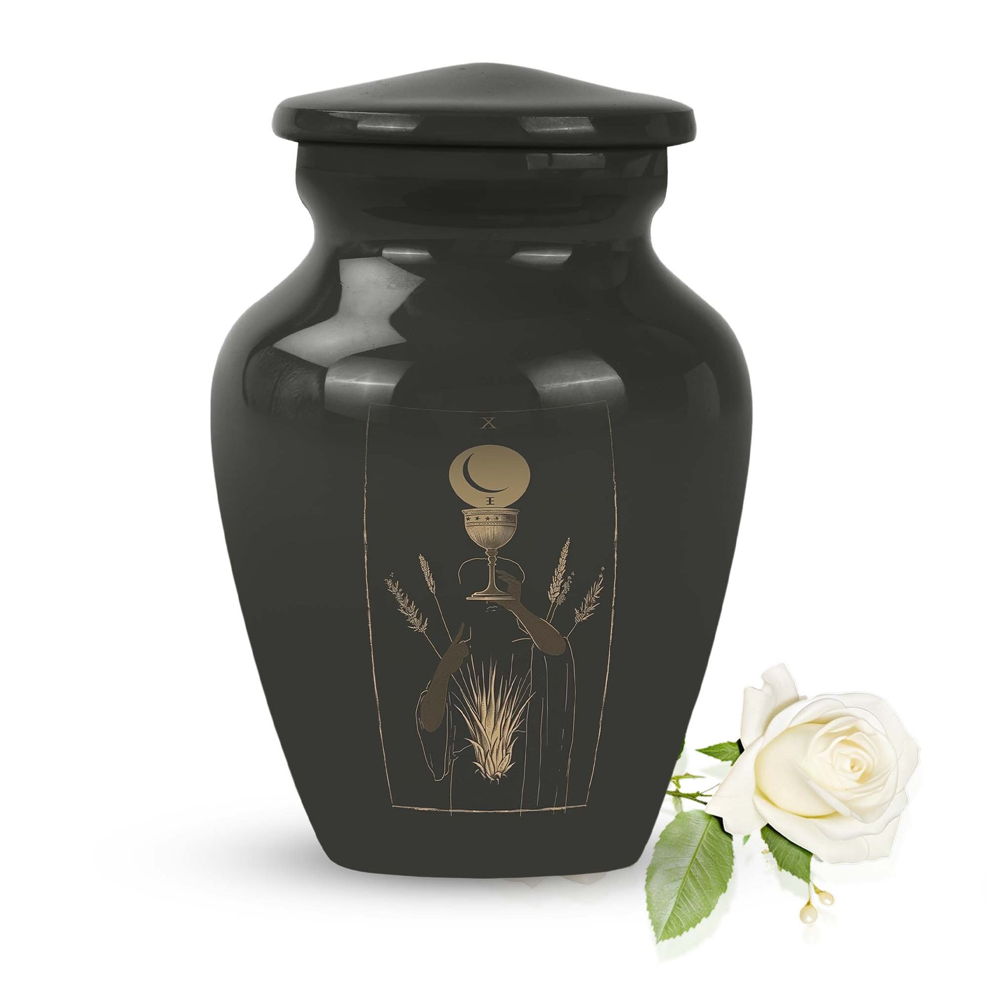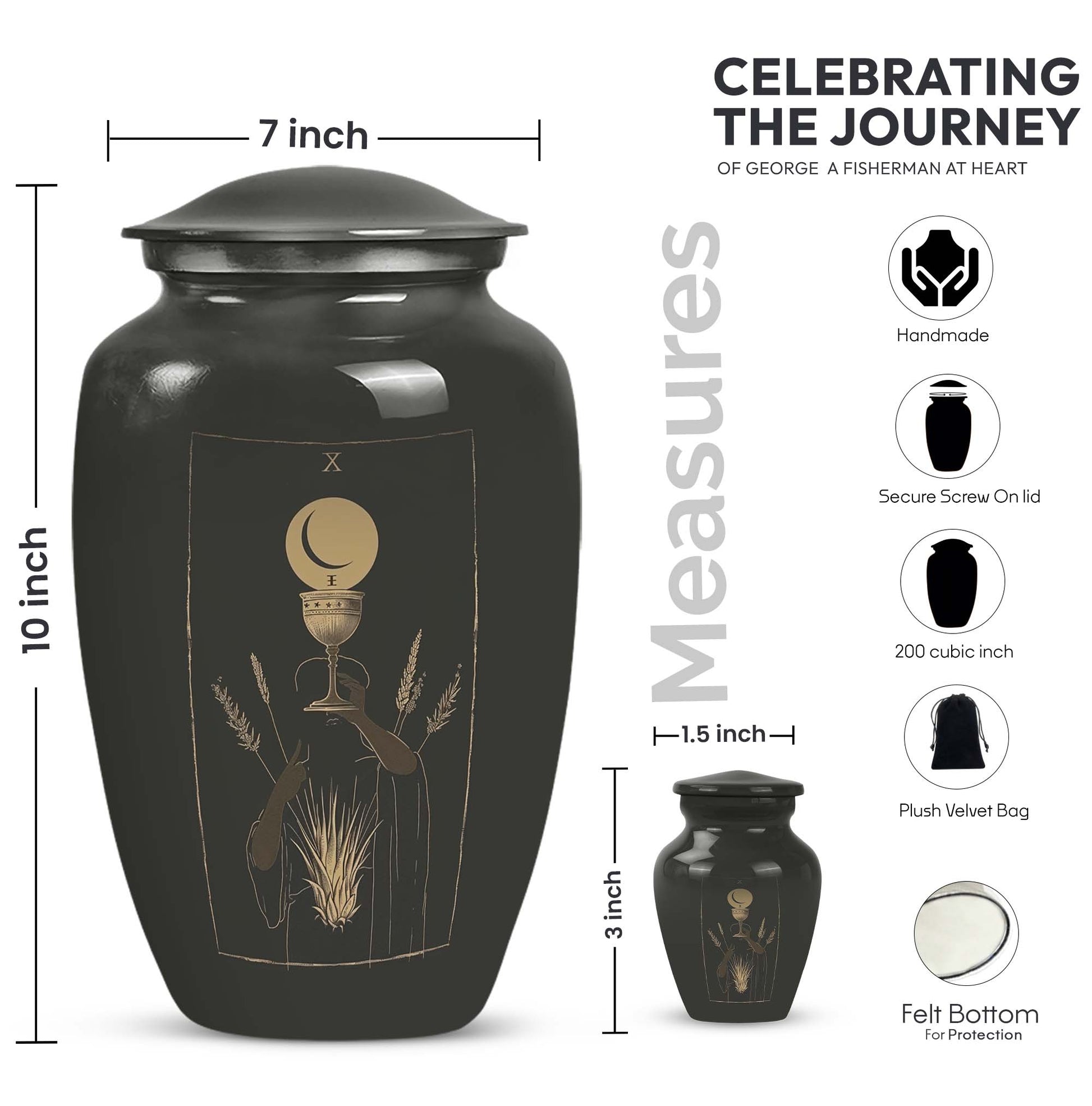 Honor your departed loved ones with our Tarot Urn, an elegant funeral adult urn for human ashes offering a warm and comforting presence. Crafted from sturdy aluminum, this 10-inch urn is meant to last, carrying a weight of 3.3 pounds. Its roomy interior boasts a capacity of 200 cubic inches, ensuring adequate space for your loved one's remains. This large urn stands prominently at a height of 10 inches, an imposing yet serene touch to any room. Included in the package is a velvet pouch, perfect for safe containment of ashes. The urn carries an abstract theme, a thoughtful symbol of life's mysteries and complexities. For a truly personal touch, customize this masterpiece by engraving names. It makes for a beautiful memorial forever urn or a touching tribute for mom. Note that apart from its heartwarming qualities, it also serves as aesthetic decor. This cremation urn doesn't just hold ashes - it encapsulates memories, souls, and boundless love.