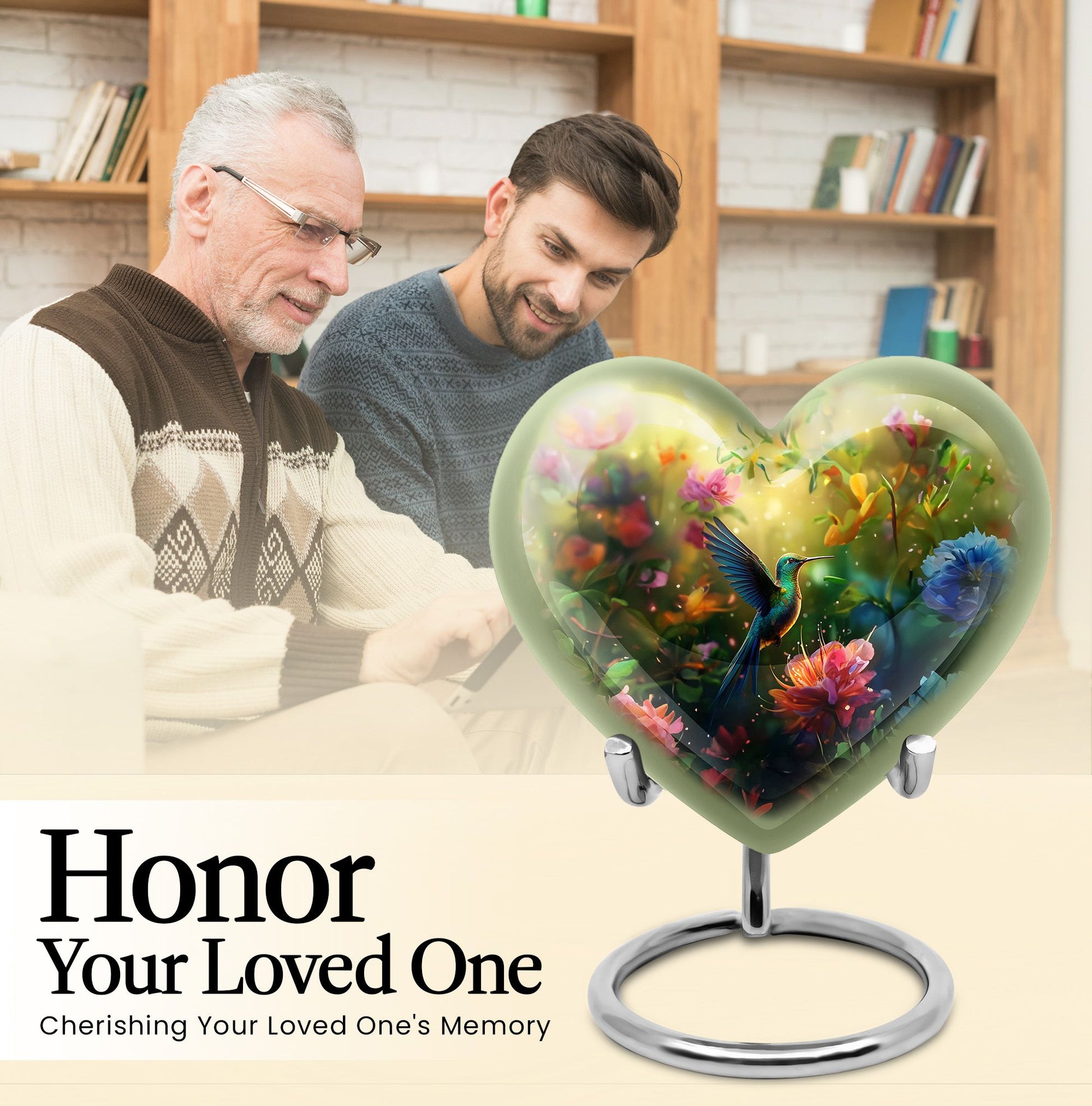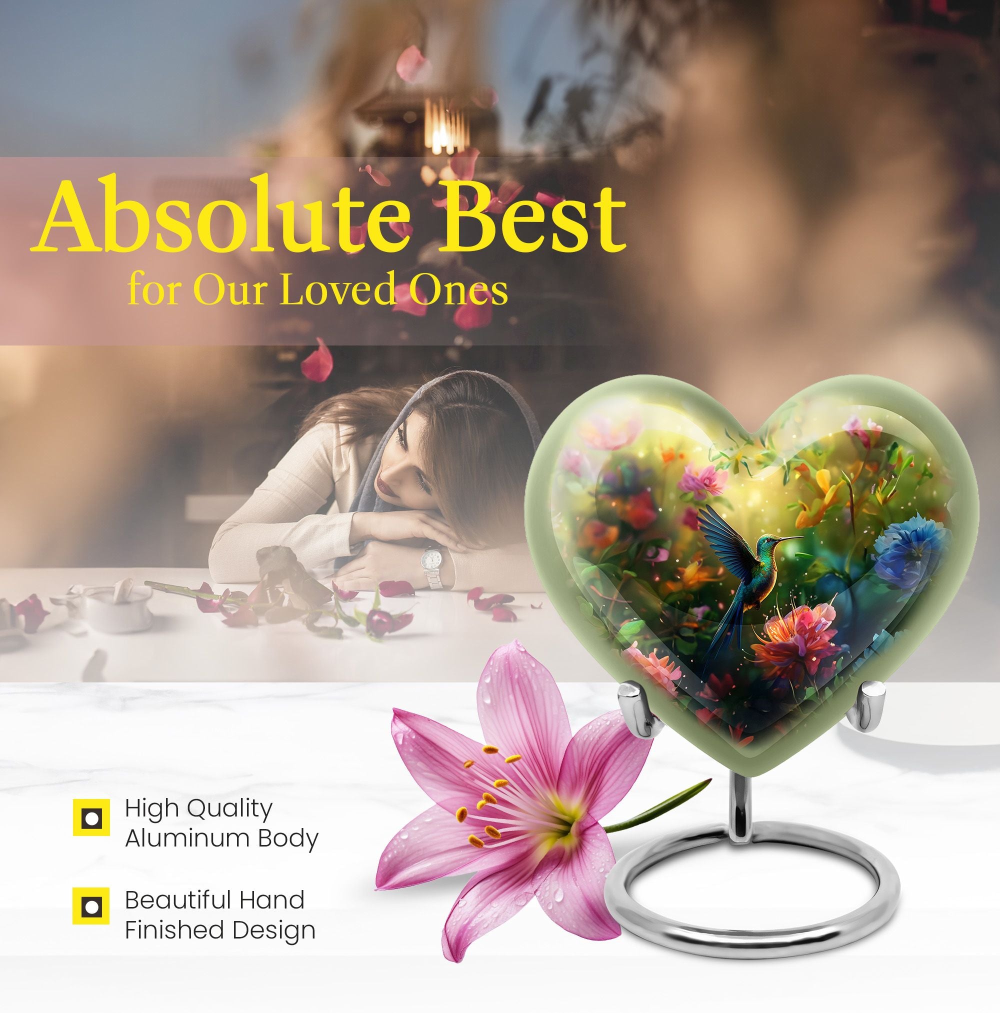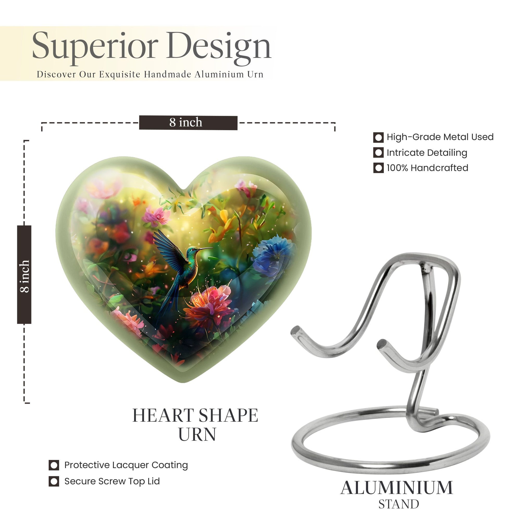 Experience the tranquillity and peace that our abstract-themed Heart Urn brings, a lovingly crafted ode to your beloved. This aluminum, large-sized cremation urn has been meticulously designed to hold up to 200 cubic inches of ash, promising a solemn sanctum for the memories of your loved one. Measuring a significant 10 inches in height, our urn echoes the serenity of humming birds, weaving in the symbolism of their free spirit into its very core. The refined weight of 3.3 pounds adds just the right amount of gravitas to its function, while personalizing options for engraved names makes it more meaningful. Further, the urn is packaged meticulously with a velvet pouch, making containment of ashes straightforward and simple. Our adult burial urn – suitable for men and women - stands as a touching testament to life and the beauty of remembrance. Whether you are seeking memorial medium urns or cremation urns for burial, opt for a piece that is as unique as the memory it encapsulates.