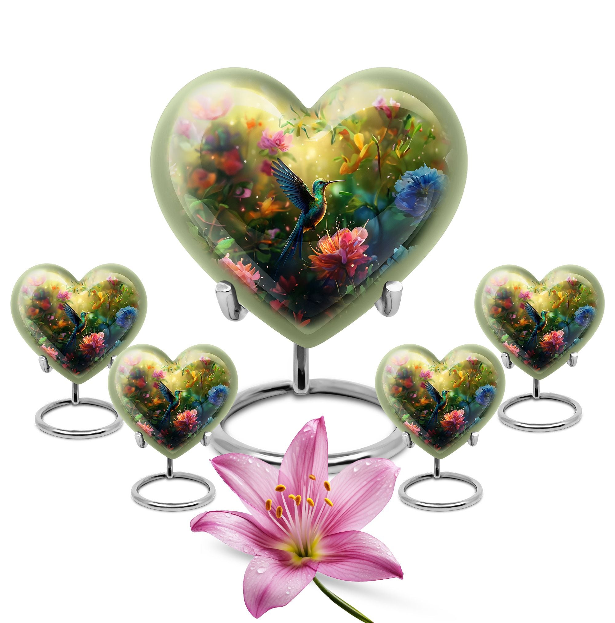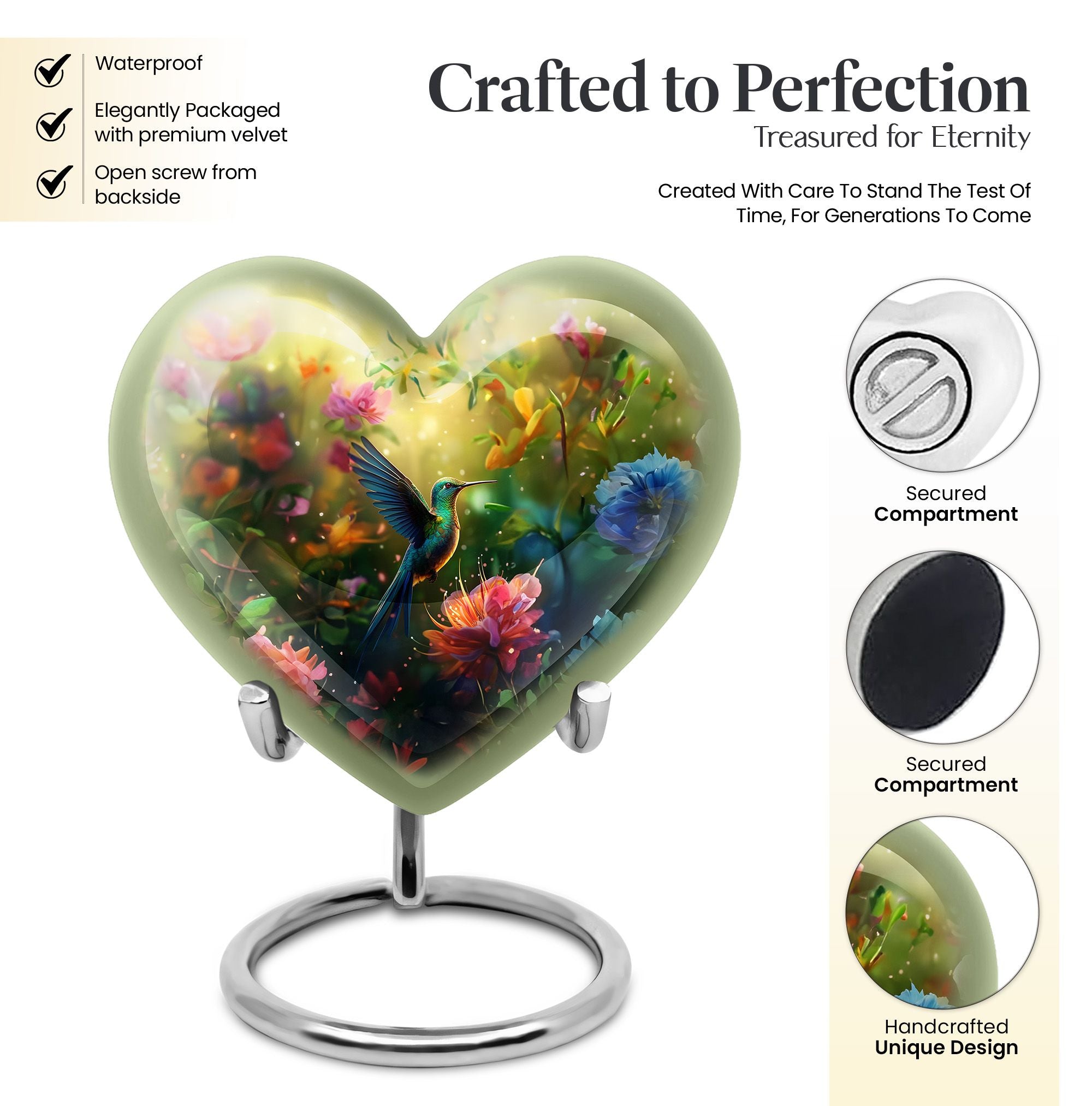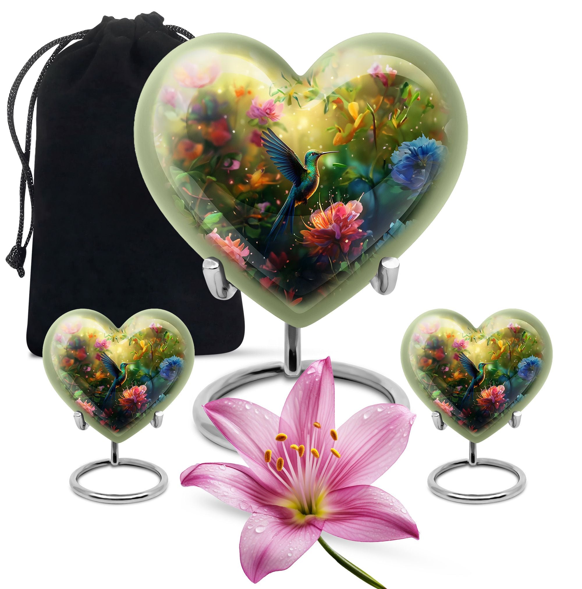 Experience the tranquillity and peace that our abstract-themed Heart Urn brings, a lovingly crafted ode to your beloved. This aluminum, large-sized cremation urn has been meticulously designed to hold up to 200 cubic inches of ash, promising a solemn sanctum for the memories of your loved one. Measuring a significant 10 inches in height, our urn echoes the serenity of humming birds, weaving in the symbolism of their free spirit into its very core. The refined weight of 3.3 pounds adds just the right amount of gravitas to its function, while personalizing options for engraved names makes it more meaningful. Further, the urn is packaged meticulously with a velvet pouch, making containment of ashes straightforward and simple. Our adult burial urn – suitable for men and women - stands as a touching testament to life and the beauty of remembrance. Whether you are seeking memorial medium urns or cremation urns for burial, opt for a piece that is as unique as the memory it encapsulates.