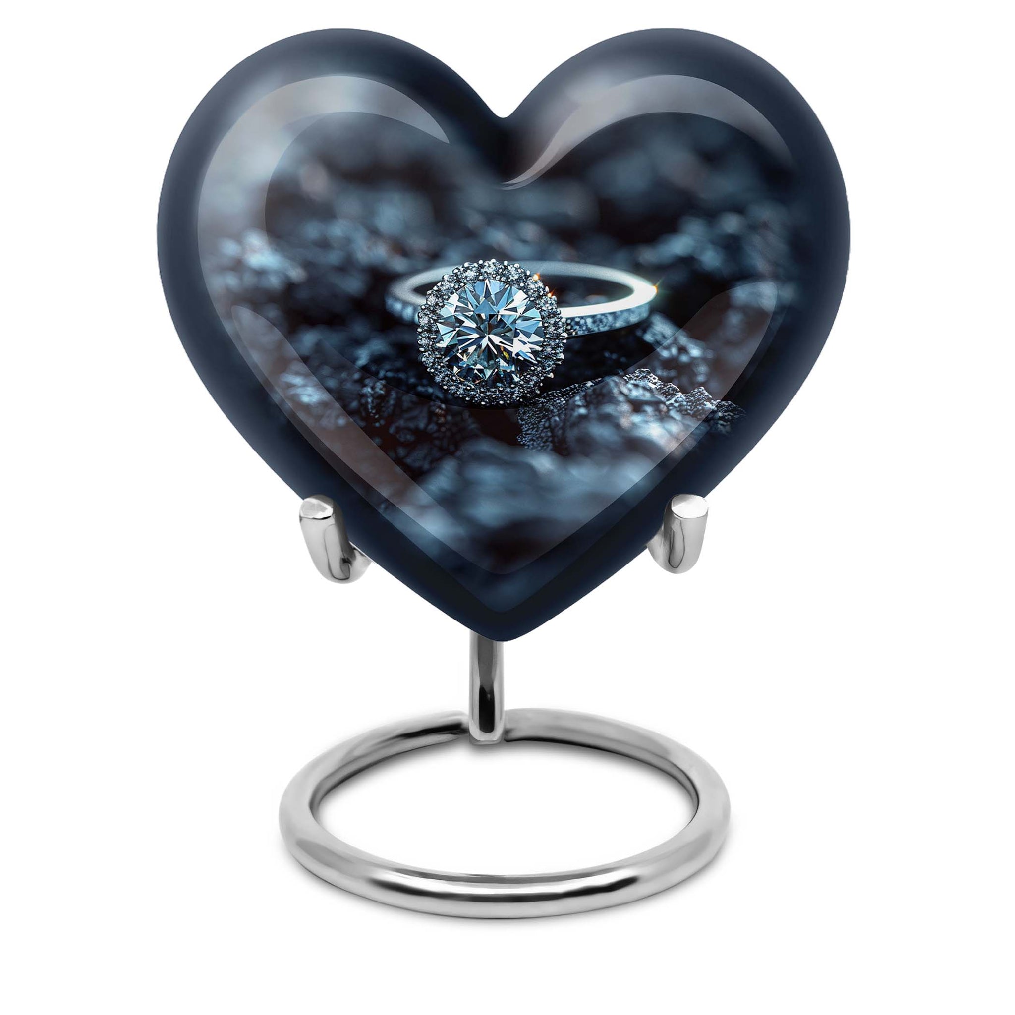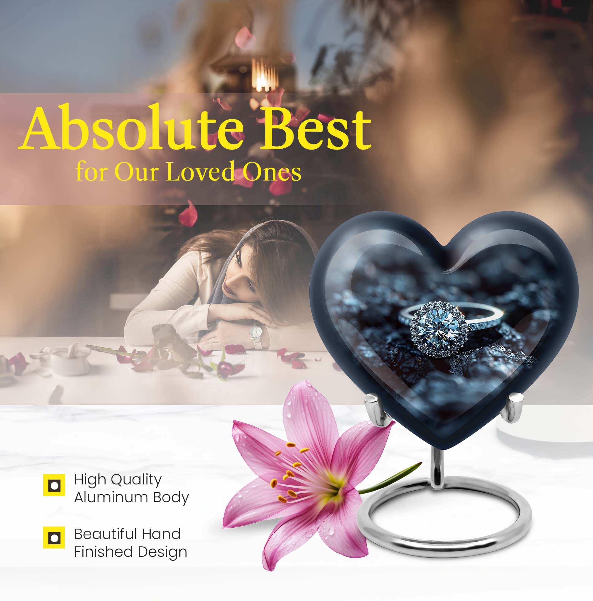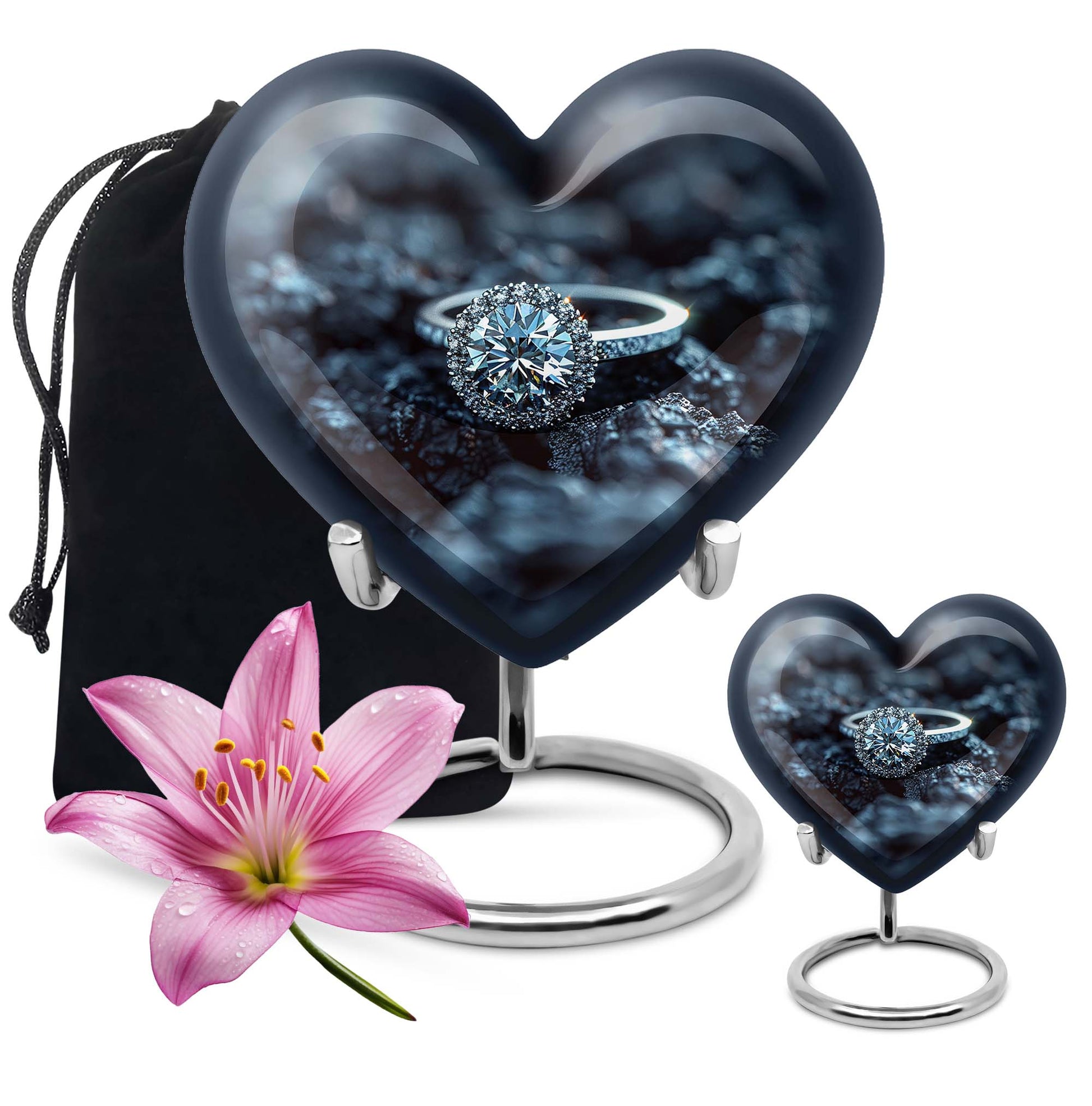 Honor your loved one and cherish their memory with our unique Heart Urn, an exquisite piece from the category of large urns. This elegant cremation urn is crafted from durable aluminium, ensuring it can stand the test of time. Measuring at 10 inches in height and weighing 3.3 pounds, it has a capacity of 200 cubic inches, fit for holding significant remains. Echoing modern design principles, its abstract theme sets it apart from conventional burial urns, making it an attractive piece in your home. The package includes a luxurious velvet pouch for containment and protection of ashes. Adding a personal touch, this Ring urn allows for engraved names, bestowing it a distinctive identity. Ideal for adult female ashes, it blends ceremony and sentiment seamlessly. Note, 'cremation urns for ashes' and 'urin human humans' are some of the keywords worth considering for further searches in this realm.