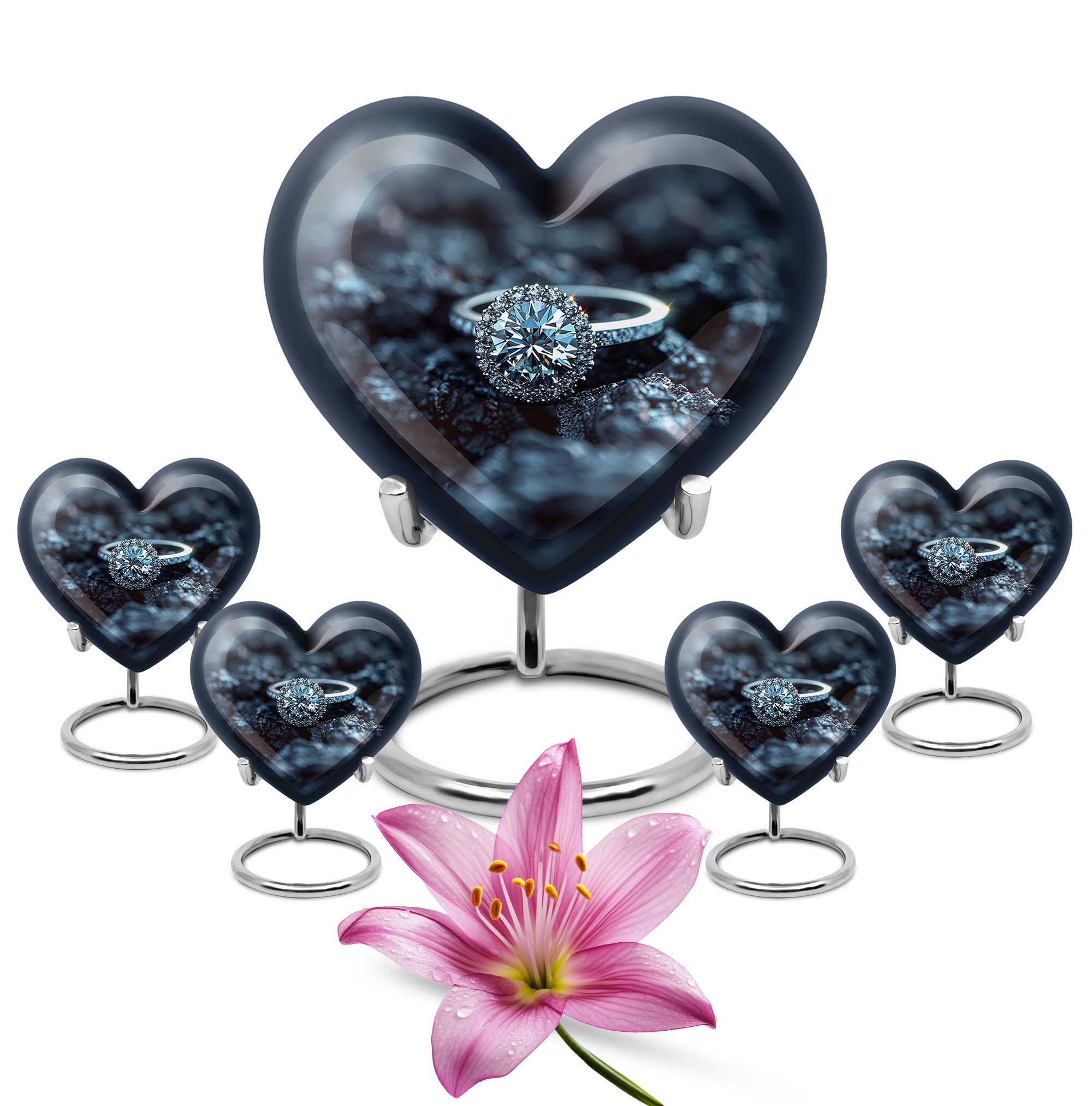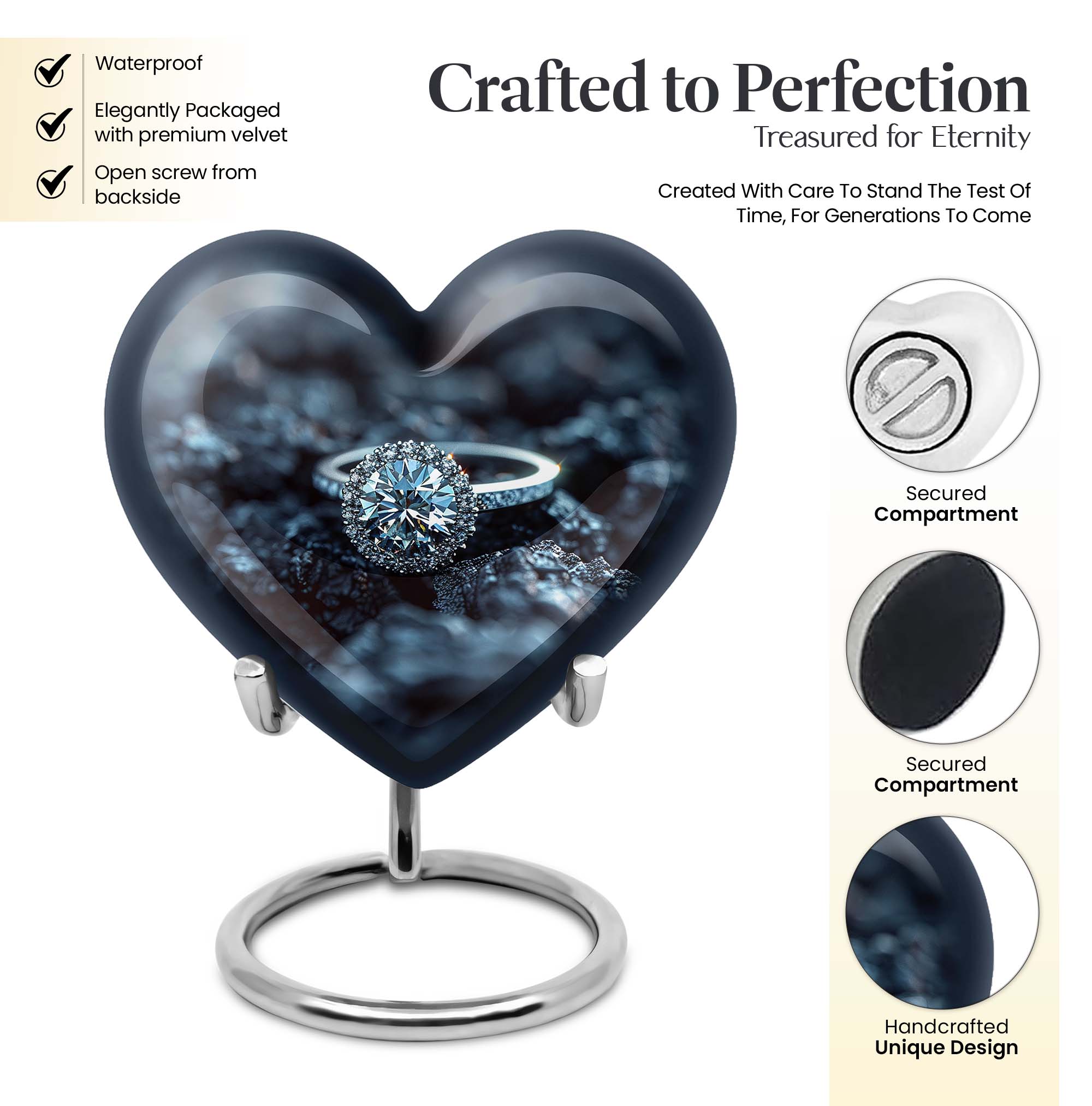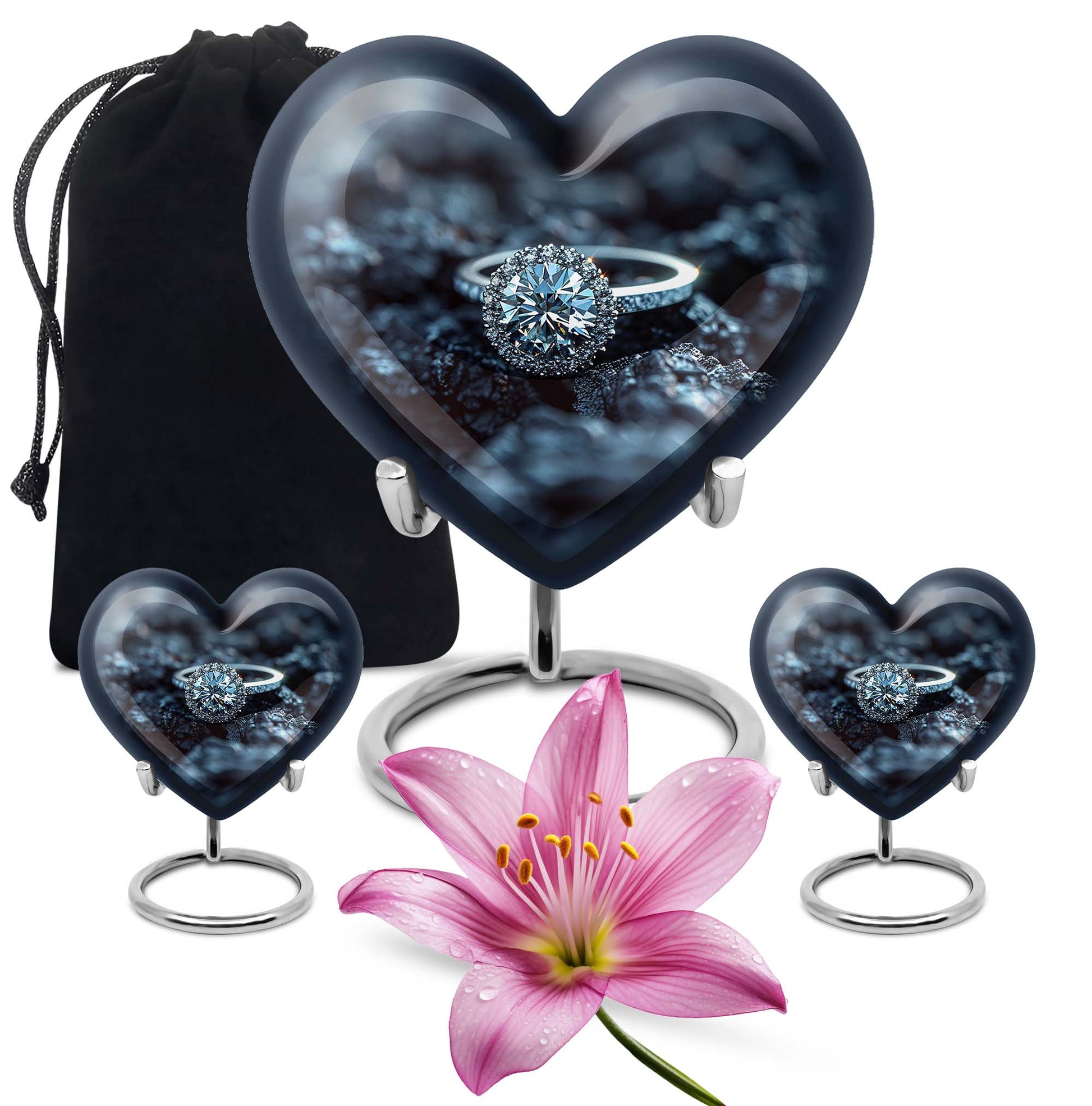 Honor your loved one and cherish their memory with our unique Heart Urn, an exquisite piece from the category of large urns. This elegant cremation urn is crafted from durable aluminium, ensuring it can stand the test of time. Measuring at 10 inches in height and weighing 3.3 pounds, it has a capacity of 200 cubic inches, fit for holding significant remains. Echoing modern design principles, its abstract theme sets it apart from conventional burial urns, making it an attractive piece in your home. The package includes a luxurious velvet pouch for containment and protection of ashes. Adding a personal touch, this Ring urn allows for engraved names, bestowing it a distinctive identity. Ideal for adult female ashes, it blends ceremony and sentiment seamlessly. Note, 'cremation urns for ashes' and 'urin human humans' are some of the keywords worth considering for further searches in this realm.