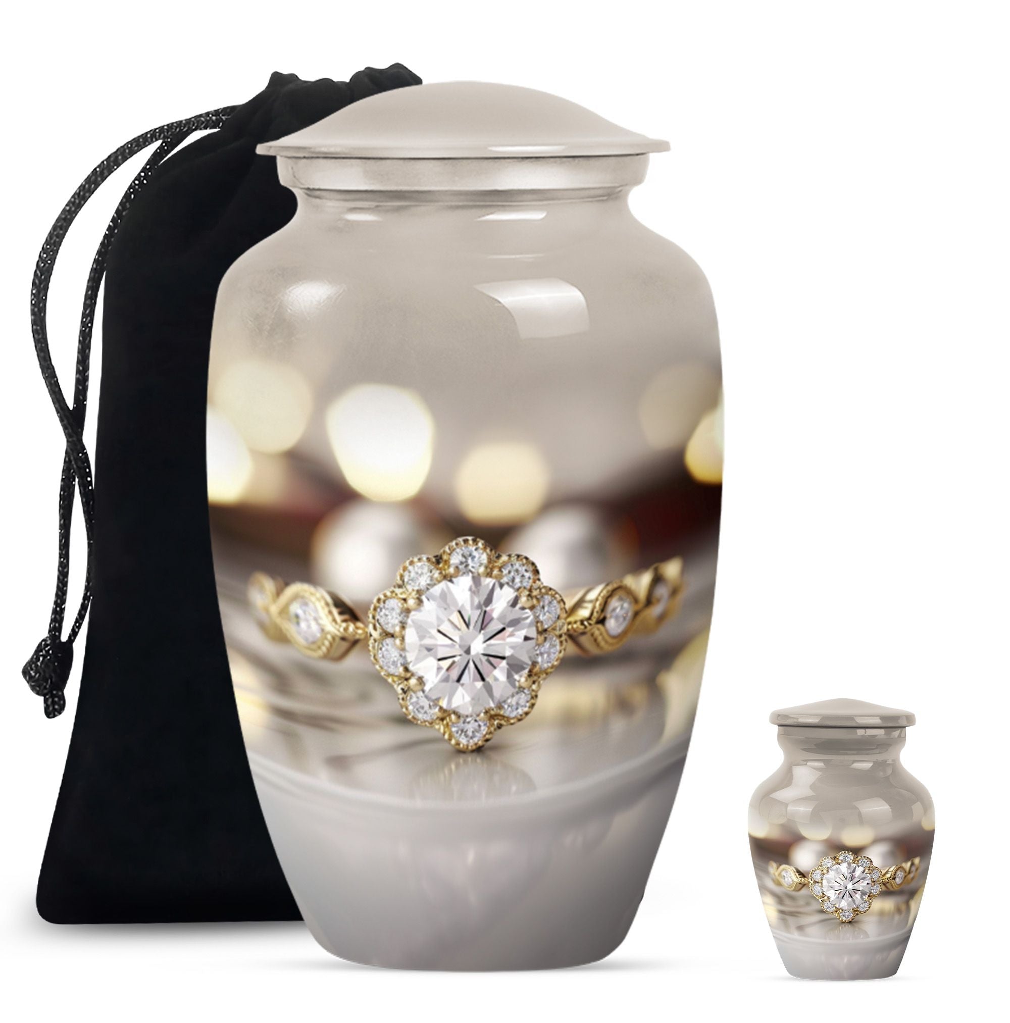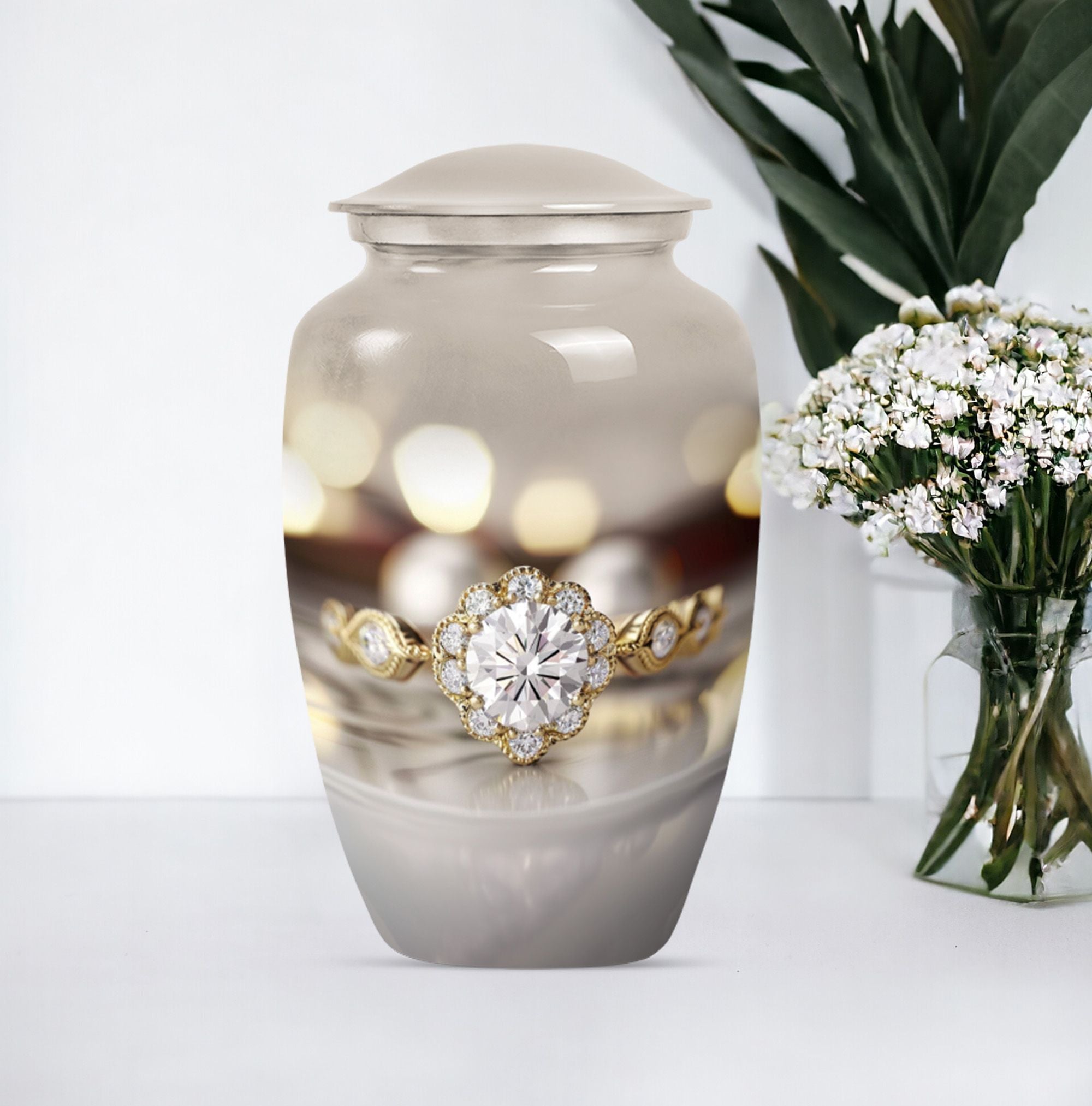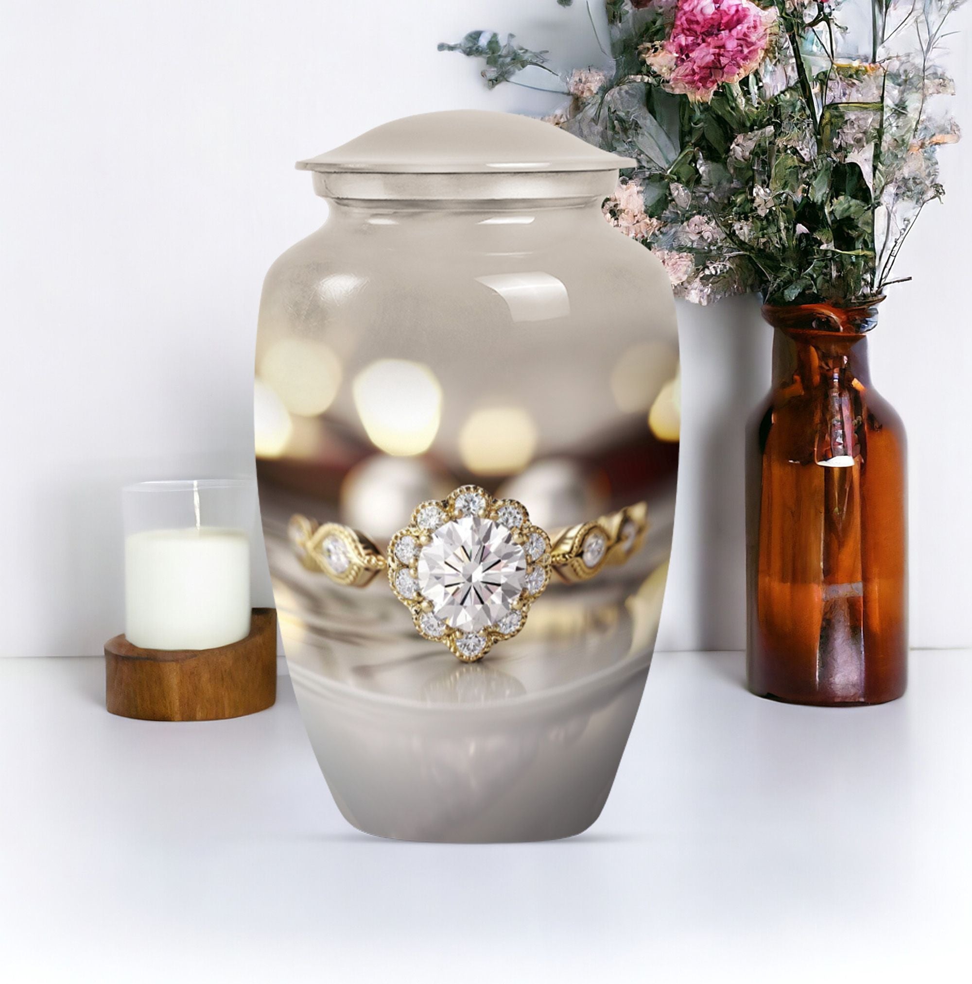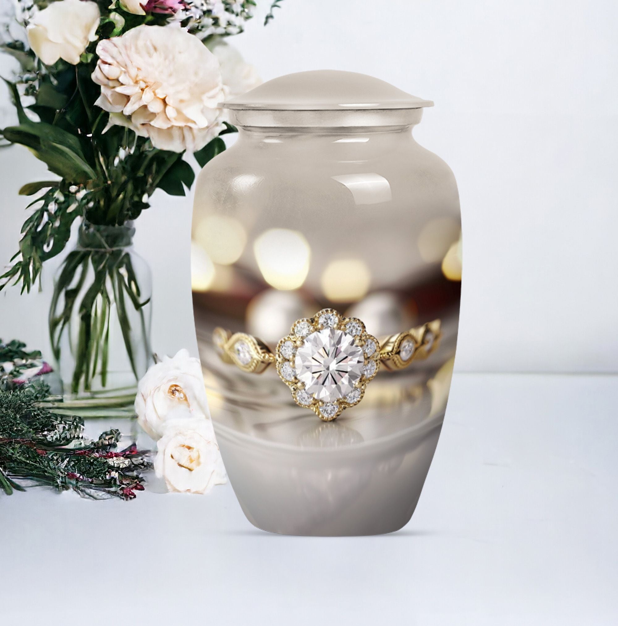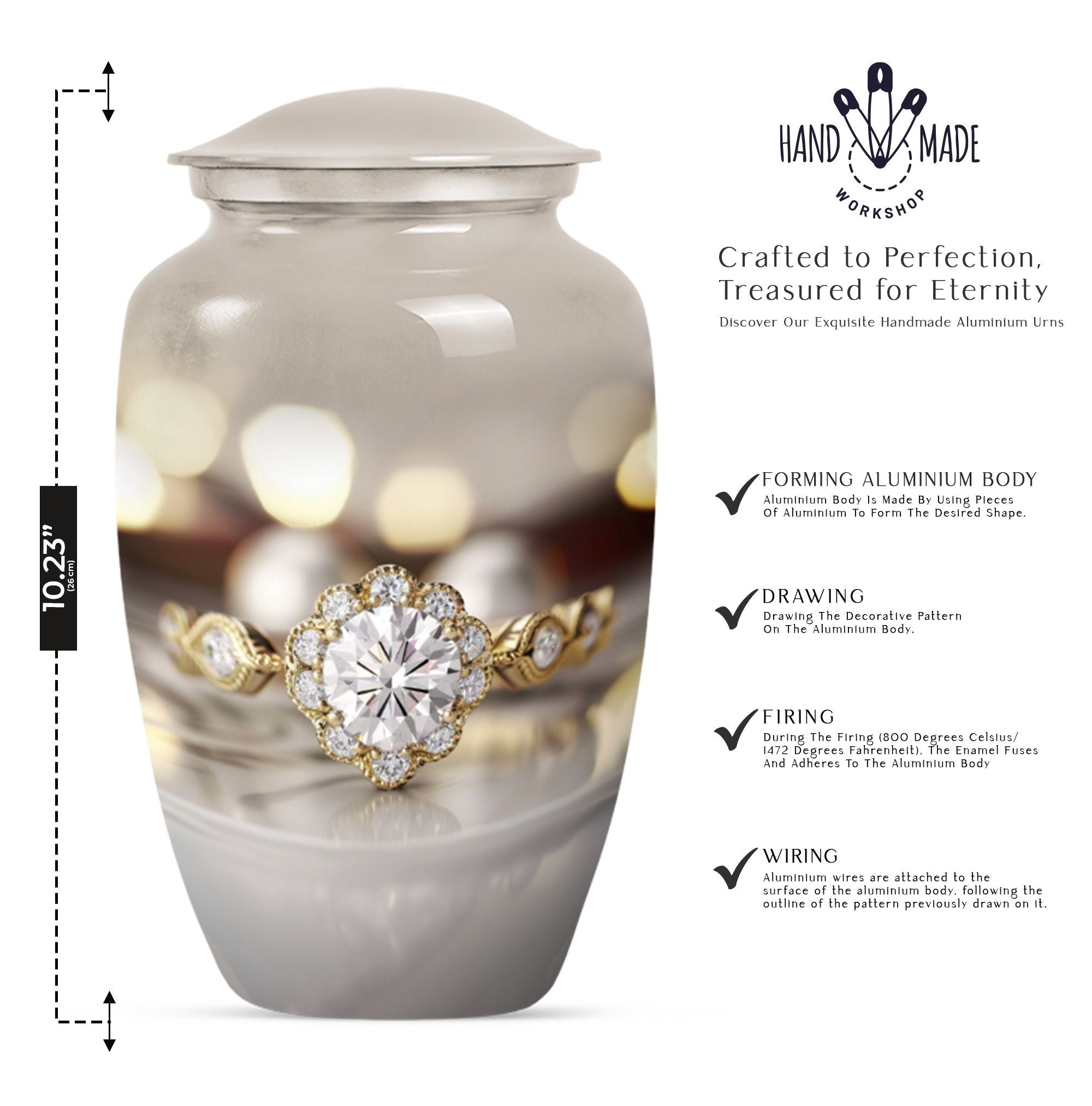 The Classic 10-Inch Ring Urn we offer is an admirable and respectful tribute to your departed loved ones. Expertly crafted from high-grade Aluminium, this urn for adult ashes assures long-lasting durability. It comes in a 10-inch size and showcases artful abstract themes that exude a serene, tranquil expression of eternal rest. These large urns are characterized by their immense capacity - they hold approximately 200 cubic inches of ashes. The total weight of this cremation urn is 3.3 pounds, making it manageable without being burdensome. What gives our offering more appeal is that you can even personalize it with engraved names for that touching memory of the departed. These burial funeral urns come packed in a soft, protective velvet pouch that will gently safeguard your treasured memorials. Consider this distinguished, stylish large urn for those intimate memorial ceremonies, and find solace in this timeless symbol of love and respect.
