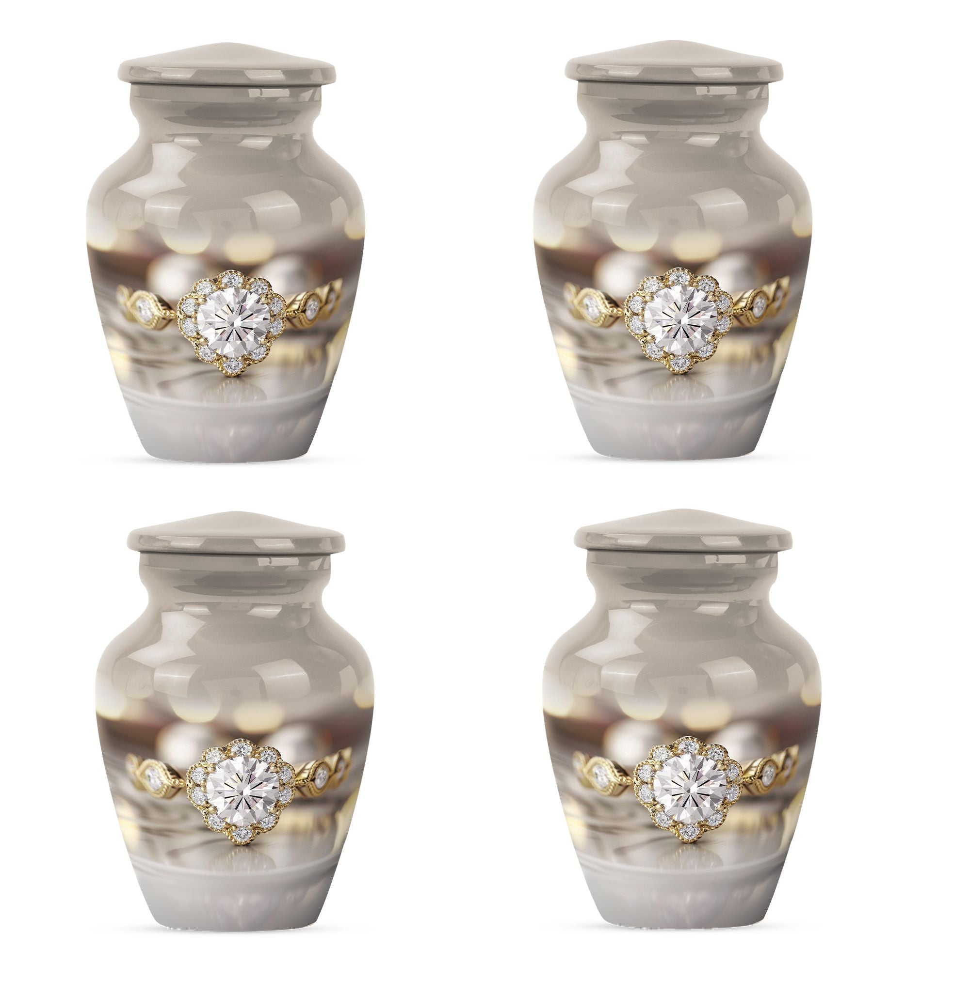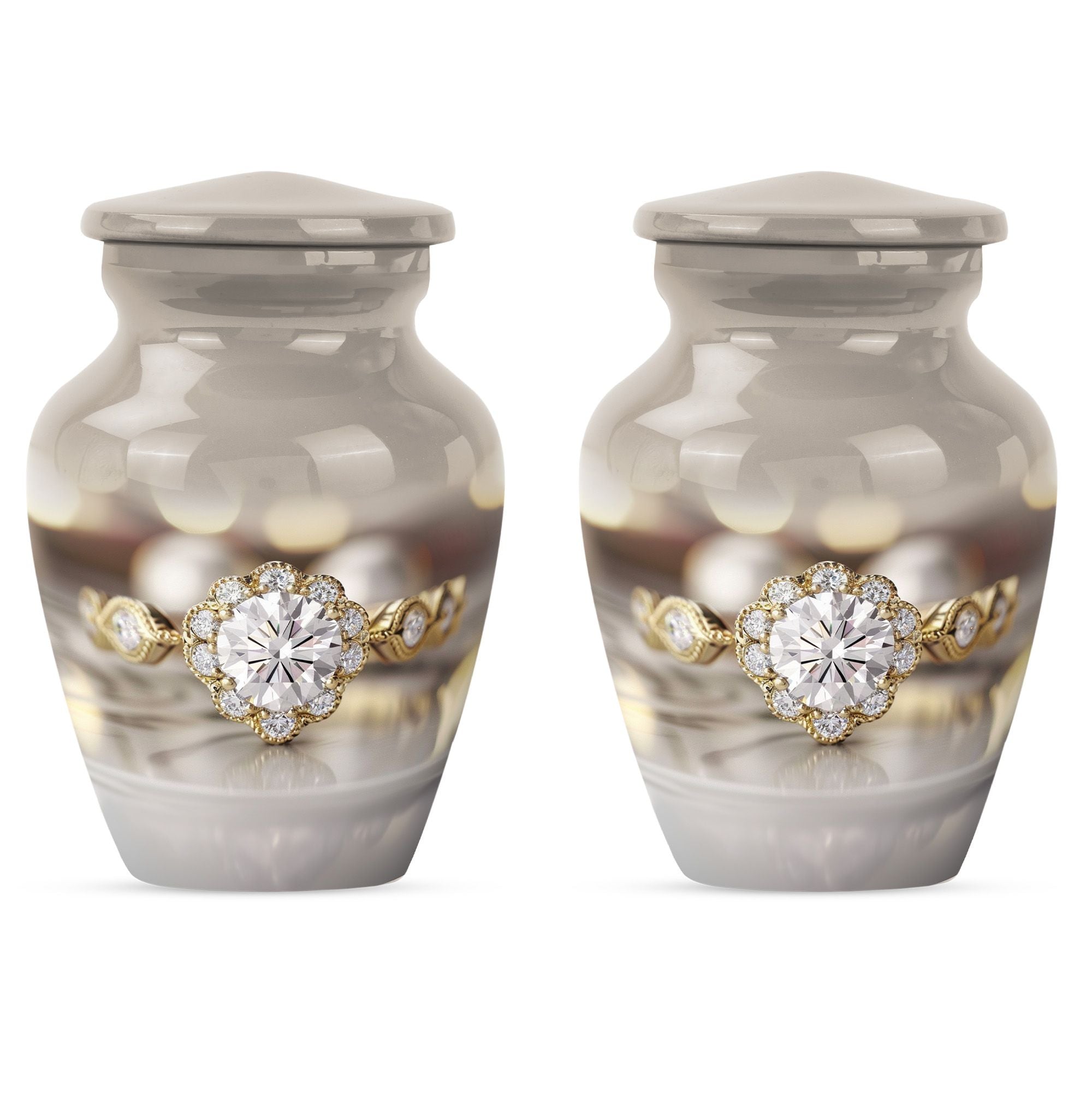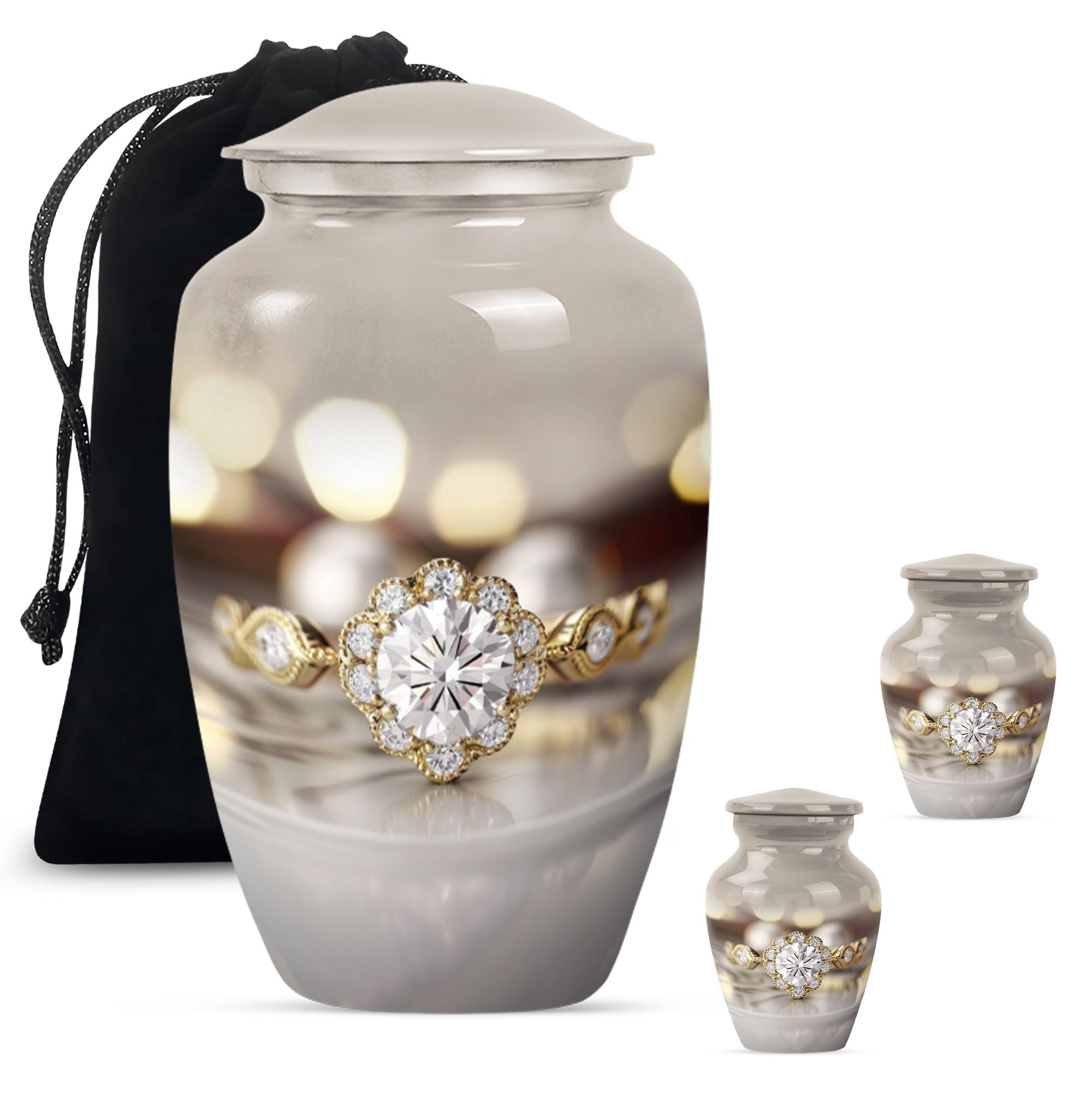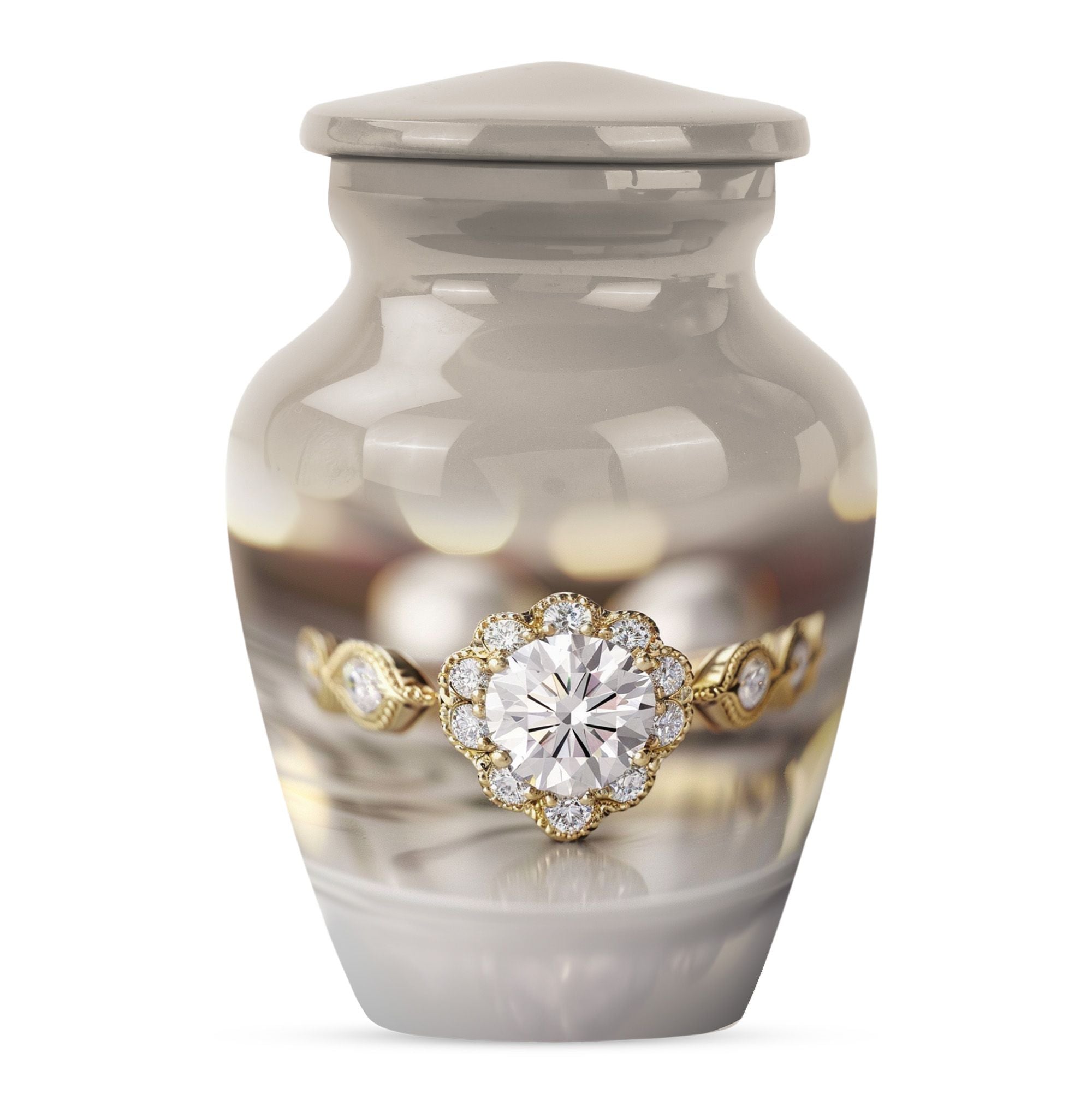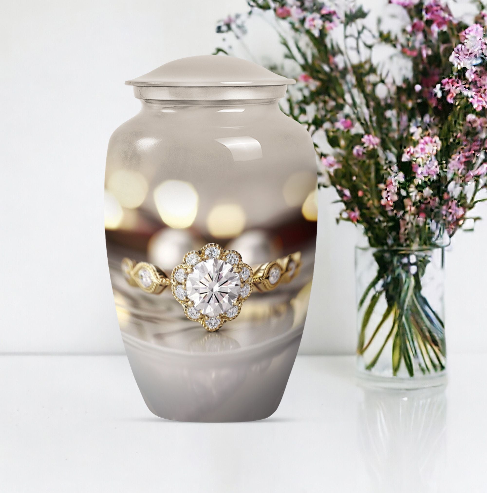 The Classic 10-Inch Ring Urn we offer is an admirable and respectful tribute to your departed loved ones. Expertly crafted from high-grade Aluminium, this urn for adult ashes assures long-lasting durability. It comes in a 10-inch size and showcases artful abstract themes that exude a serene, tranquil expression of eternal rest. These large urns are characterized by their immense capacity - they hold approximately 200 cubic inches of ashes. The total weight of this cremation urn is 3.3 pounds, making it manageable without being burdensome. What gives our offering more appeal is that you can even personalize it with engraved names for that touching memory of the departed. These burial funeral urns come packed in a soft, protective velvet pouch that will gently safeguard your treasured memorials. Consider this distinguished, stylish large urn for those intimate memorial ceremonies, and find solace in this timeless symbol of love and respect.